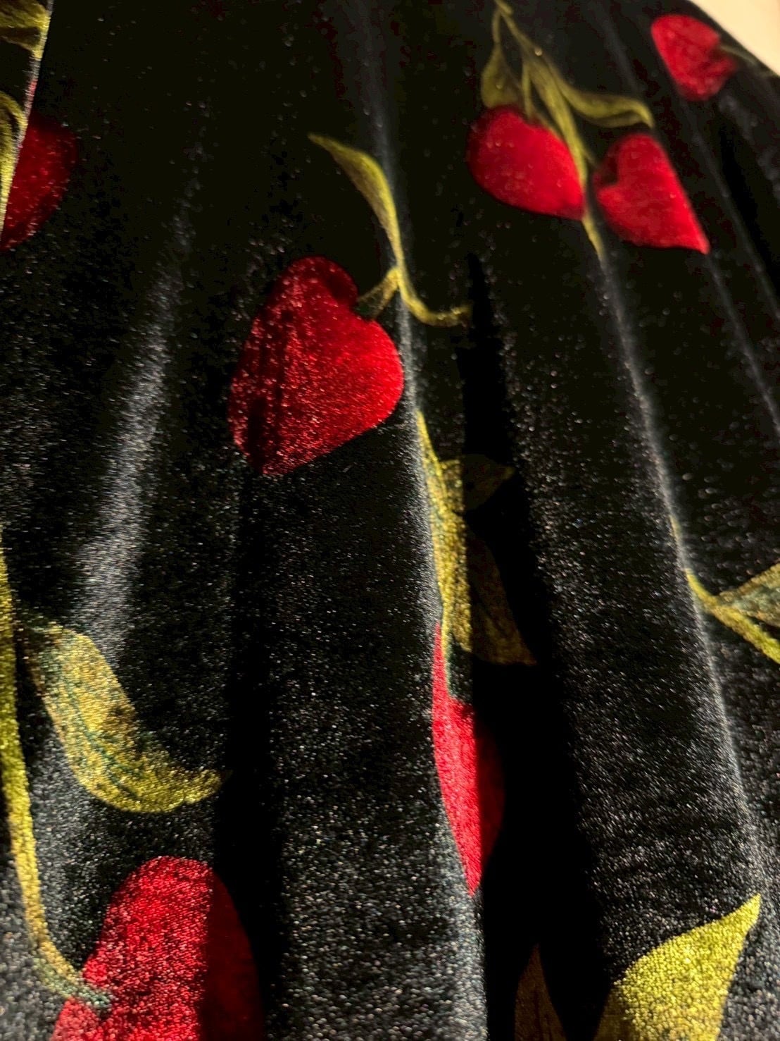 滑らかでモチっとした極上のベロア素材をボディに採用し、鈍く光を反射する奥行きのあるブラックがラグジュアリーな空気感を演出。そこに大ぶりに描かれたチェリーモチーフを全面に配し、アーティスティックな表情を両立した1着となっています。