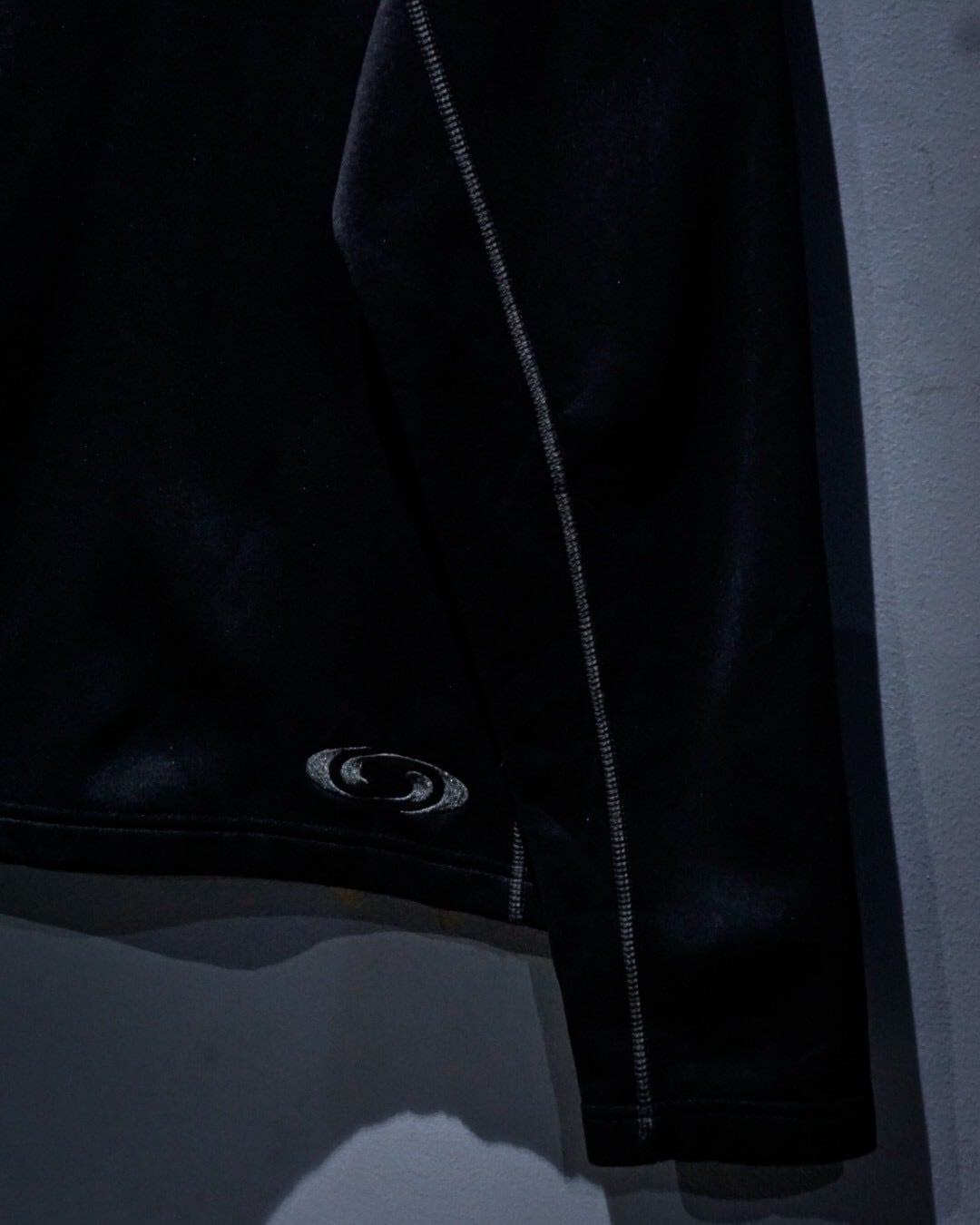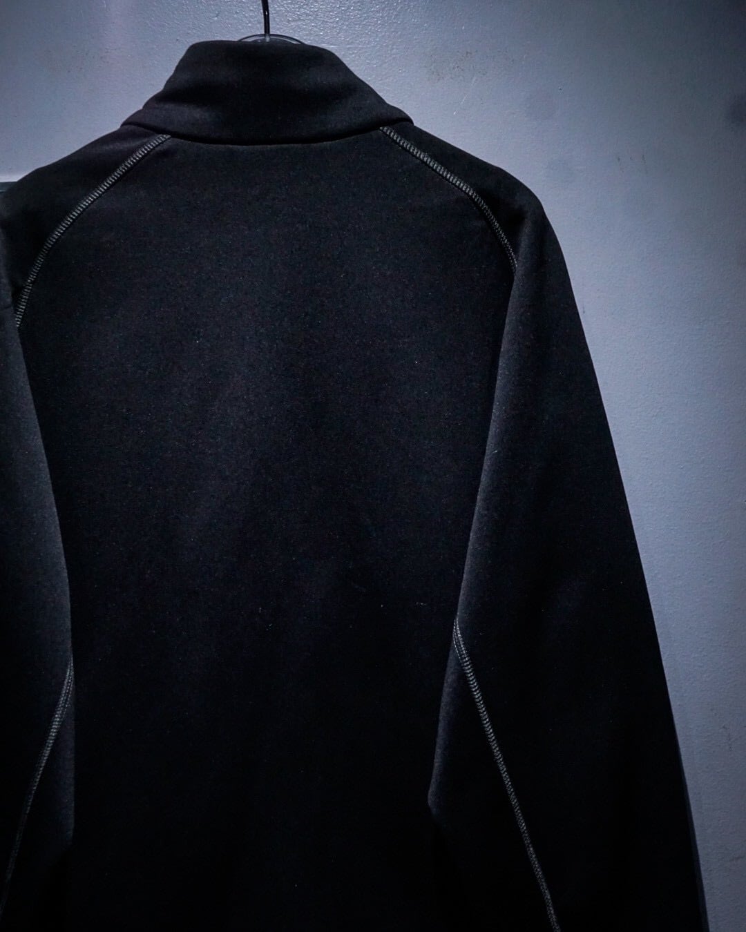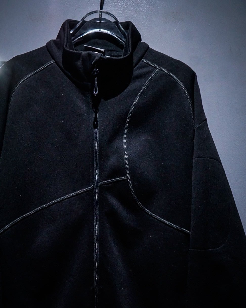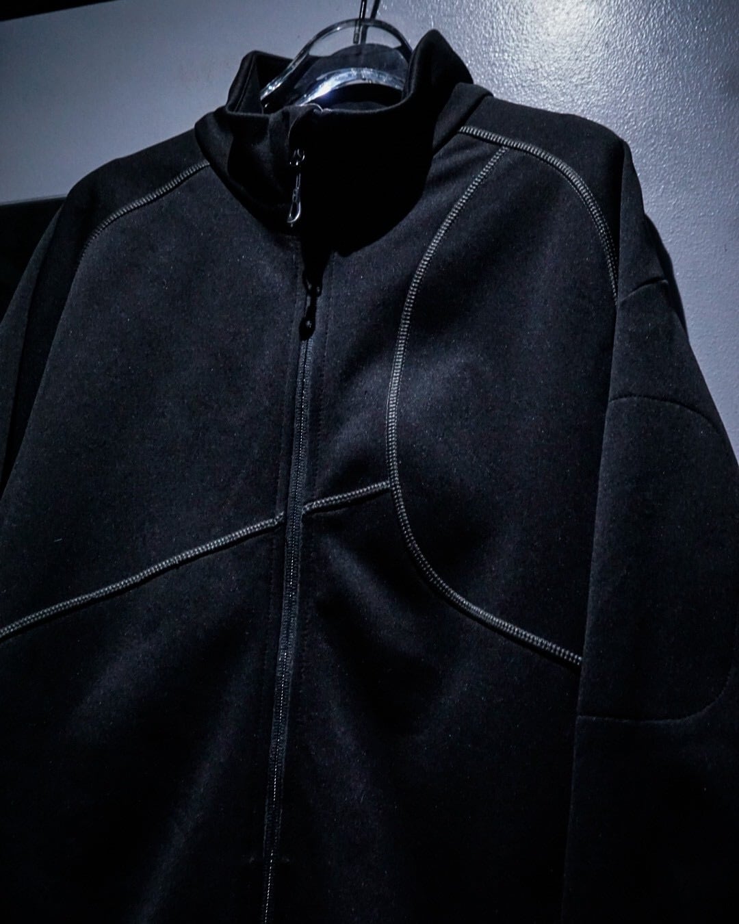 伸縮性のあるブラックの素材を用いて、シンプルかつテクニカルなルックスに仕上げられたジップアップボンディングジャケット。