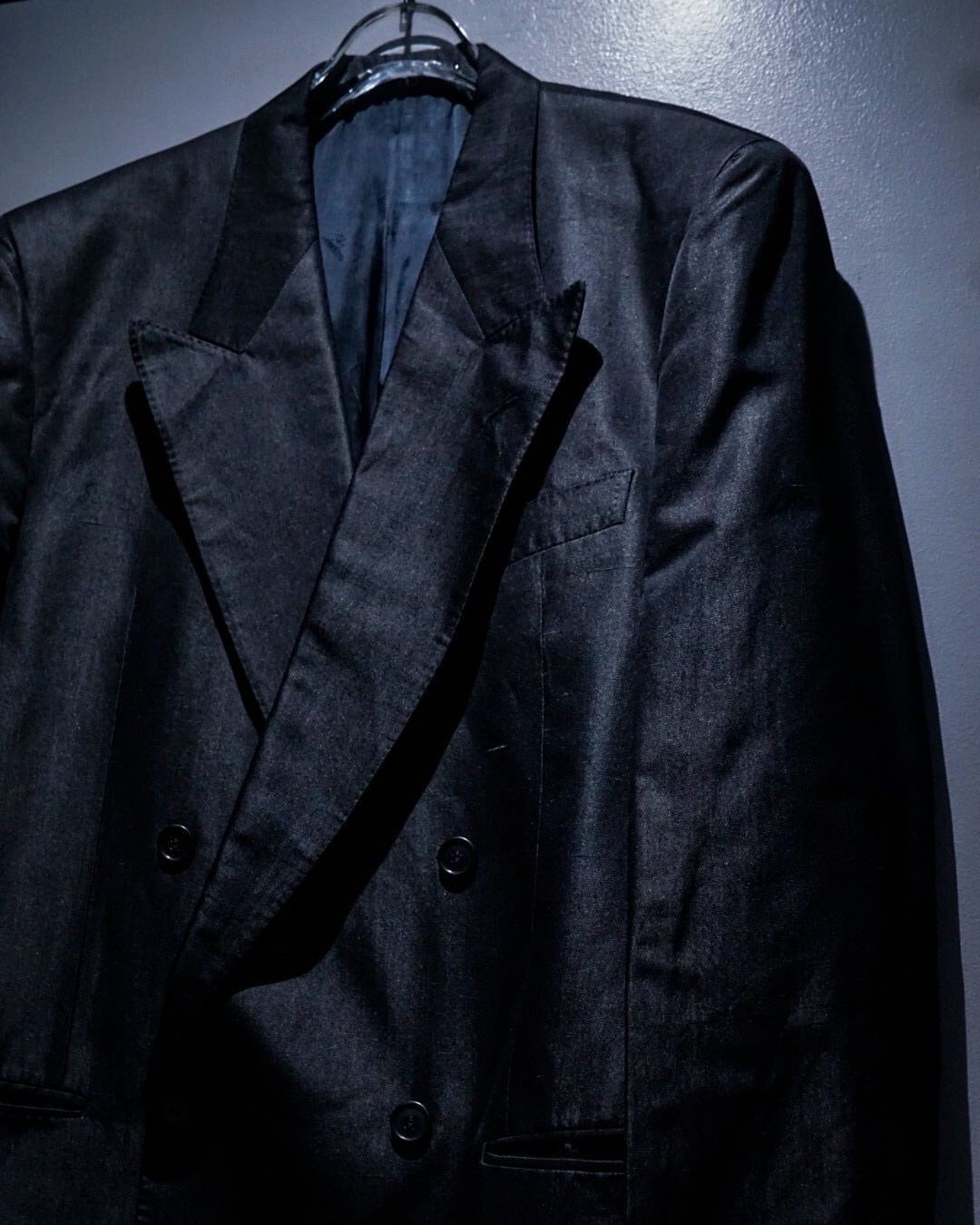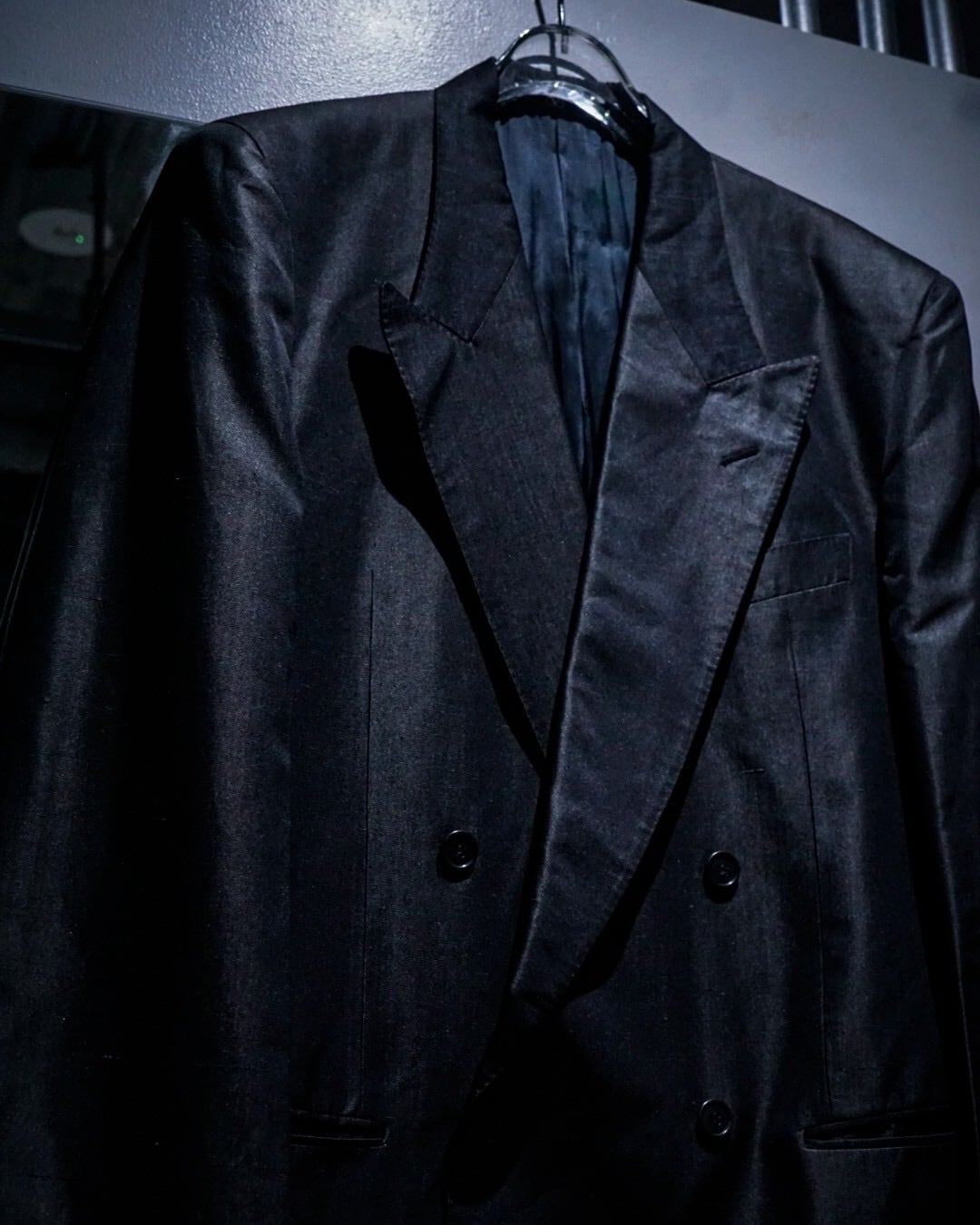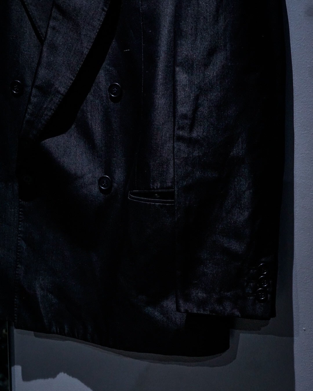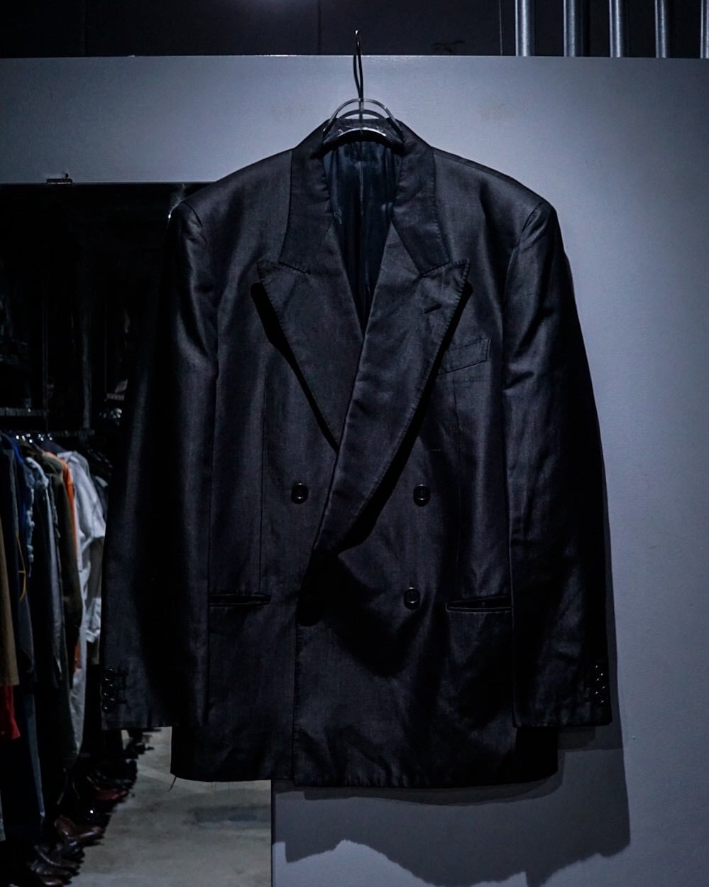 ダブルブレスト仕様に、鋭いピークドラペルを採用。ノーベントのミニマルなバックスタイルによって、よりモードで洗練された印象に。
