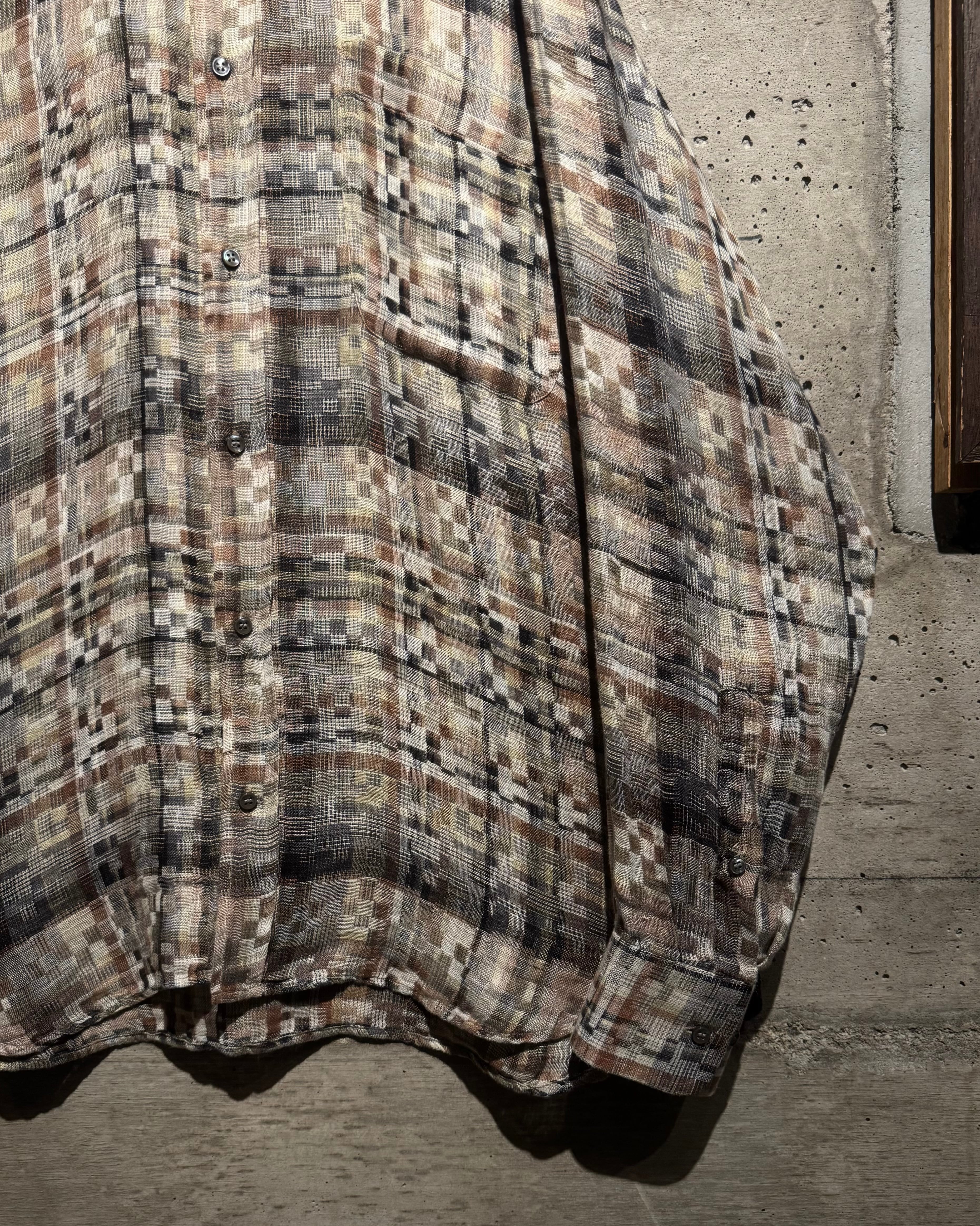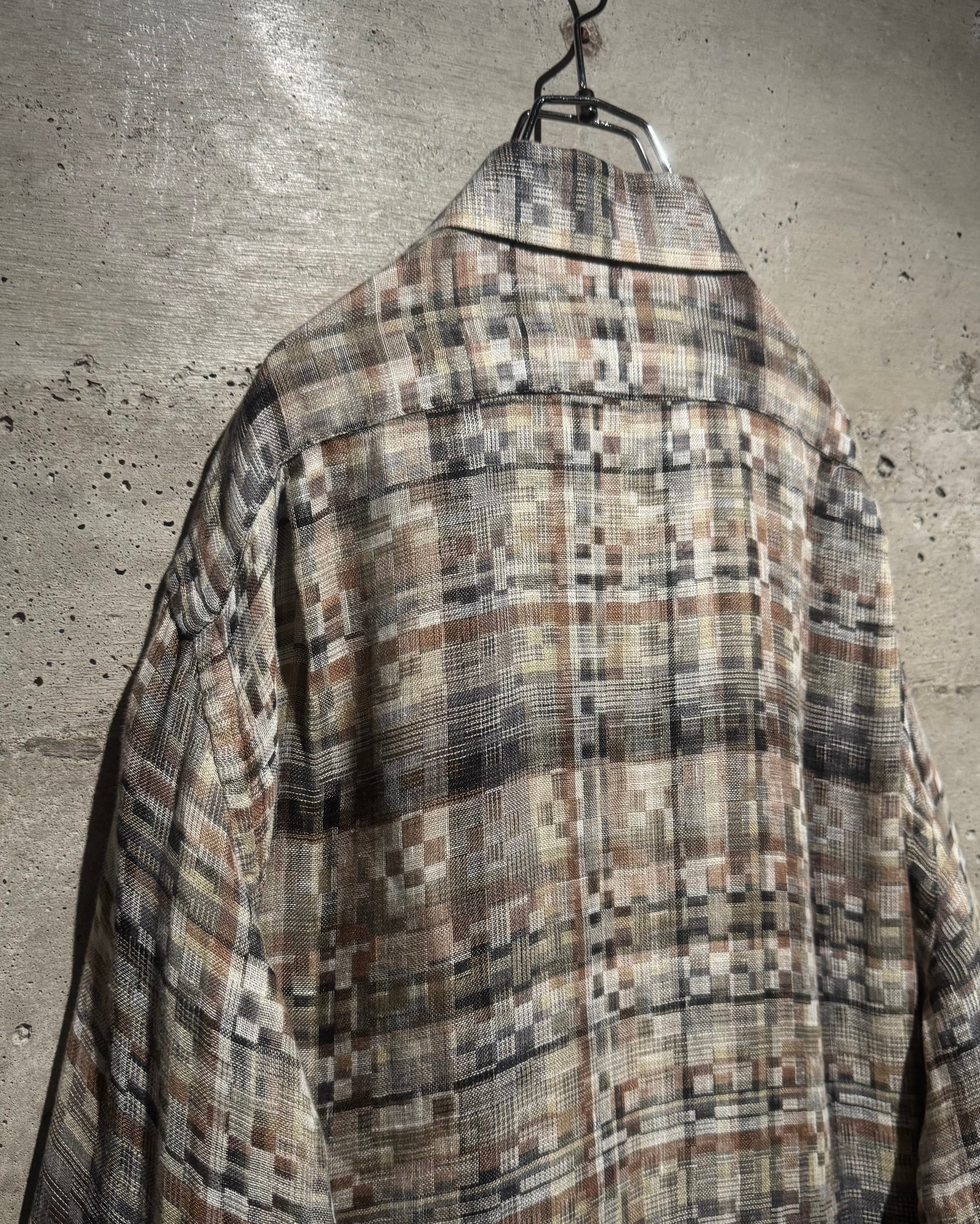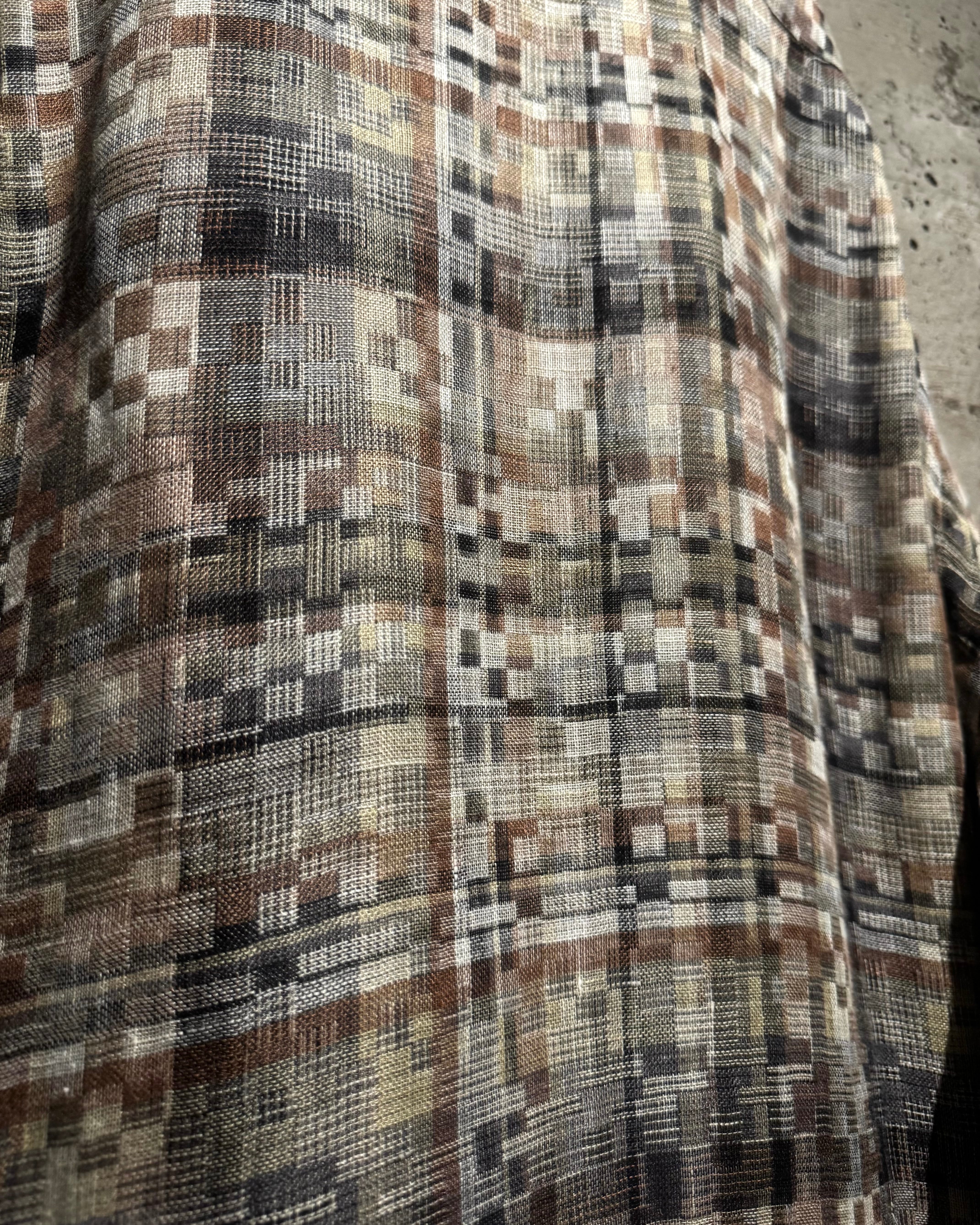 上質なリネン100%のファブリックをボディに使用し、織りによって表現されたモザイク調の総柄が目を惹くリネンシャツ。