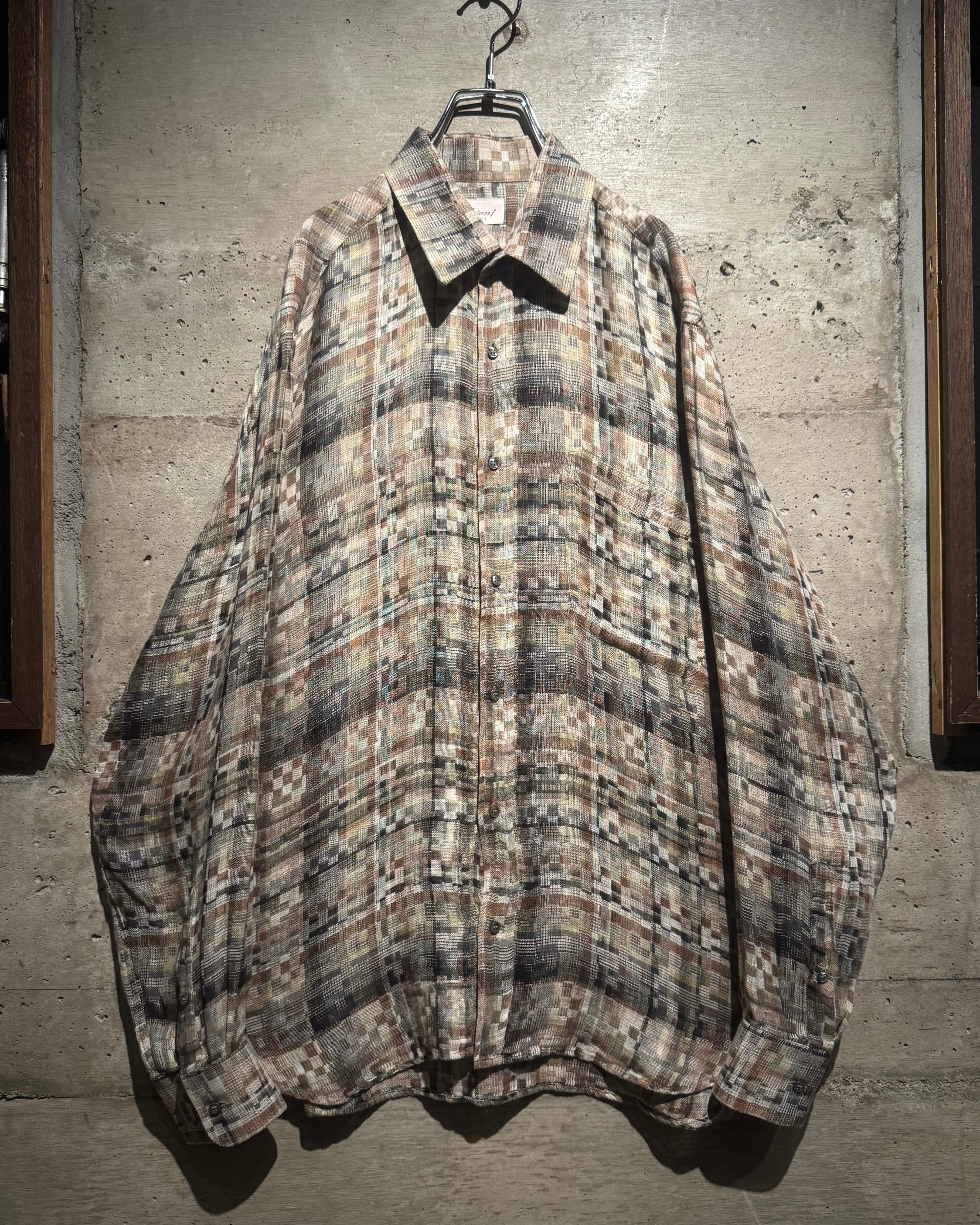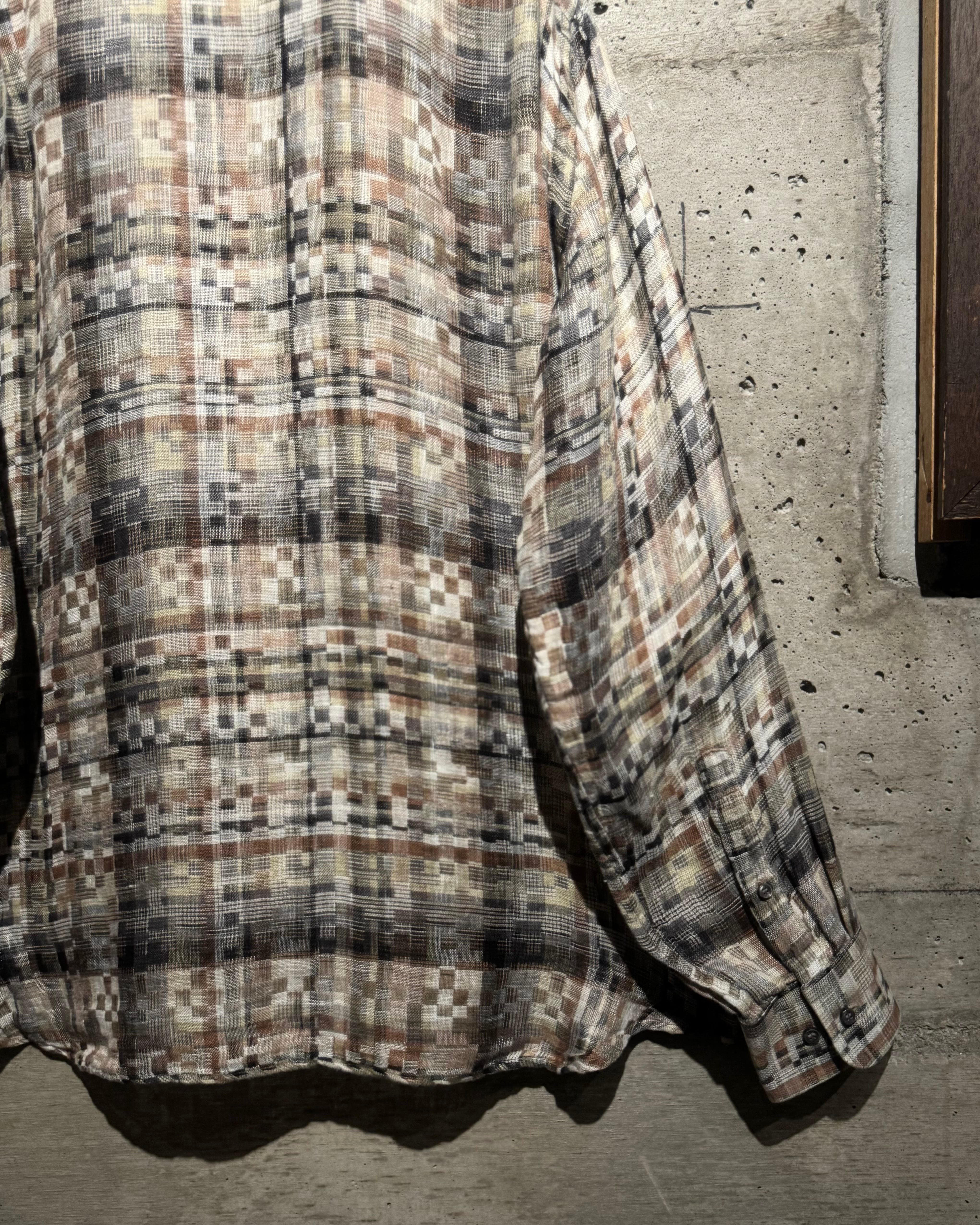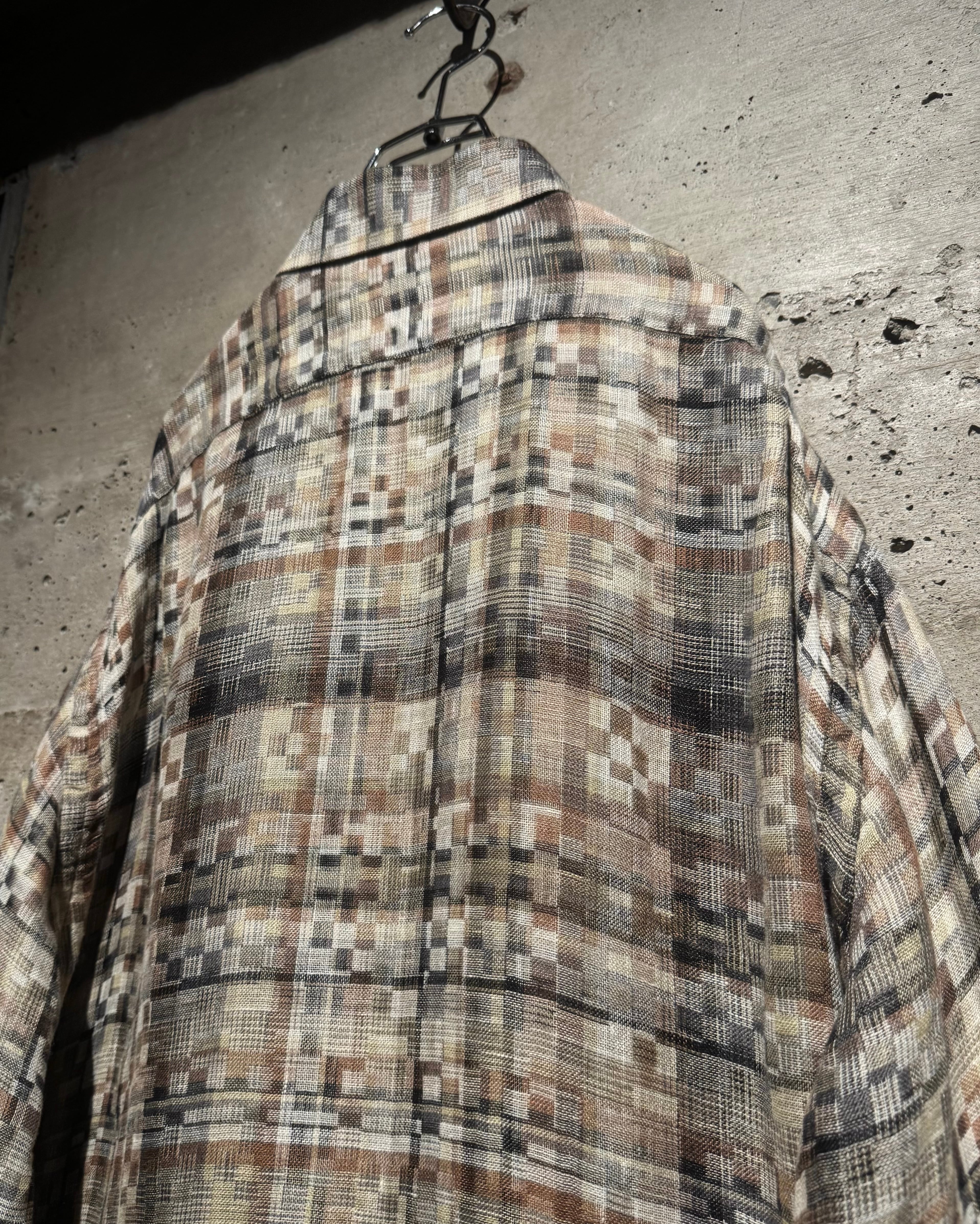上質なリネン100%のファブリックをボディに使用し、織りによって表現されたモザイク調の総柄が目を惹くリネンシャツ。