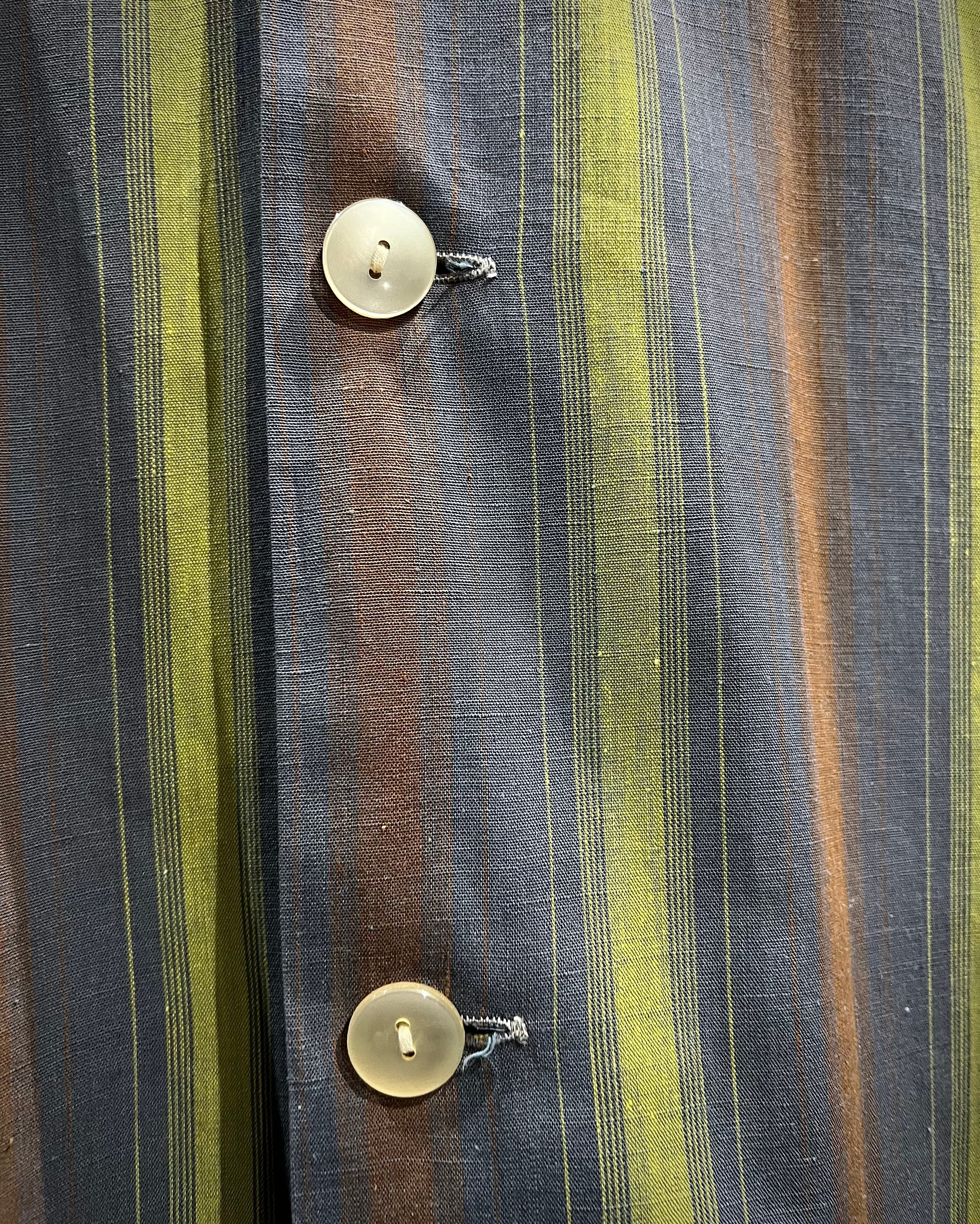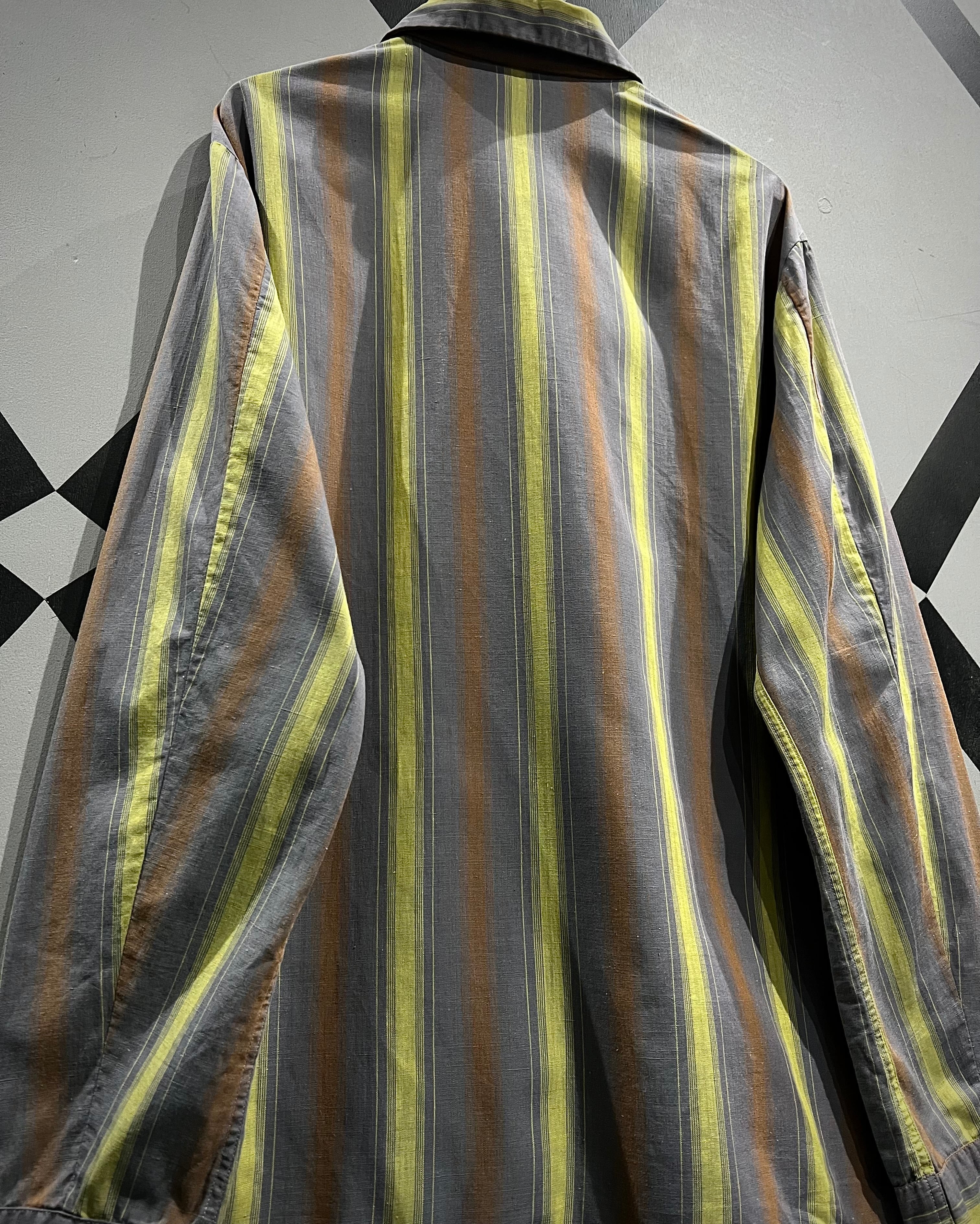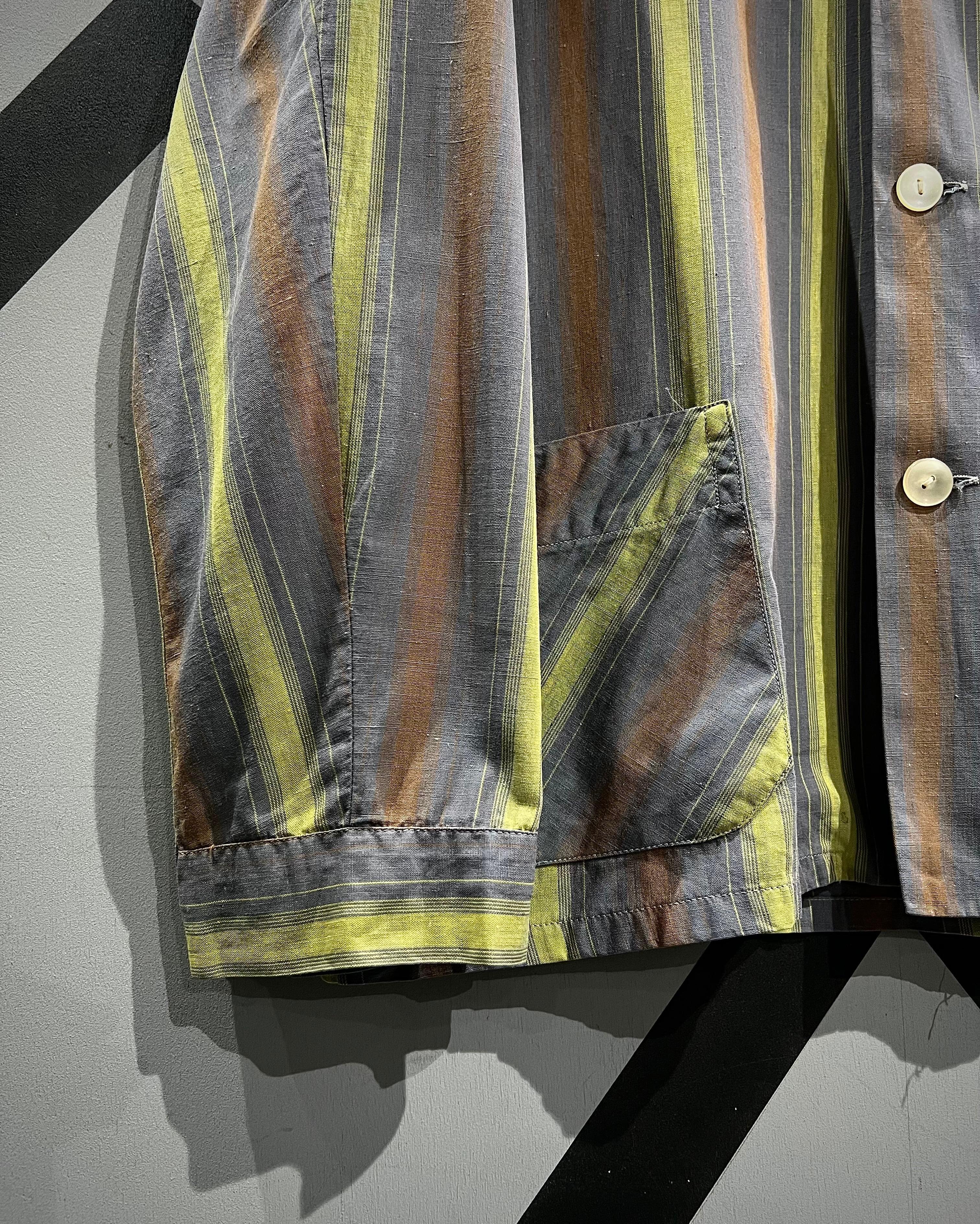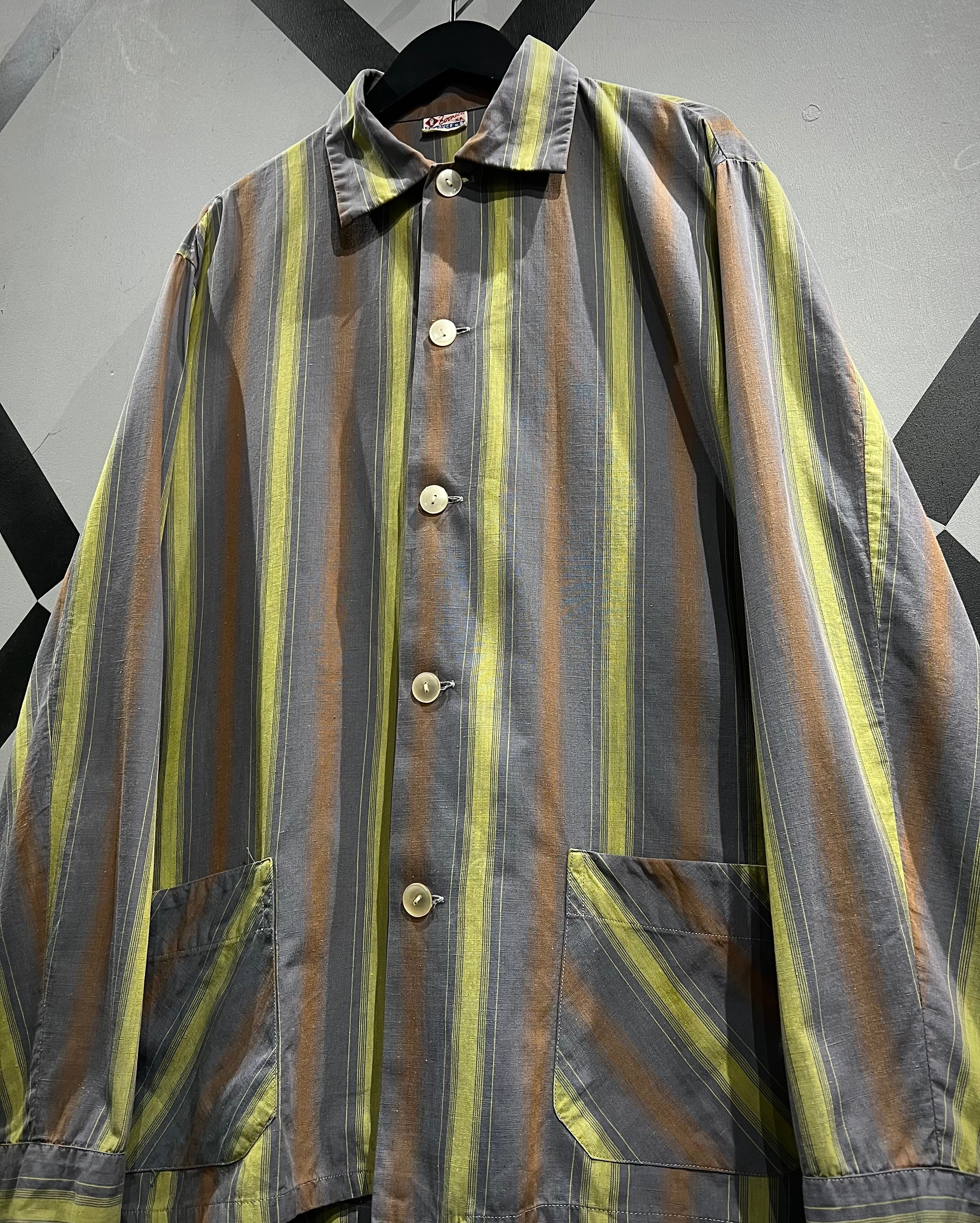 グレー、ブラウン、イエローを基調とした柔らかな配色に、縦に走るストライプが印象的な50'sスリーピングシャツ。