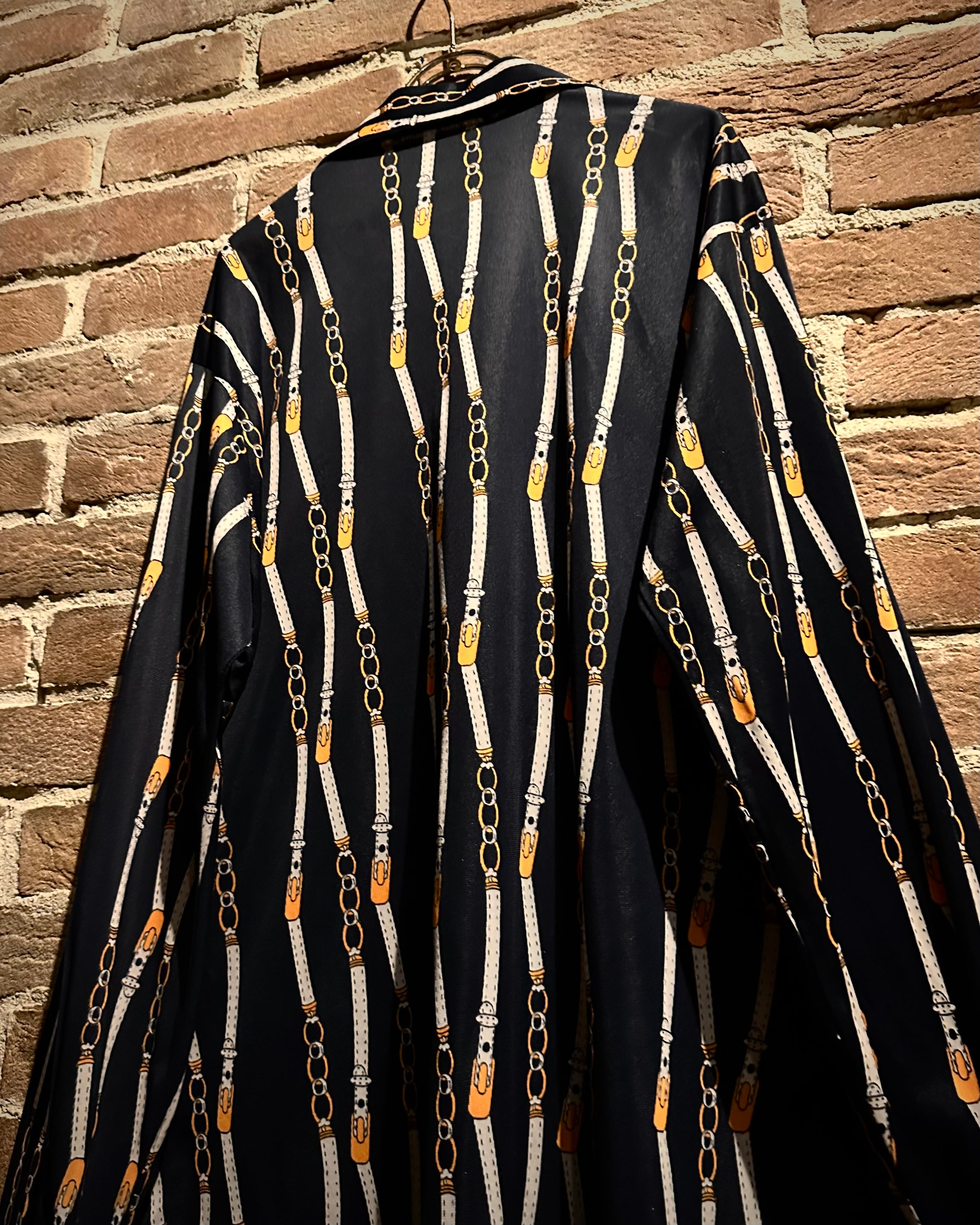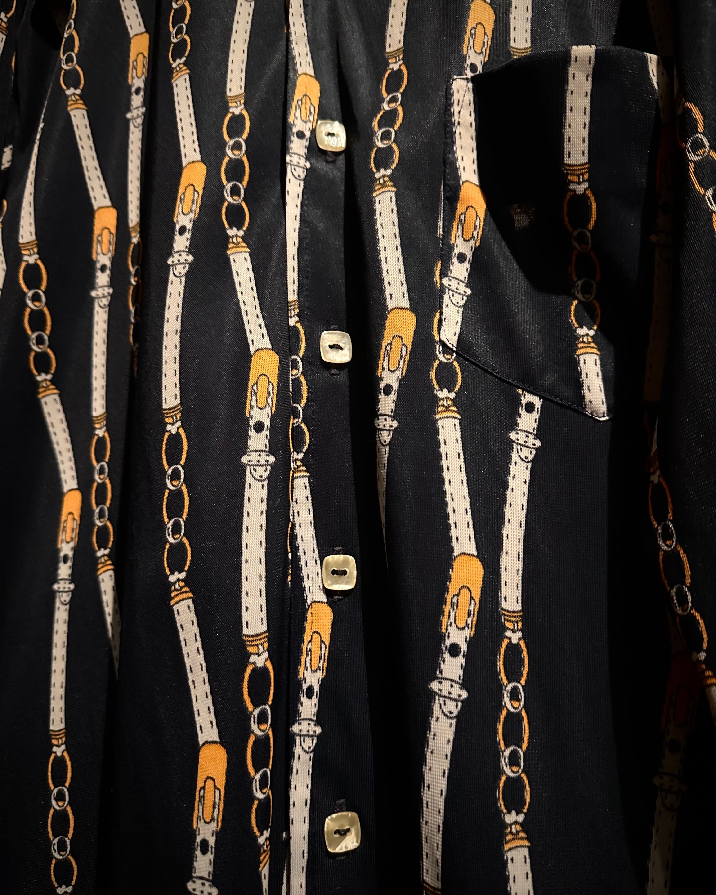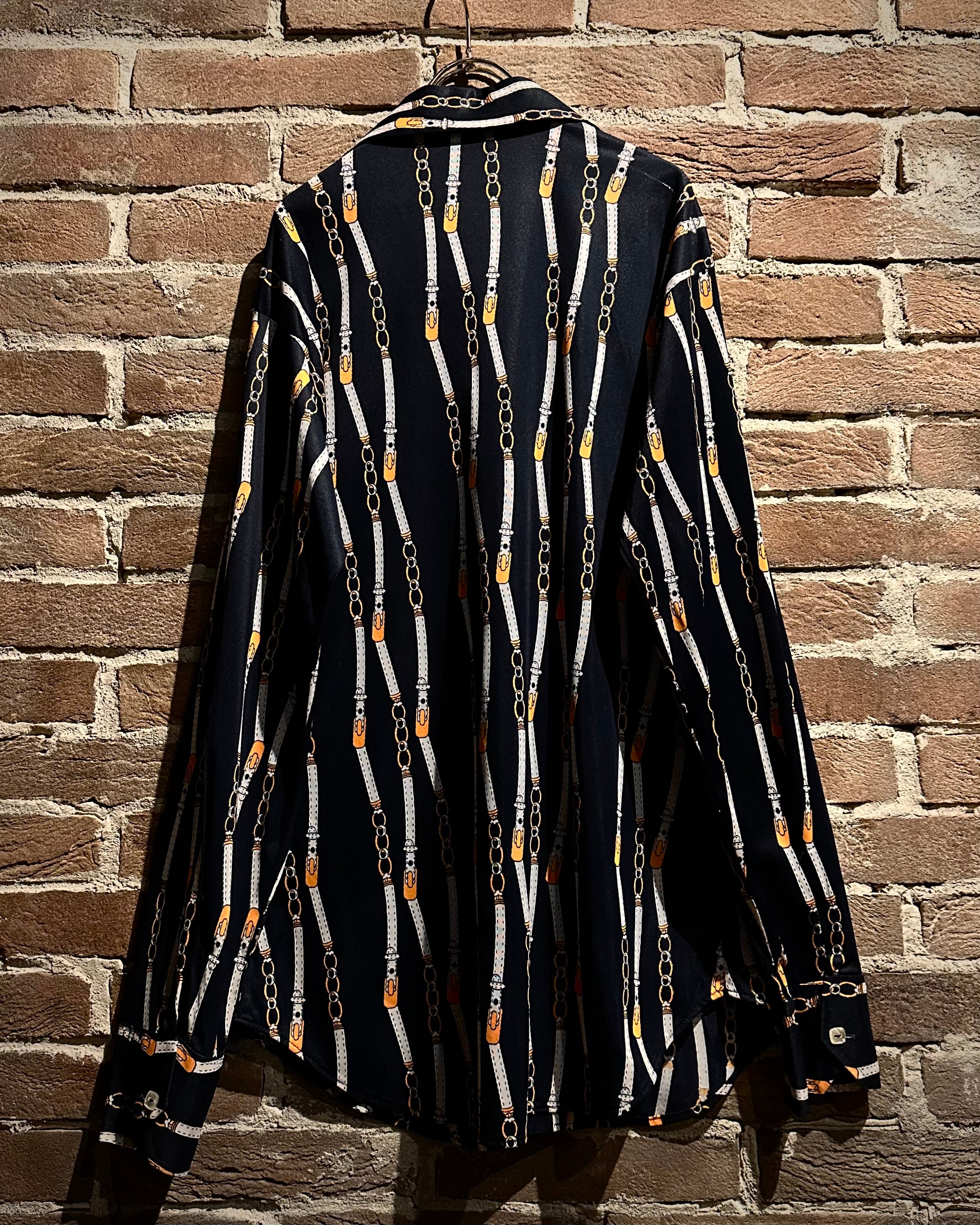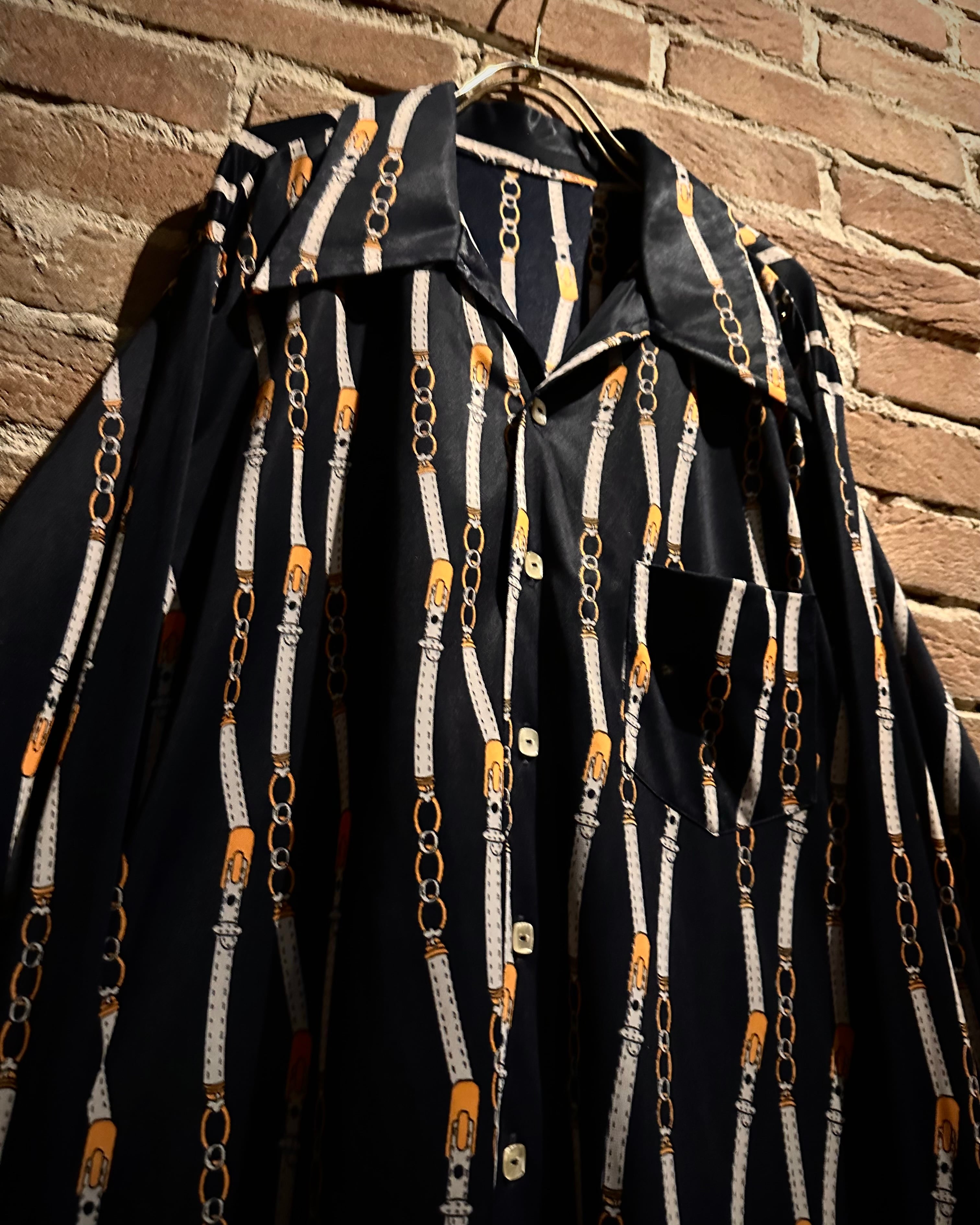 ツルッと滑らかなボディに、ハーネス柄をストライプ状に載せた、70'sヴィンテージの長袖シャツ。