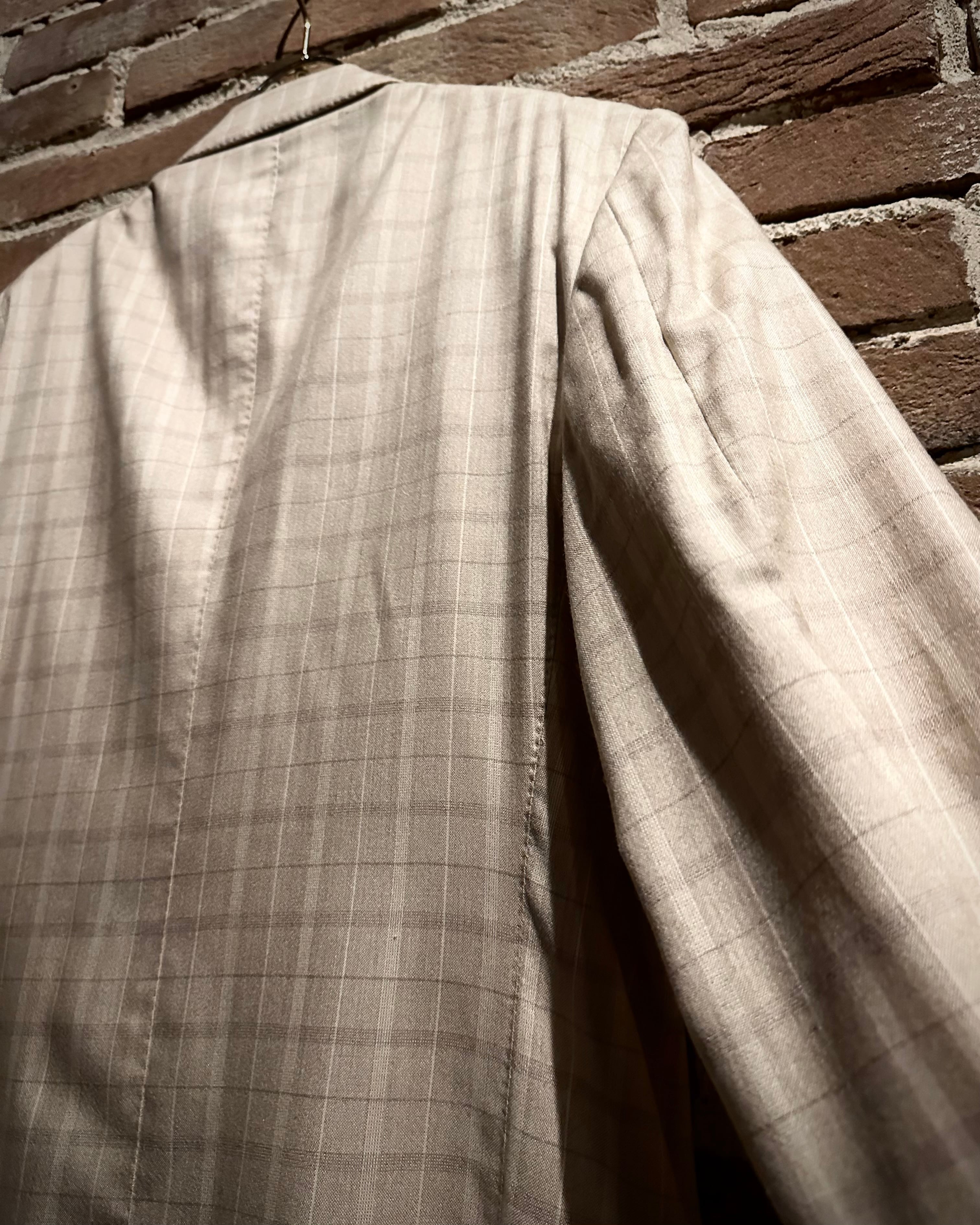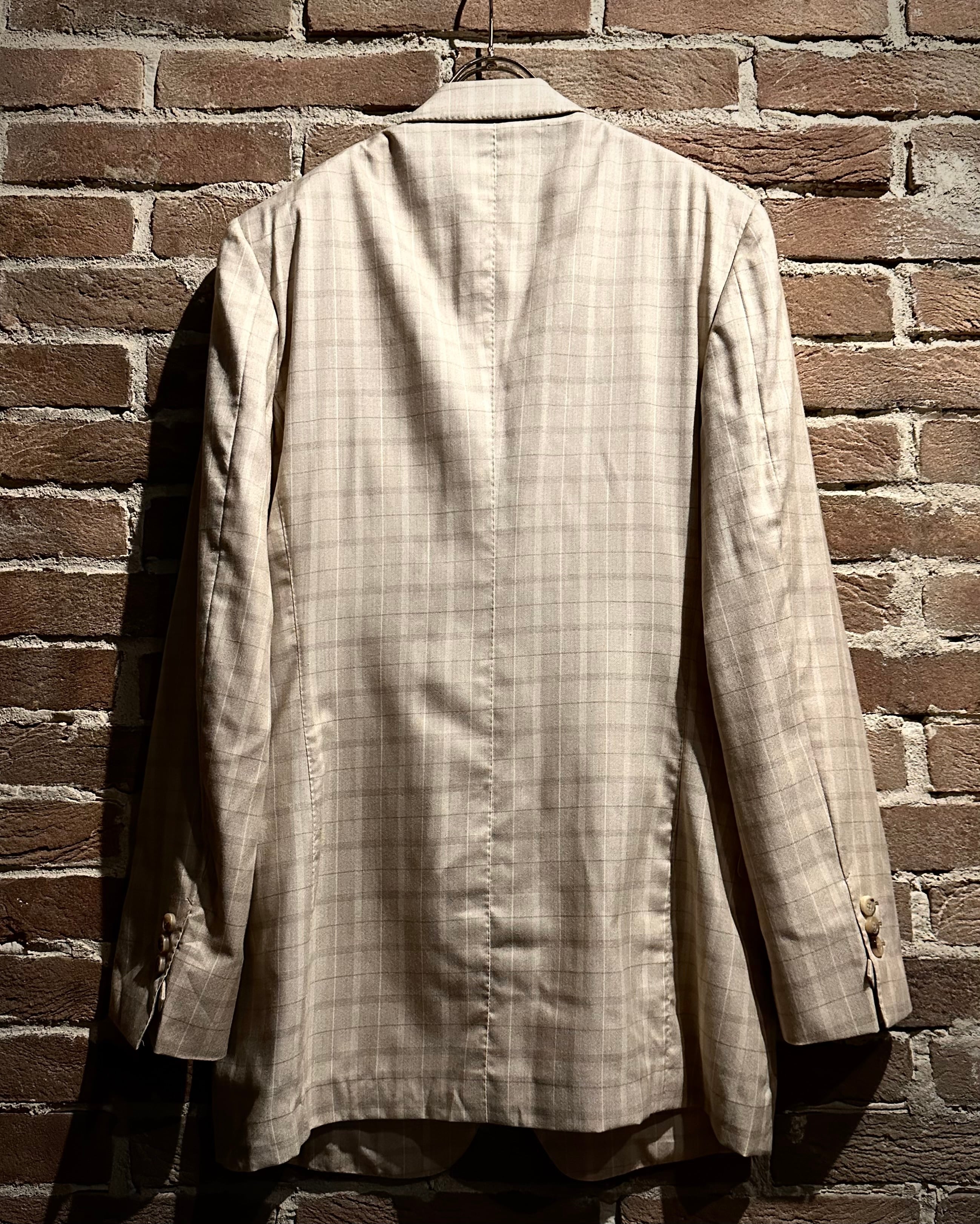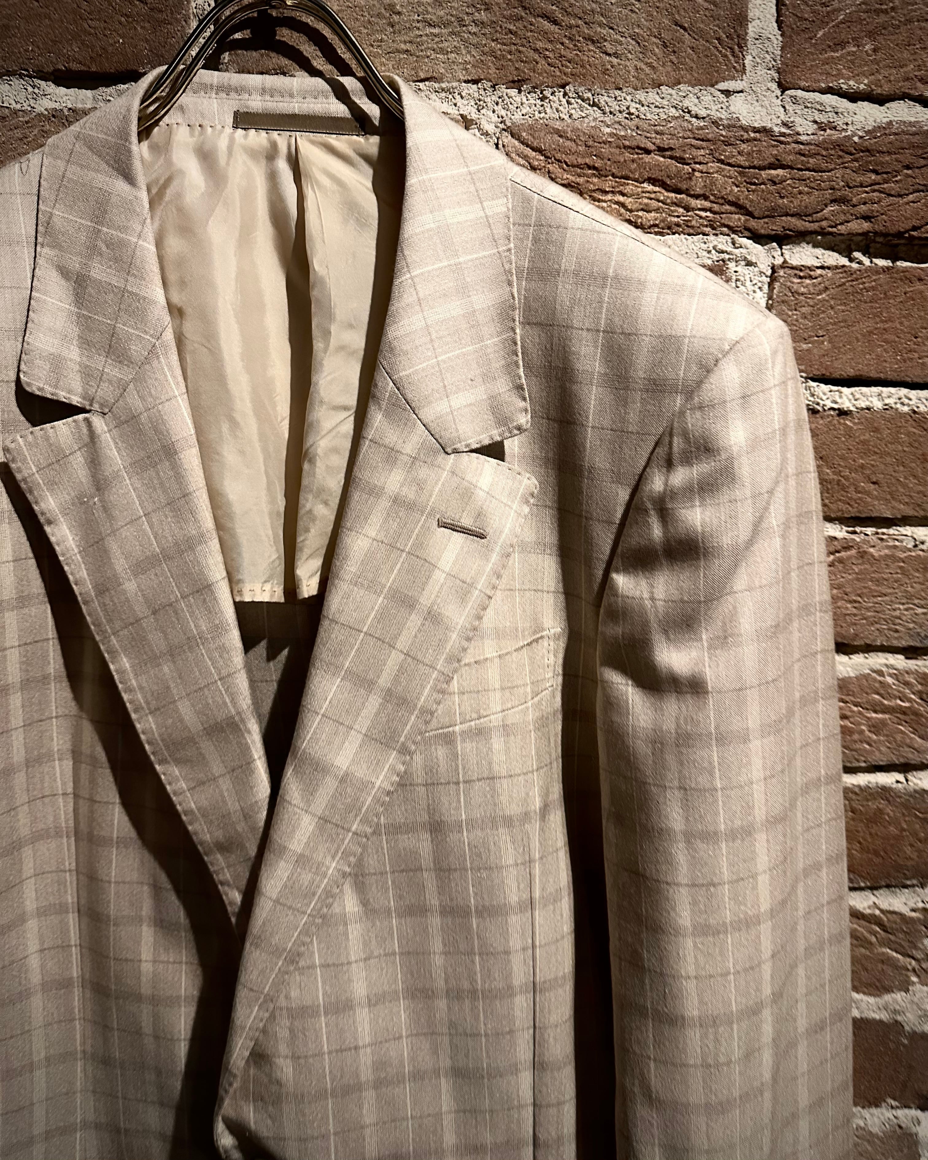 こちらはカシミヤ×シルク混紡の上質なファブリックを採用し、滑らかな肌触りと柔らかな光沢感を両立した1着で、ベージュトーンのチェックパターンが奥行き演出し、クラシックでありながらもどこかモダンな佇まいに仕上がっています。