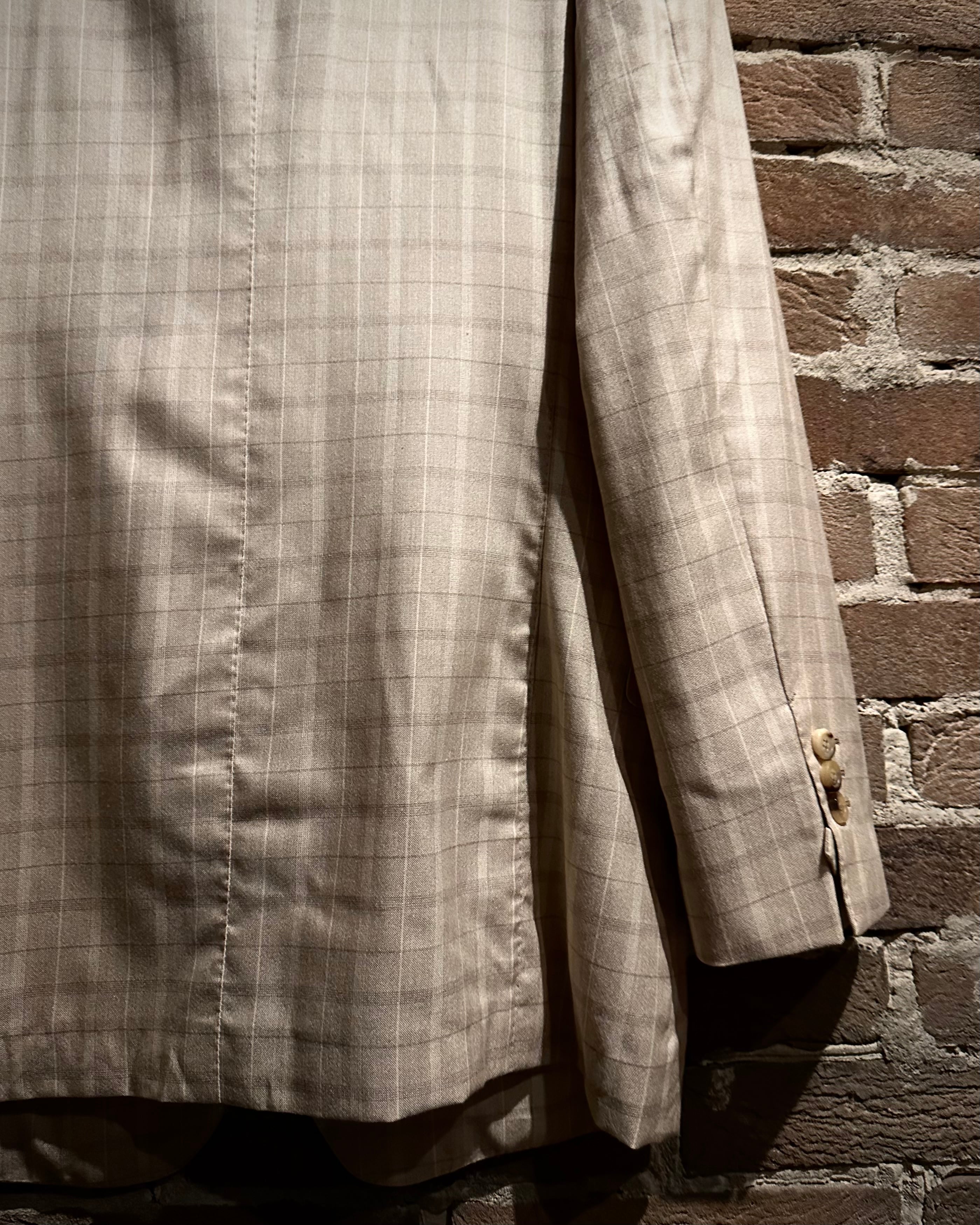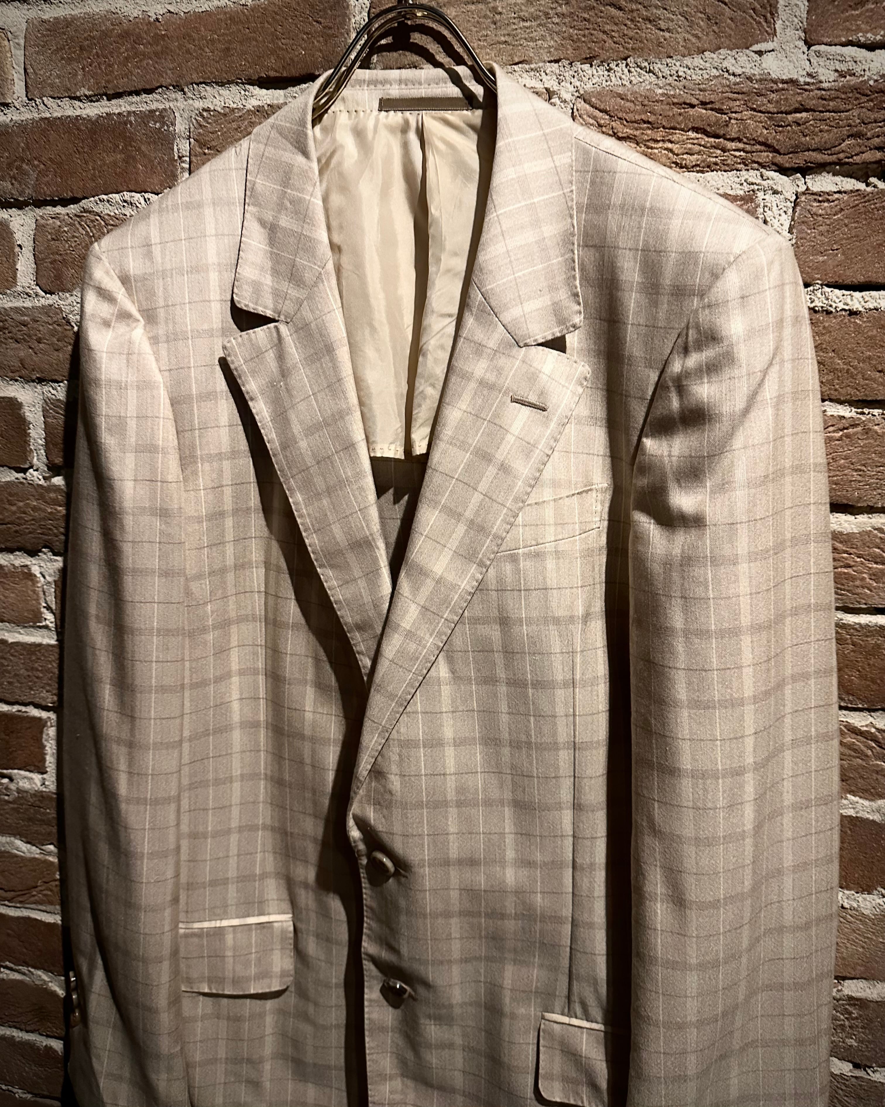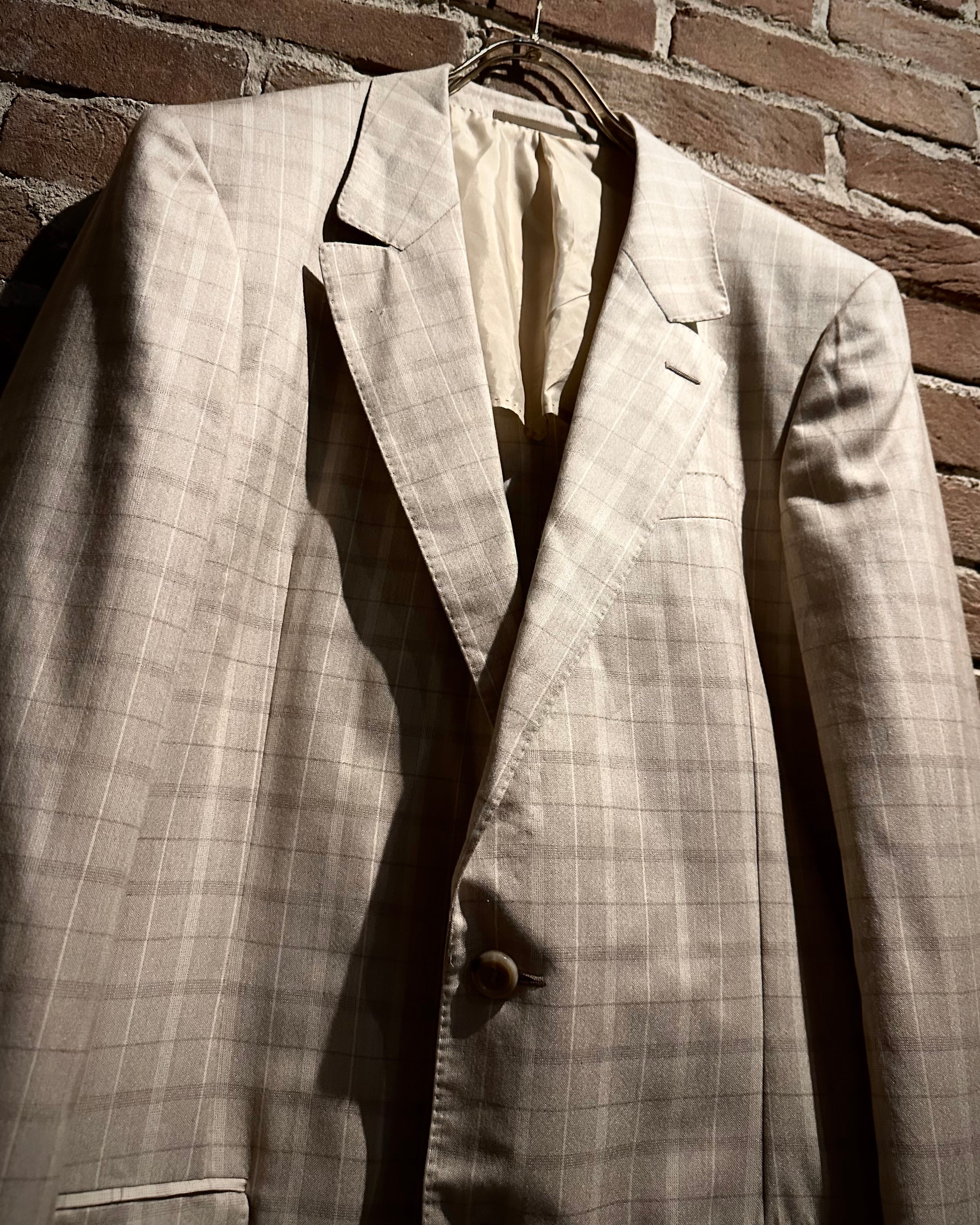 こちらはカシミヤ×シルク混紡の上質なファブリックを採用し、滑らかな肌触りと柔らかな光沢感を両立した1着で、ベージュトーンのチェックパターンが奥行き演出し、クラシックでありながらもどこかモダンな佇まいに仕上がっています。