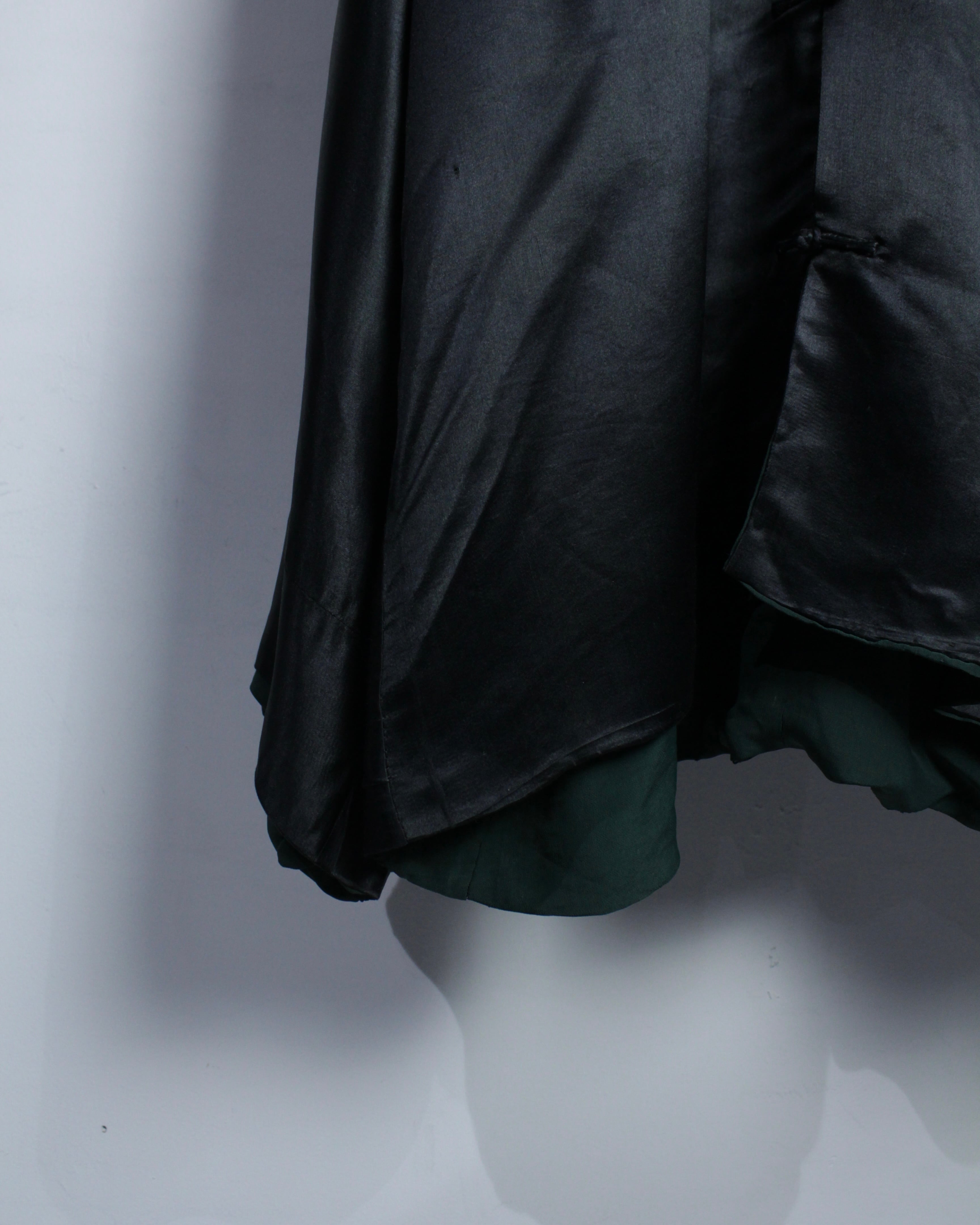 滑らかな光沢を帯びたブラックボディに、しなやかなドレープ感を纏った1着。光の当たり方で表情を変える艶やかな質感が、モードな空気感を一層引き立てています。