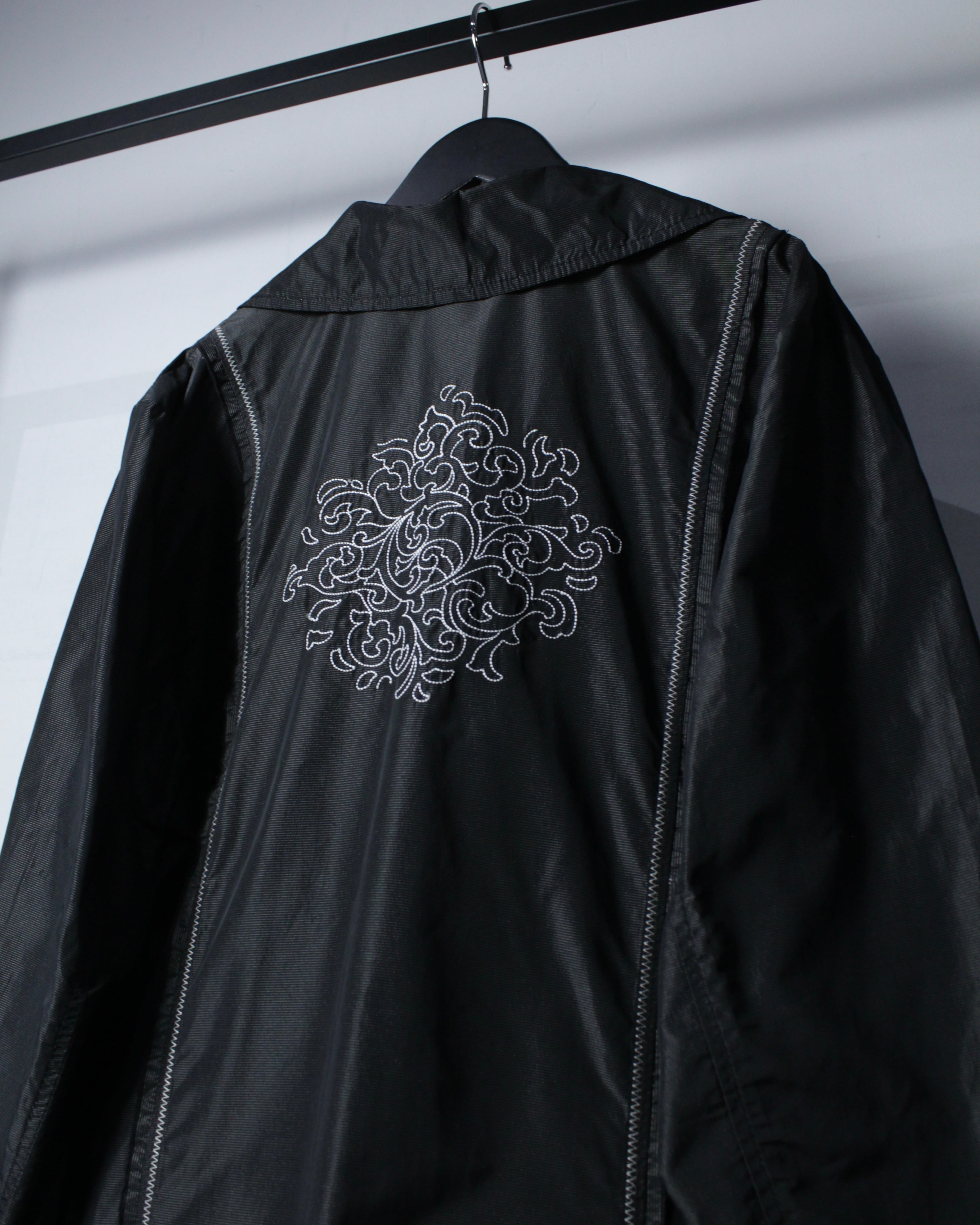 背面には繊細なタッチで描かれた刺繍を配置。流れるような曲線で構成されたデザインが、ブラックのボディにさりげないアクセントを加え、独特な存在感を放ちます。