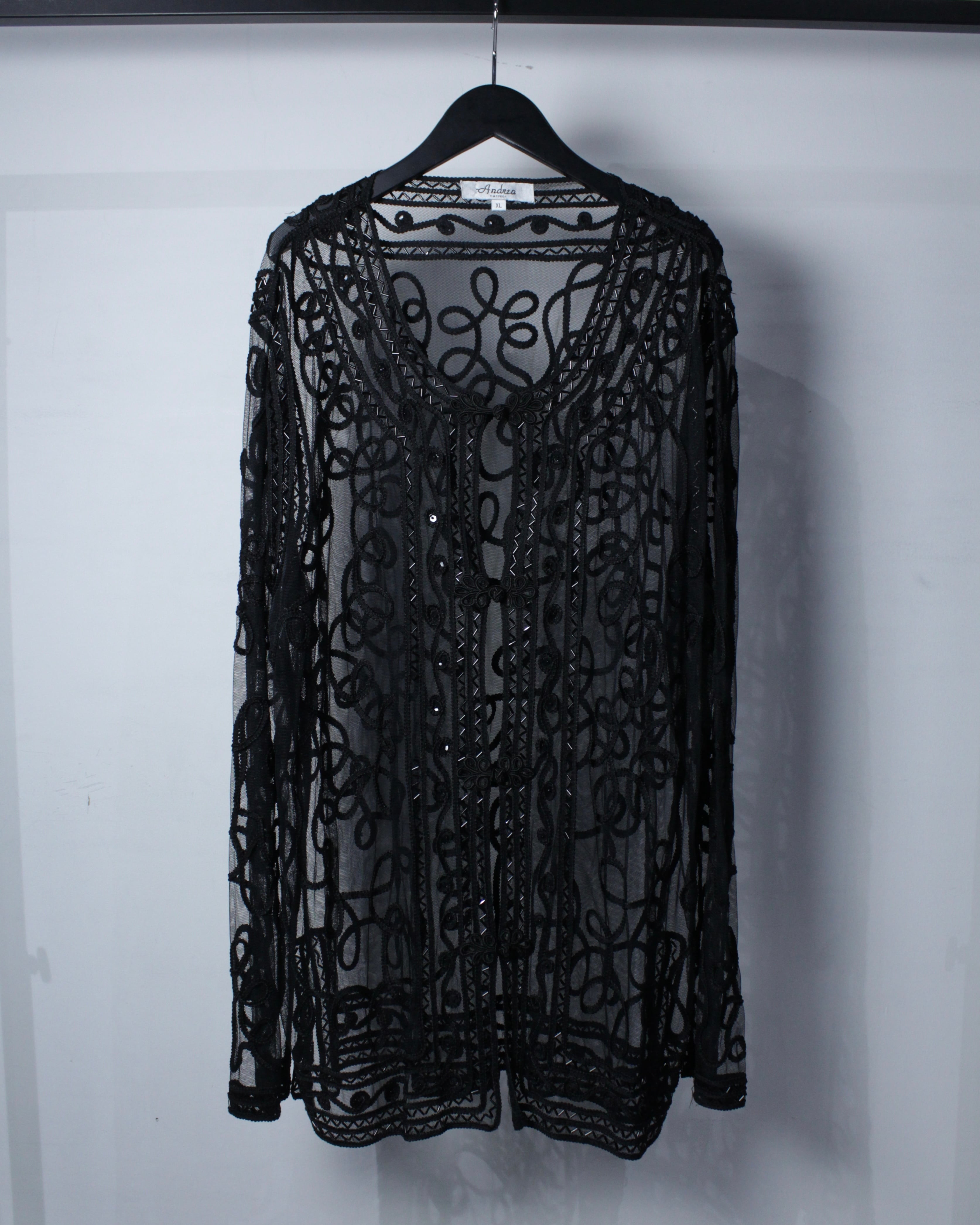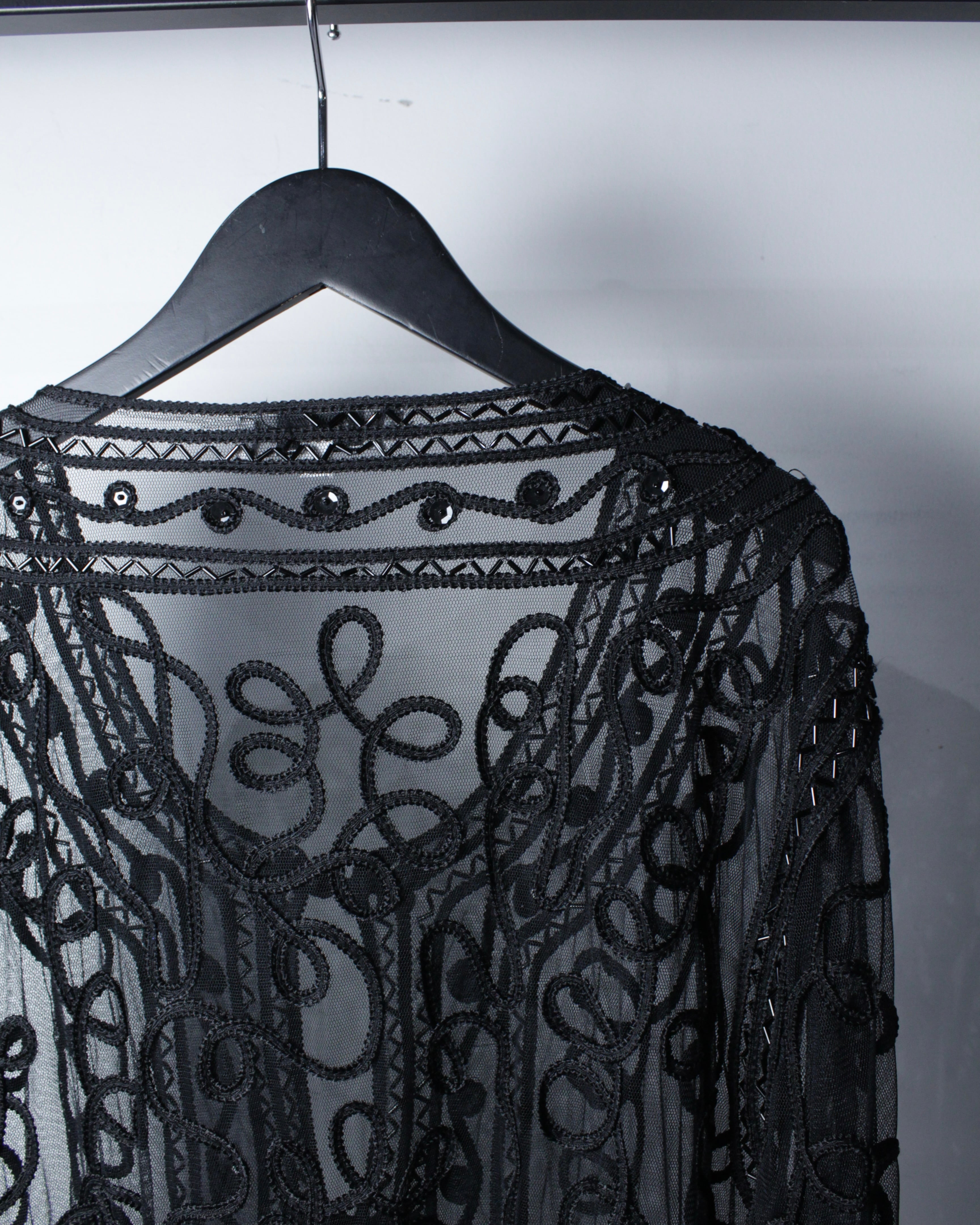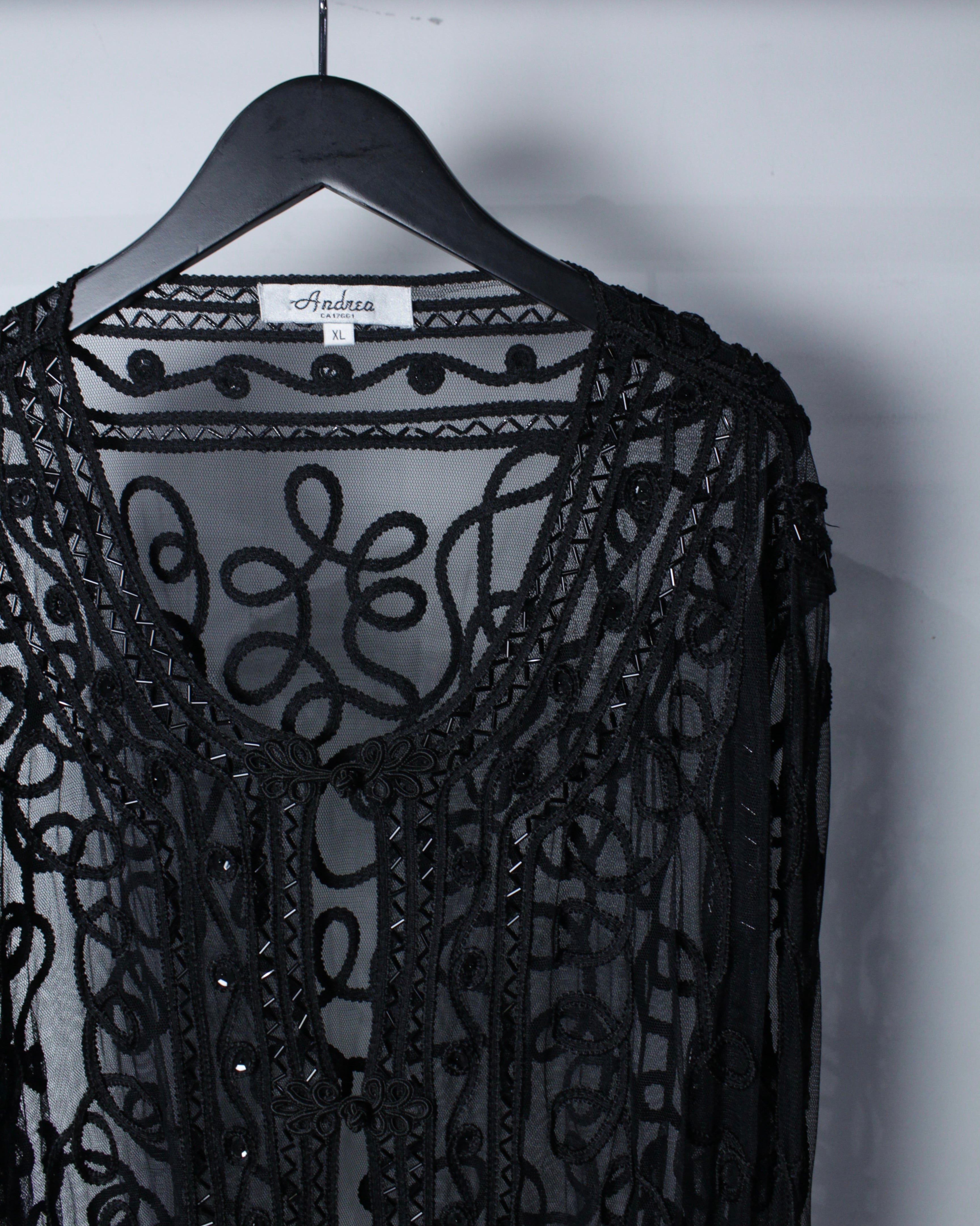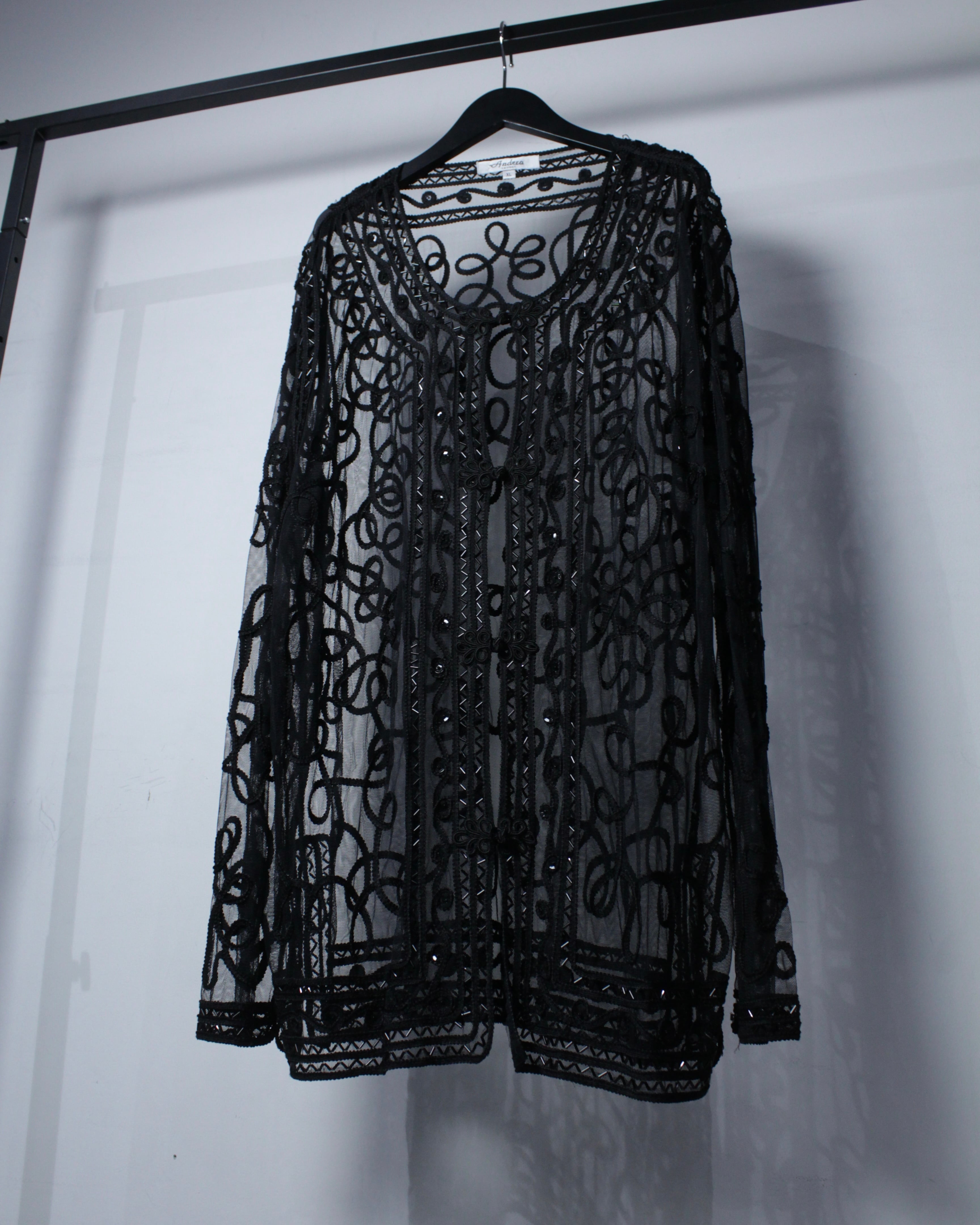 シアー素材に、オールブラックの刺繍テープによって美しい花柄を張り巡らせたシアージャケット。