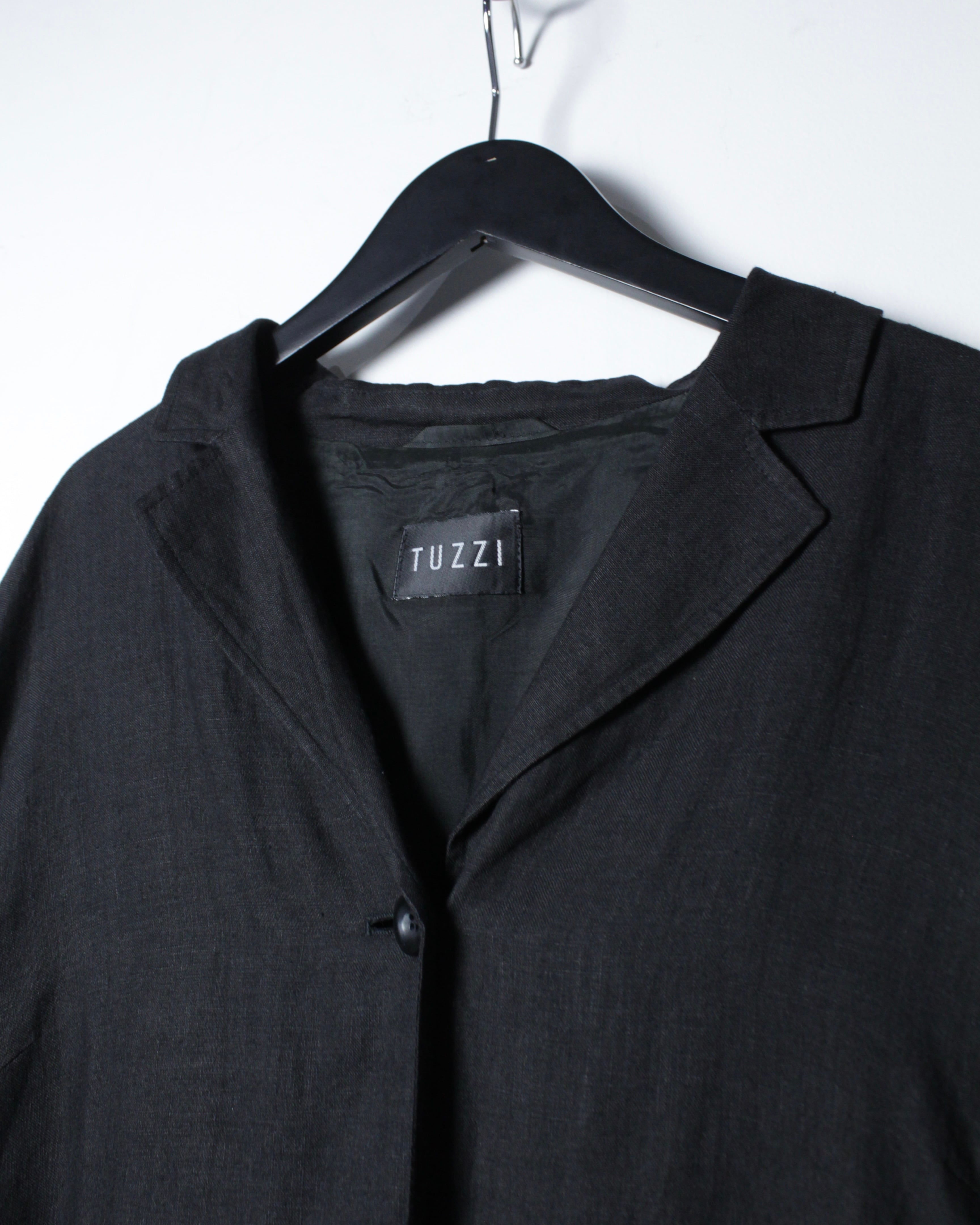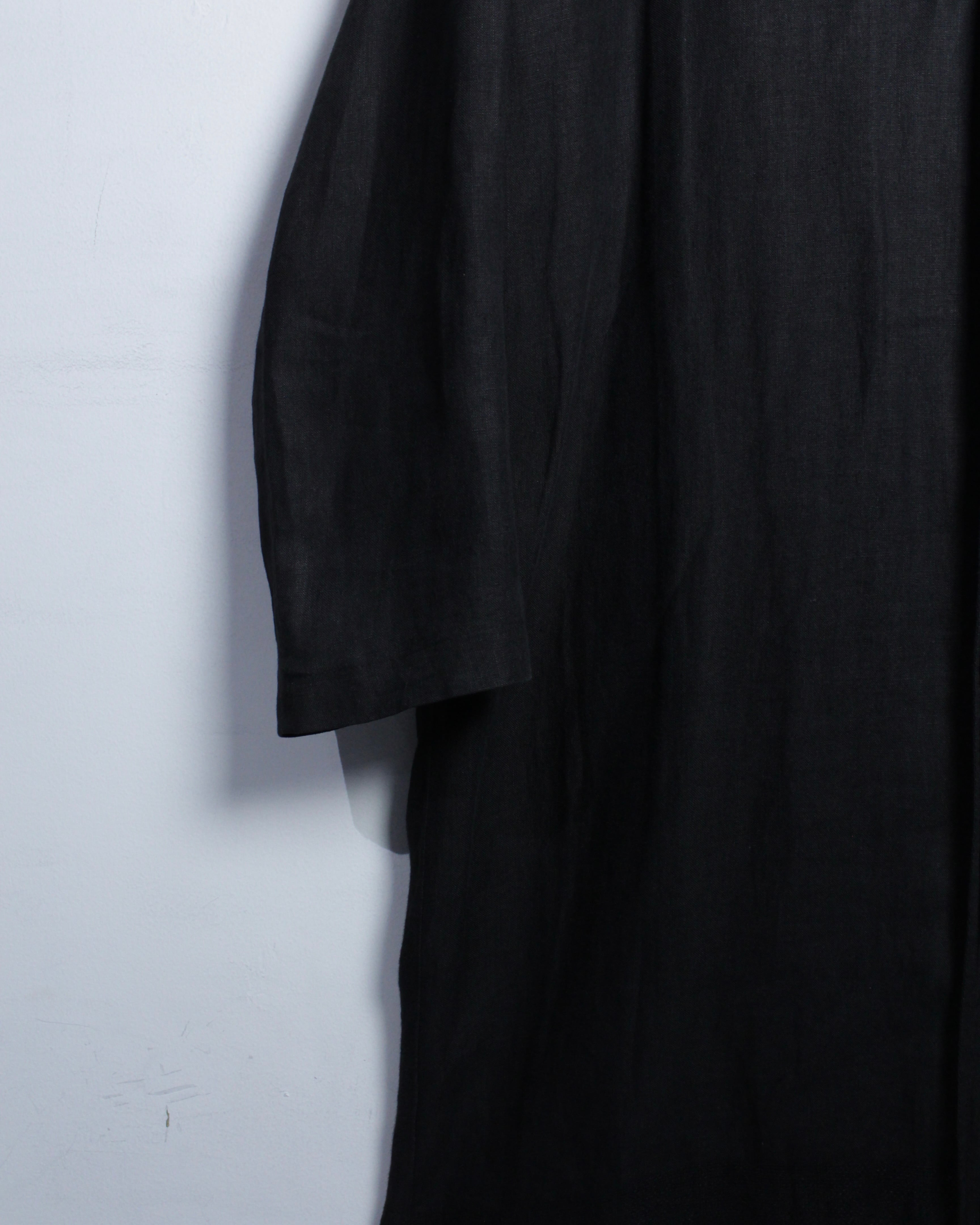 ハリ、コシのある上質なブラックリネンを用いたロングコート。ヴィンテージ業界に置いてブラックリネンは稀少価値の高いジャンルの1つですね。