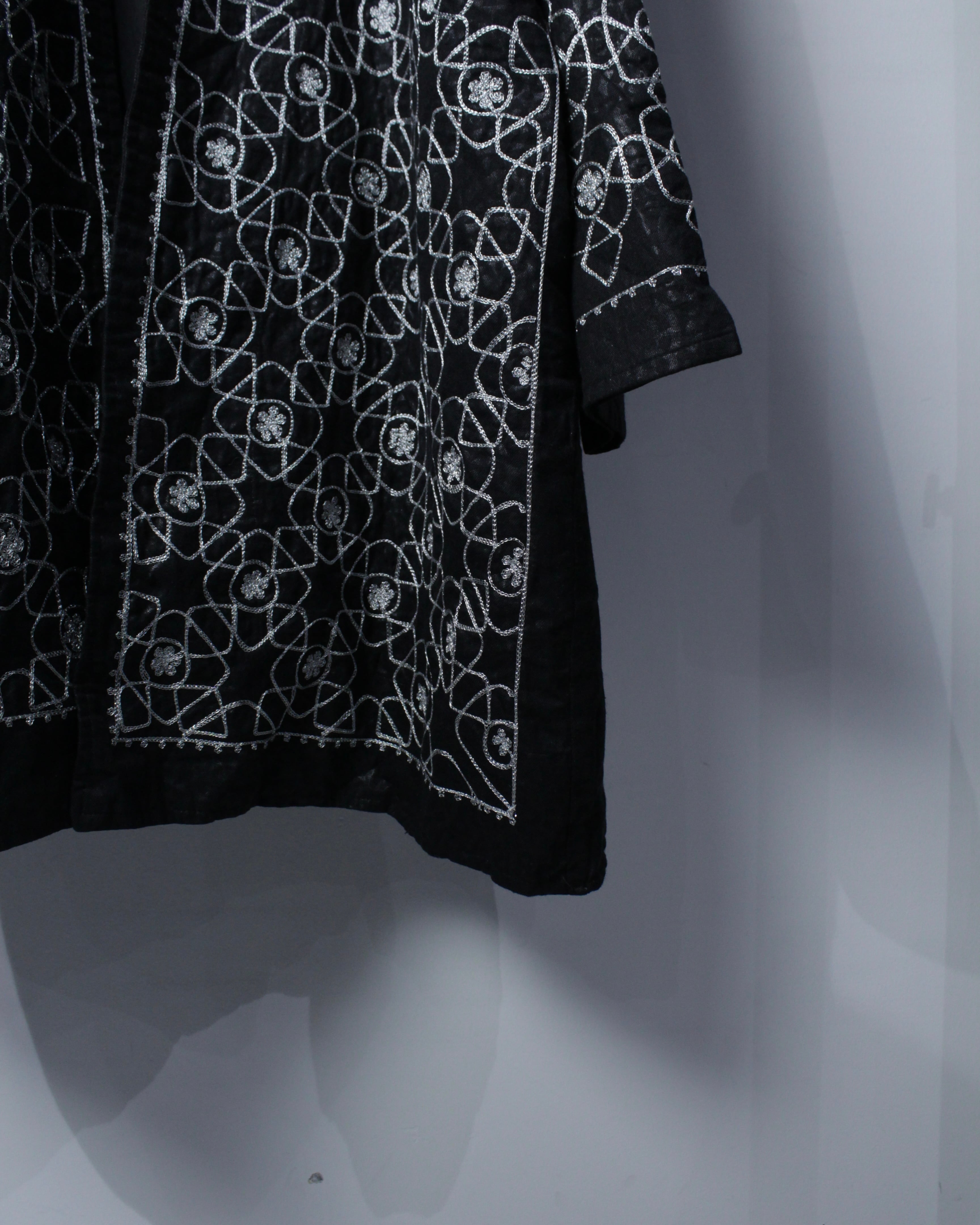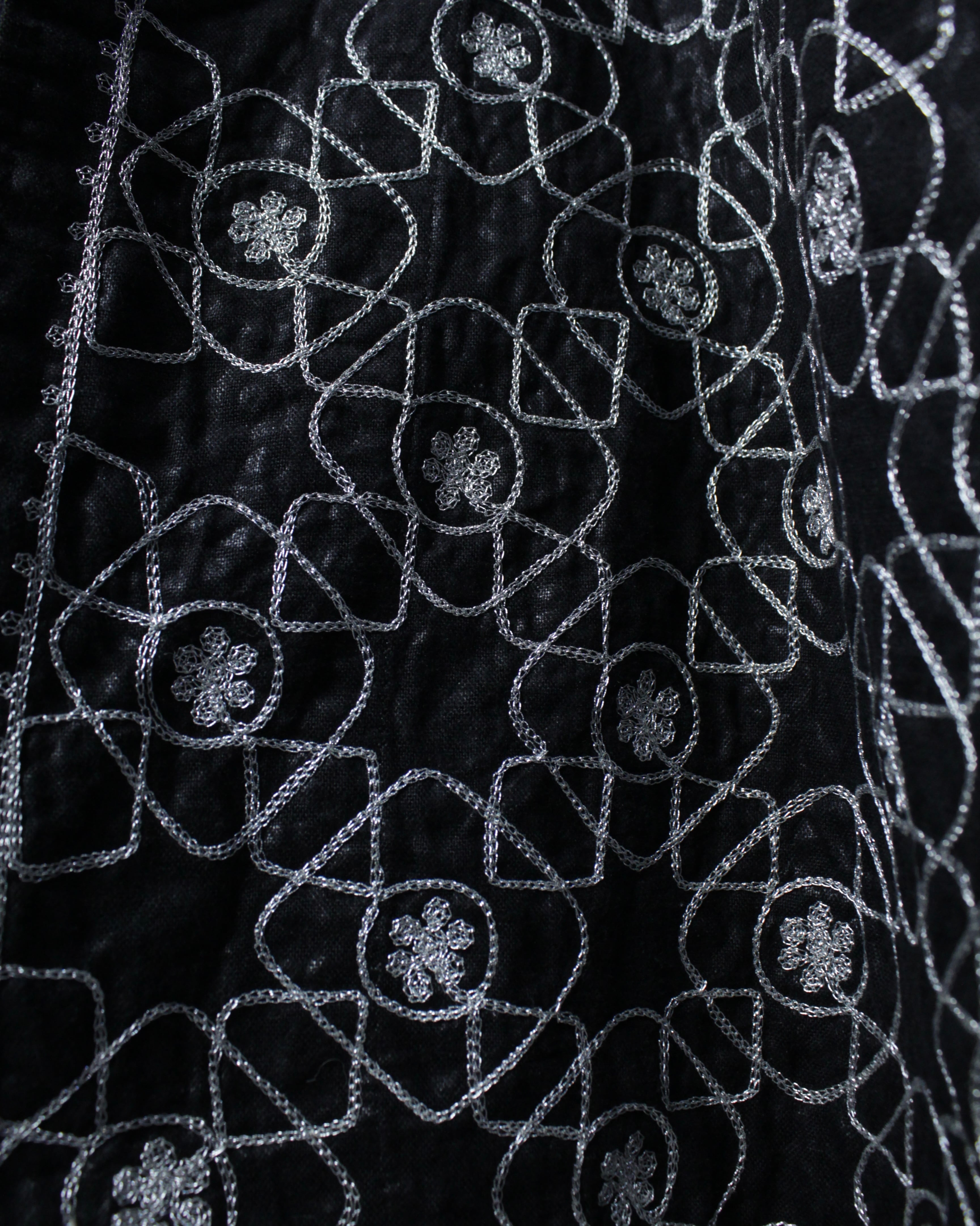 軽やかなファブリックをベースに、全面へ大胆に施された柄プリント。その上から立体的な刺繍を重ねることで、奥行きと陰影を感じる独特なルックスに仕上がっています。