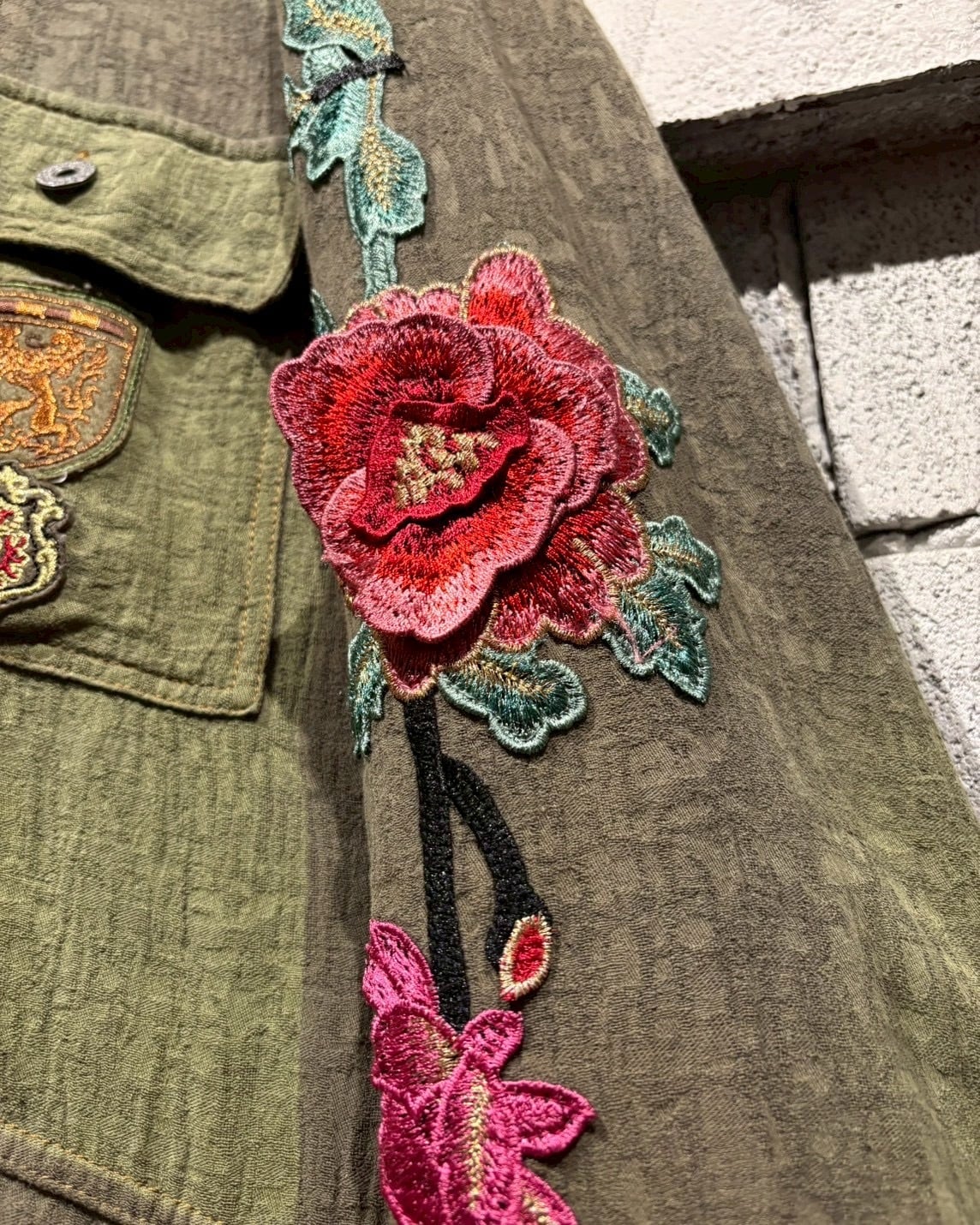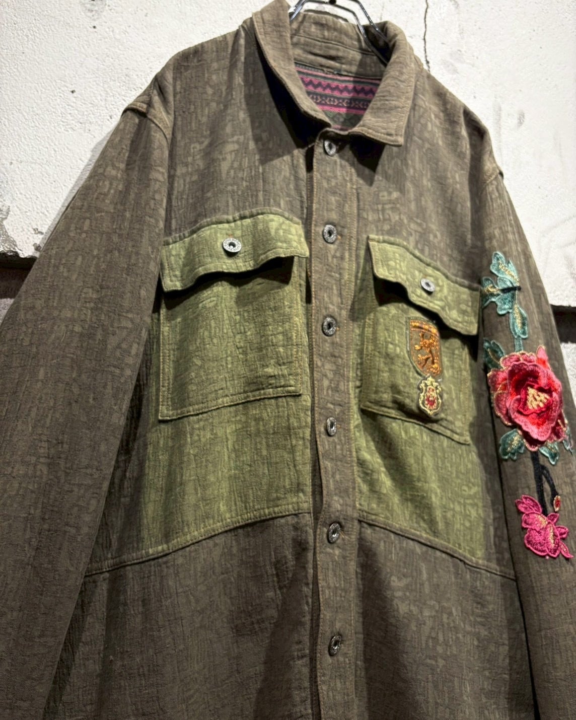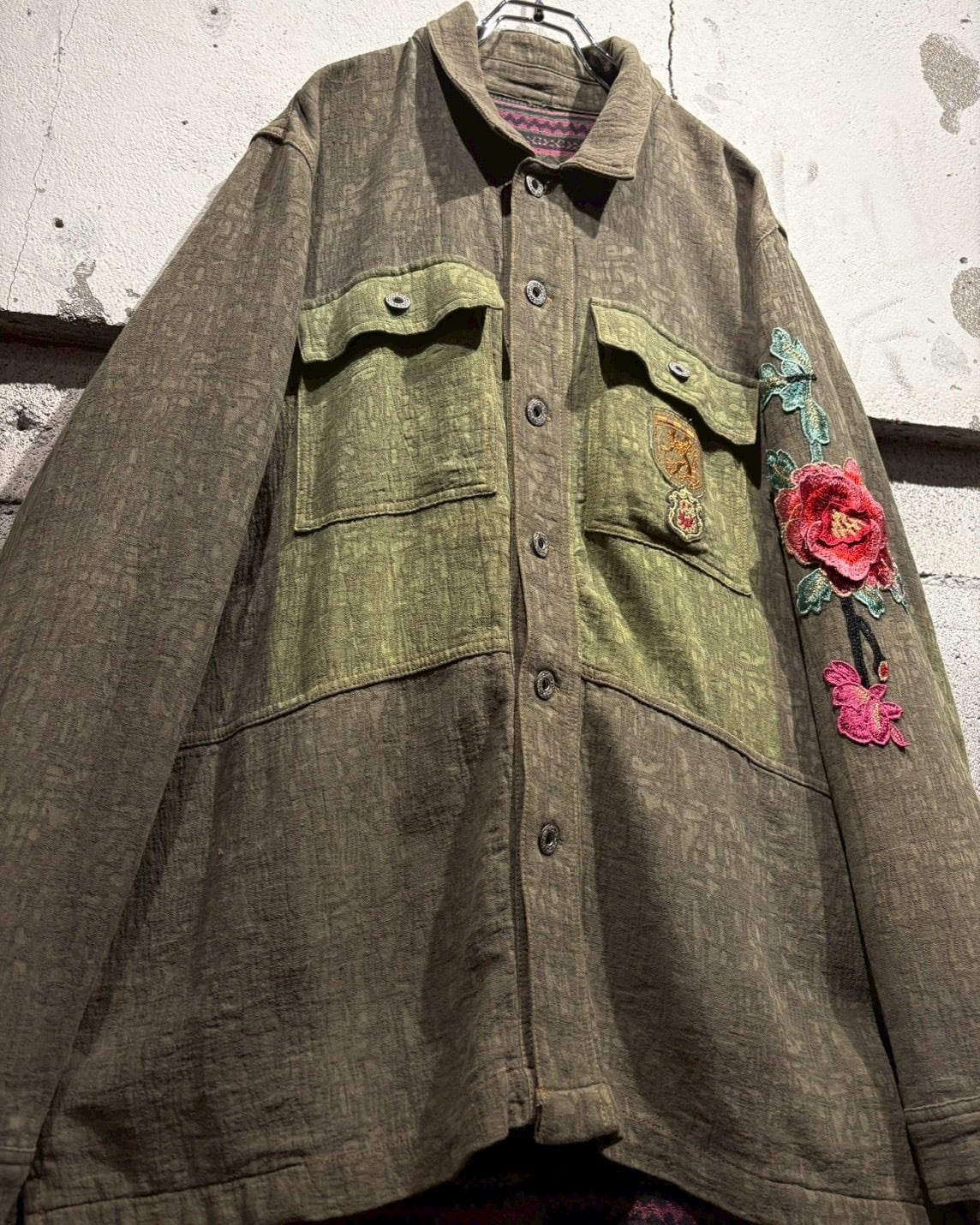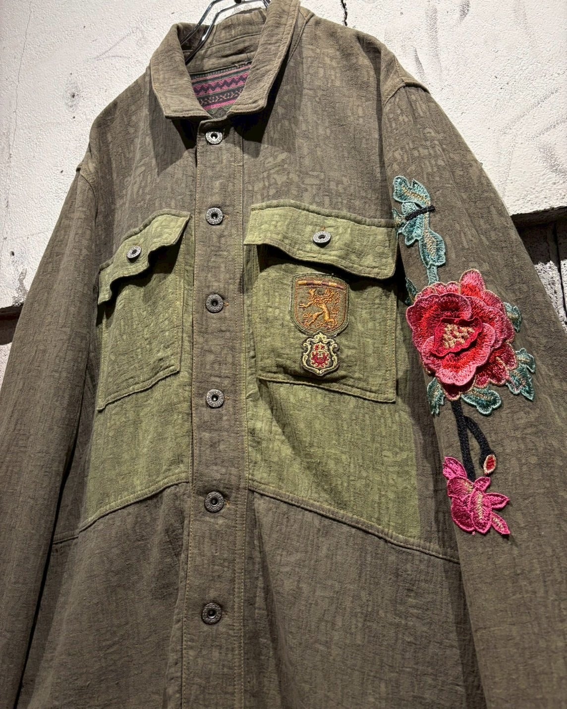 凹凸感のある、柔らかくドライな質感のボディに、左胸にはエンブレム調のワッペン、左腕に立体感のある花のパッチを施したシャツジャケット。