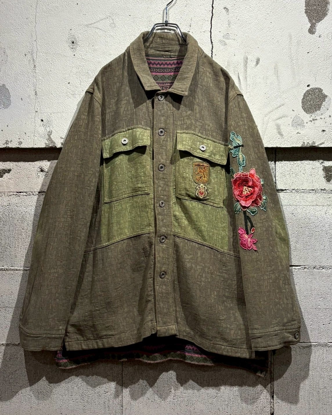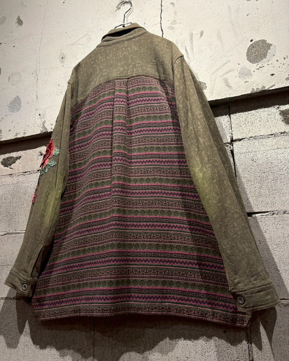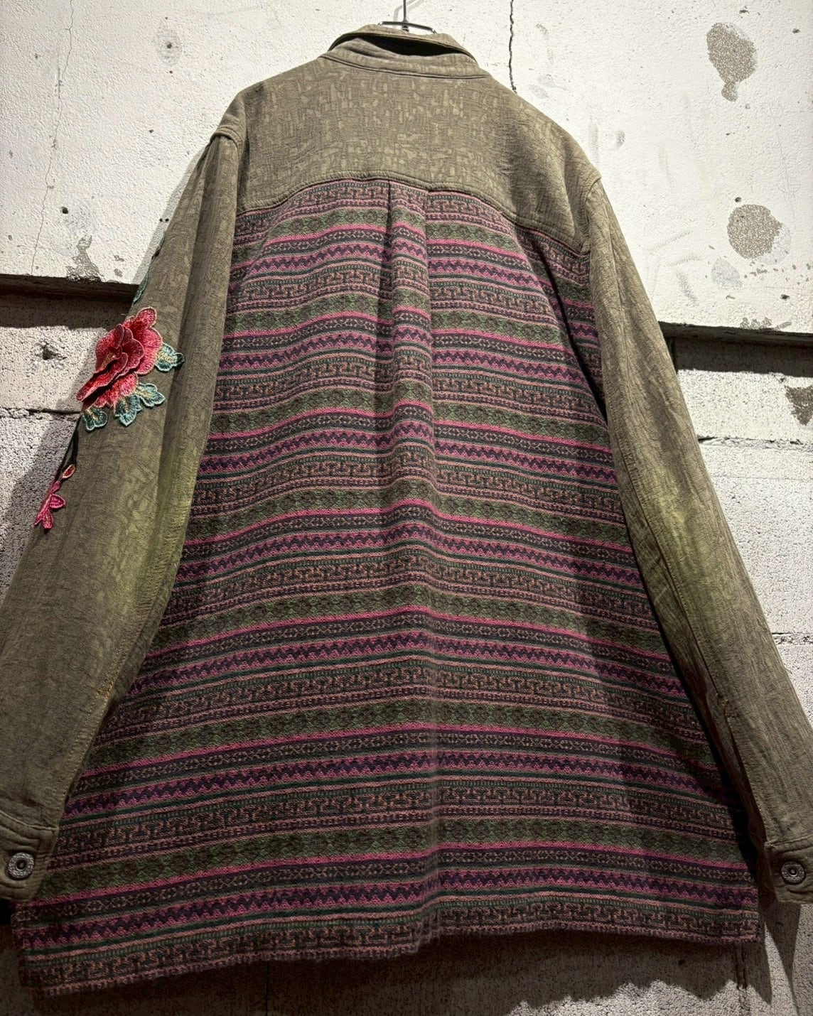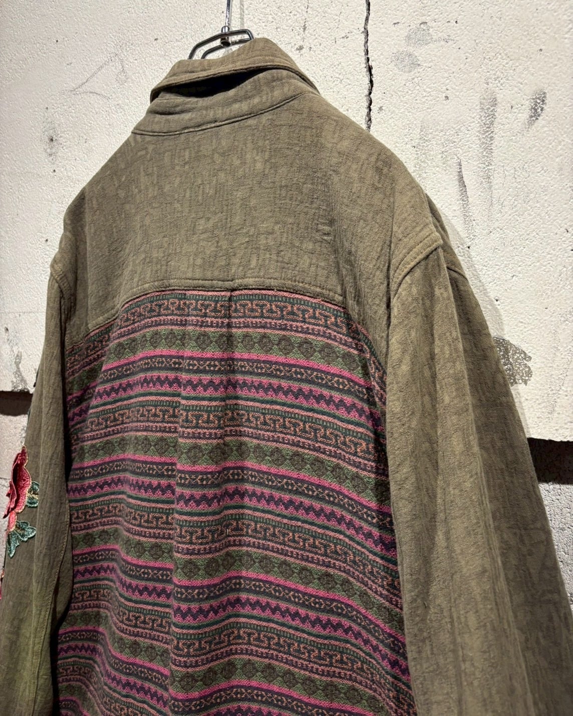 渋さのあるカーキのボディに、繊細で美しいワッペンやパッチを合わせる事で生まれたバランス感が秀逸。背面のエスニック柄の織りの切り替えも◎