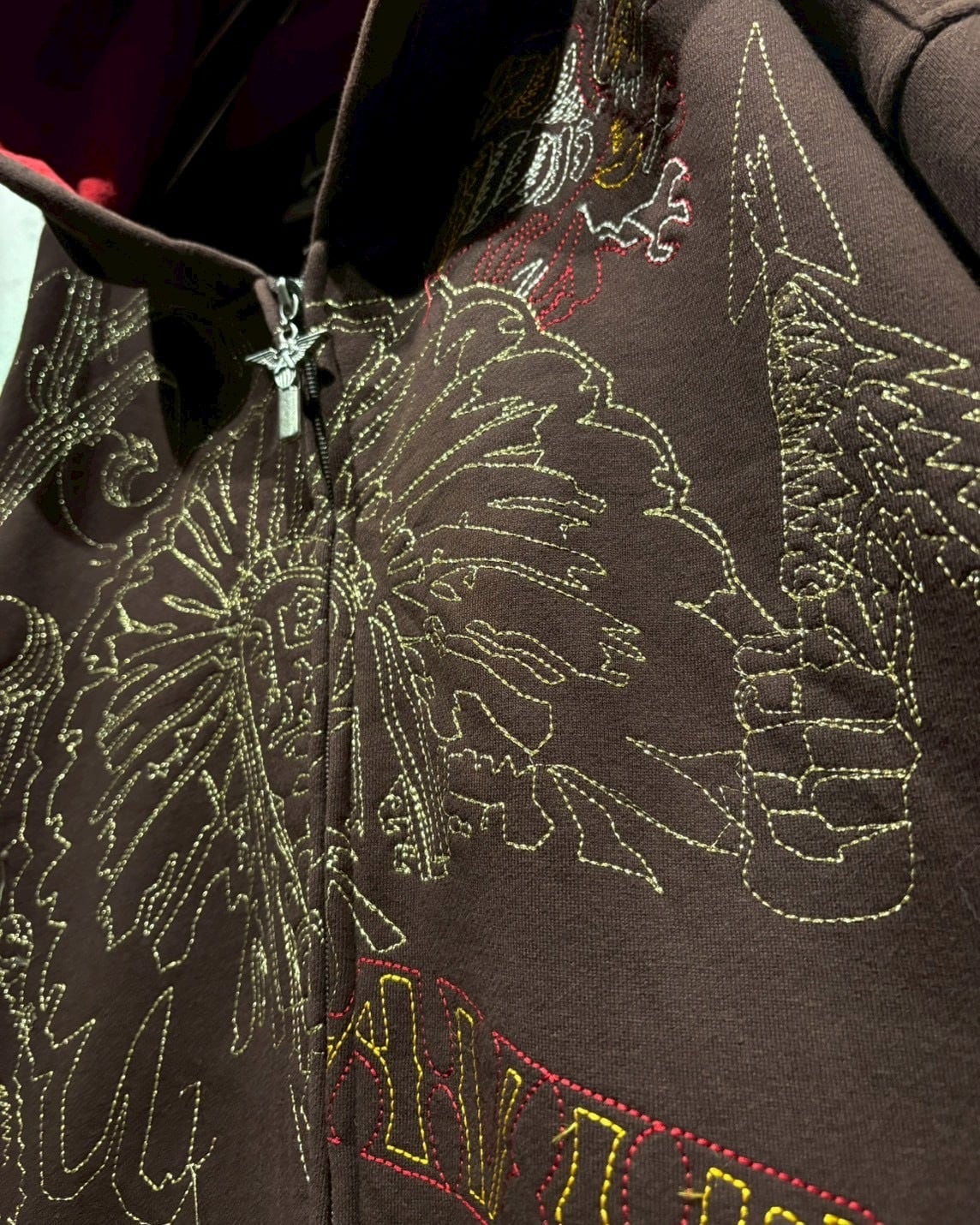 肉感のあるコットンボディをベースに、落ち着いたブラウンカラーでまとめた1着。そこにラメ糸を用いた刺繍を全面に走らせることで、圧倒的な存在感を放っています。