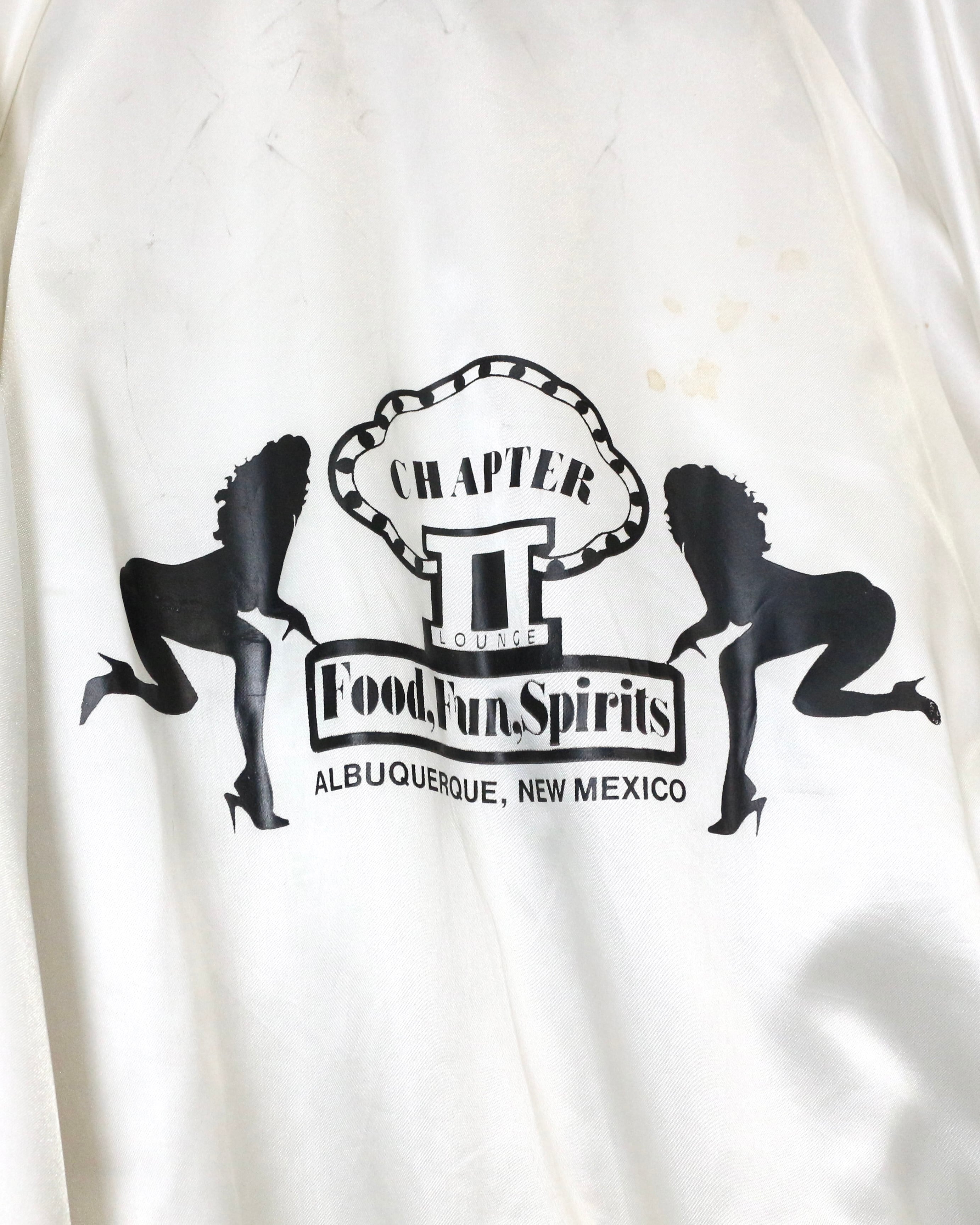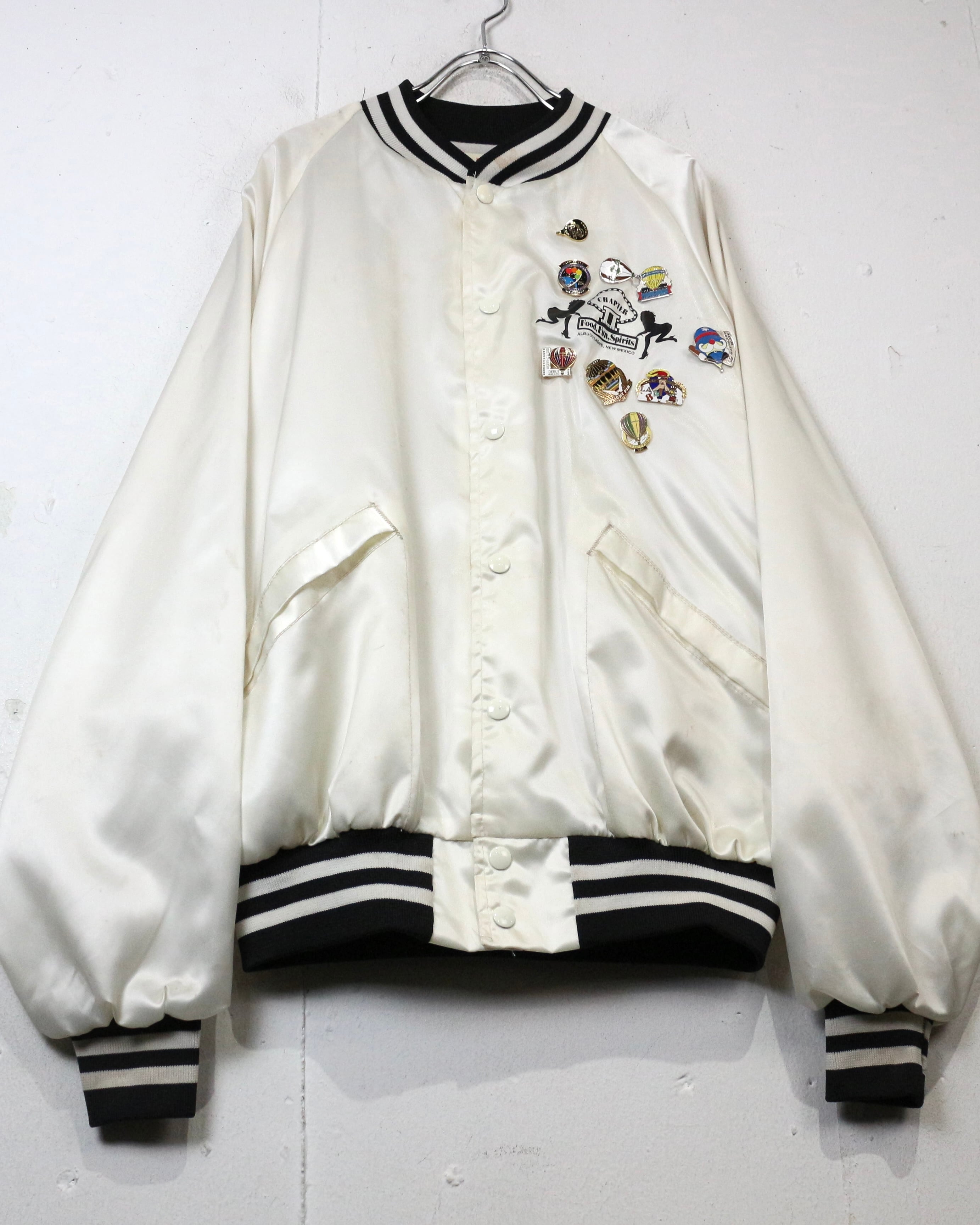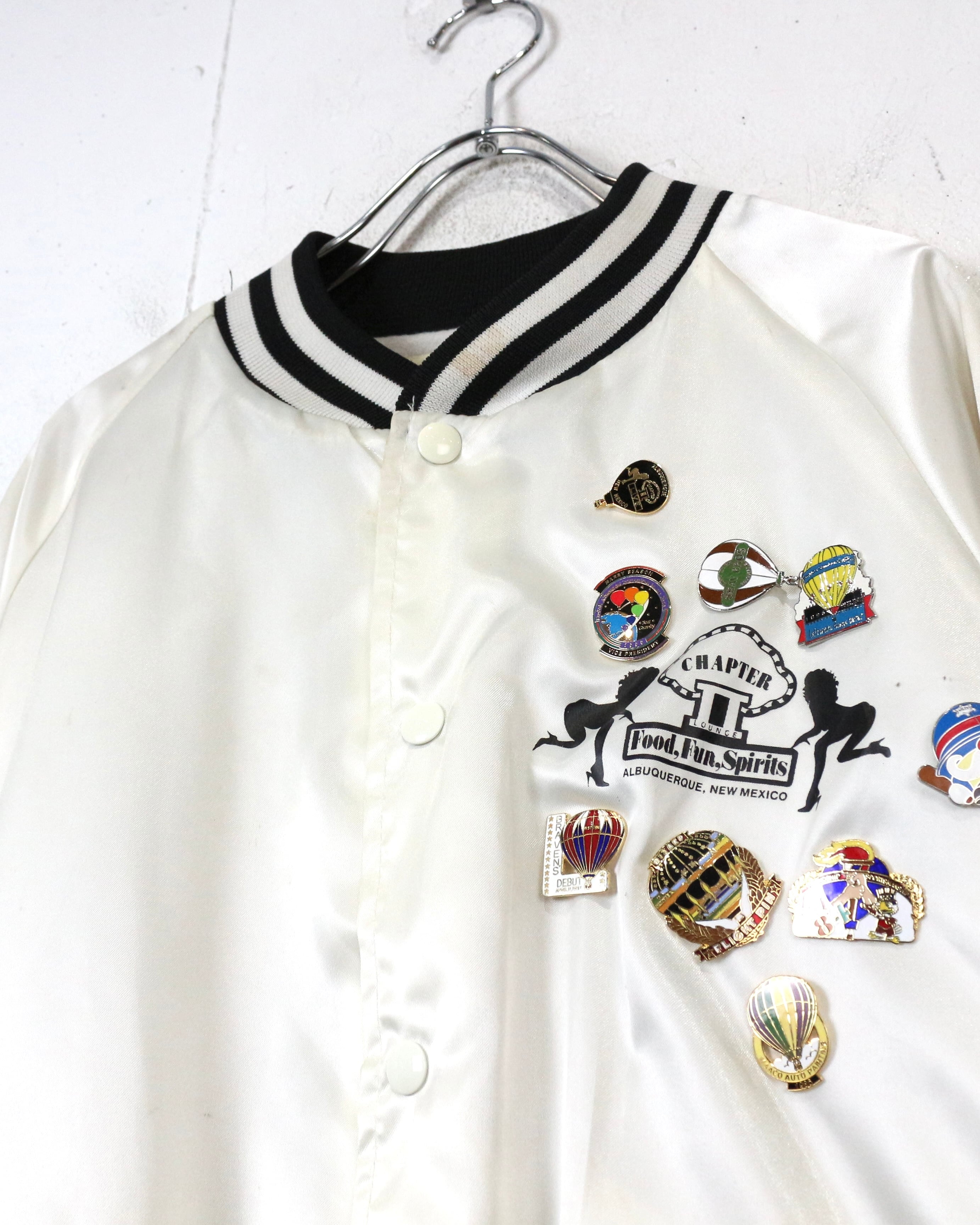 ローカルラウンジのスタッフジャケットとして使用されていた背景を持つ1着。フロントにはピンズを贅沢に配置し、当時の背景が読み取れたりと、ヴィンテージならではの1点物の表情へと昇華されています。