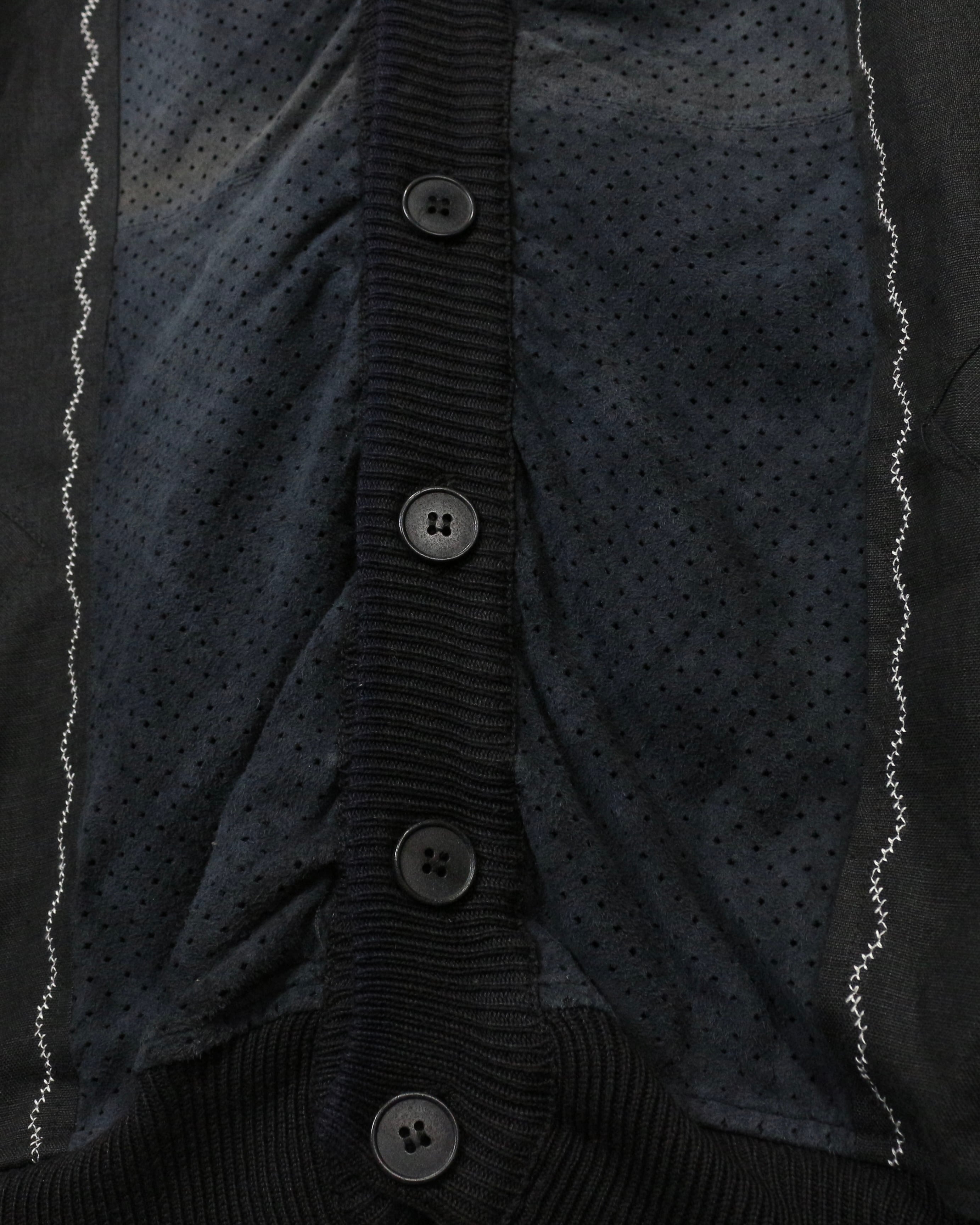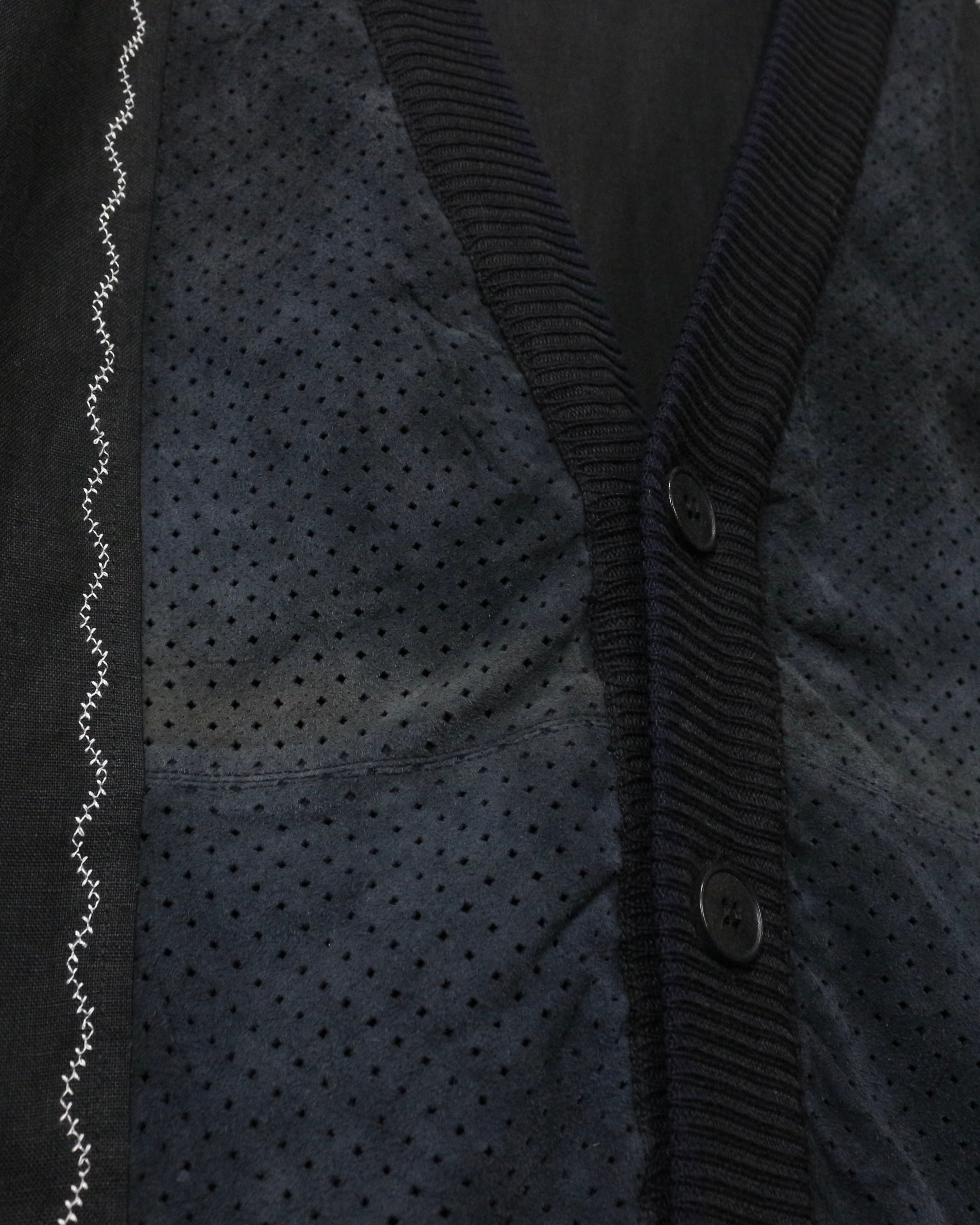 ドライな質感のボディをベースに、フロントのみパンチングレザーを切り替えた1着。スエードレザーの質感に、絶妙なフェードが雰囲気をしっかりと漂わせています。