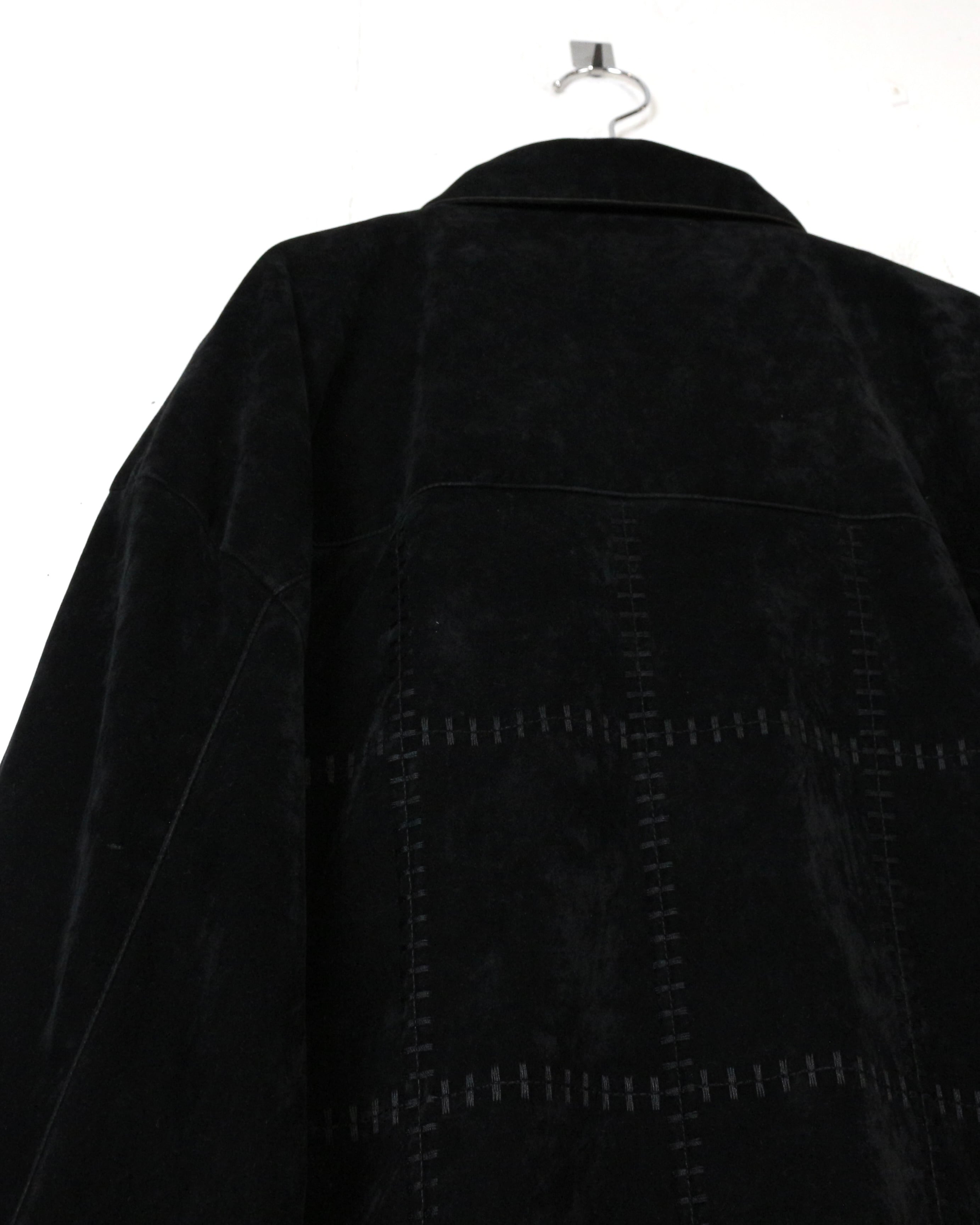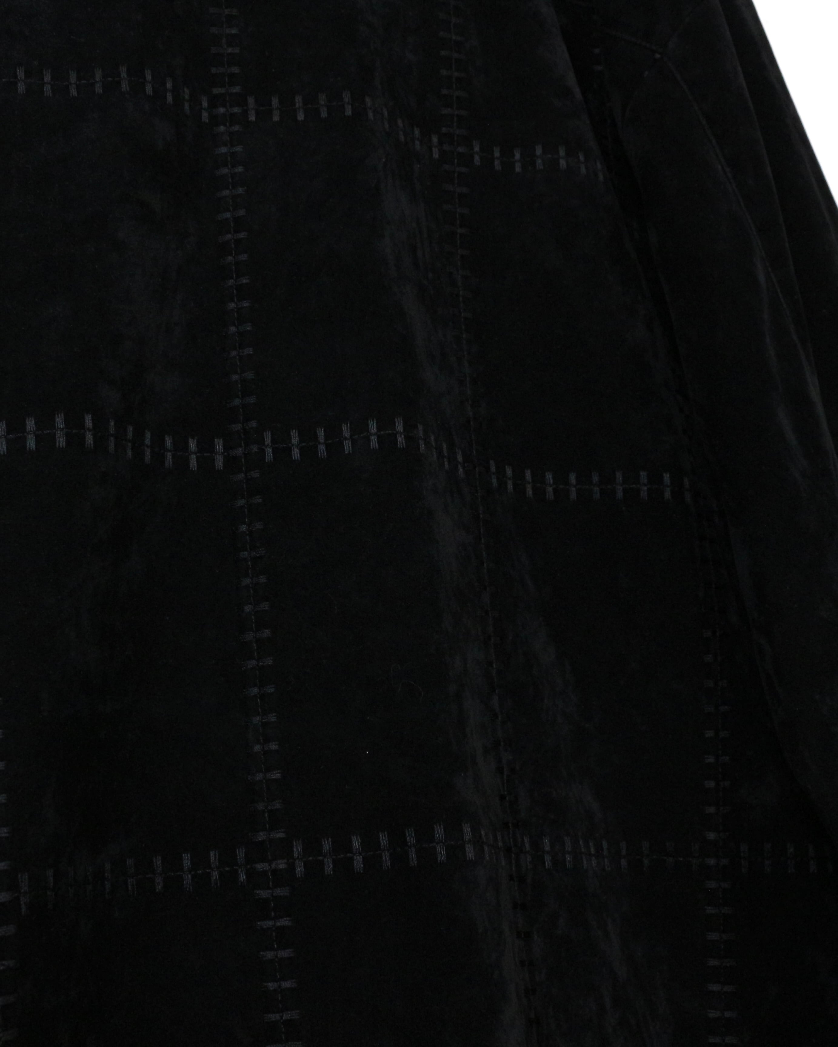 一見ソリッドなブラックながら、光の当たり方で浮かび上がるパッチワーク調の切り替えデザインが特徴的な1着。