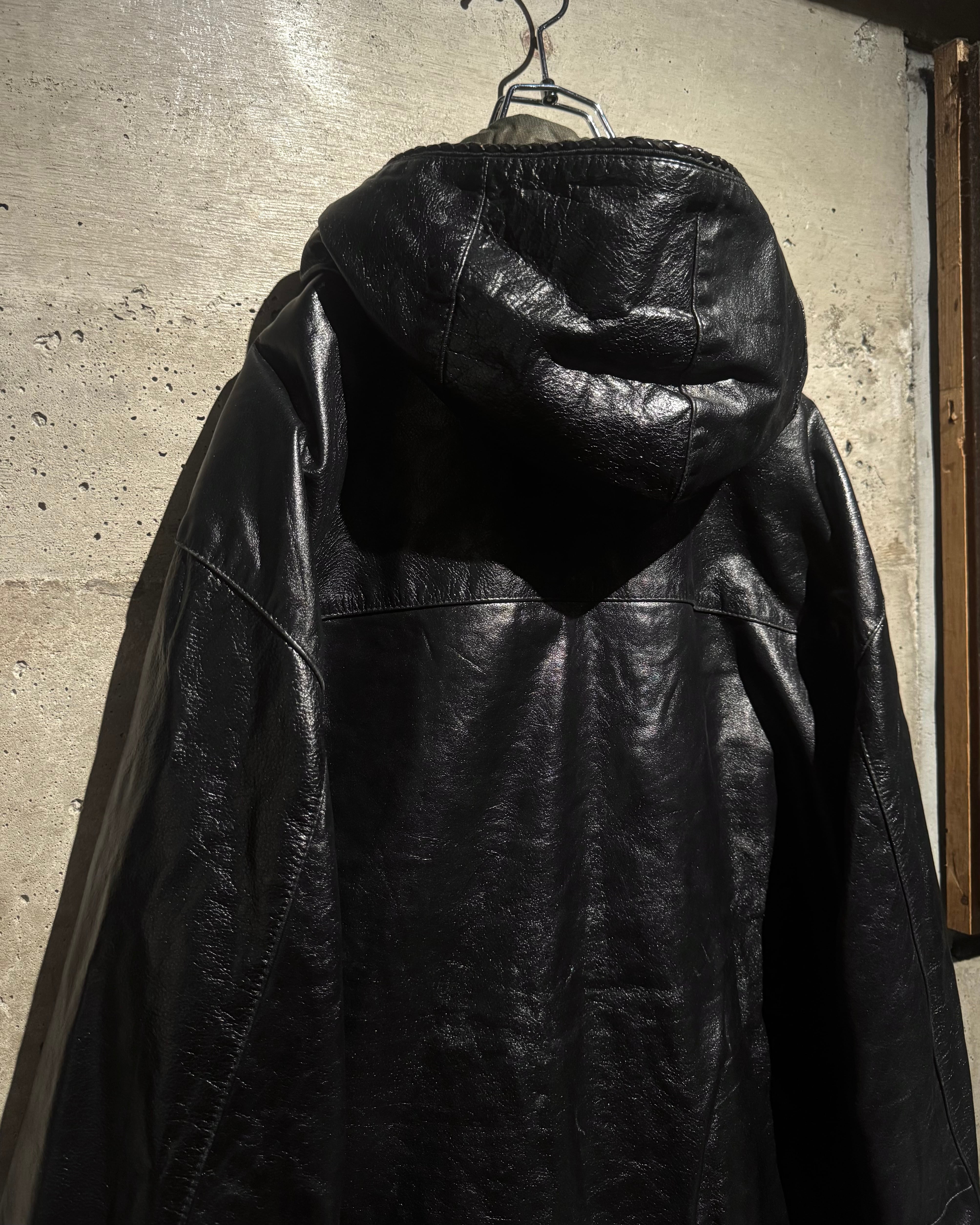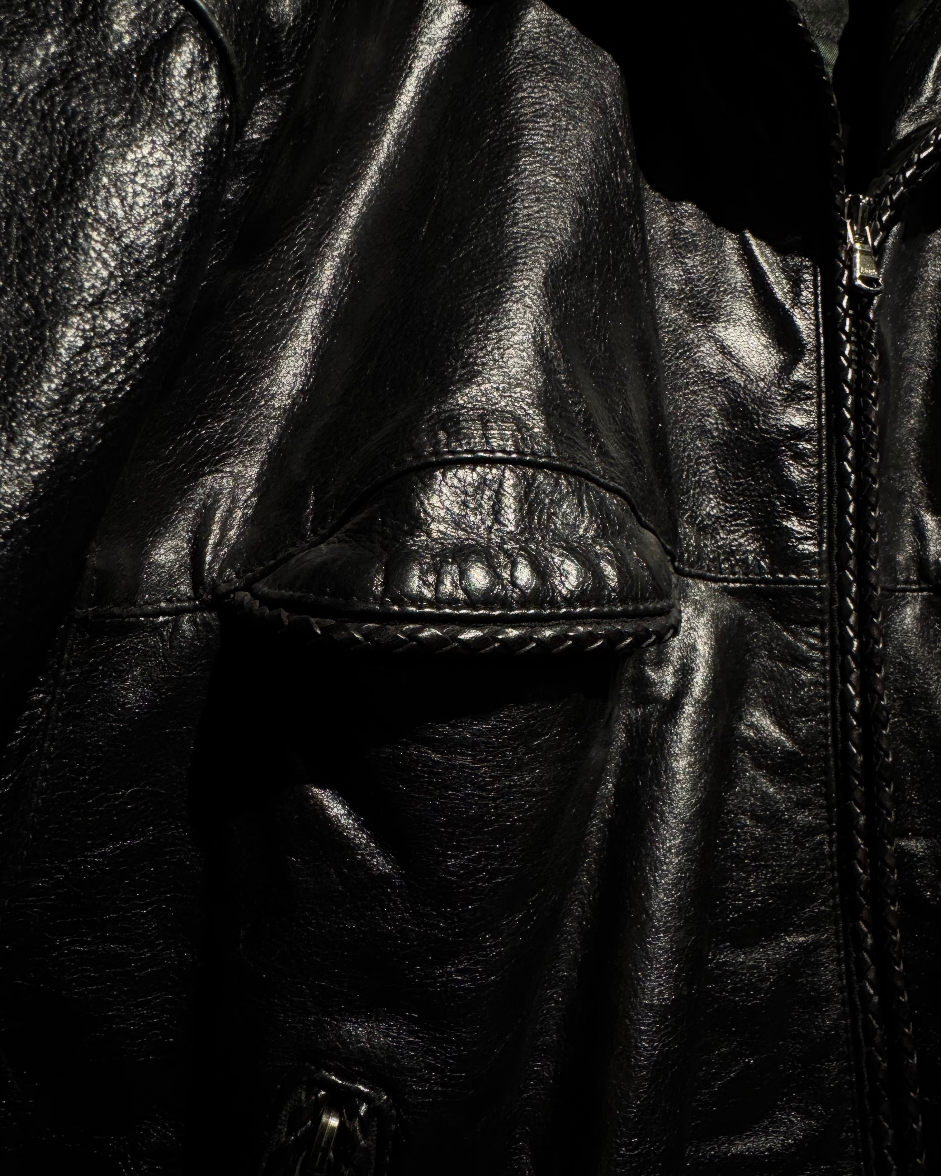 前立てやフード周り、ポケット口やフラップに至るまで、編み込みレザーによるパイピングを随所に配置。ミニマルな中に職人技が宿るディテールワークが光ります。