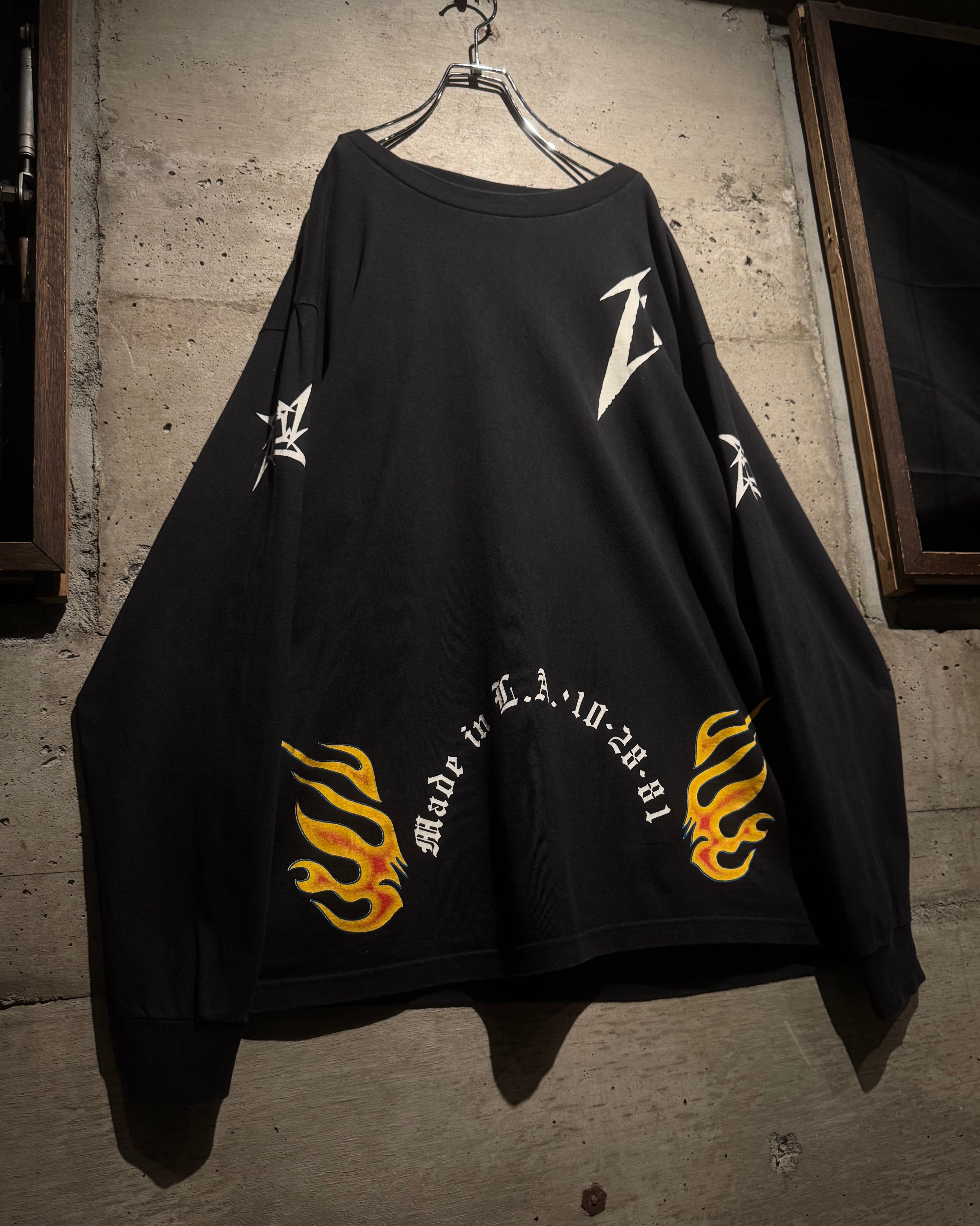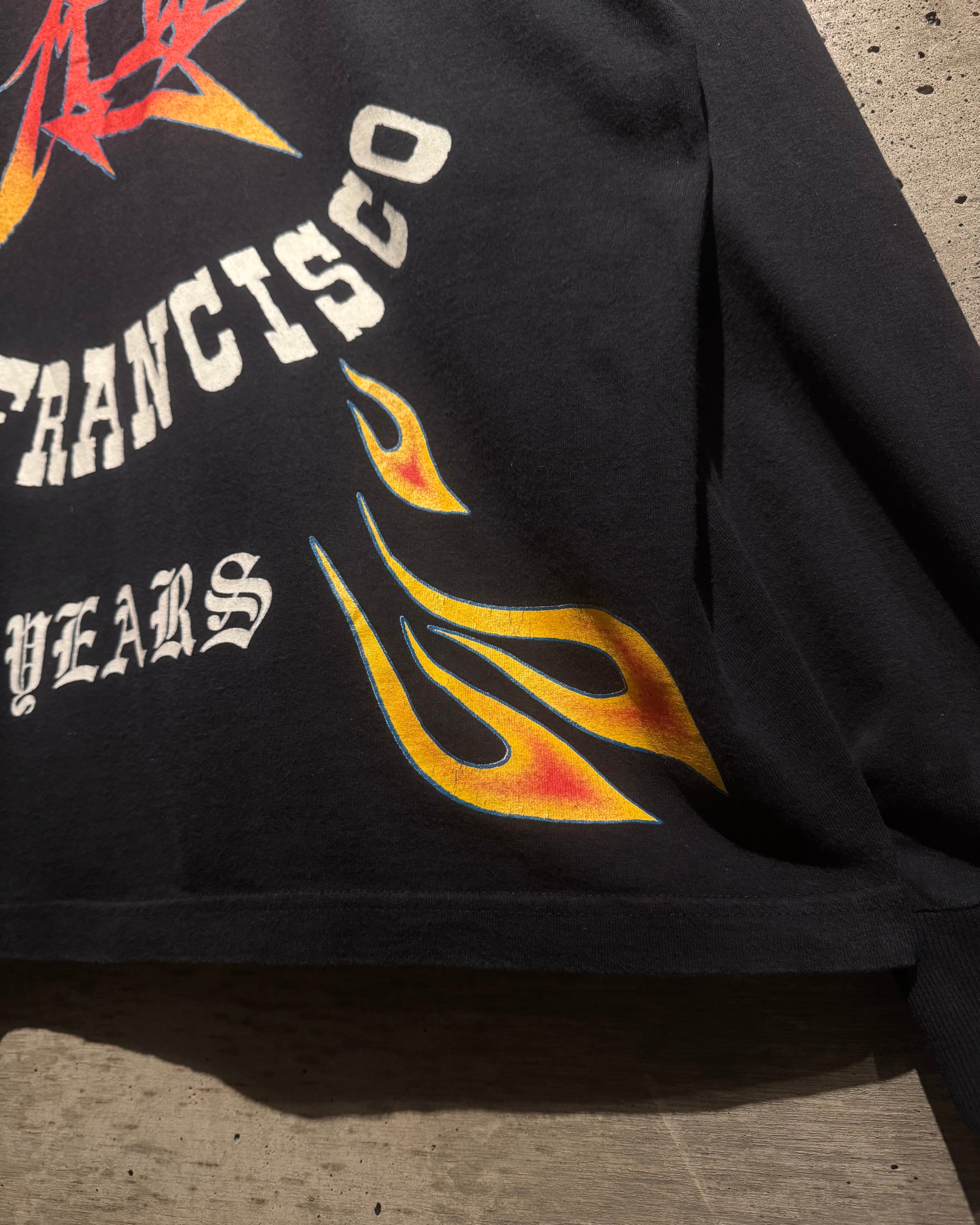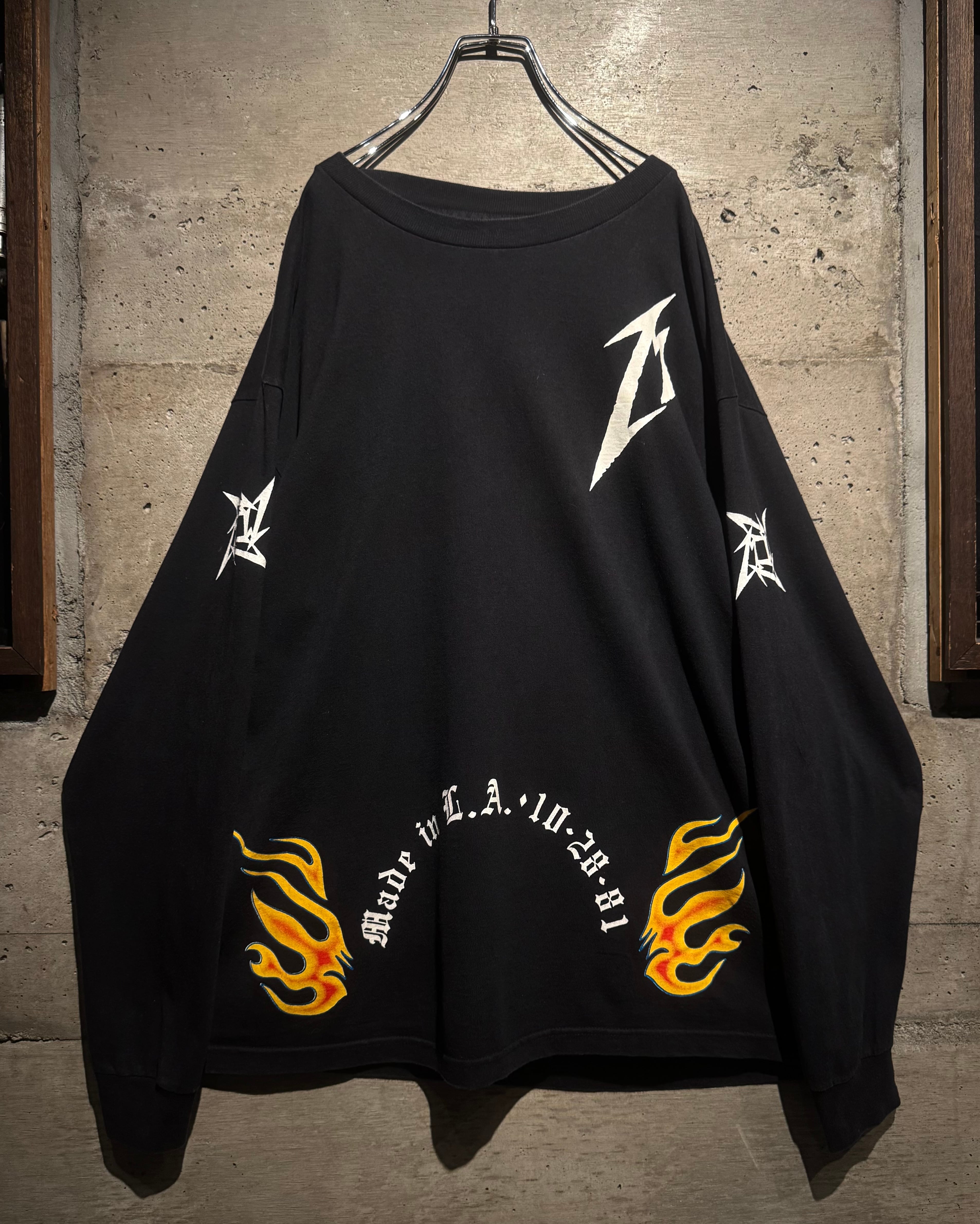 背面には“METALLICA SAN FRANCISCO 15 YEARS”のアニバーサリープリントに加え、ブランドの象徴とも言えるニンジャスターロゴを大胆に配置。フレイムパターンと“Made in L.A. 10•28•81”、左胸や袖にもロゴを散りばめ、前後左右死角無しの1着に仕上げられています。