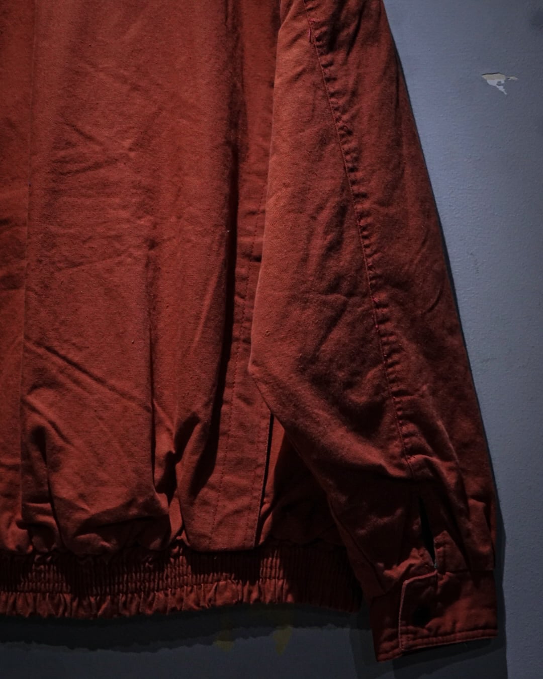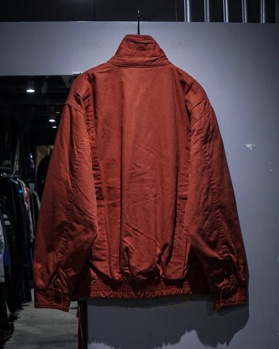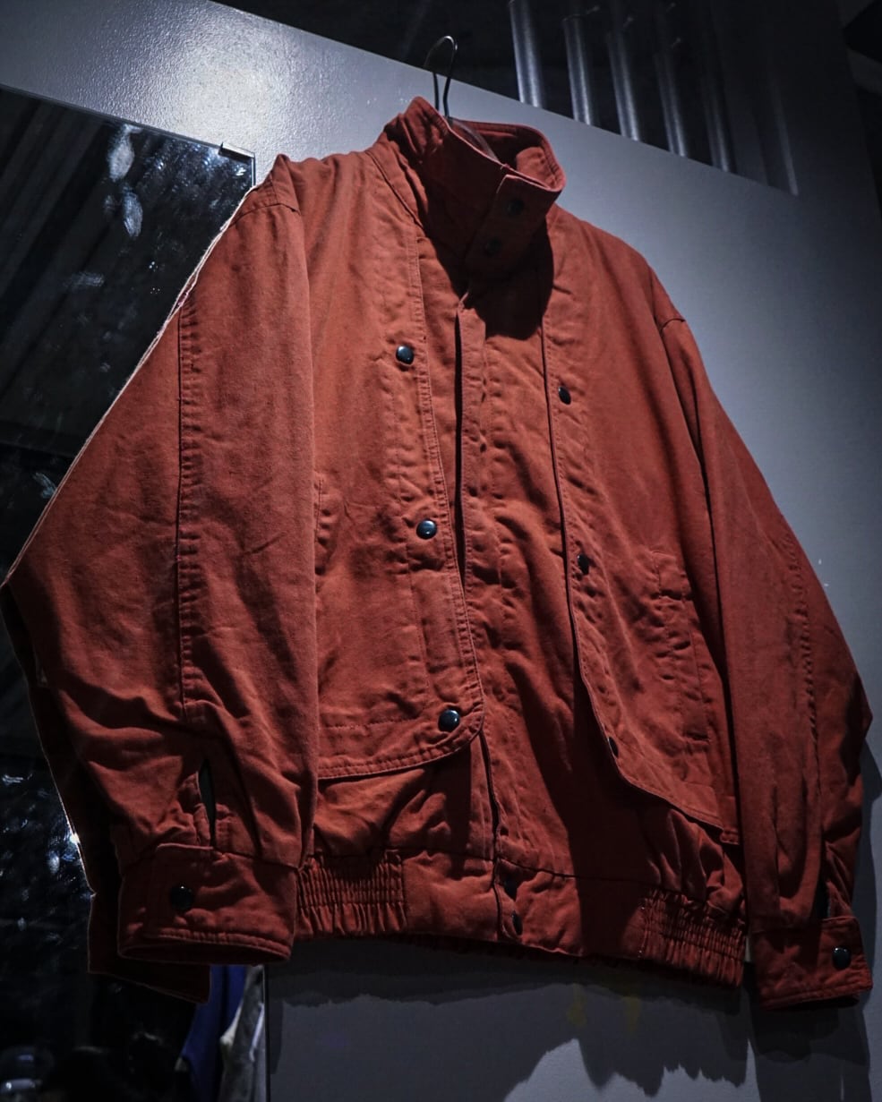 ガシッとタフな、赤のダック生地をボディに用いたハイネック型のブルゾンジャケット。