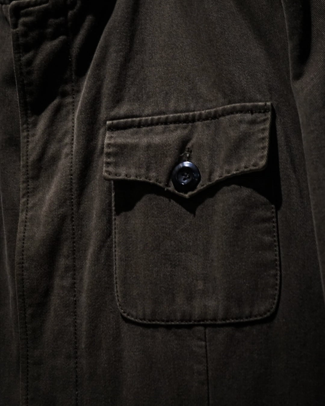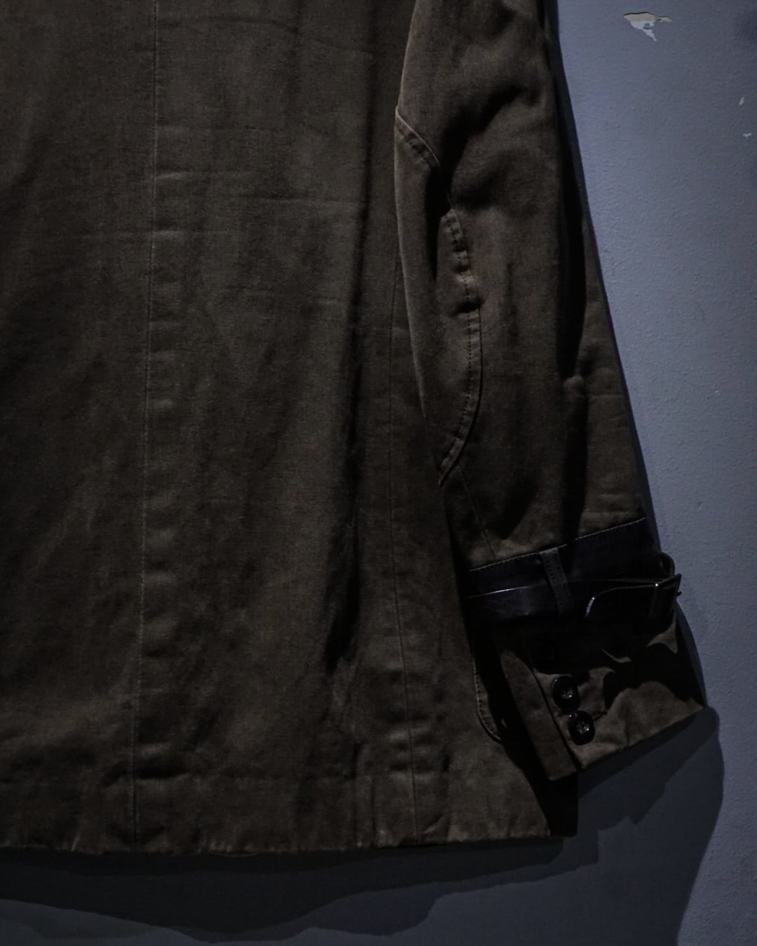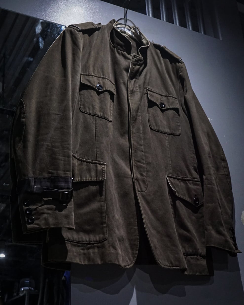 フロントには4つのフラップポケットを配置し、実用性とデザイン性を両立。肩にはエポレットを備え、ミリタリーらしいディテールをしっかり踏襲。さらに右アームにはレザーベルトをあしらい、さりげないアクセントを加えると共に、アルチザン的な意匠を感じさせます。