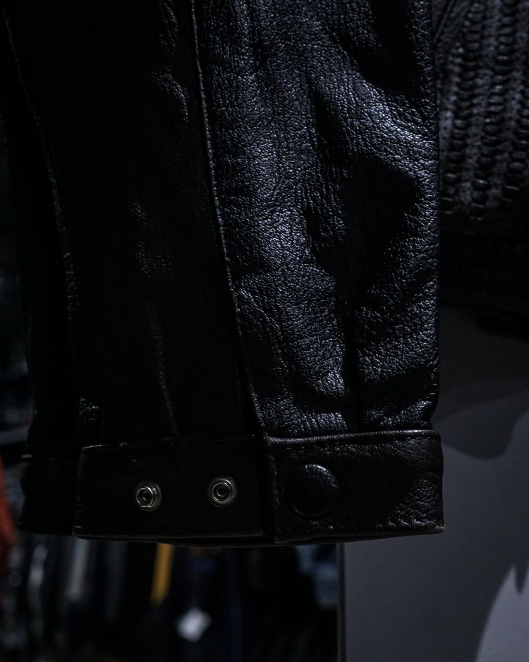 襟は角張った変形デザインで、シンプルなレザーとは一線を画すモードな印象に。肩周りはドルマンスリーブでゆとりを持たせ、身幅は広く、裾にかけて締まる短丈シルエット。着用時に独特の立体感とバランスを生み出します。