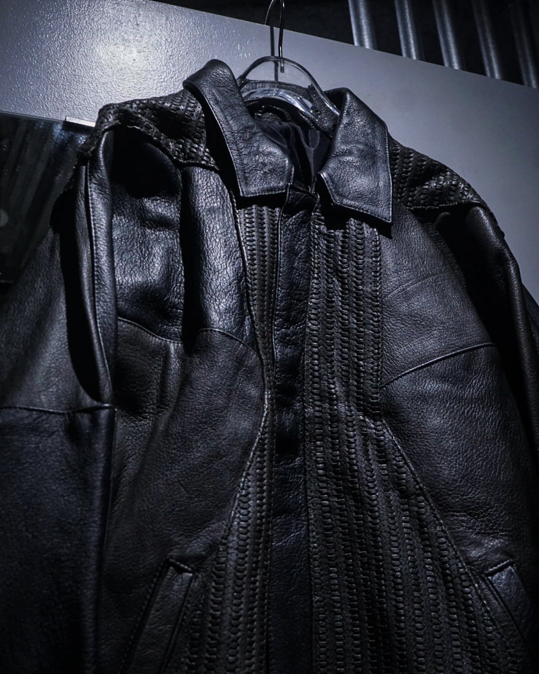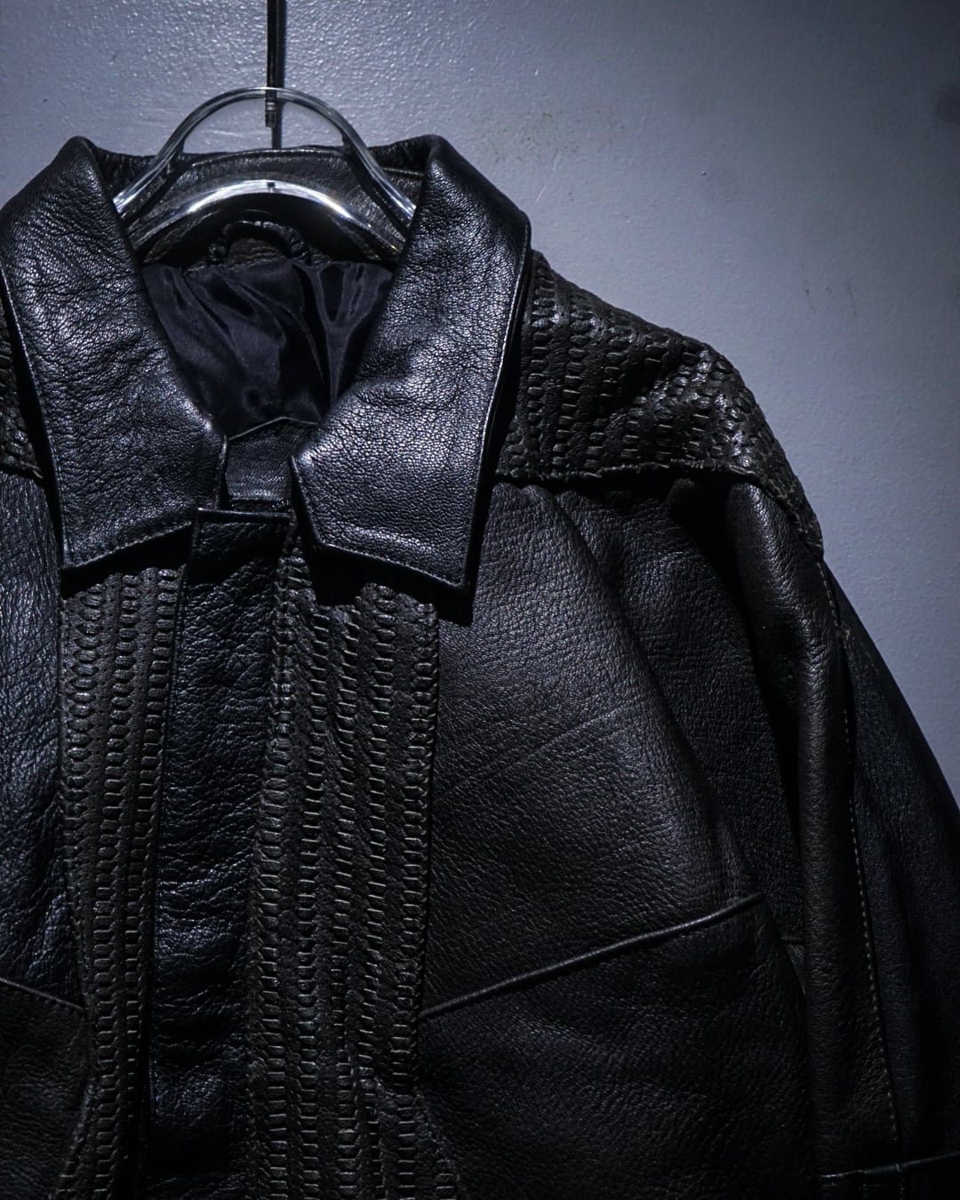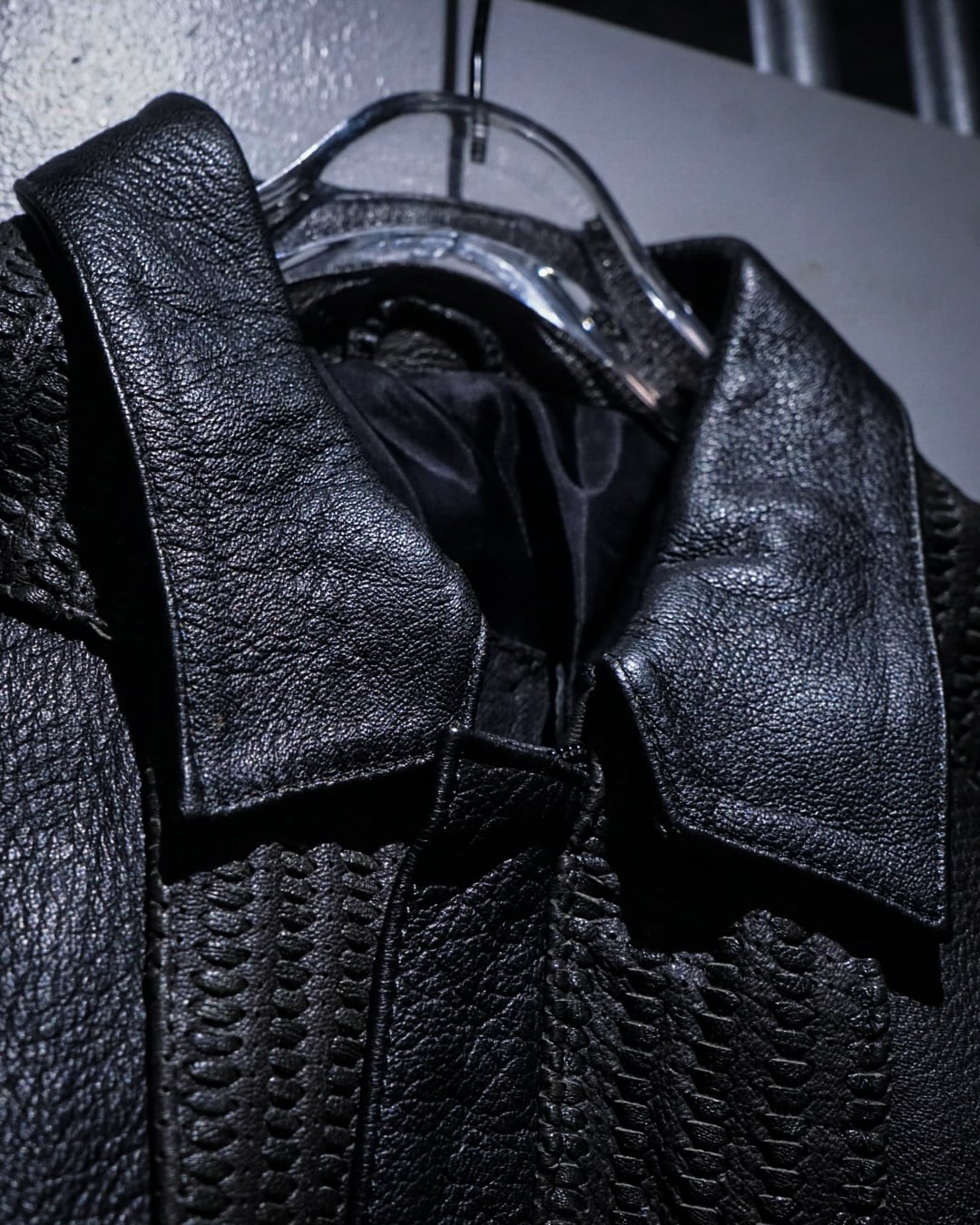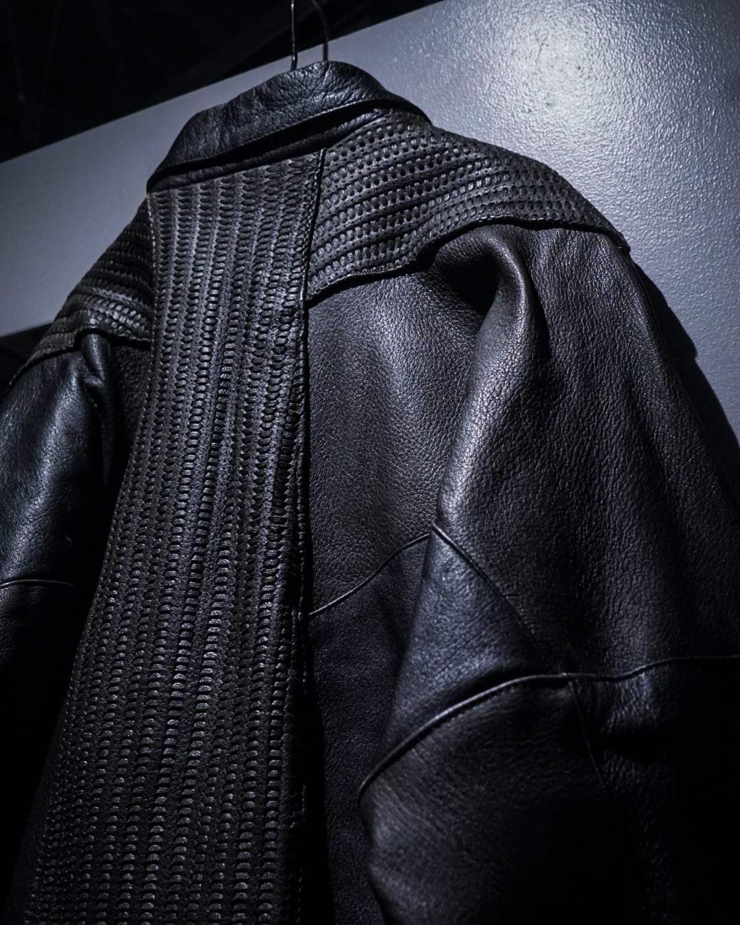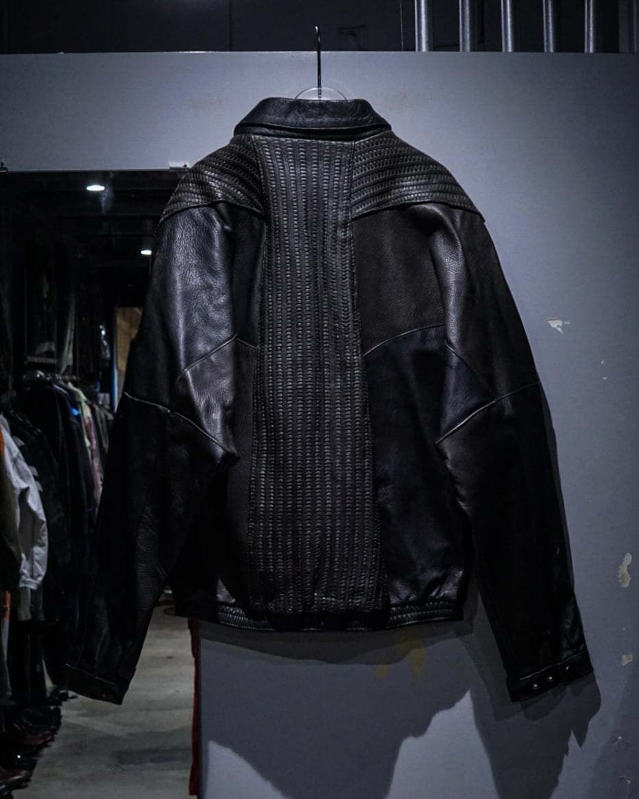 フロントは比翼仕様でミニマルに仕上げつつ、中央から背面にかけて大胆に配置された編み込みレザーが強い存在感を演出。単色に留まらない奥行きのある表情で、光の当たり方によって質感の違いが際立つ一着です。