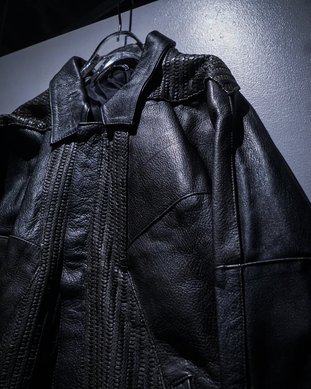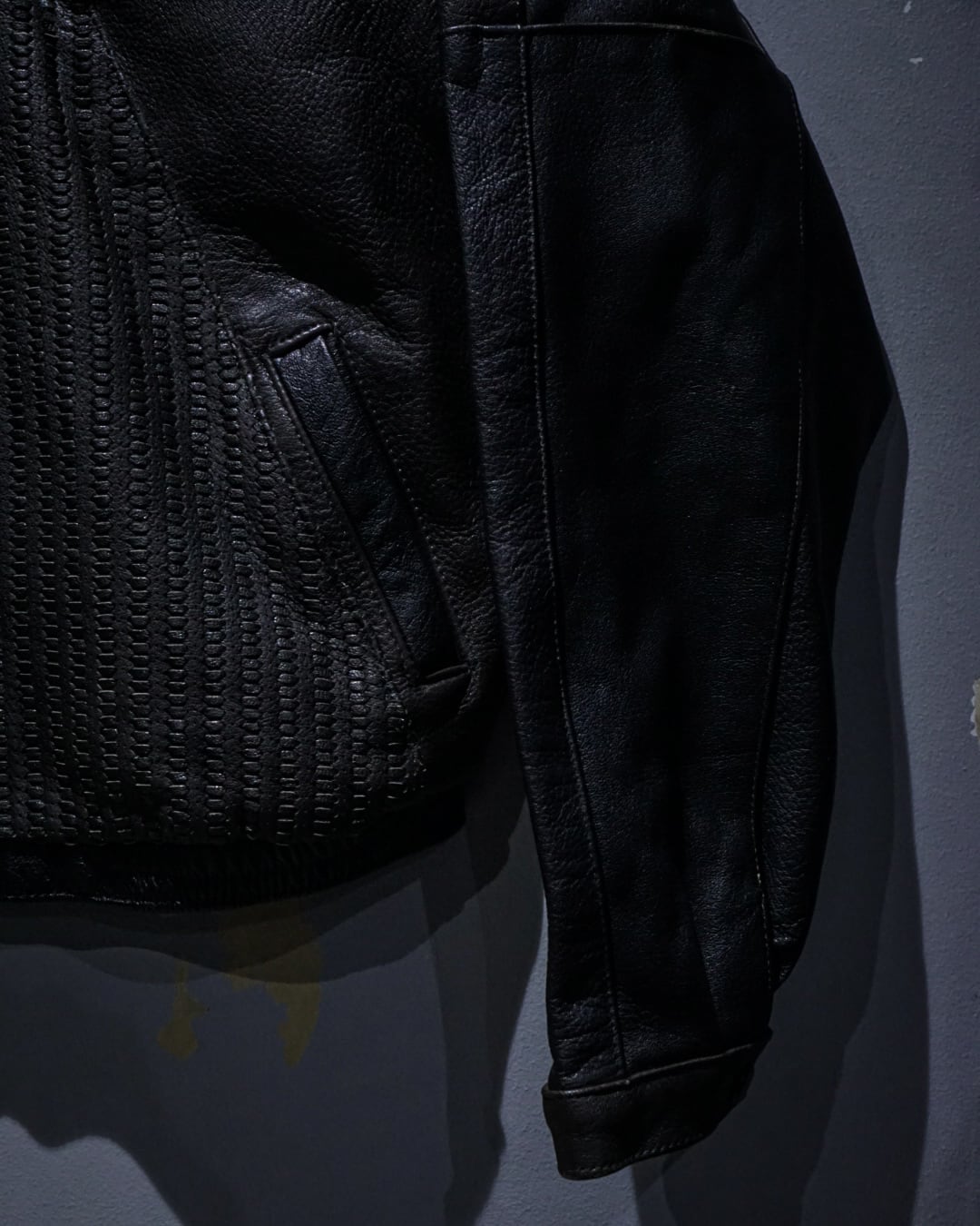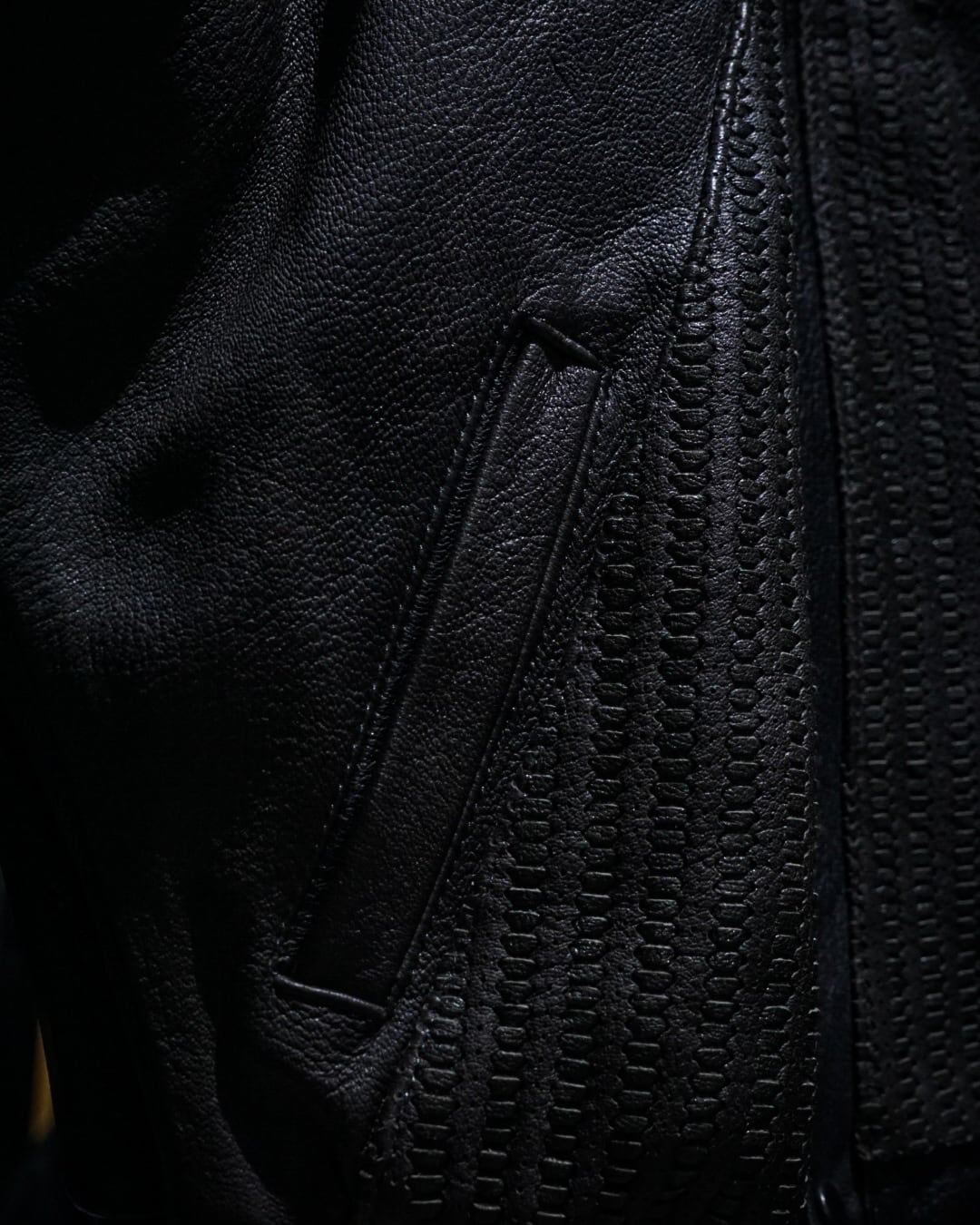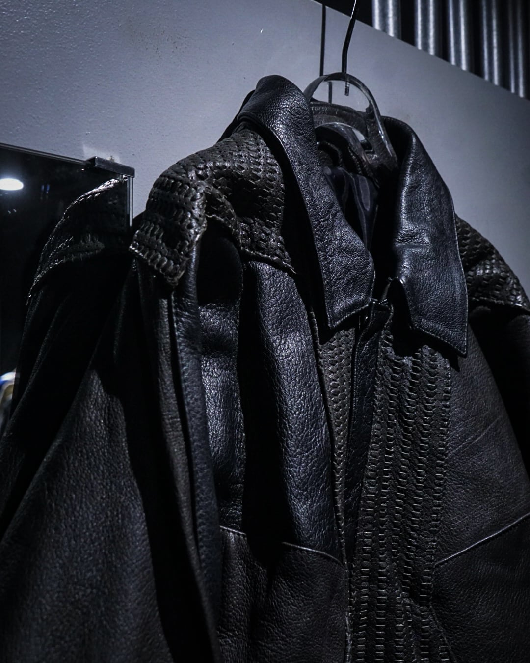 フロントは比翼仕様でミニマルに仕上げつつ、中央から背面にかけて大胆に配置された編み込みレザーが強い存在感を演出。単色に留まらない奥行きのある表情で、光の当たり方によって質感の違いが際立つ一着です。