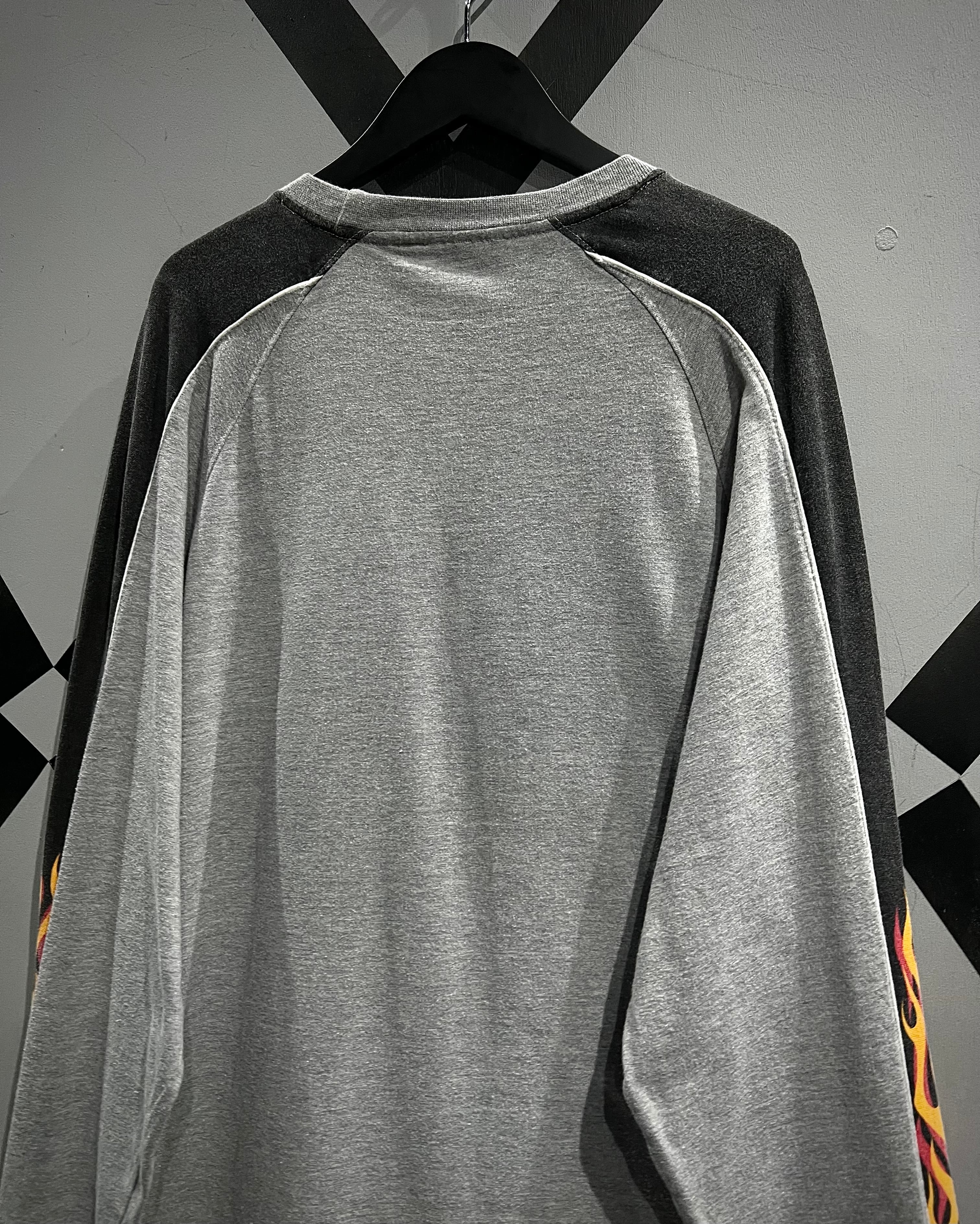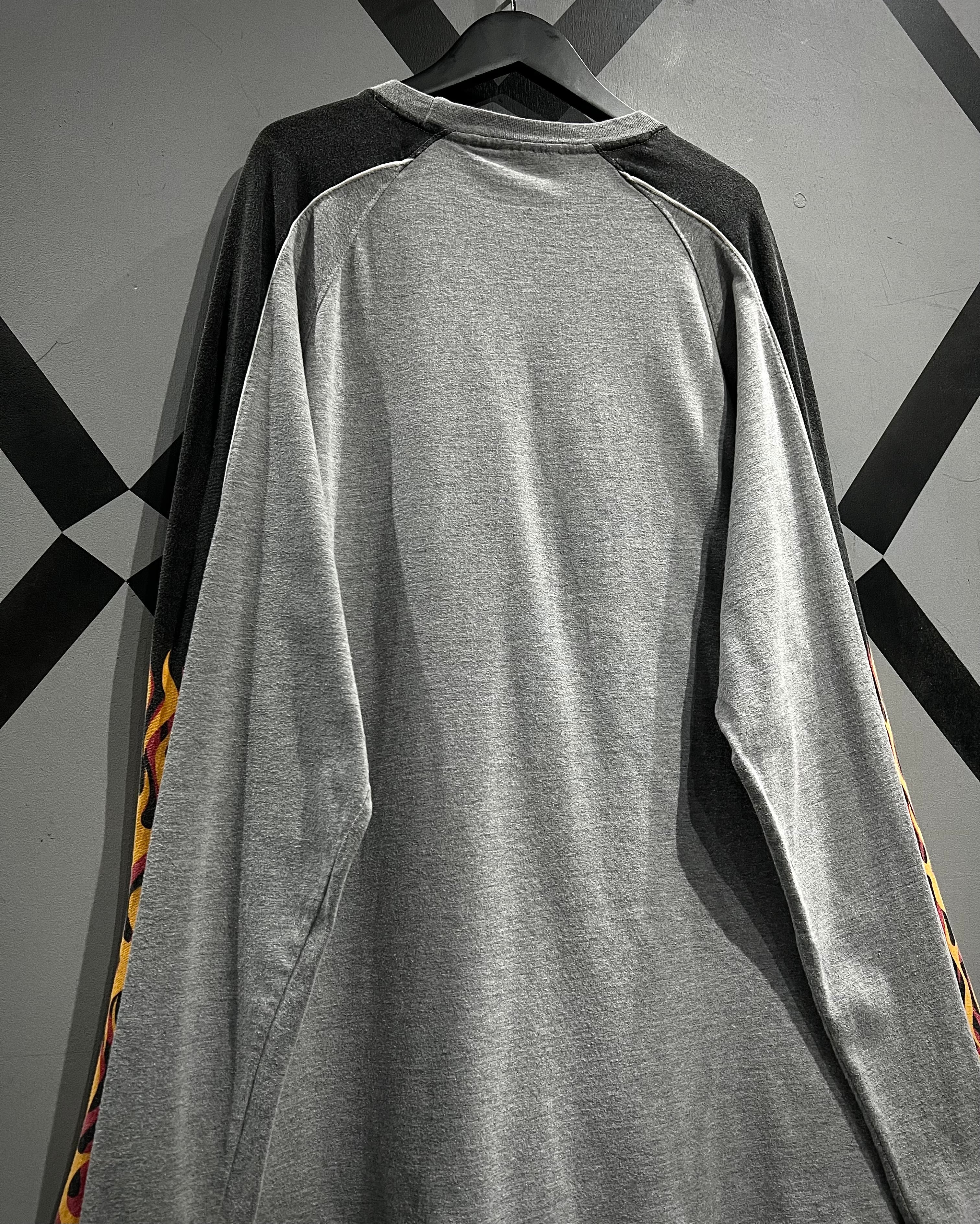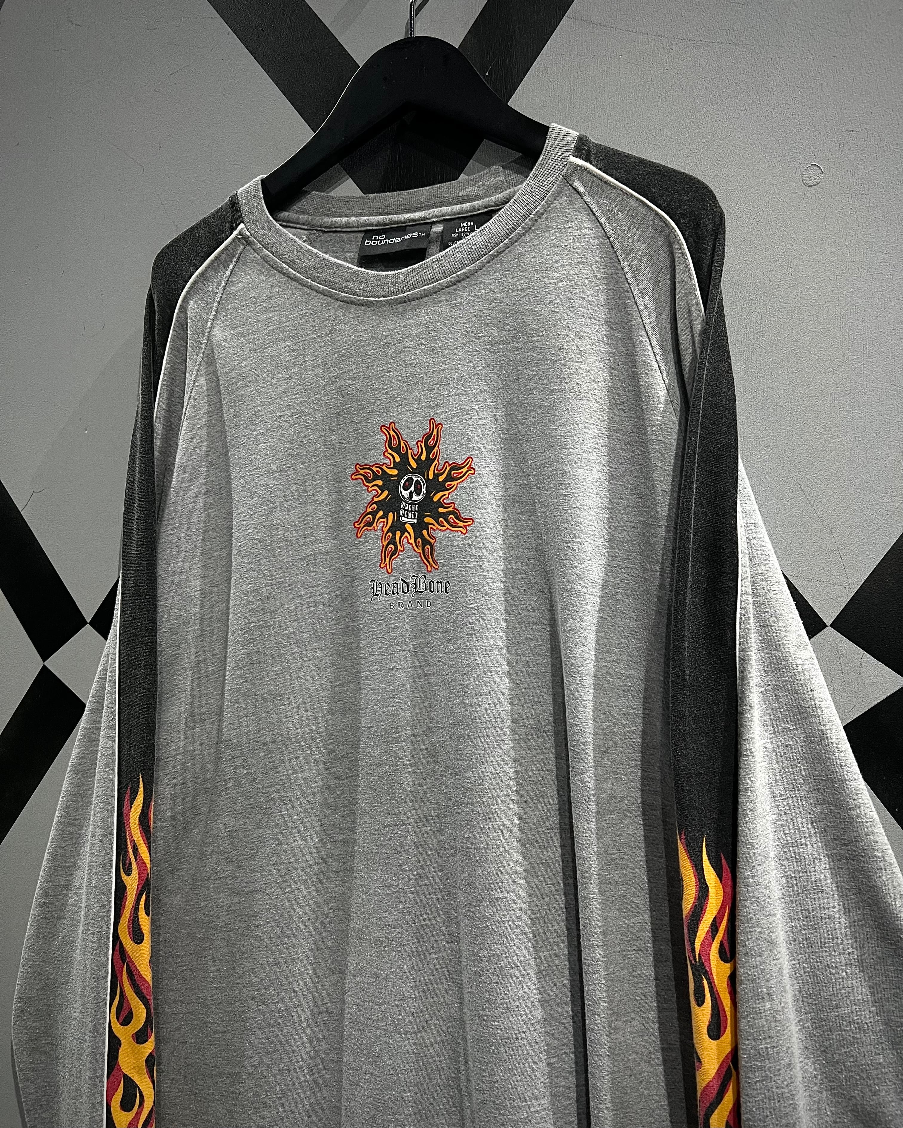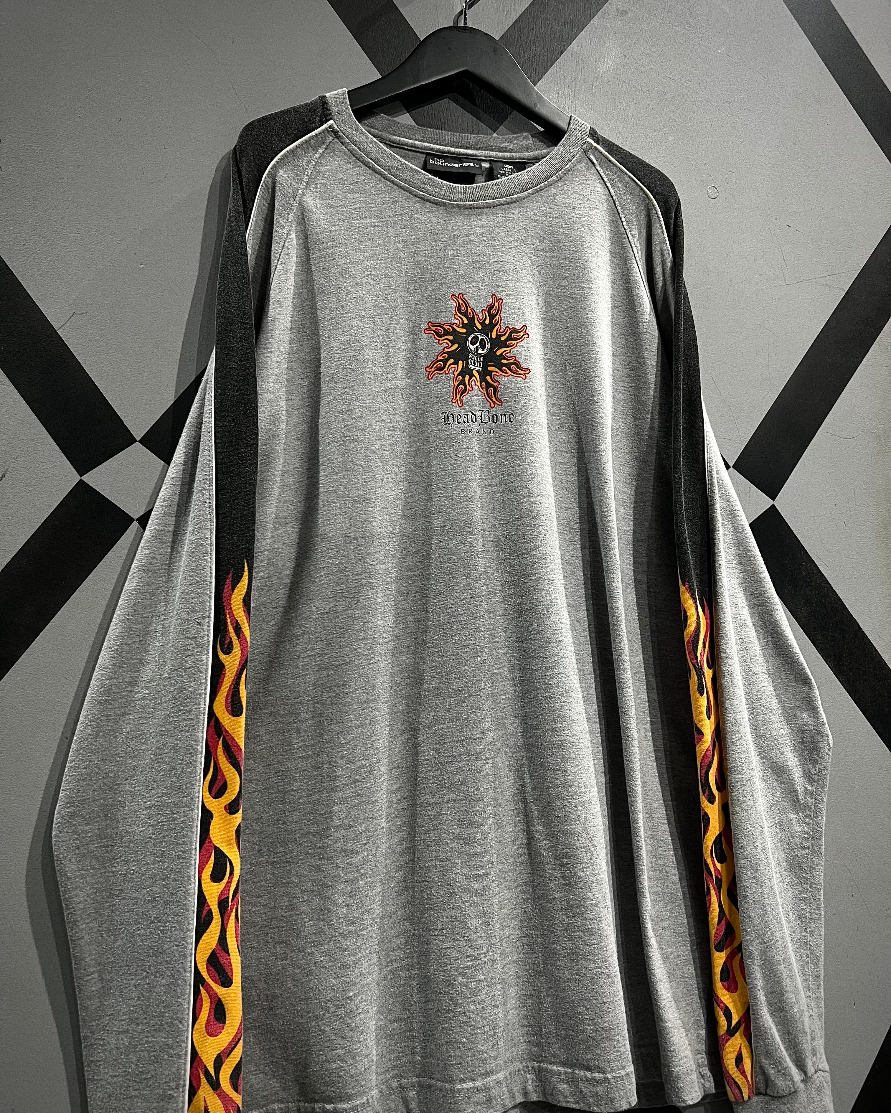 スカル&フレイムパターンのプリントを載せた、当時のストリートのムード漂う90's〜00's"No Boundaries"のロングスリーブTシャツ。