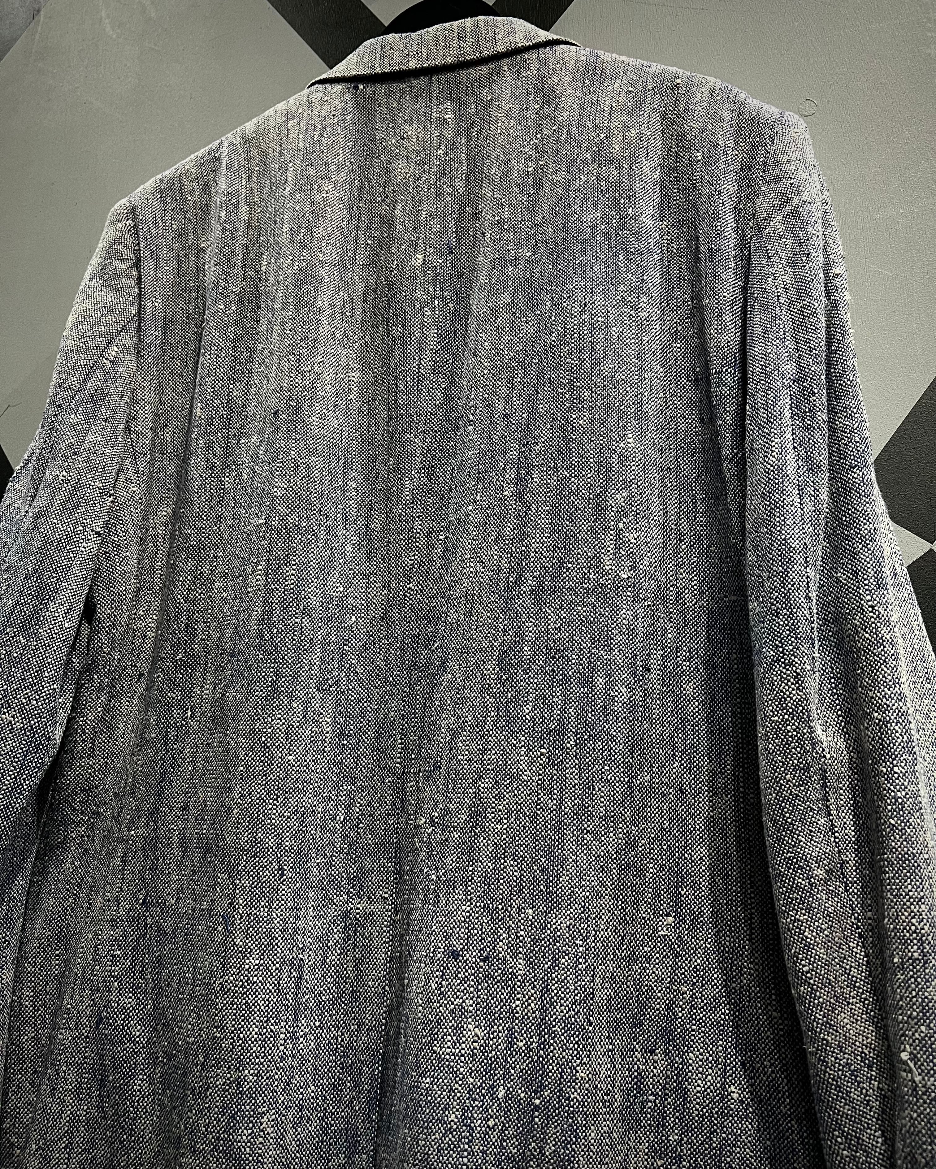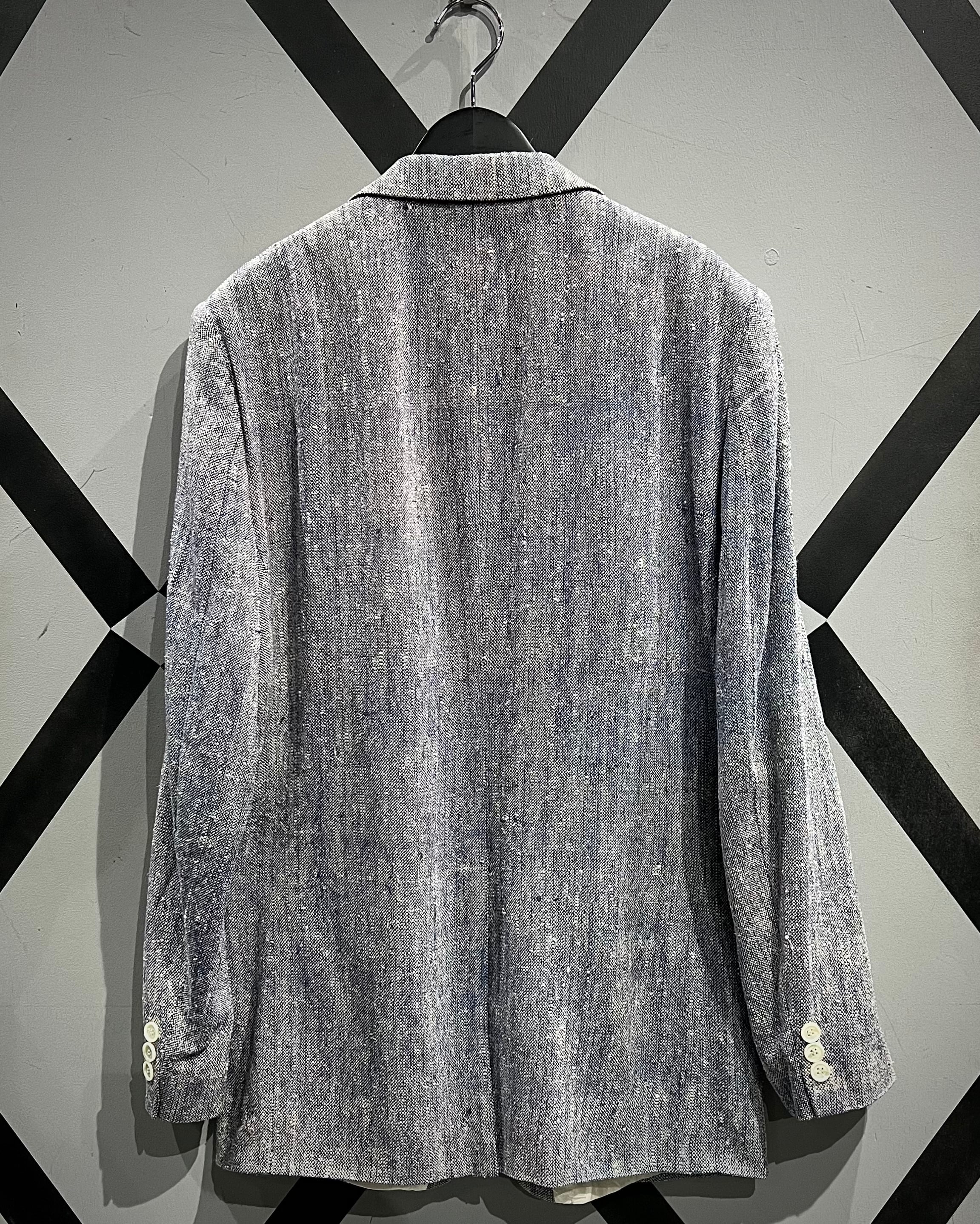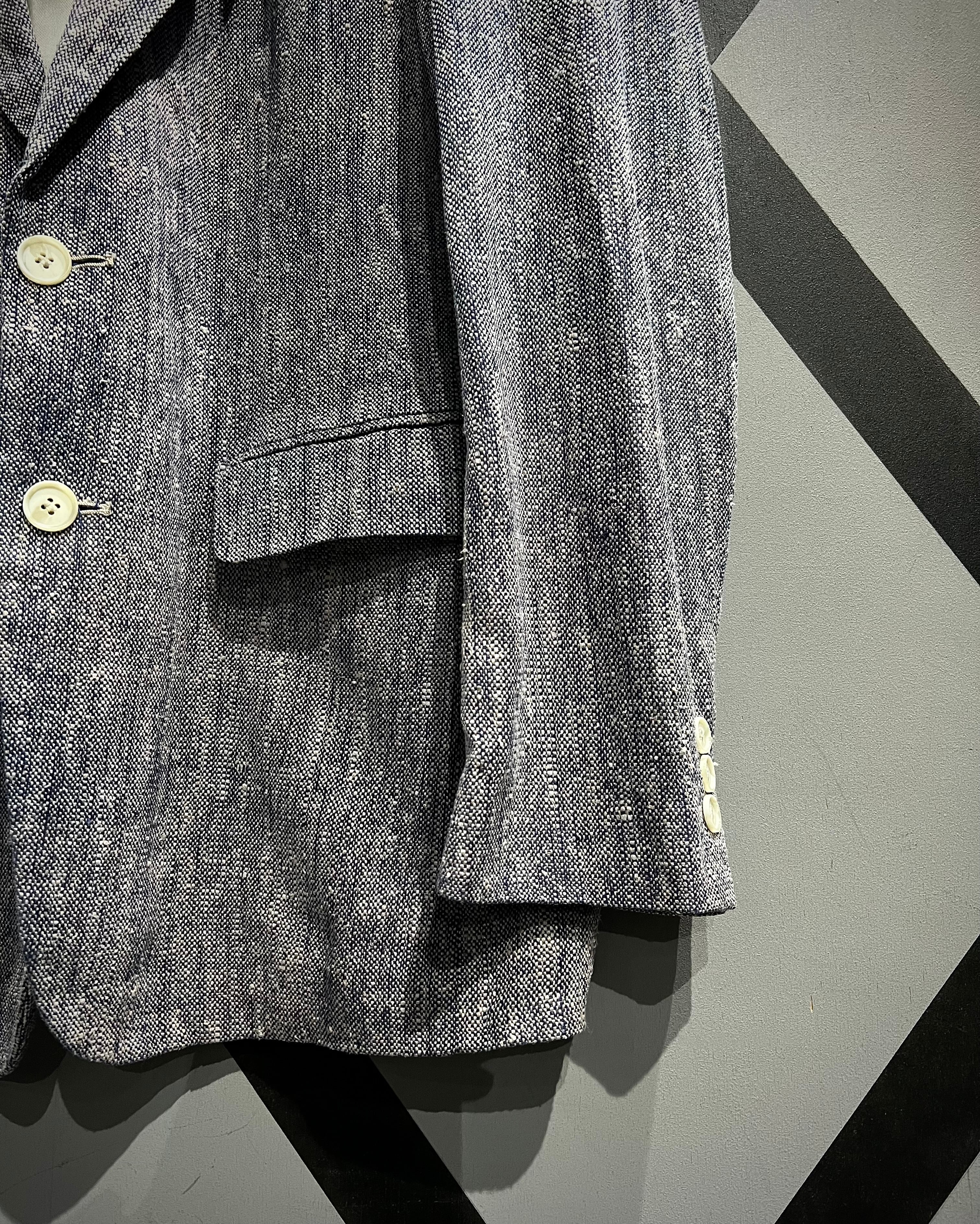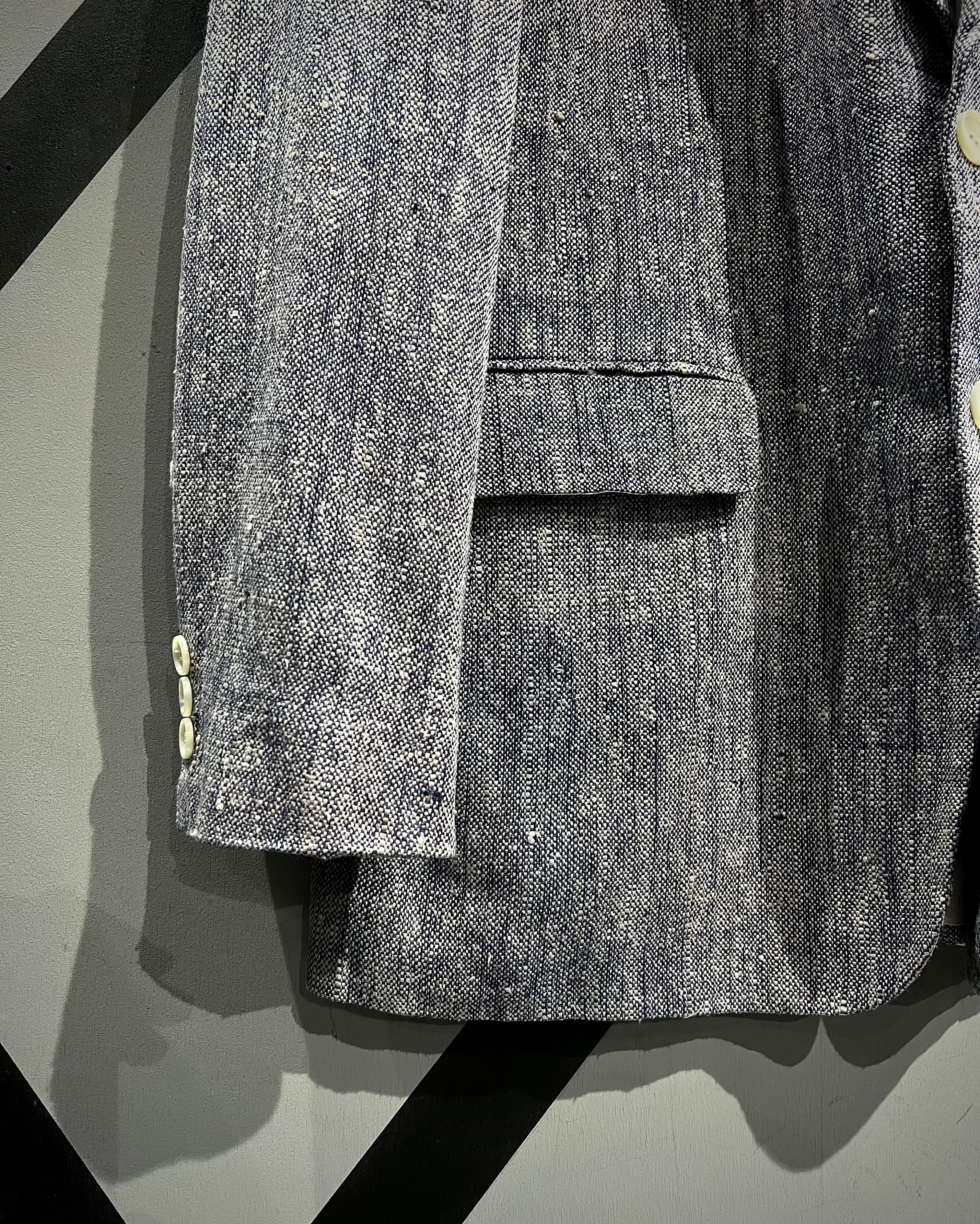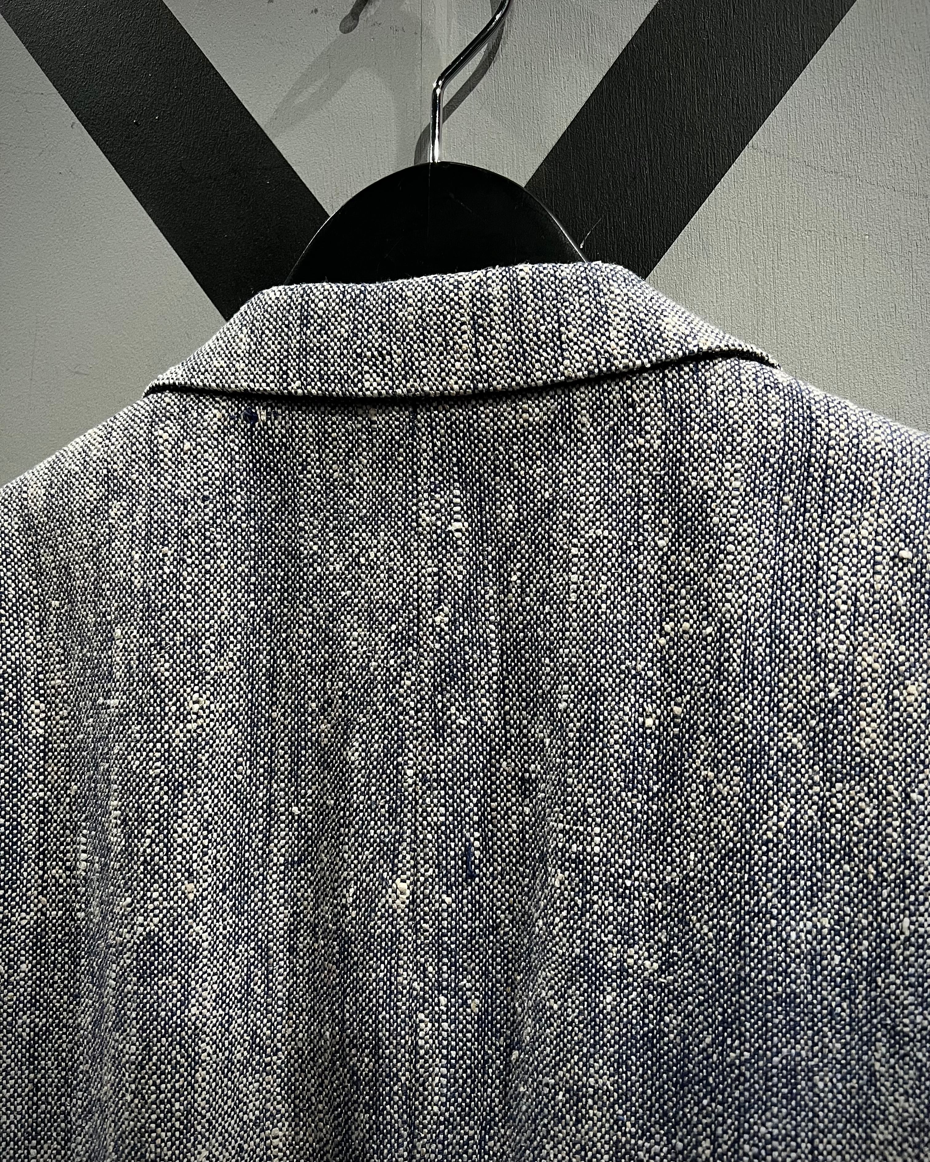 奥行きのある表情と軽やかな風合いを併せ持つ、青×白で織り上げられた生地をボディに使用。粗野さと上品さを併せ持つ独特のテクスチャーが、シンプルながらも存在感を放つ一着。