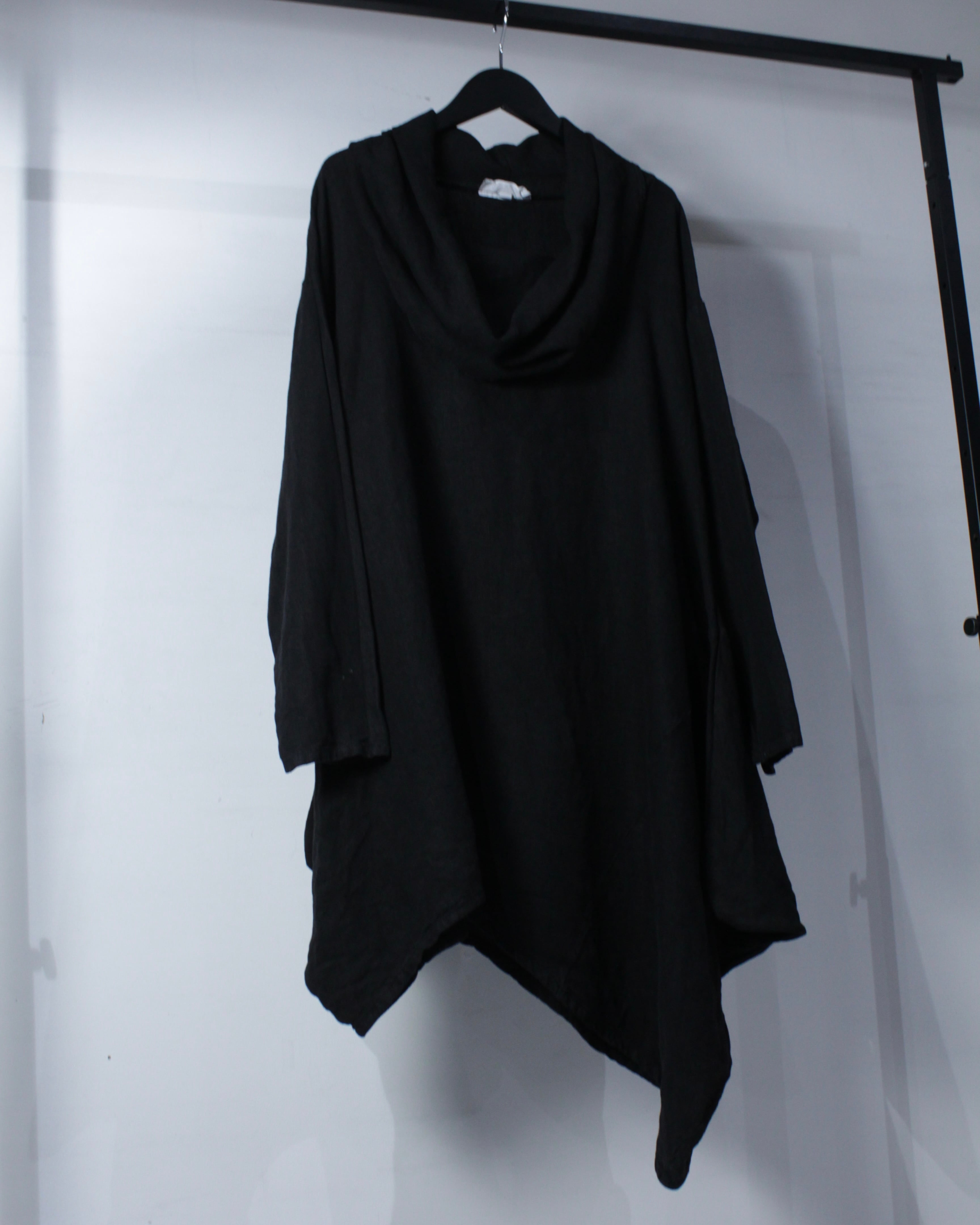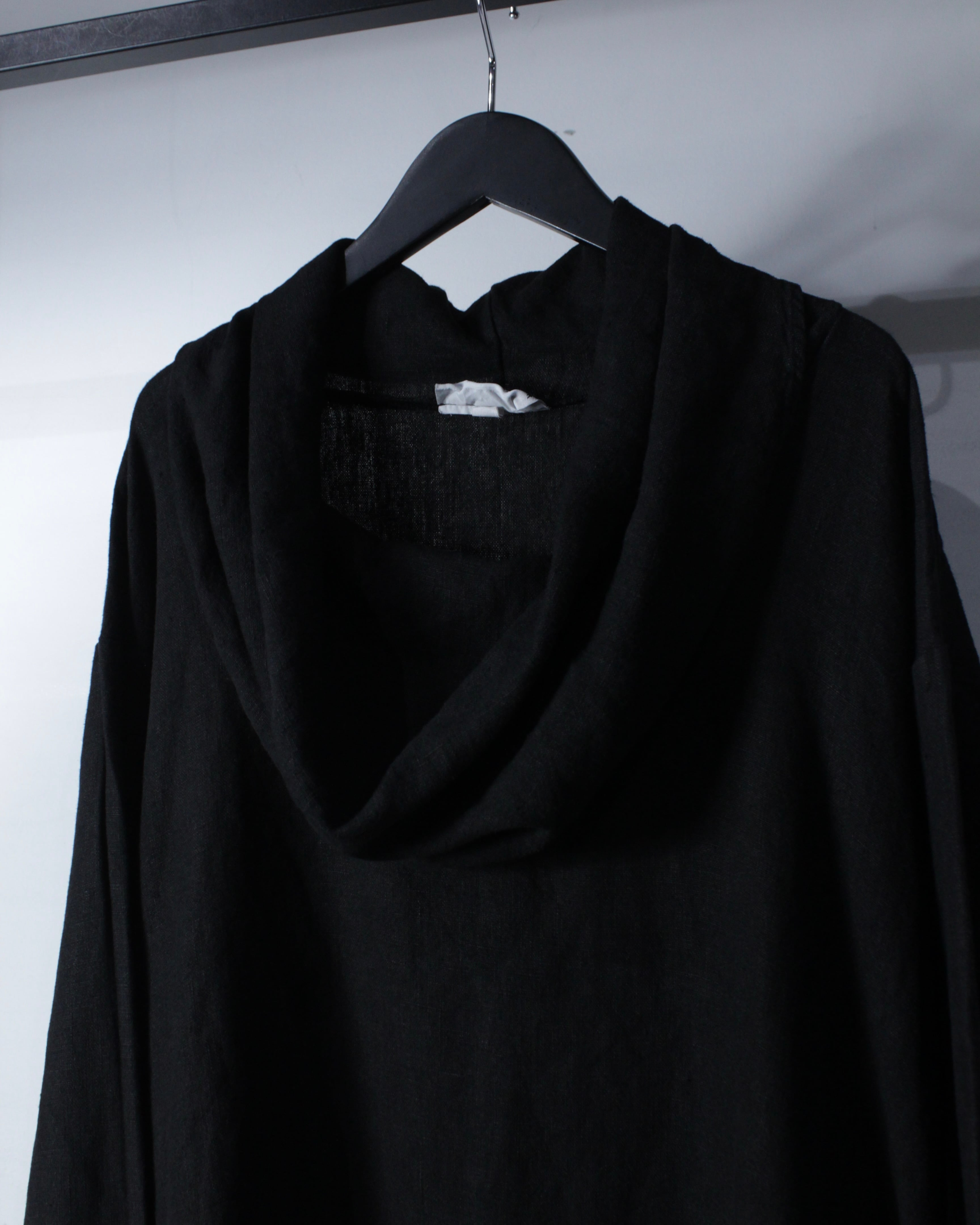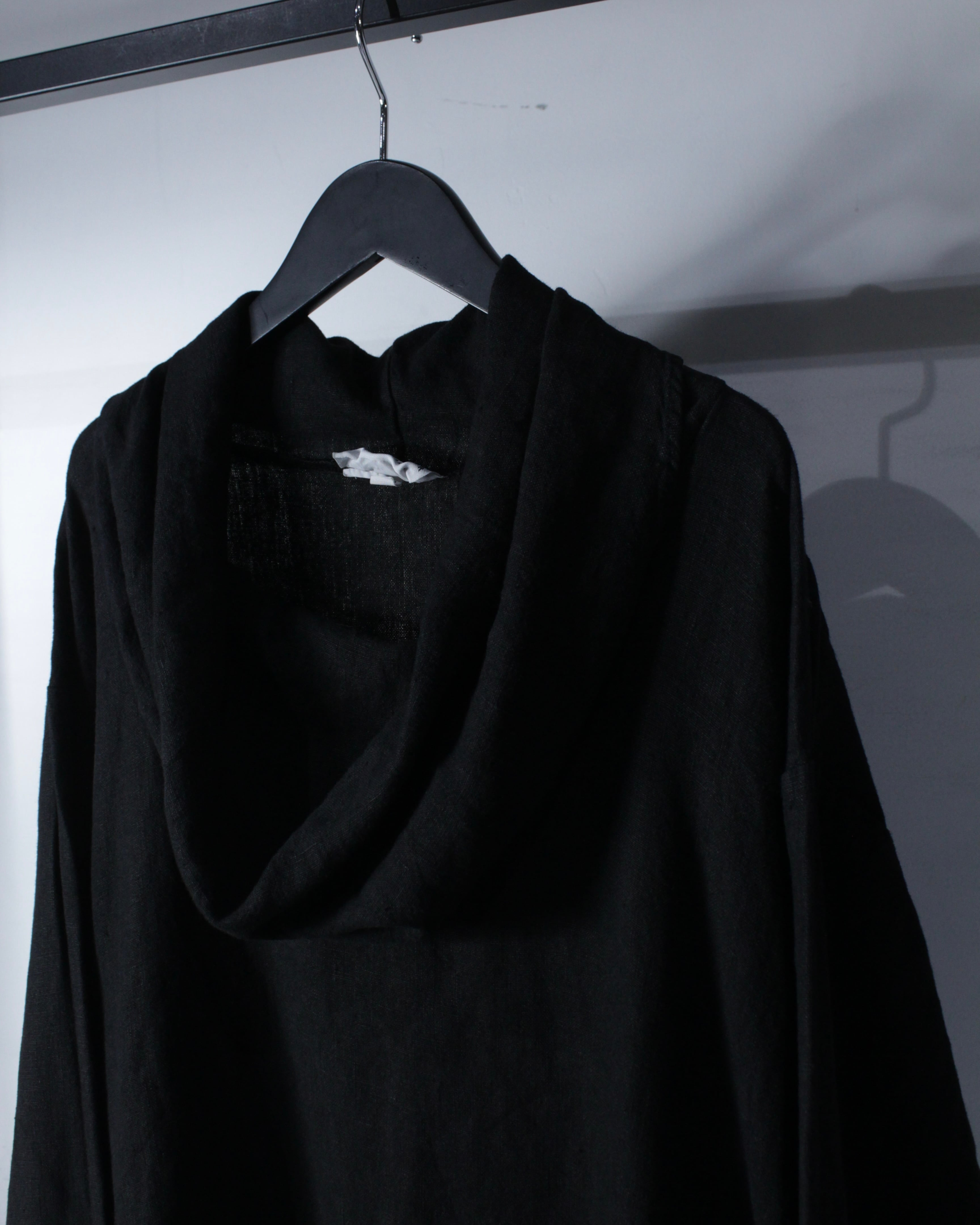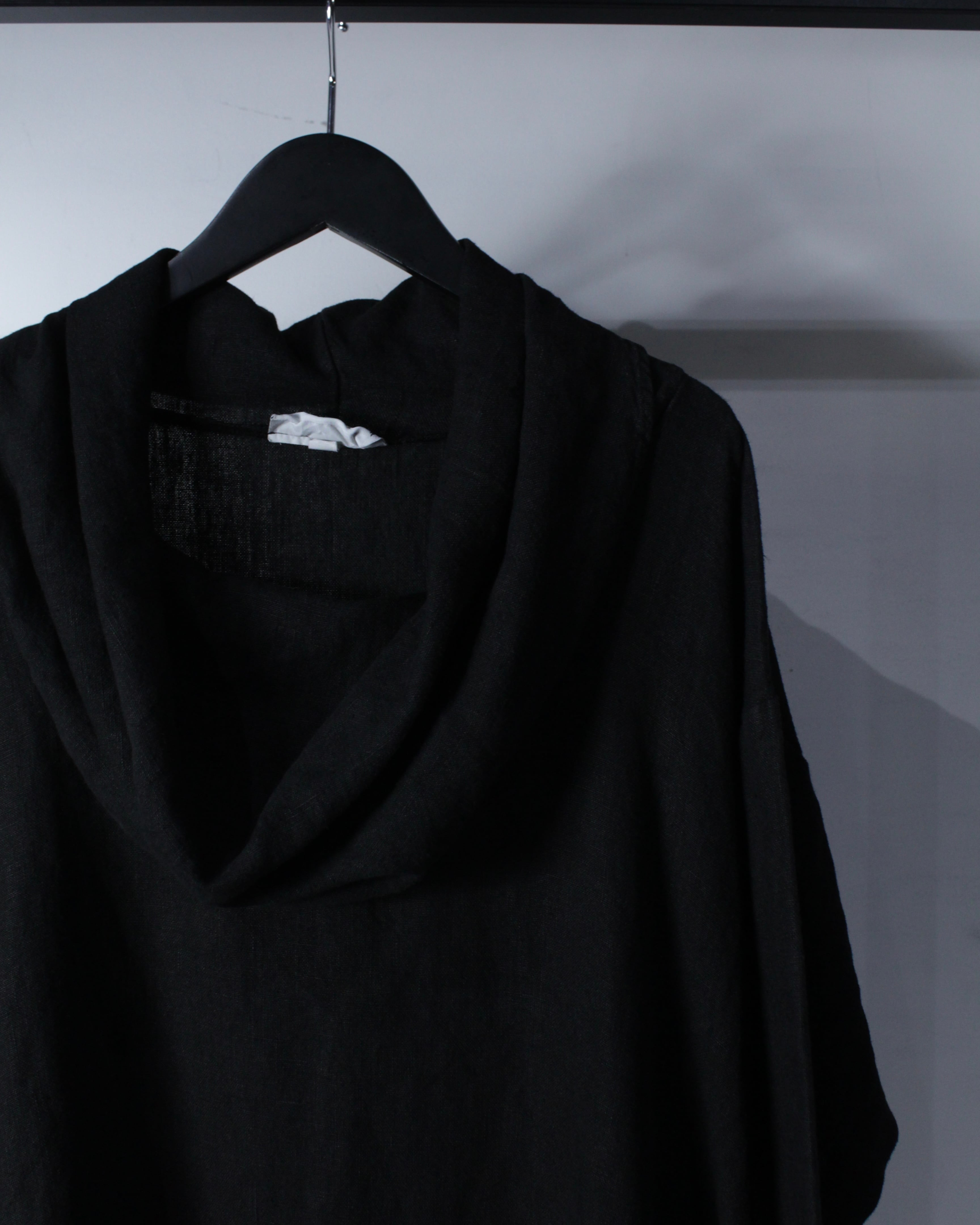 首元は大きくゆとりを持たせたカウルネック仕様。生地が自然に溜まることで立体的なドレープが生まれ、シンプルながらも印象的なディテールに仕上がっています。