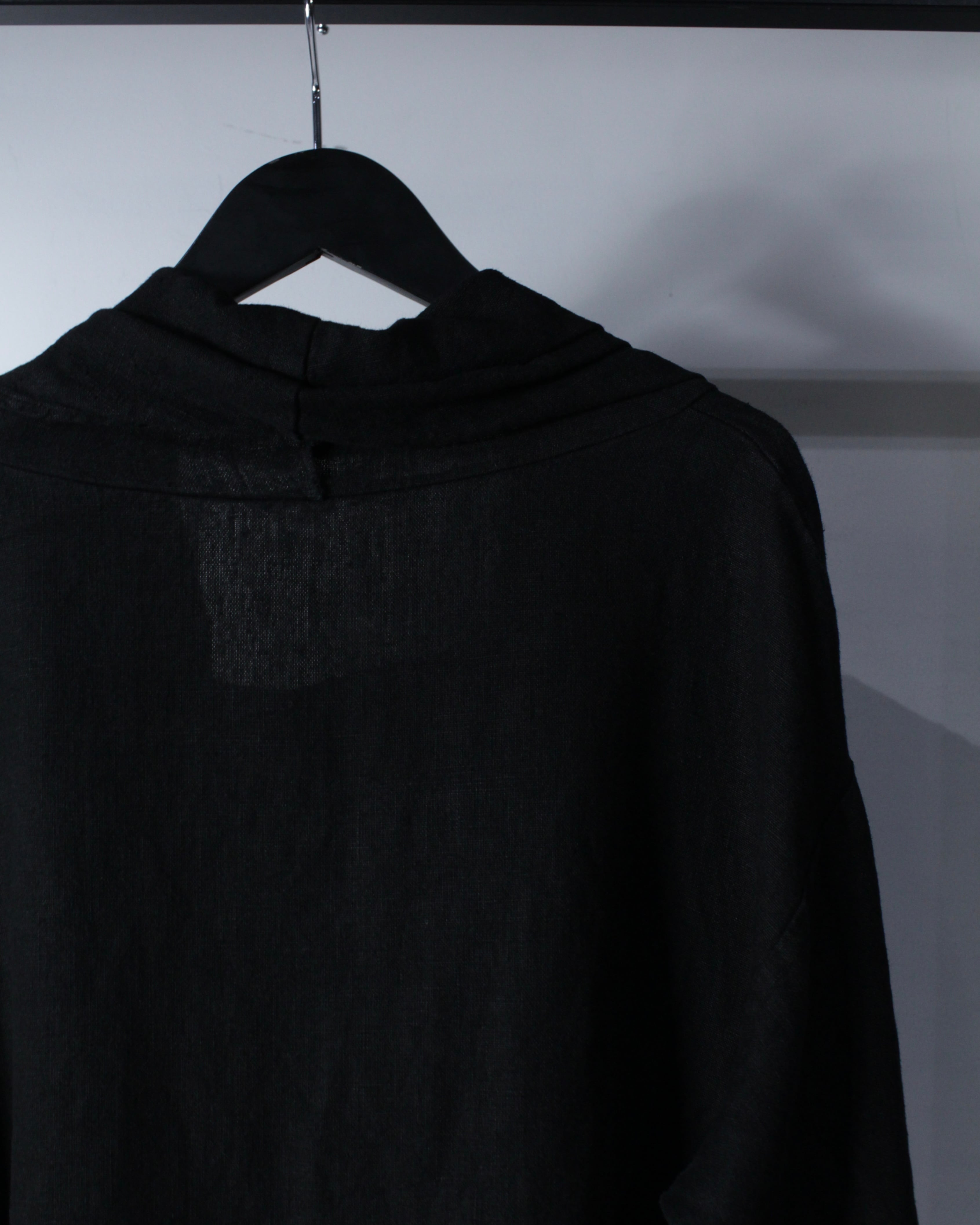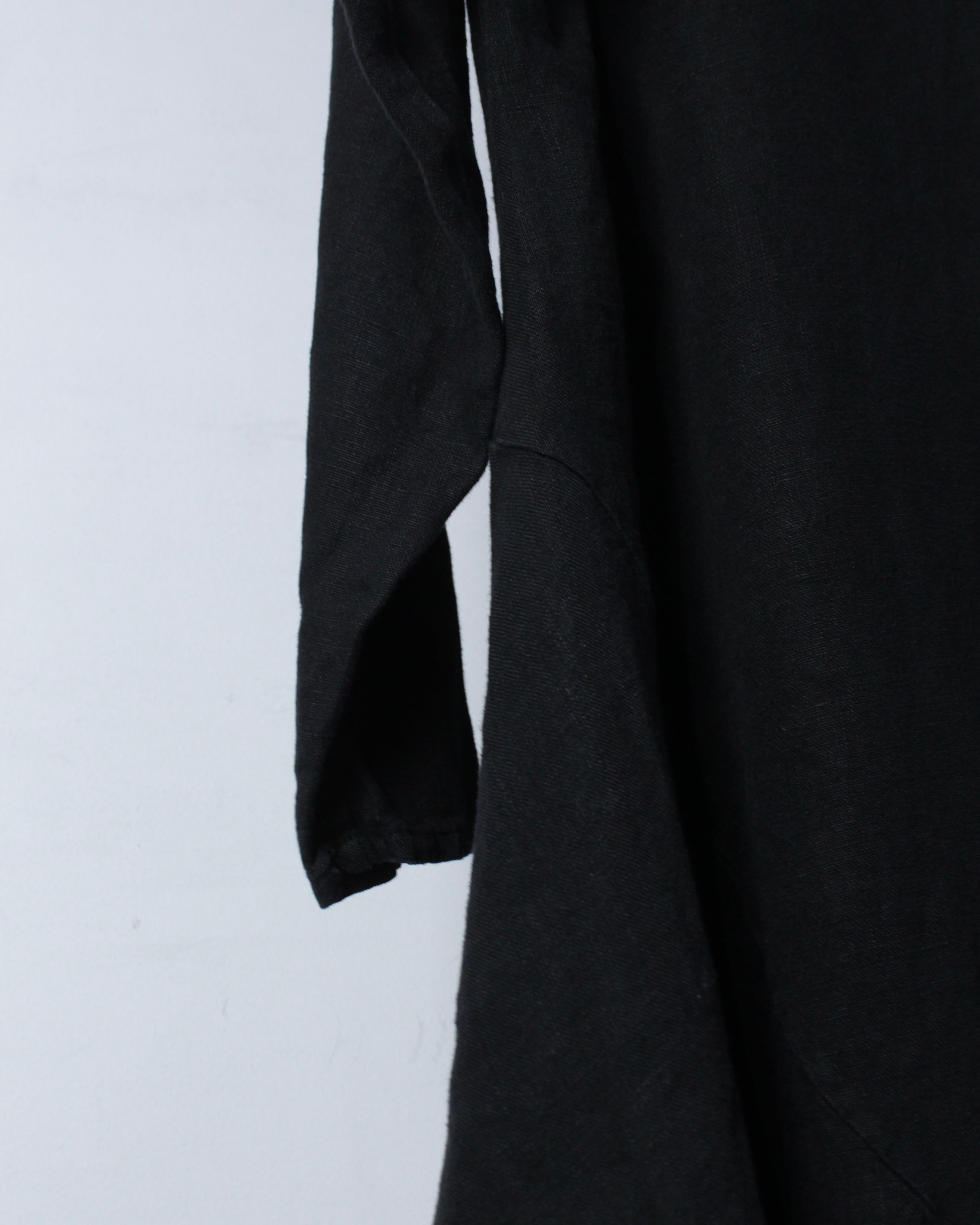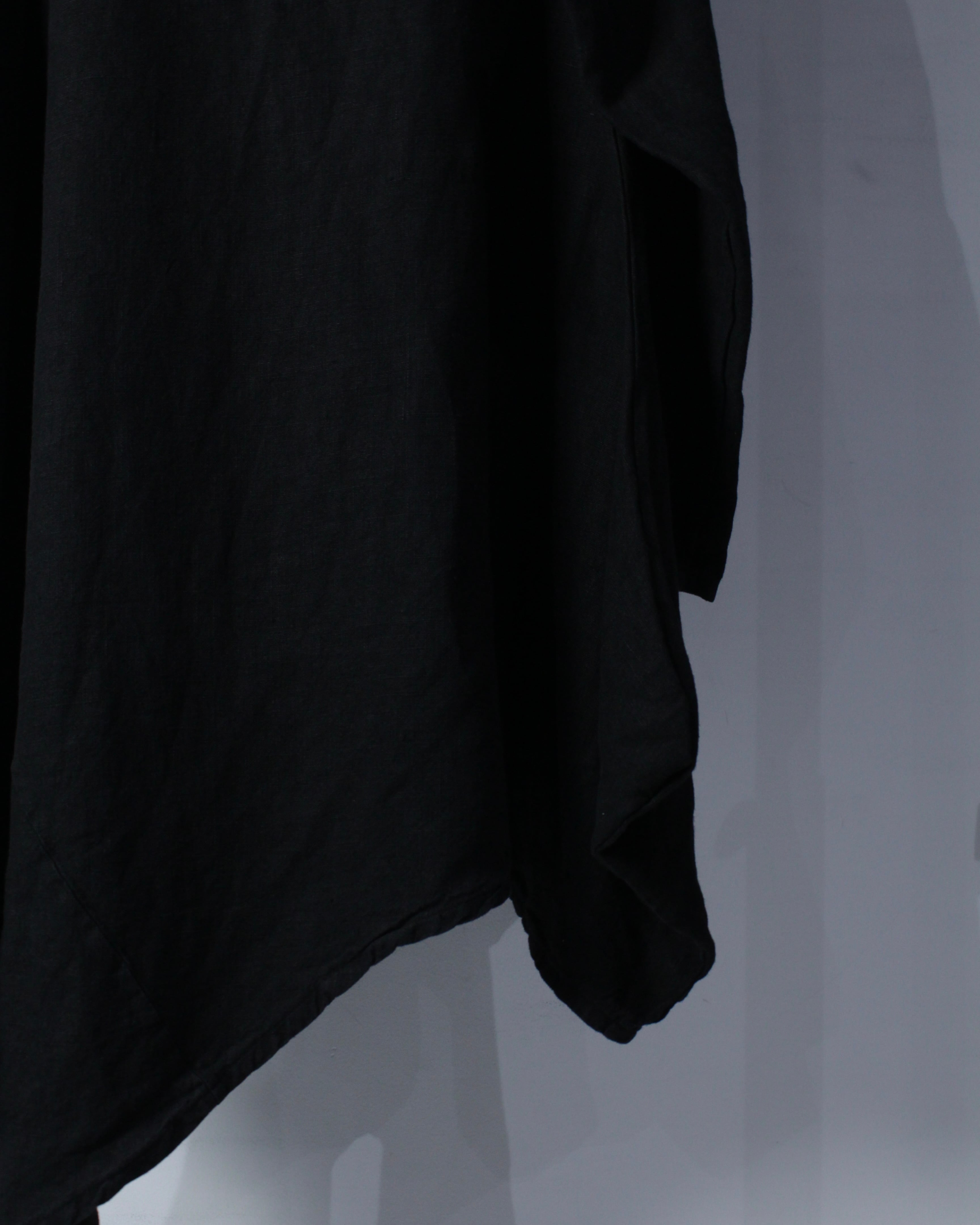 ミニマルなブラックボディをベースに、シルエットとパターンで魅せる一着。リネン100%ならではのドライな質感と自然な風合いが、軽やかで奥行きのある表情を生み出します。