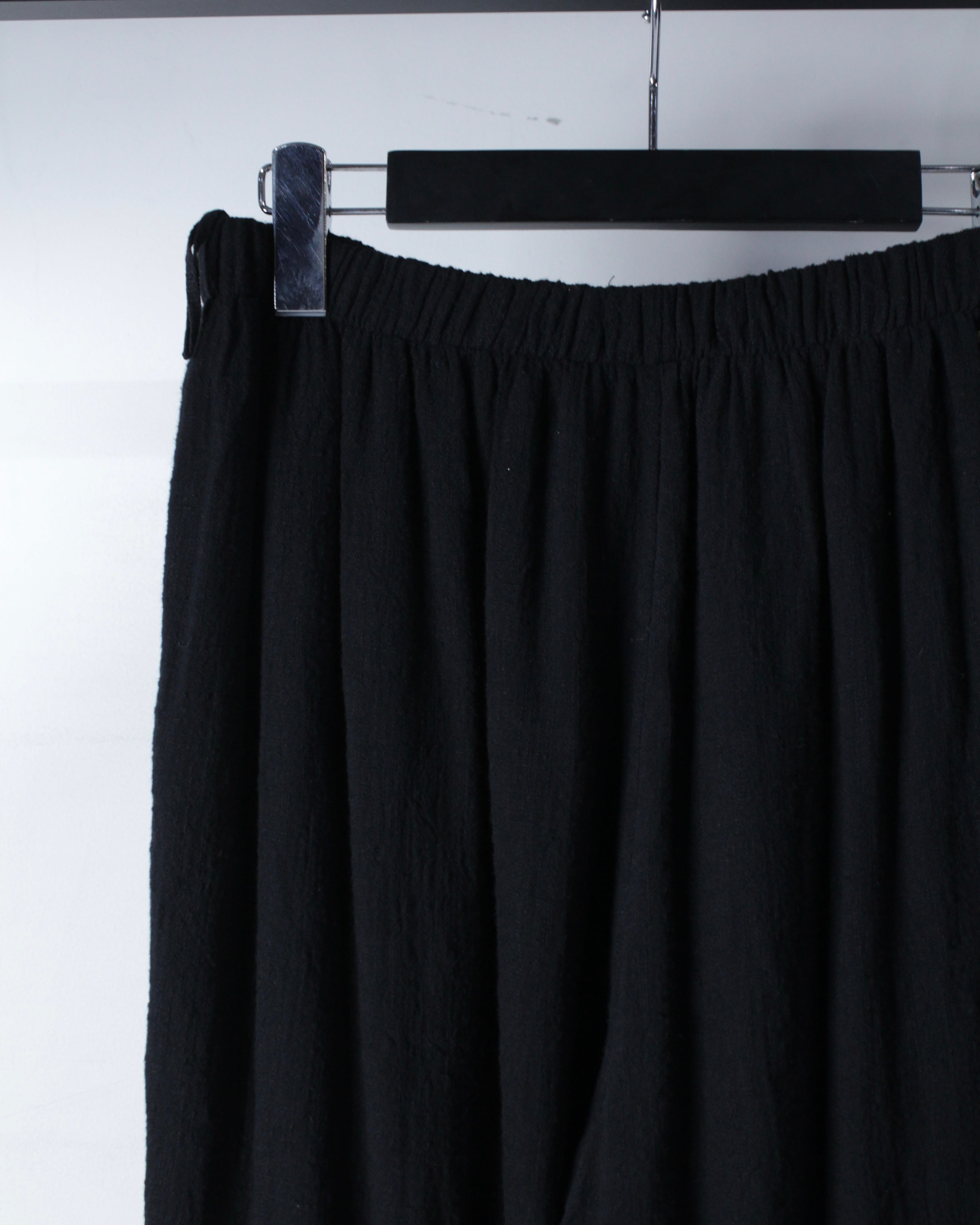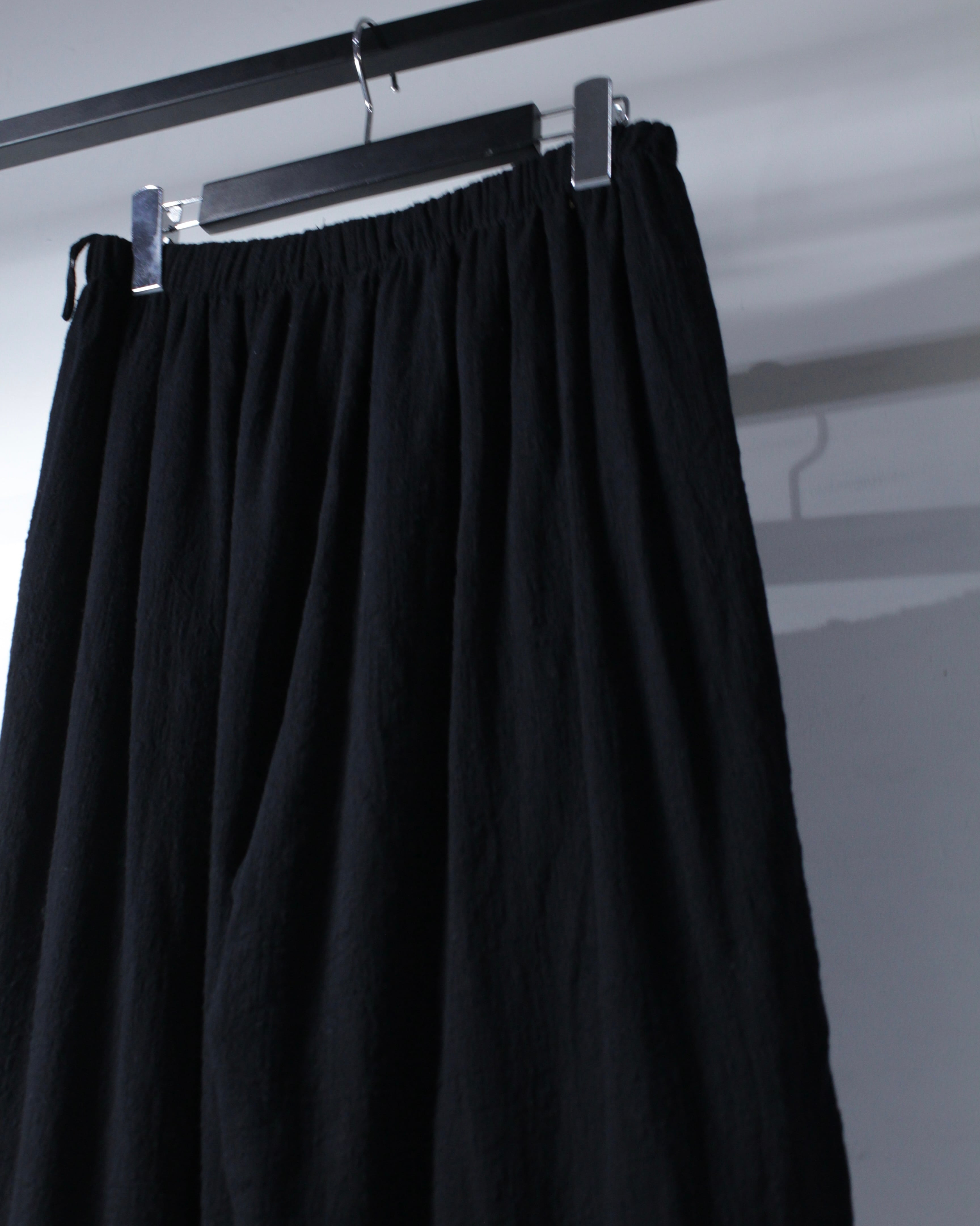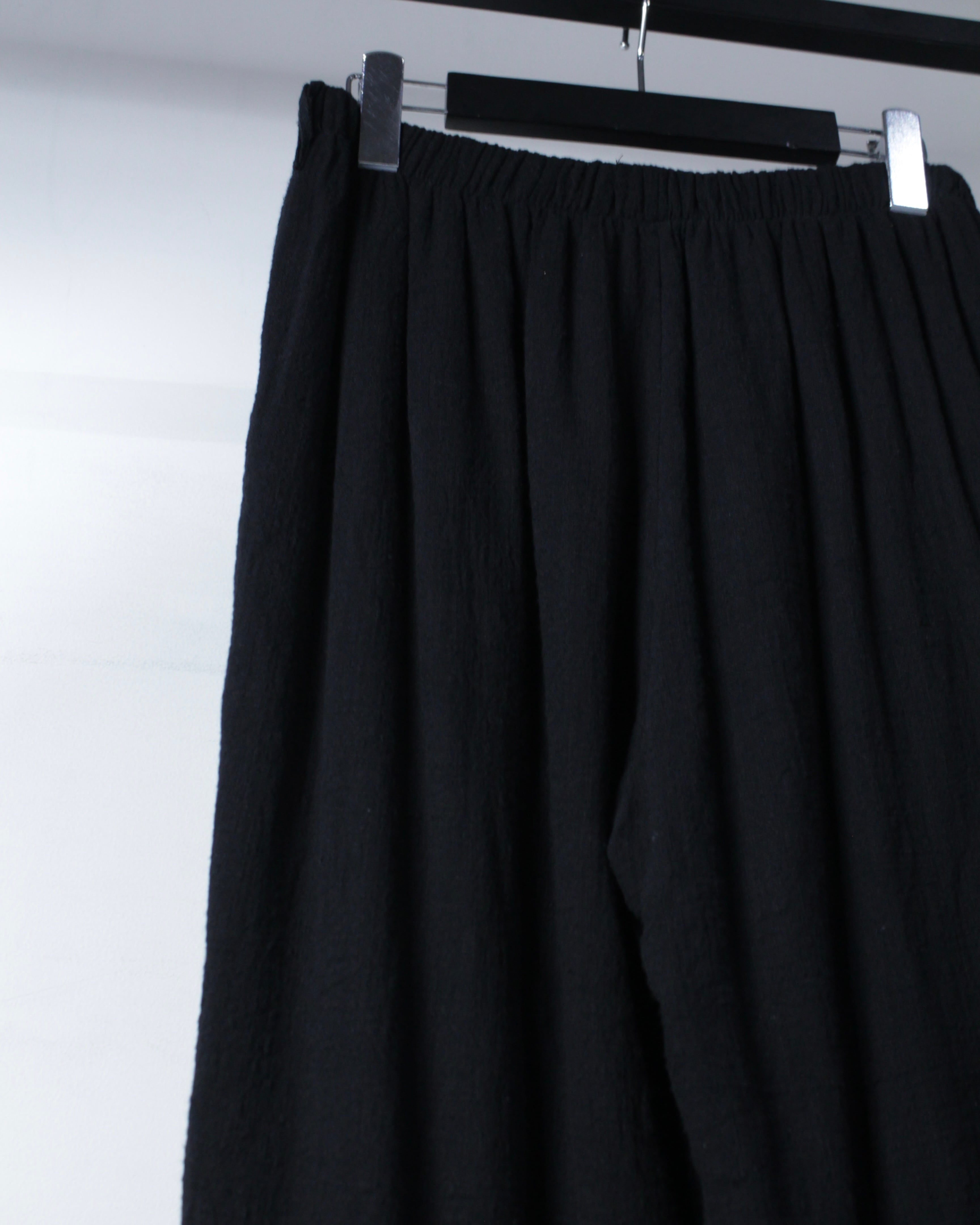 ウエストはゴム仕様で、柔らかく軽やかな質感も相まってストレスの無い快適な穿き心地を実現。裾までしっかりとボリュームを持たせたワイドシルエットによって生地の落ち感によって綺麗なドレープが生まれ、着用時には動きに合わせて立体的な表情を生み出します。