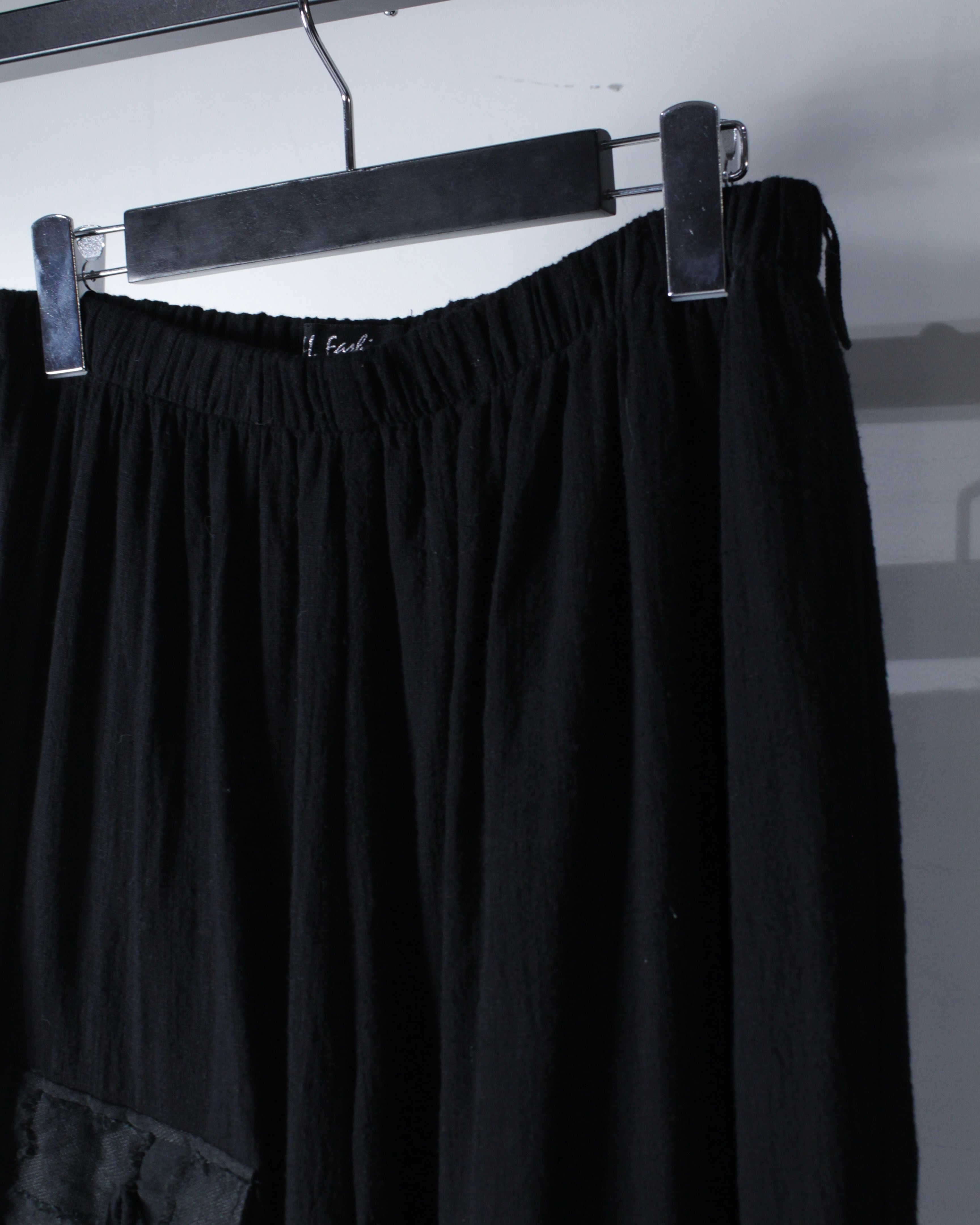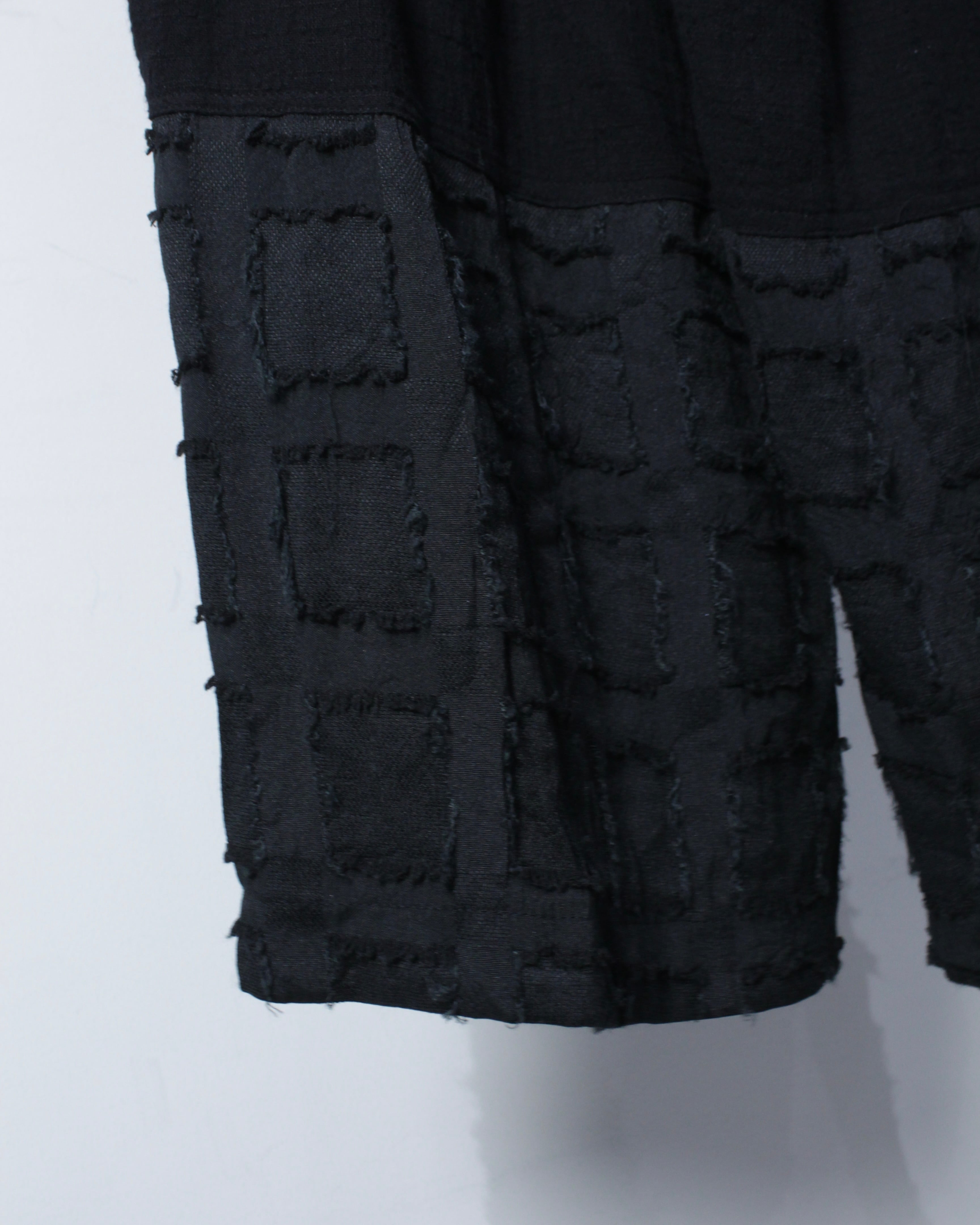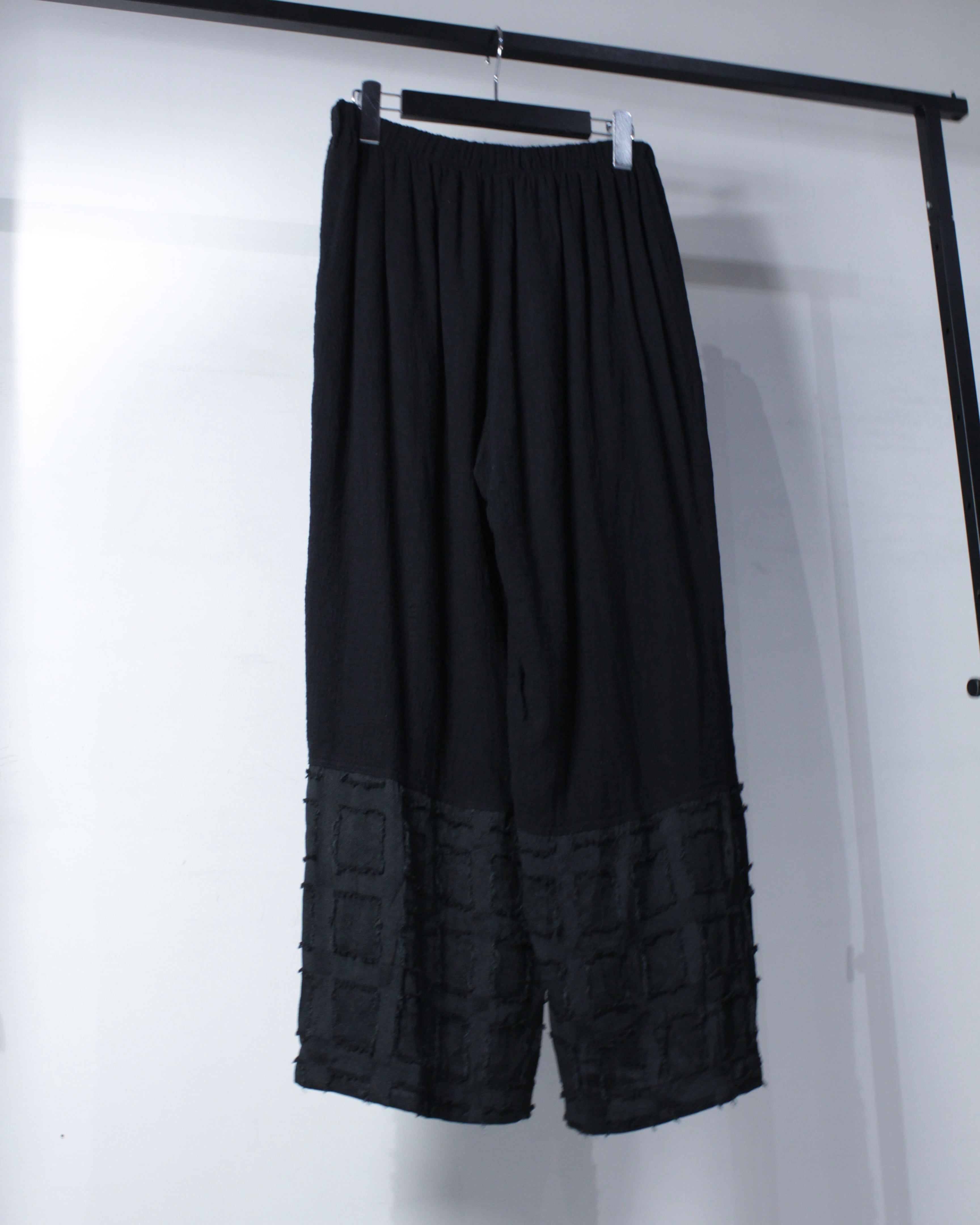 柔らかなコットンファブリックをボディのベースに、脛辺りから裾にかけて別生地で切り替え、スクエア状のフリンジデザインを施した1本。