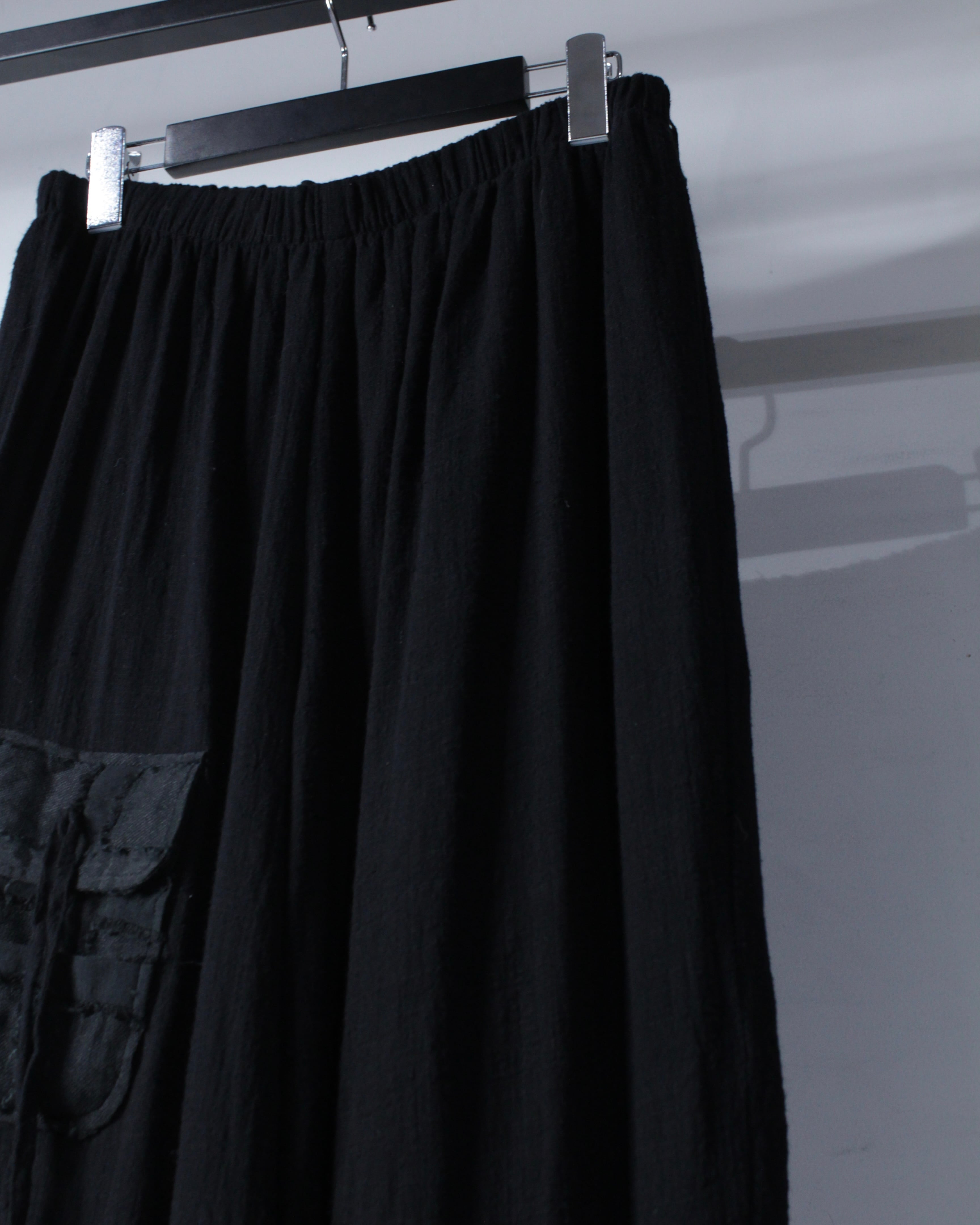 独特なテクスチャーとデザインが目を惹く、オールブラックのイージーパンツ。