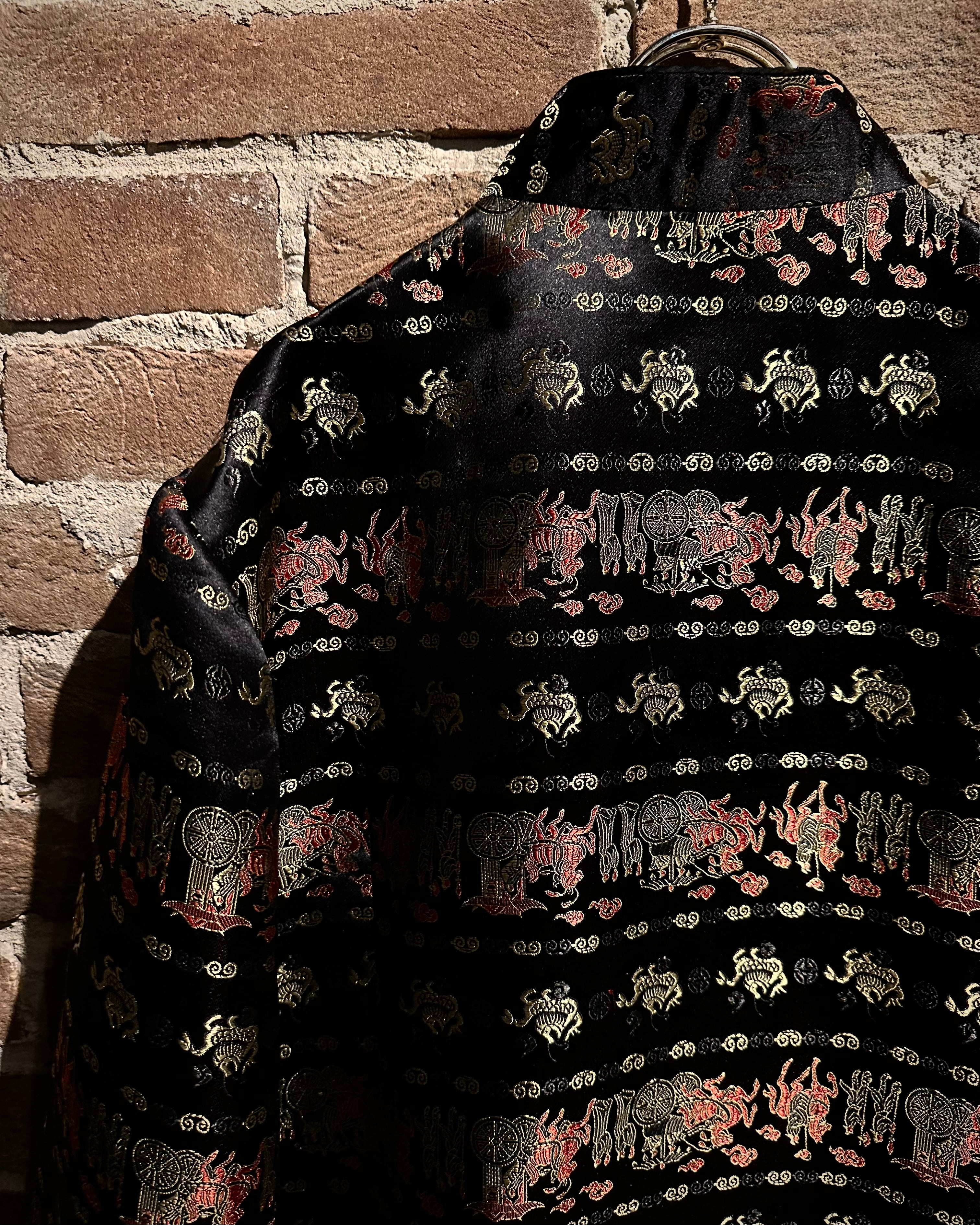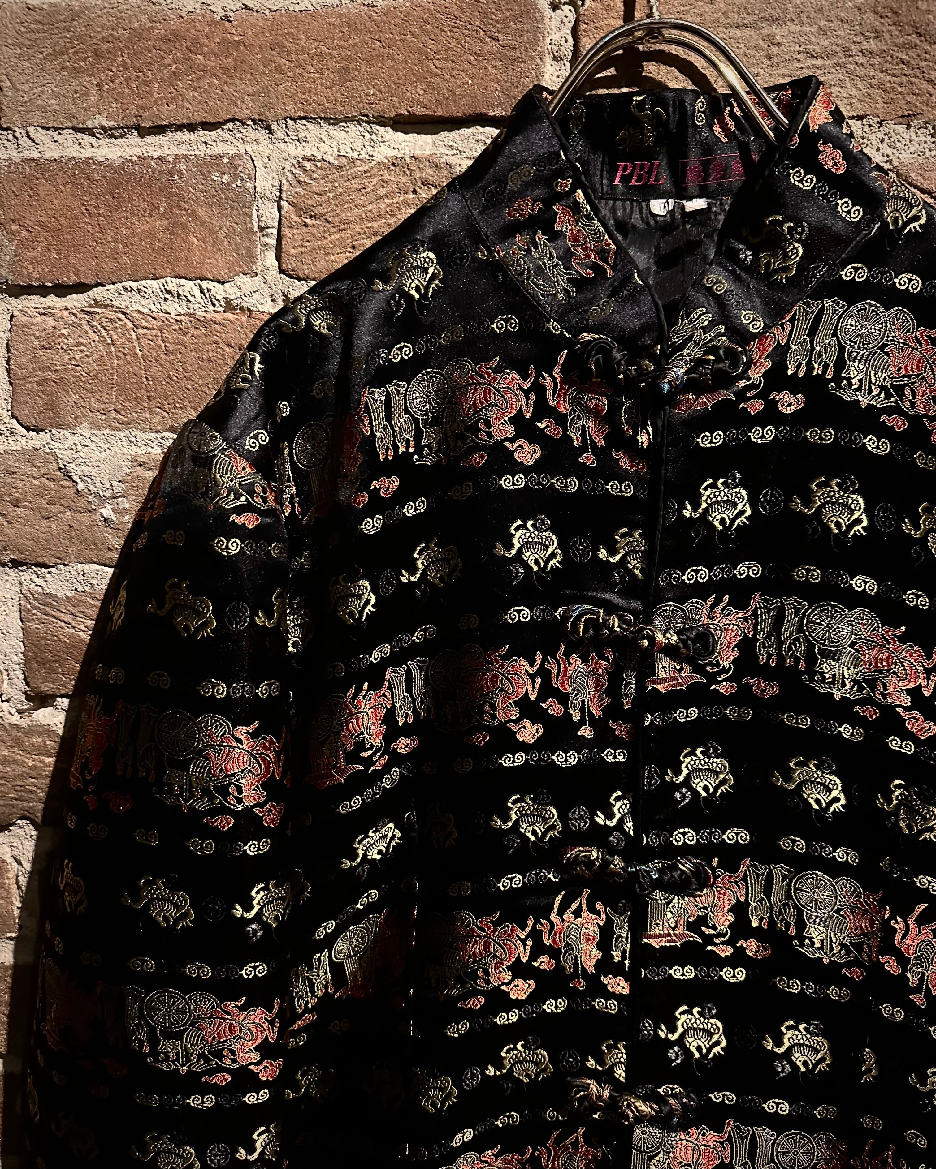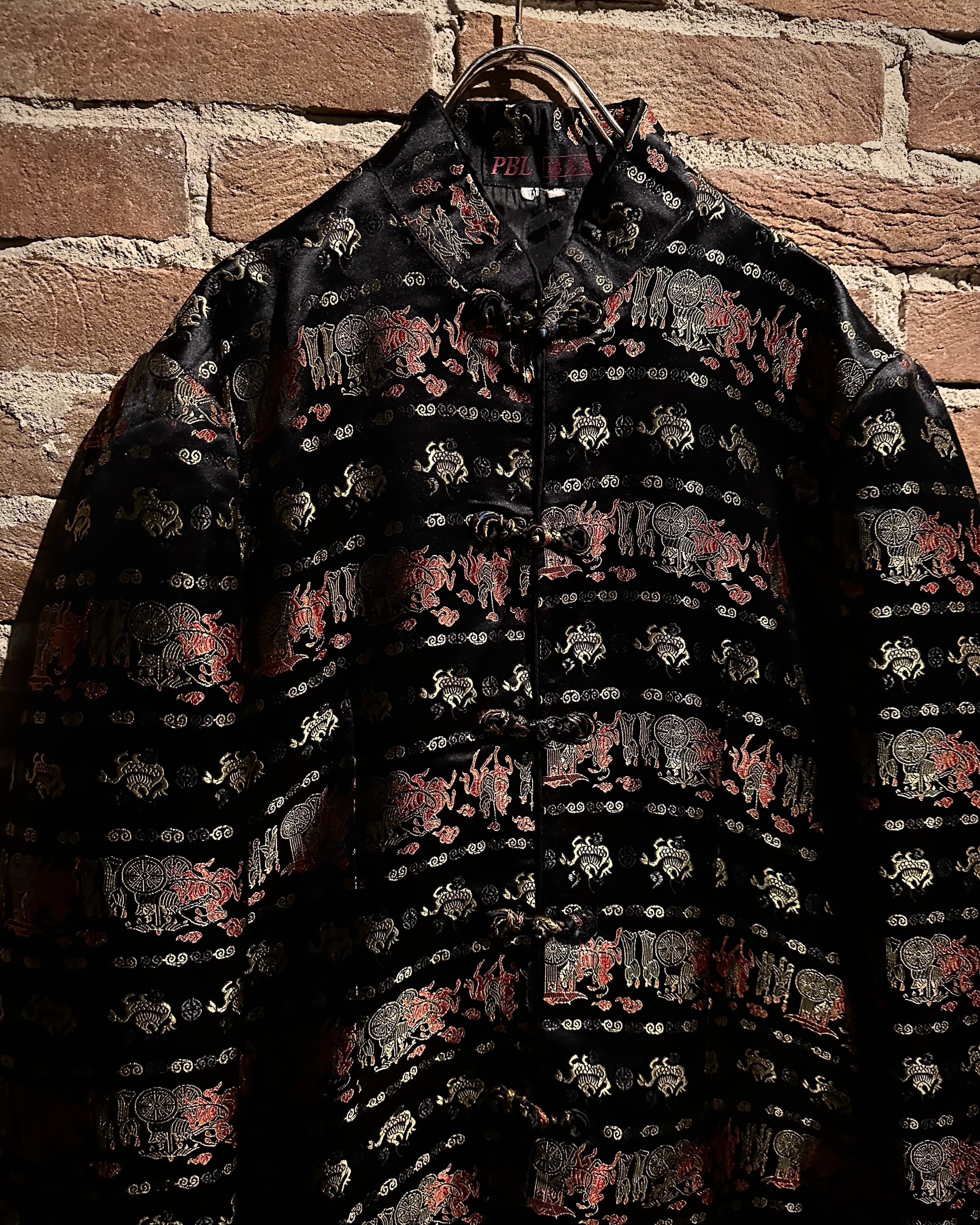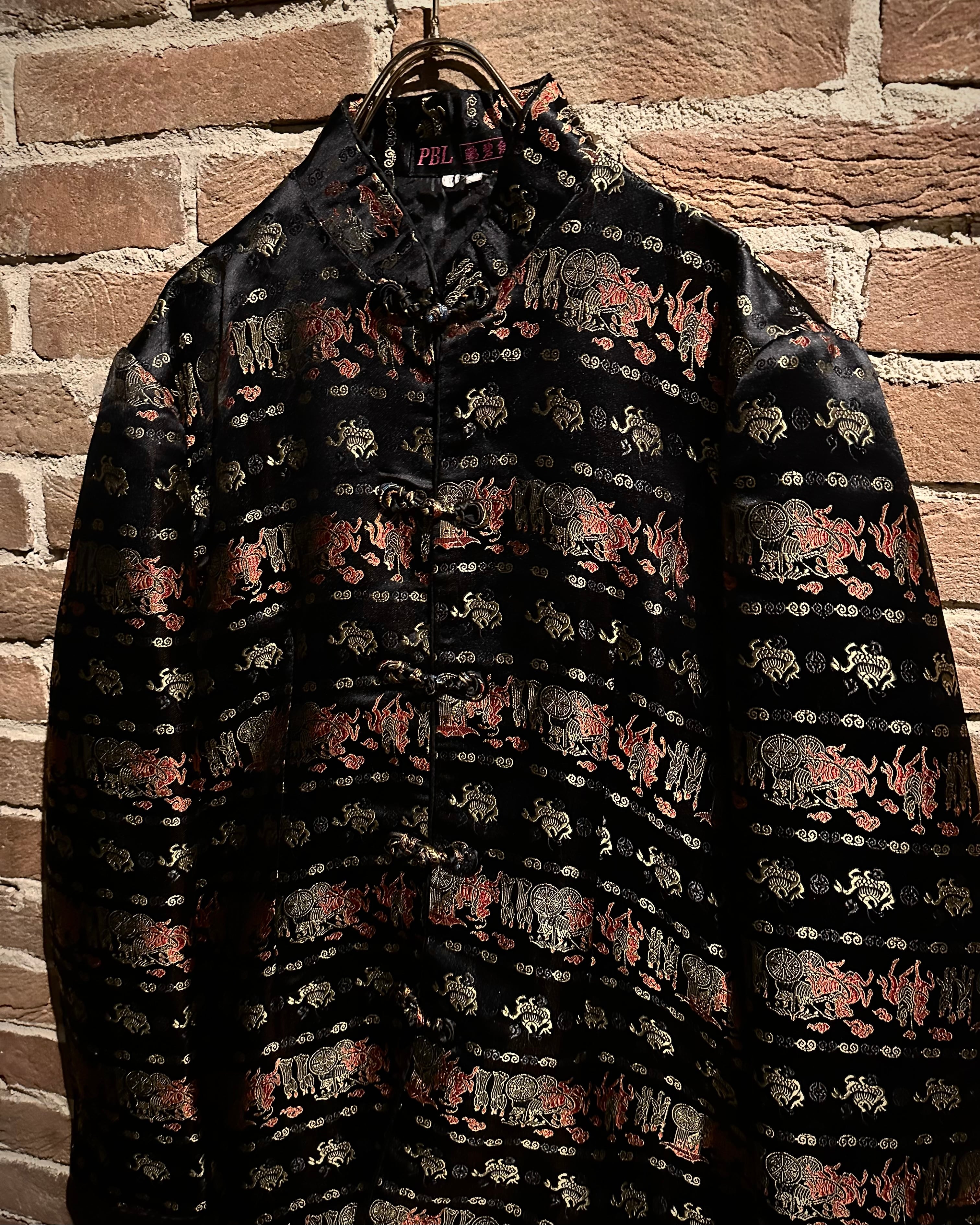 光沢を帯びた艶やかなボディに、織りで表現されたオリエンタルな総柄を全面に配したチャイナシャツジャケット。