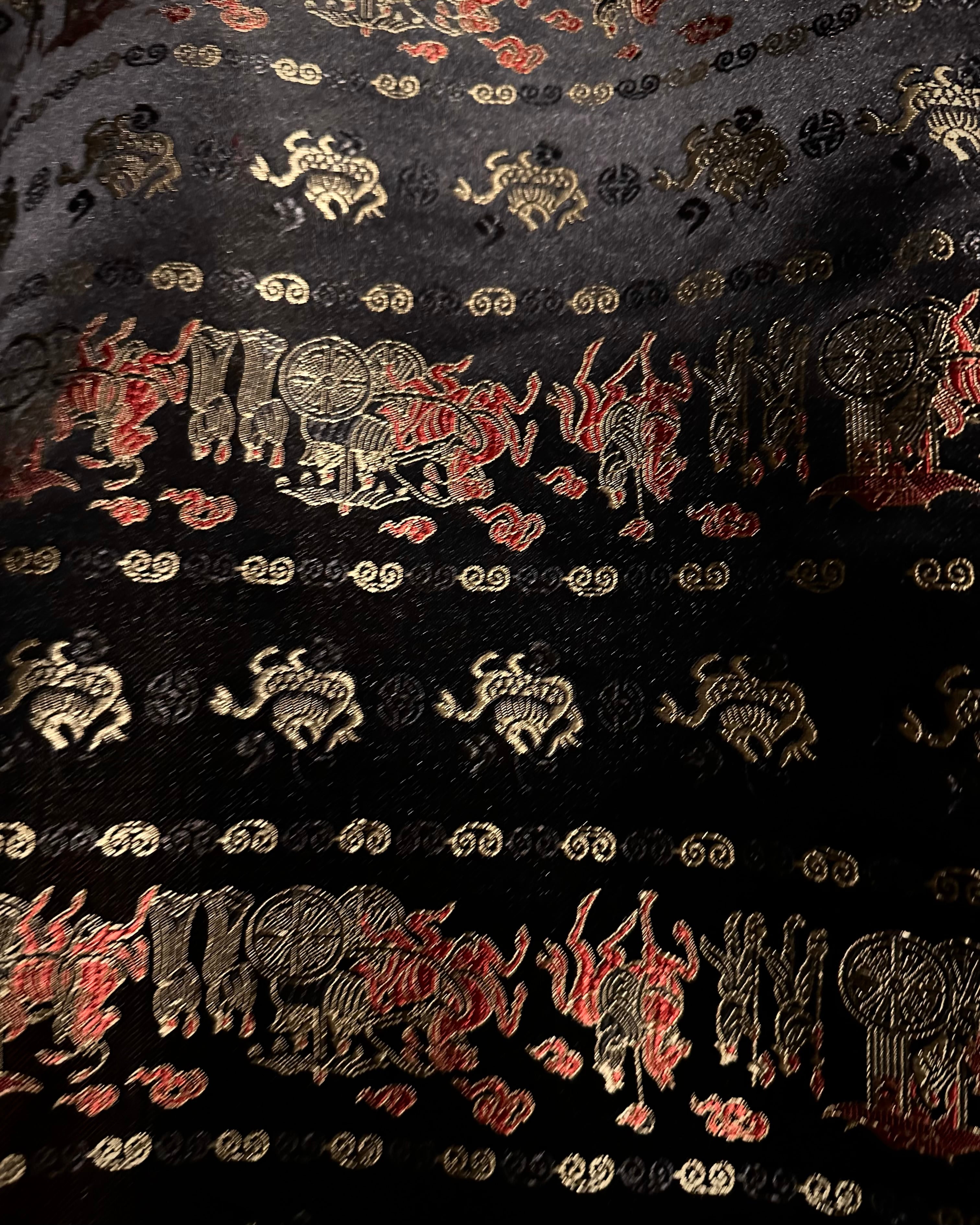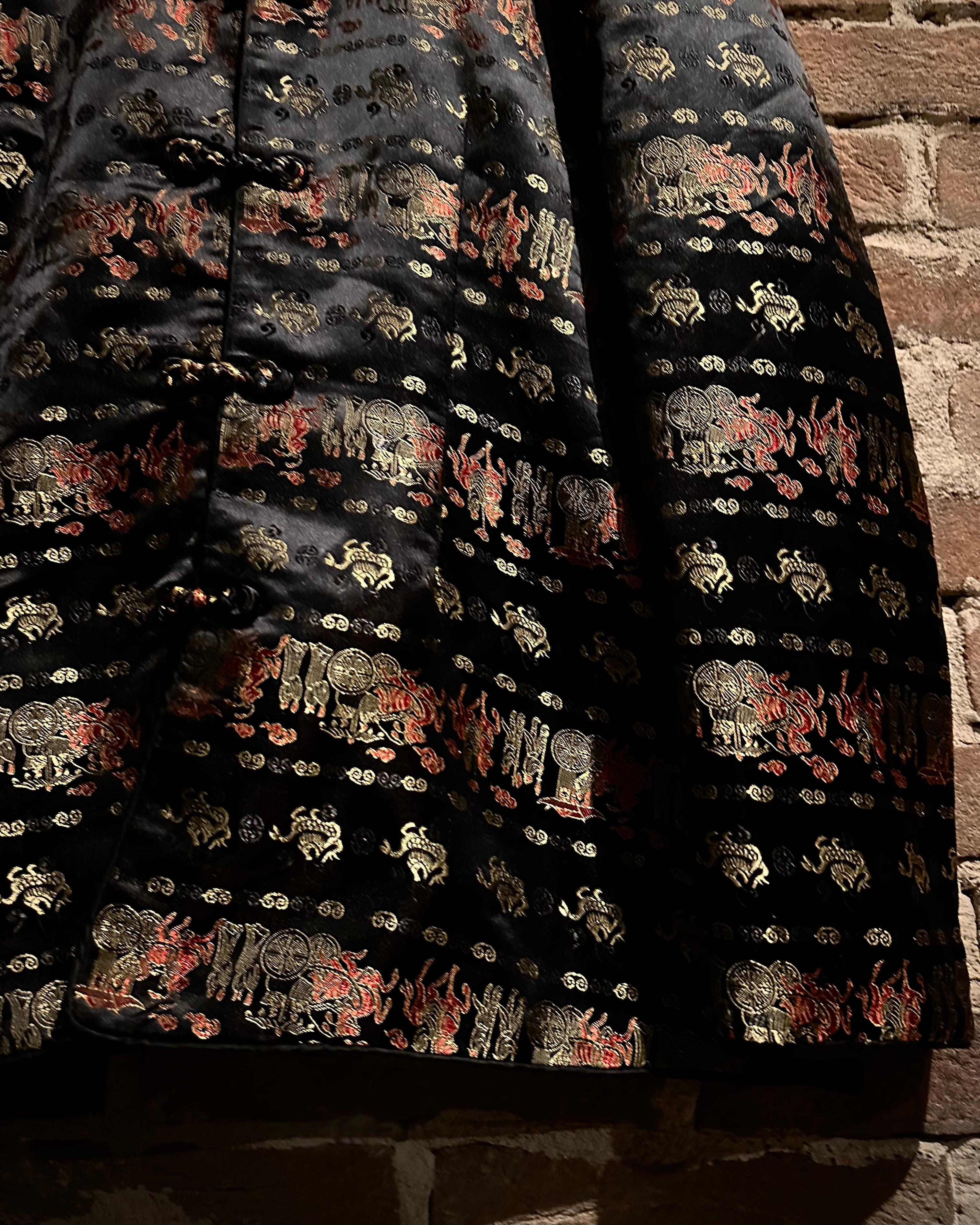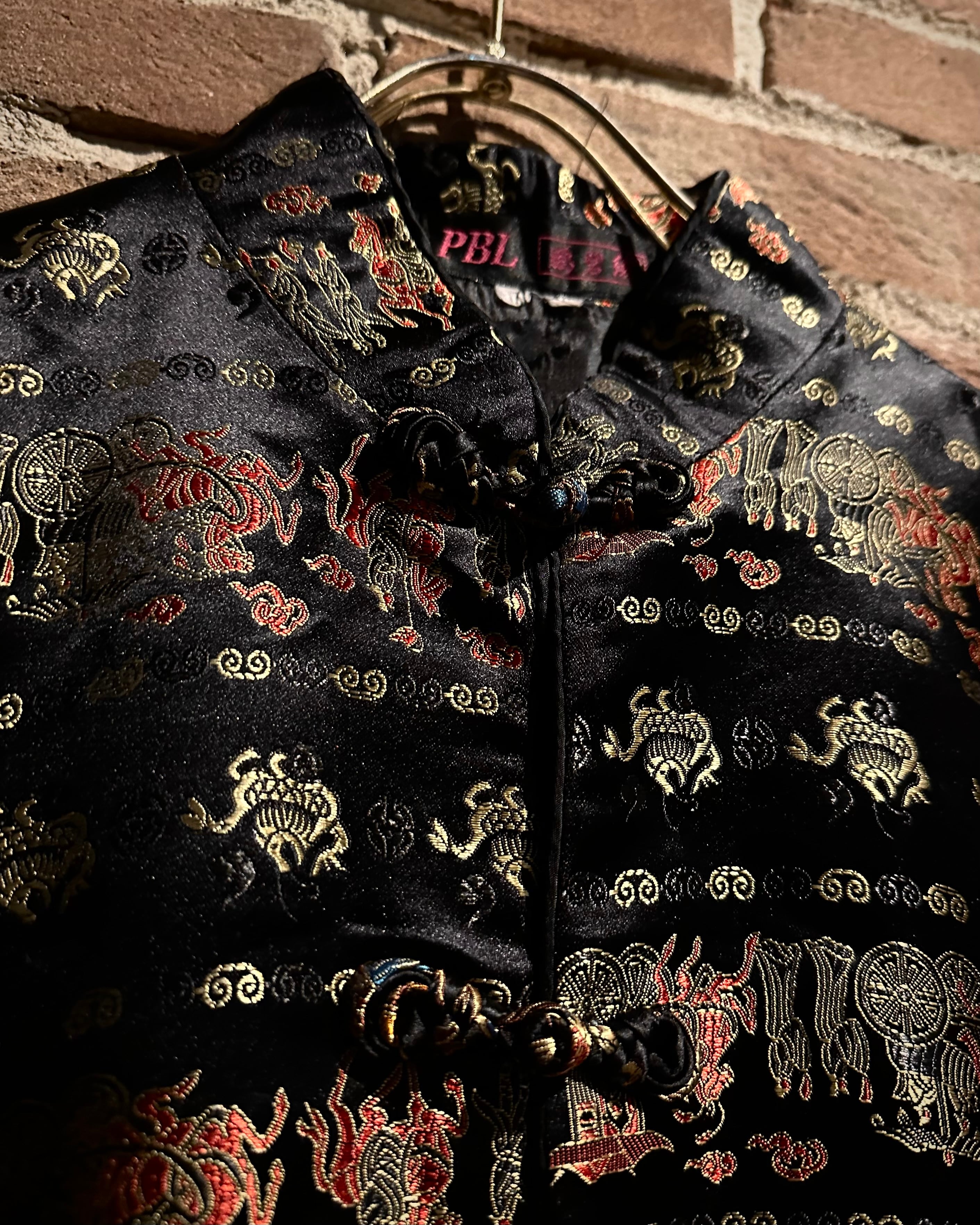 フロントにはチャイナボタン、首元にはマオカラーを採用した王道のディテール。伝統的な要素をしっかりと踏襲しながらも、全体のバランスは非常に洗練されており、野暮ったさを感じさせない仕上がりに。