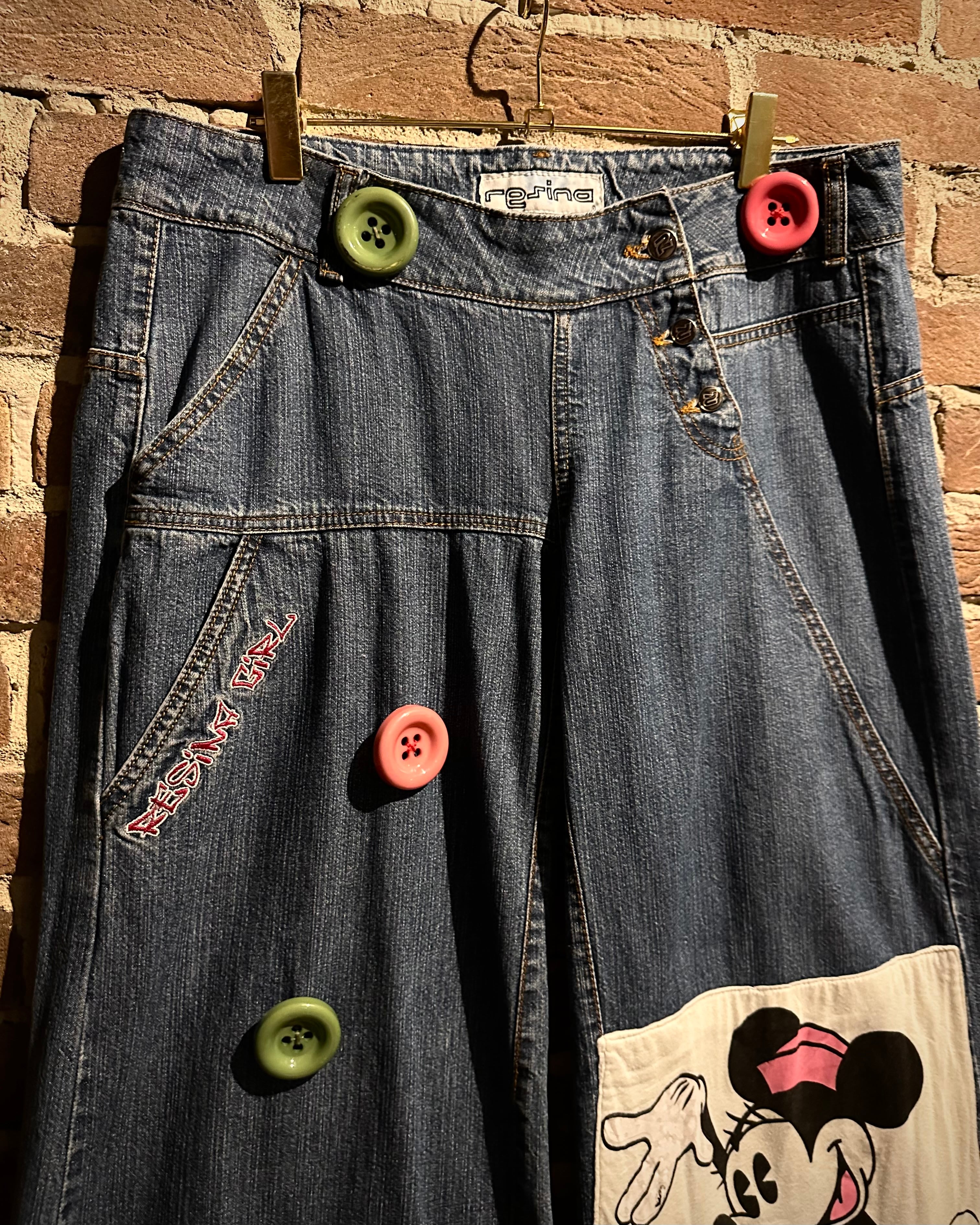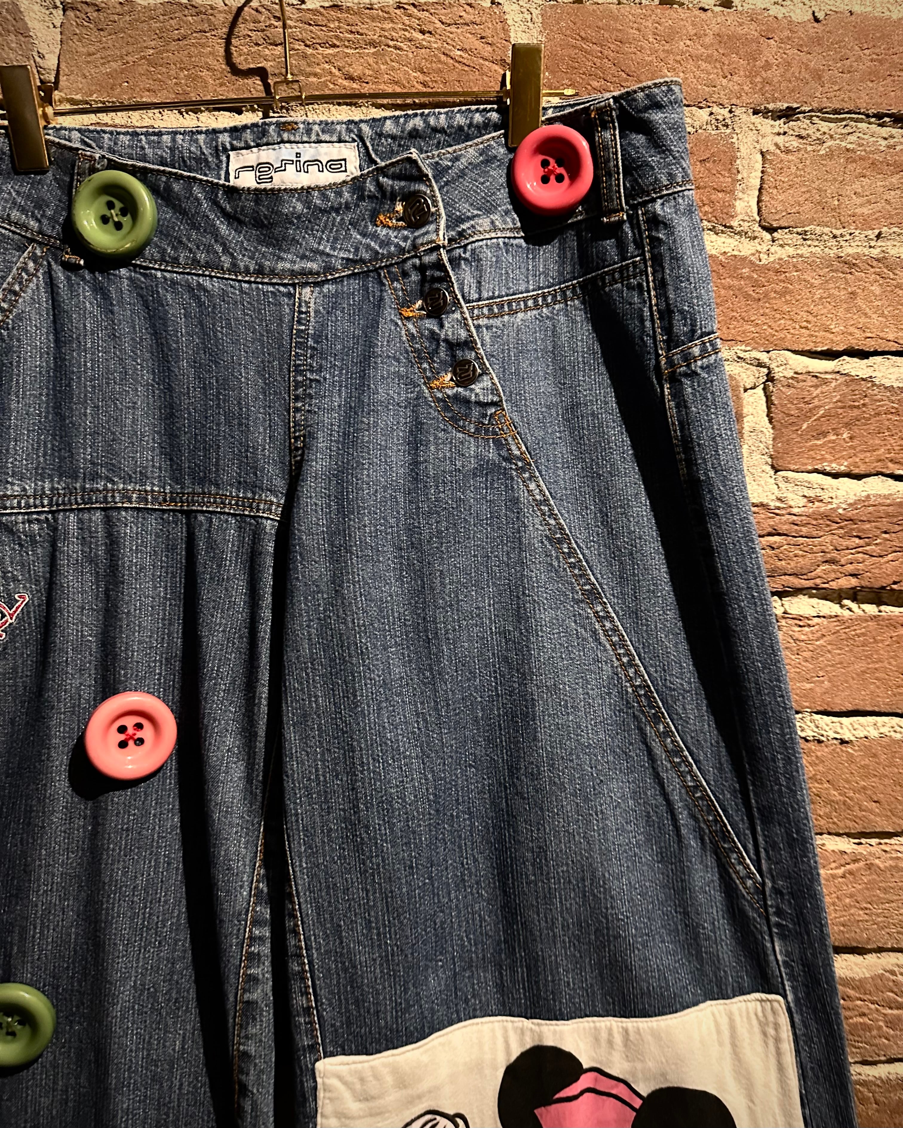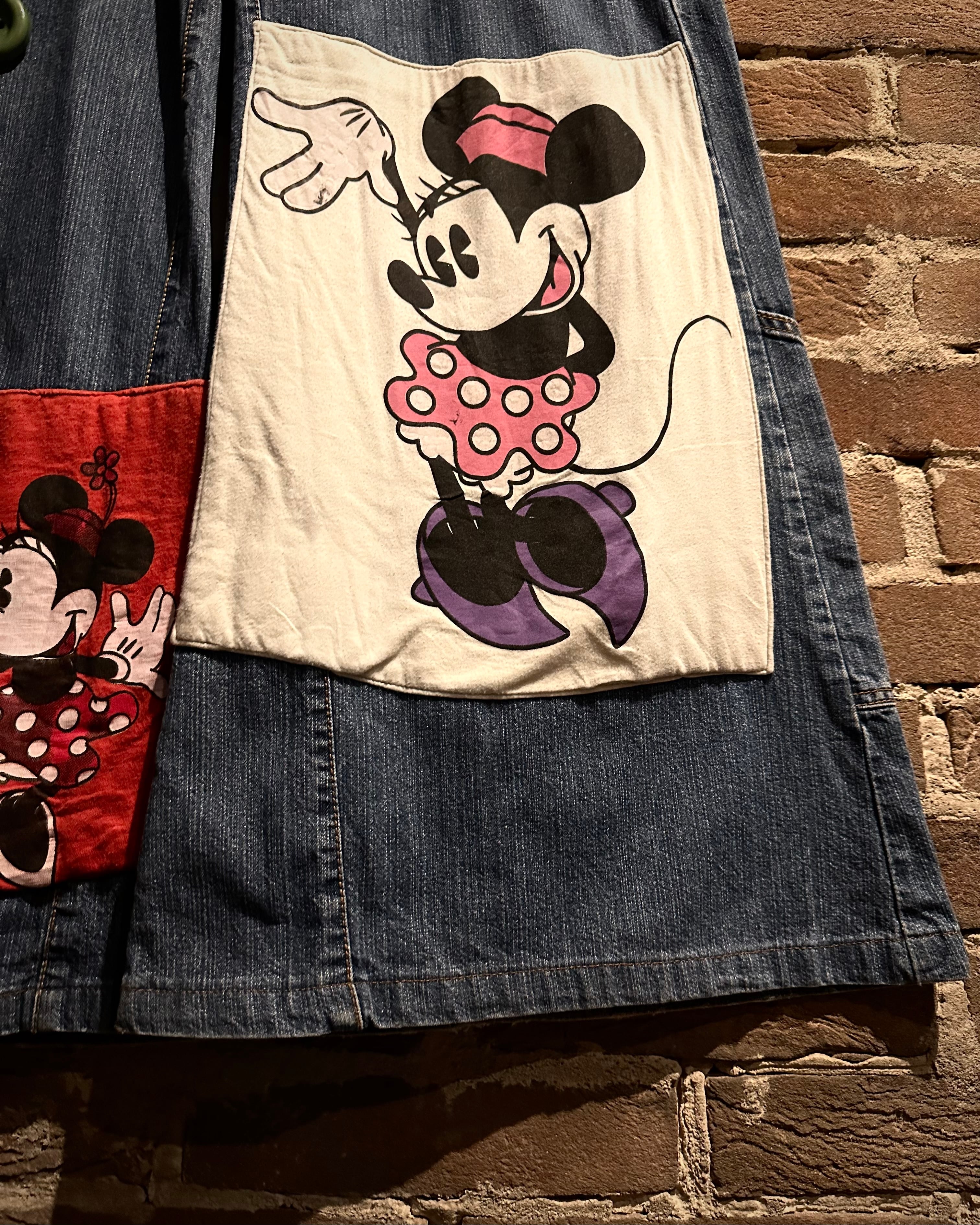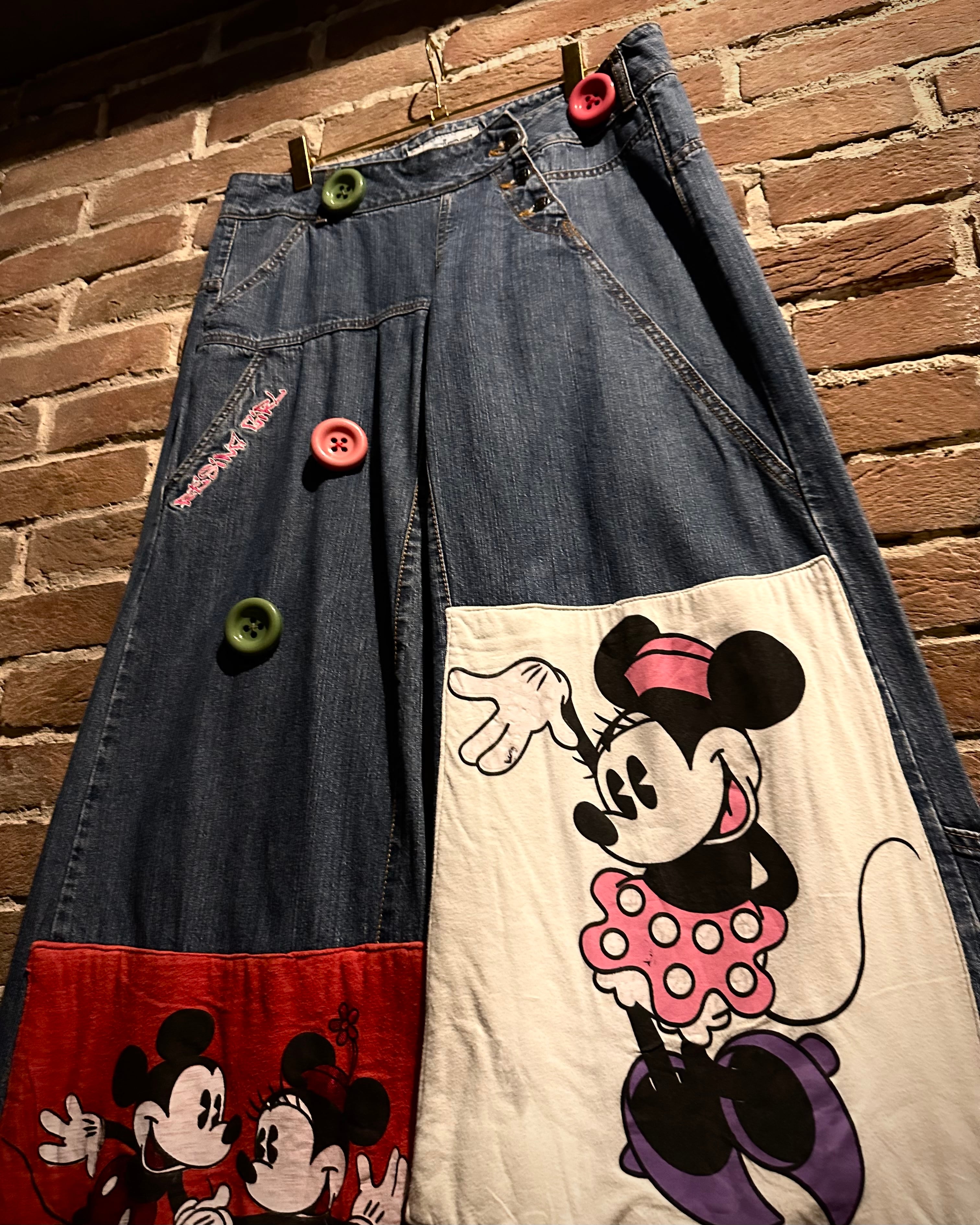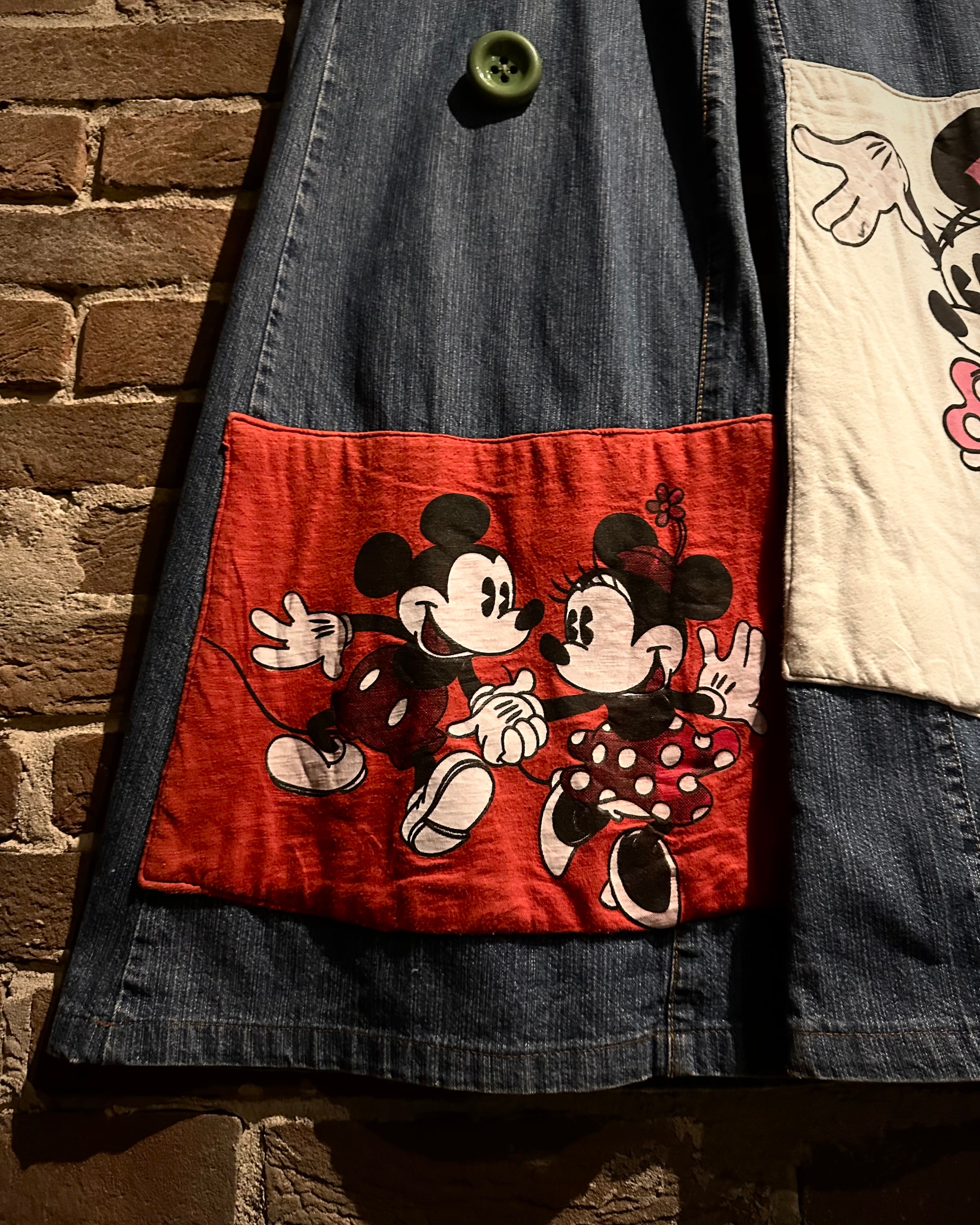 フロントにミッキー&ミニーのレトロな雰囲気を漂わせる生地を配置。ウエストやフロントに施された大きめのボタンがデザインのアクセントになりつつ、前所有者の趣味嗜好が載せられた絶妙なデザインバランスが◎