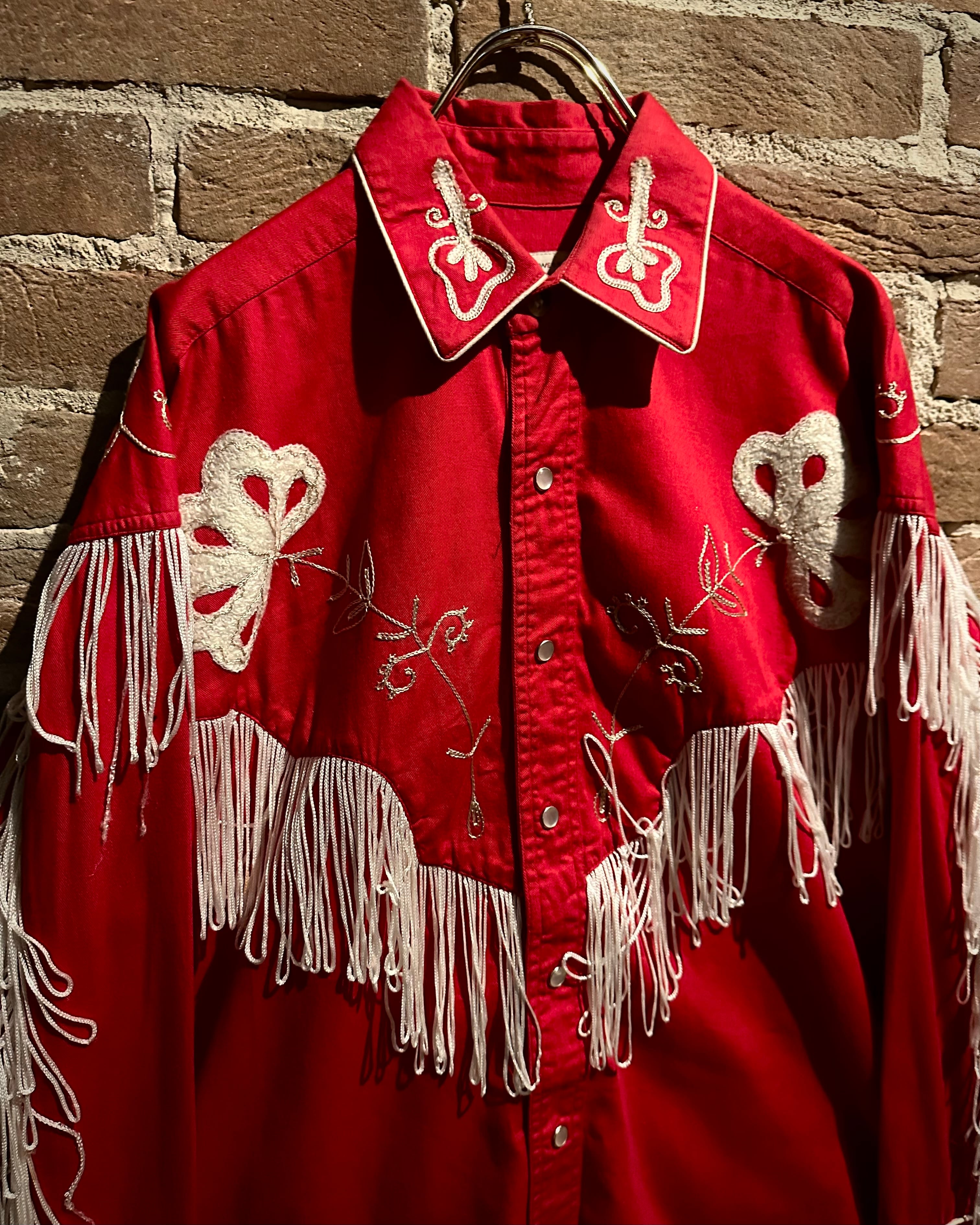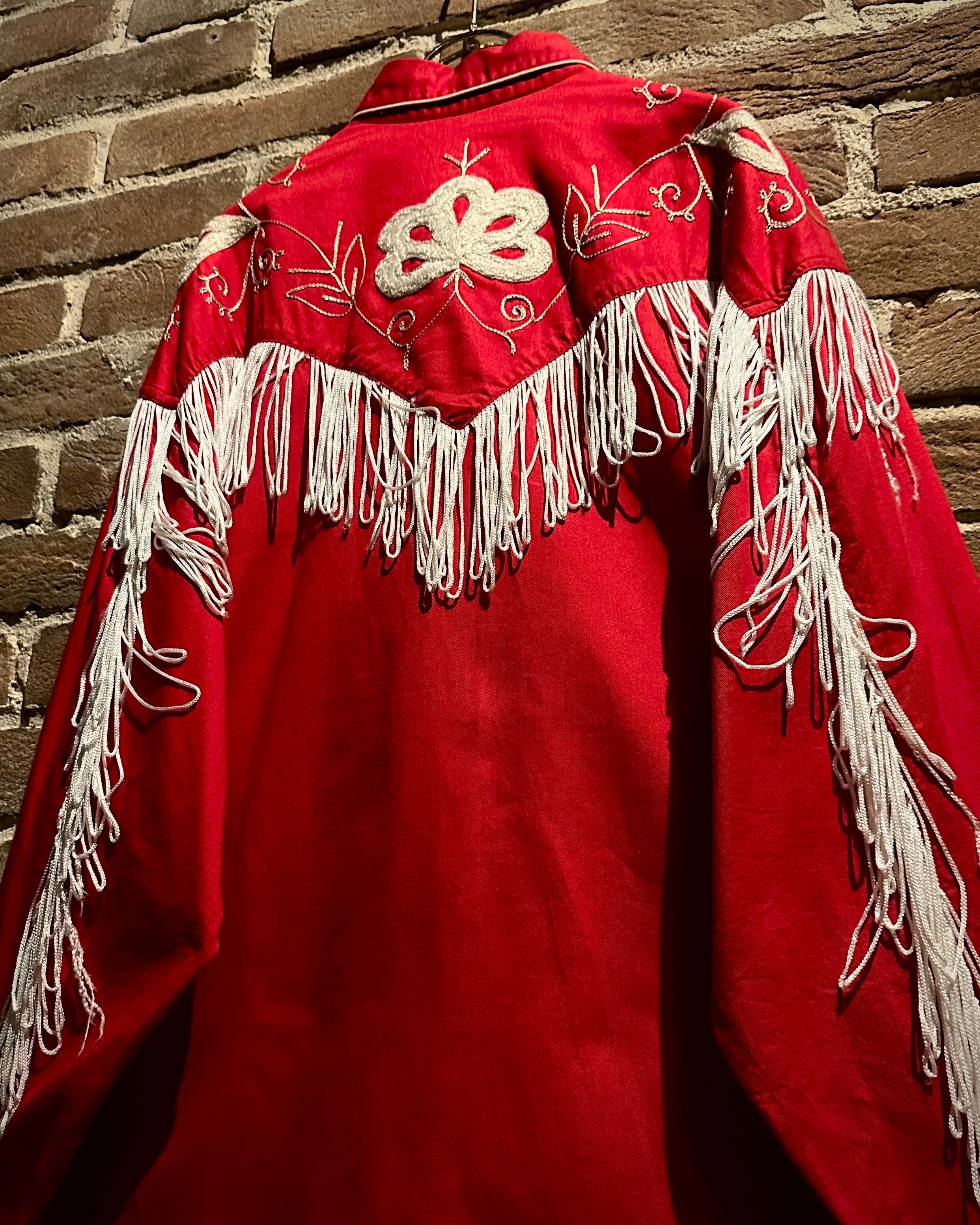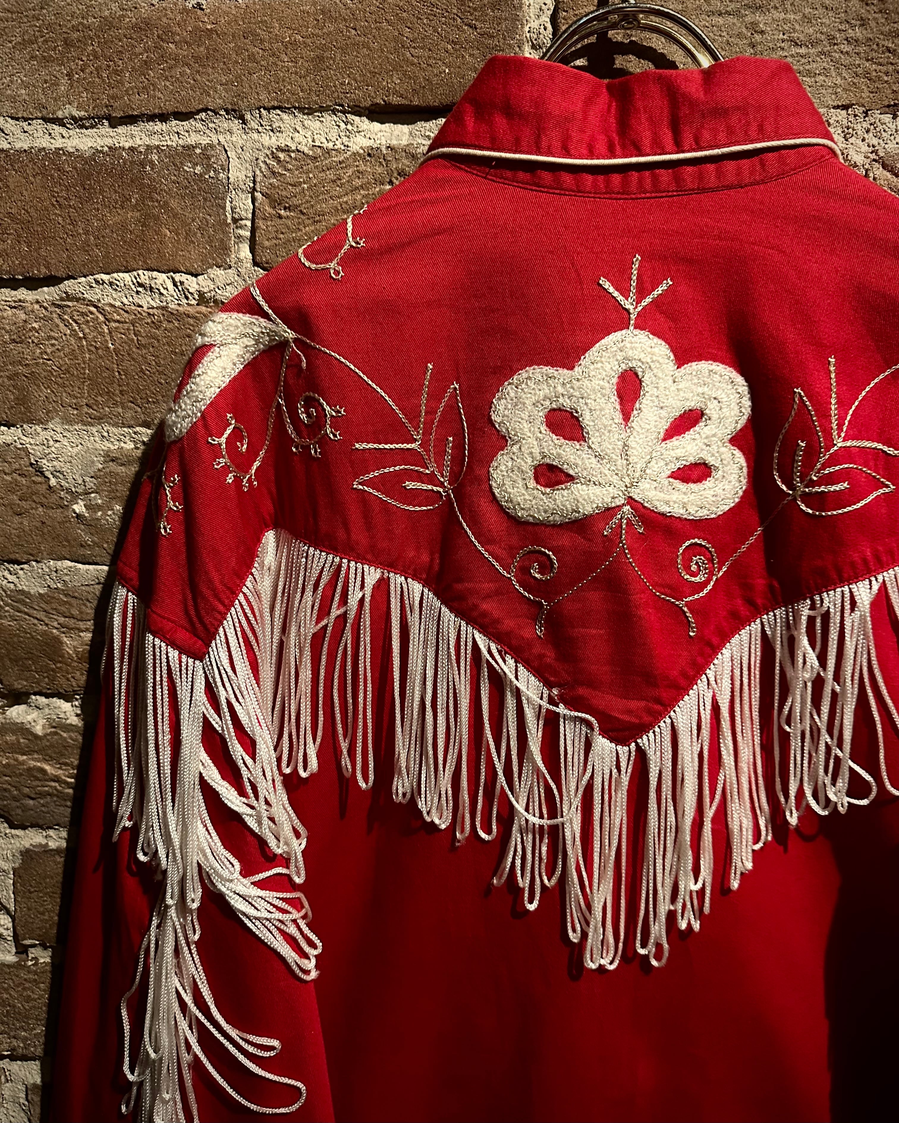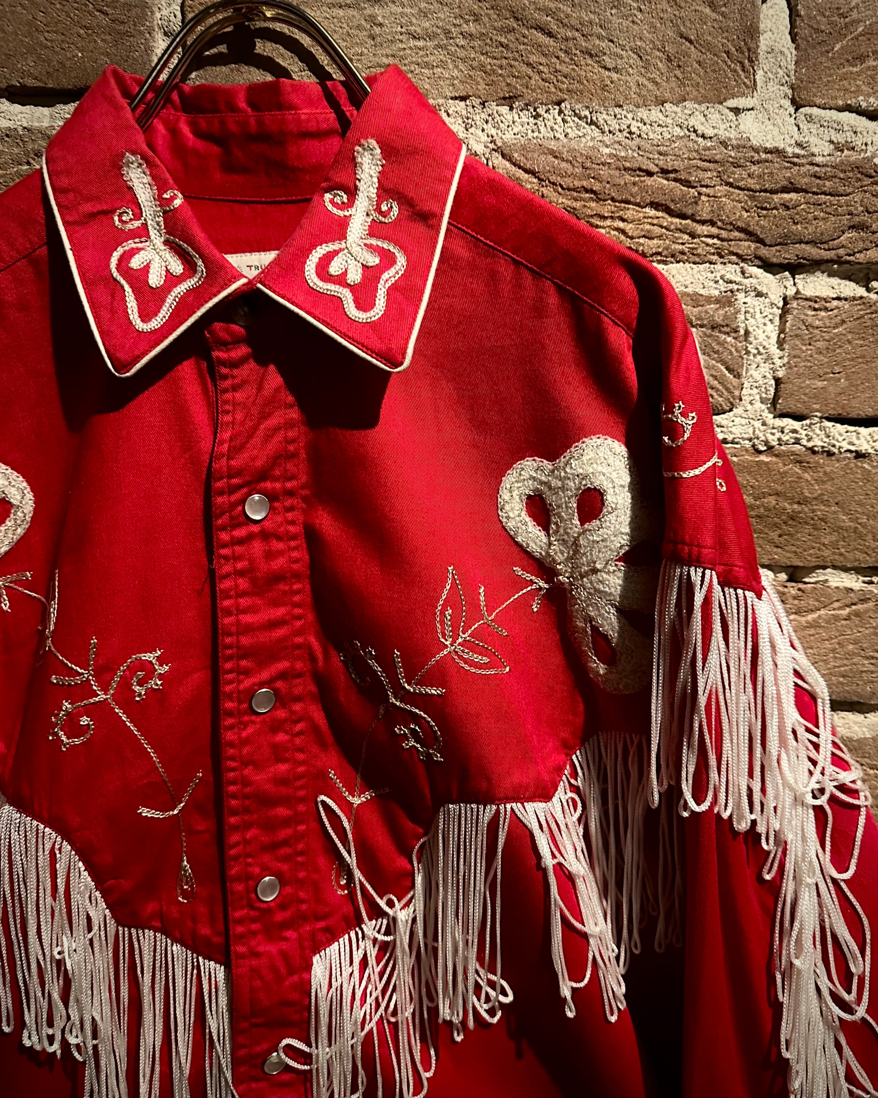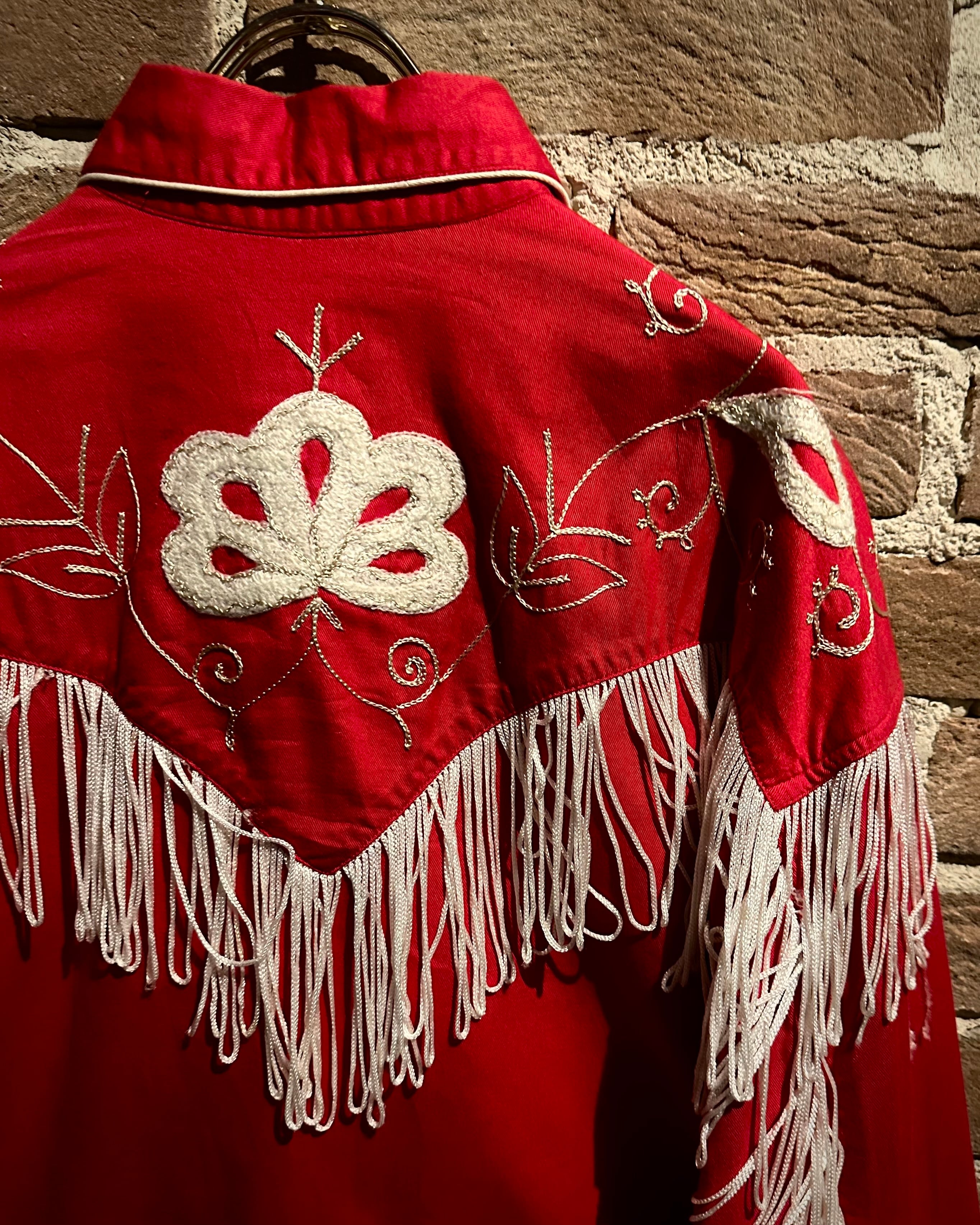 タフなコットンツイルボディをベースに、立体的に施された花柄刺繍とチェーンステッチ、そしてフリンジによる装飾といった、70年代らしい華やかな装飾性を落とし込んだ一着。