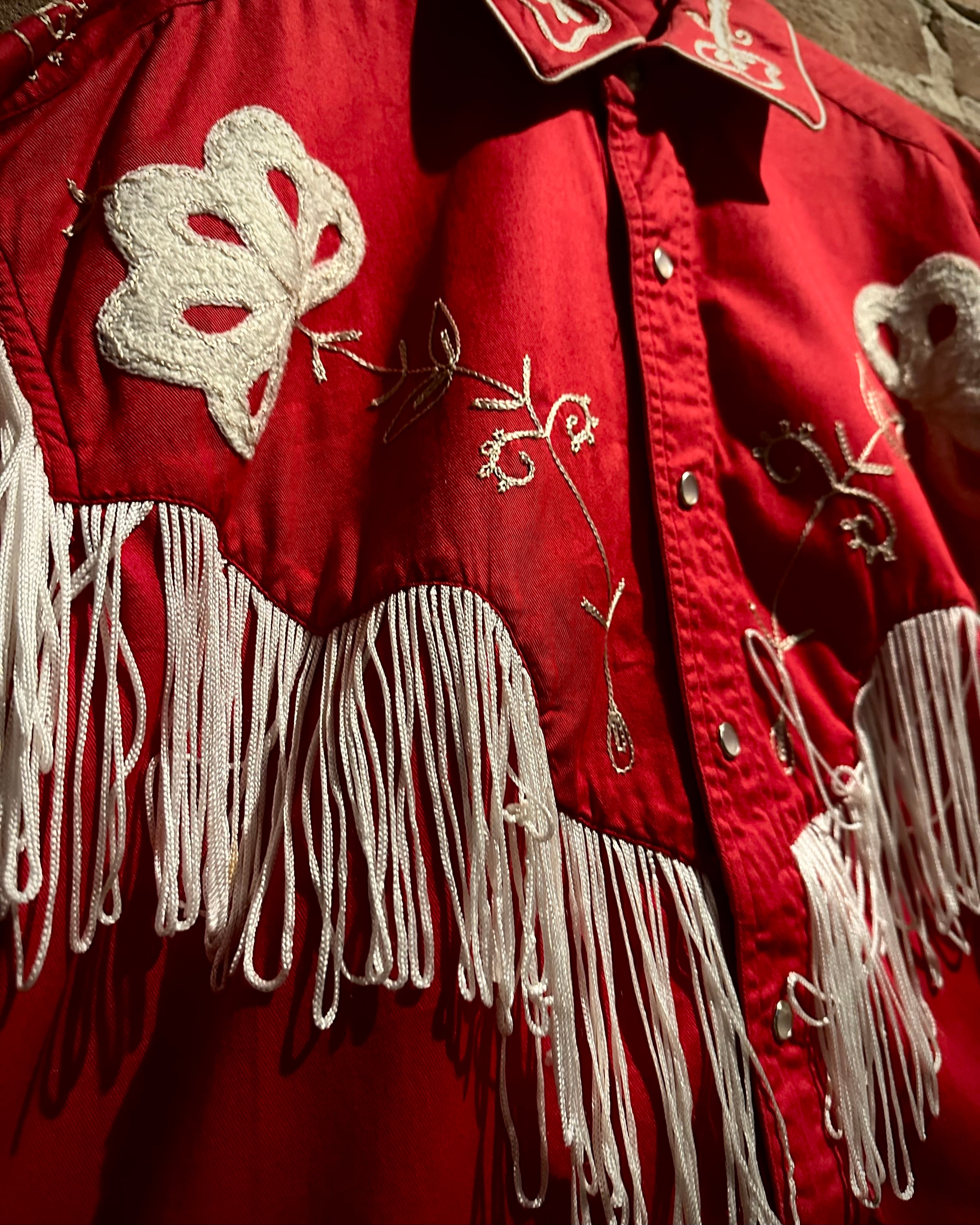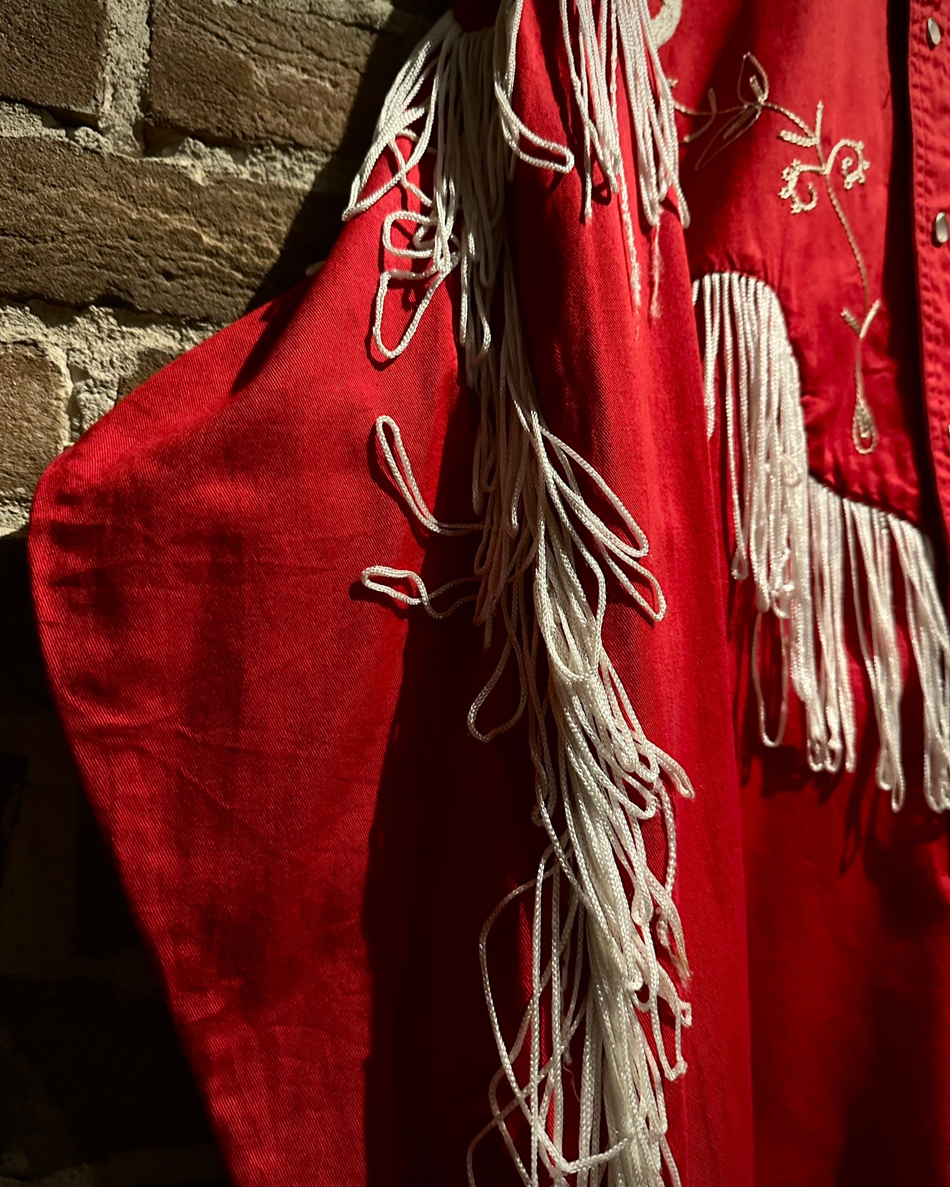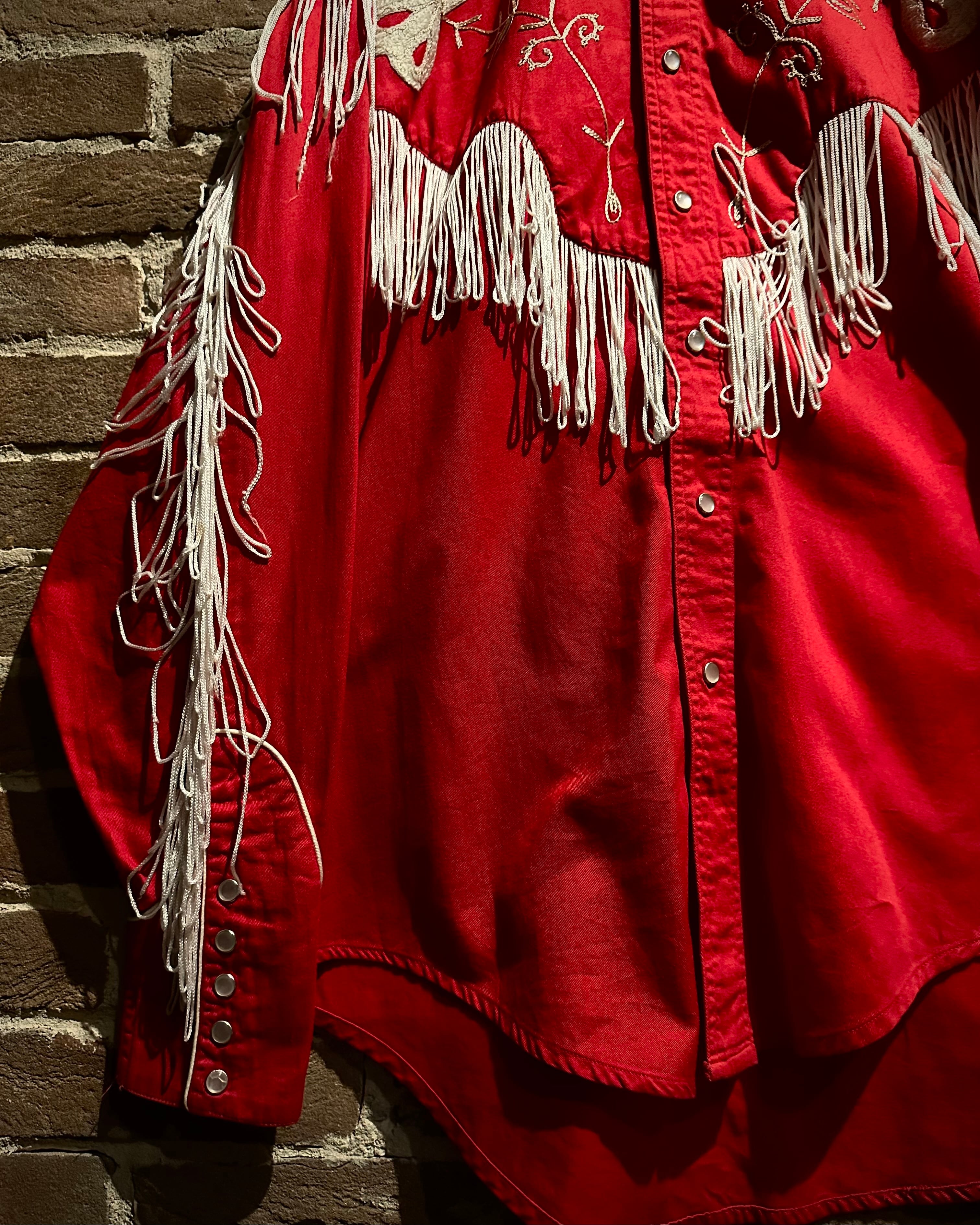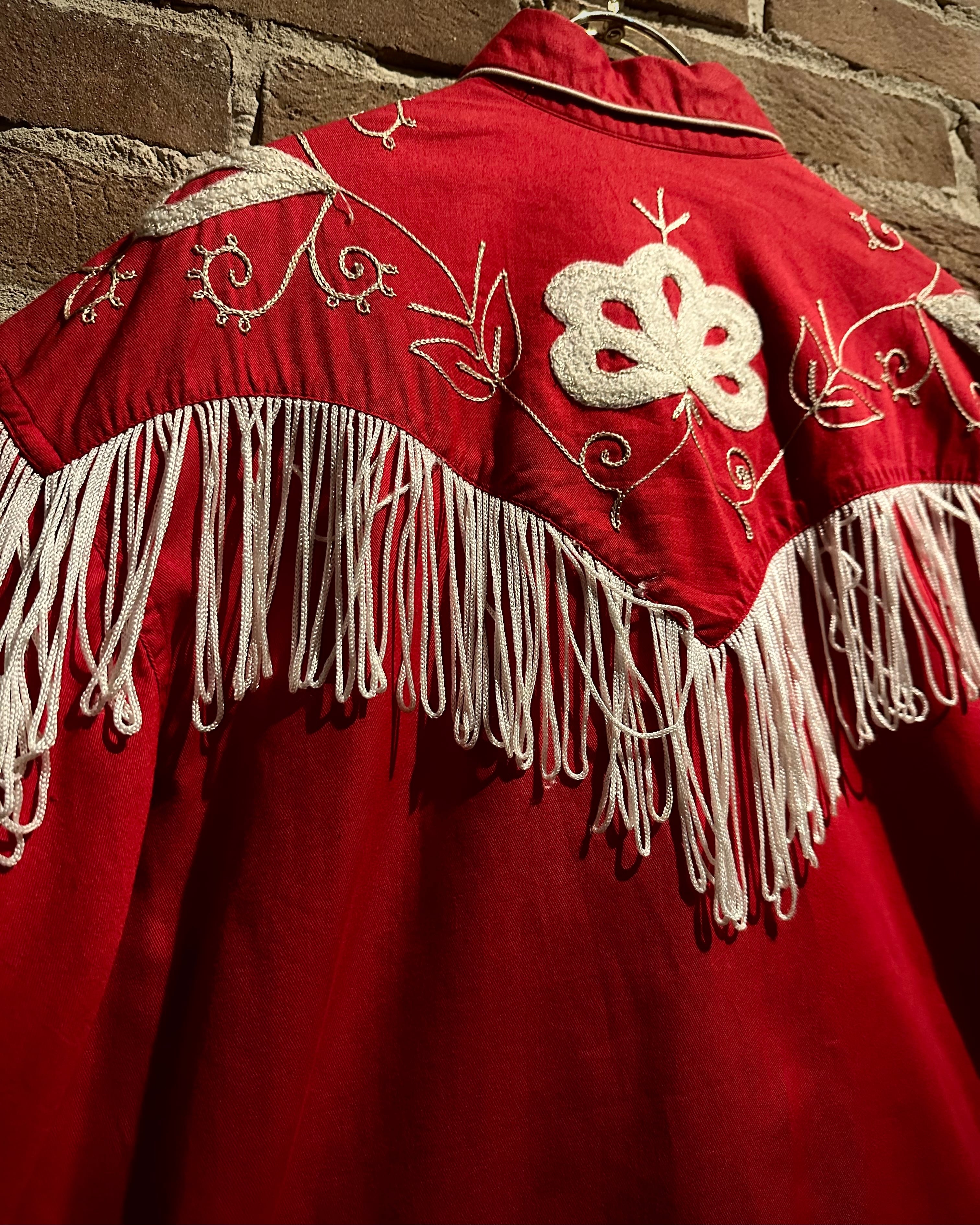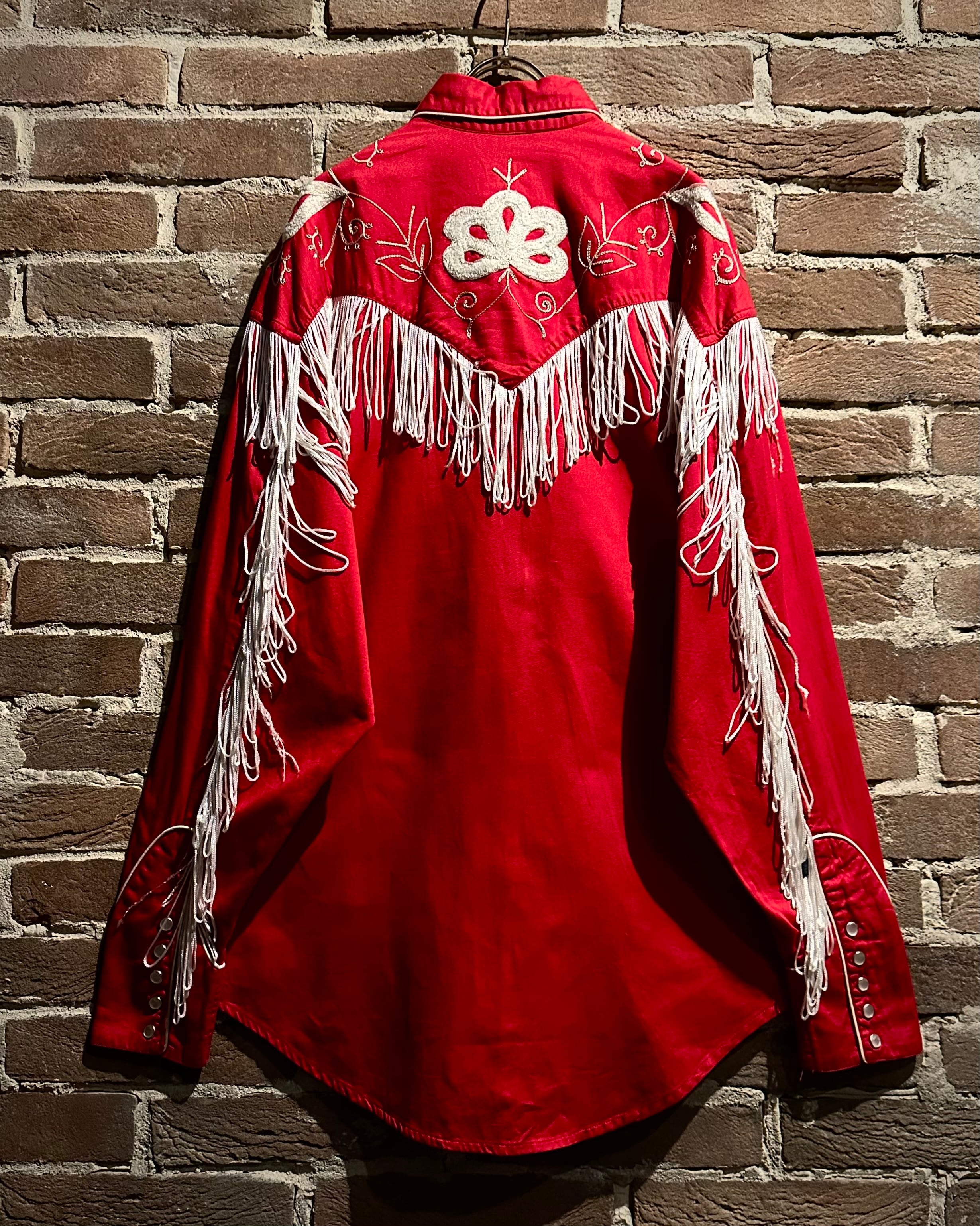 タフなコットンツイルボディをベースに、立体的に施された花柄刺繍とチェーンステッチ、そしてフリンジによる装飾といった、70年代らしい華やかな装飾性を落とし込んだ一着。