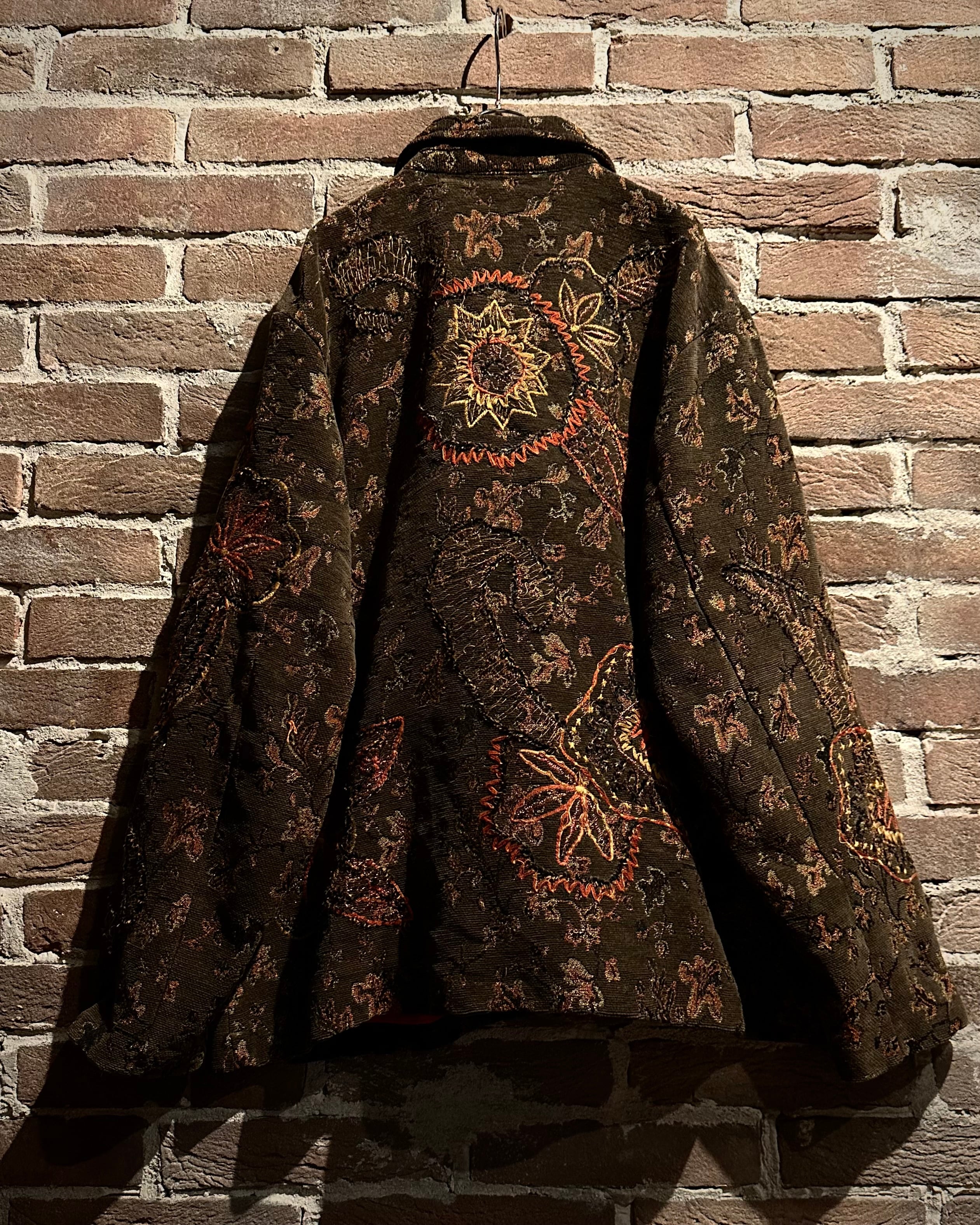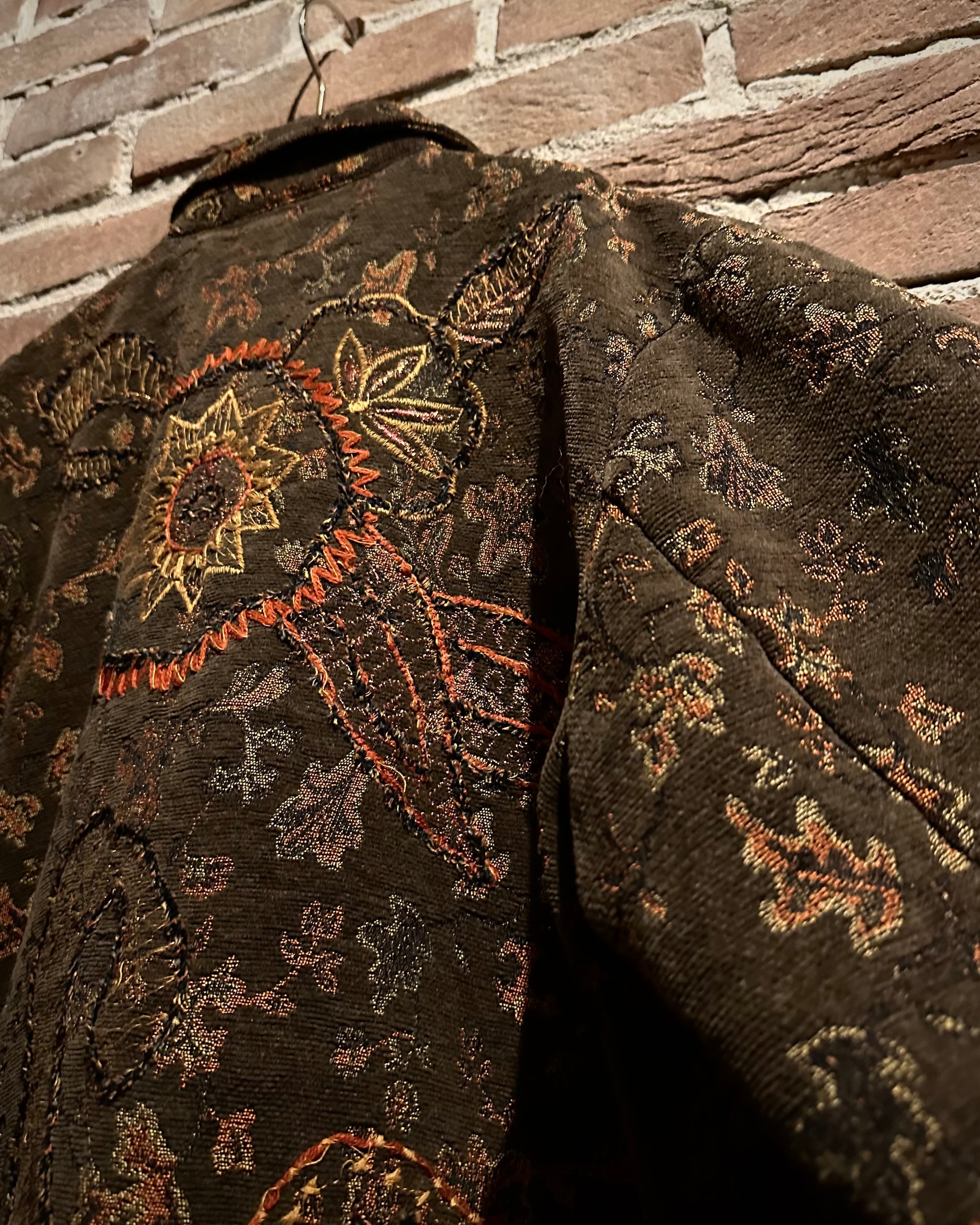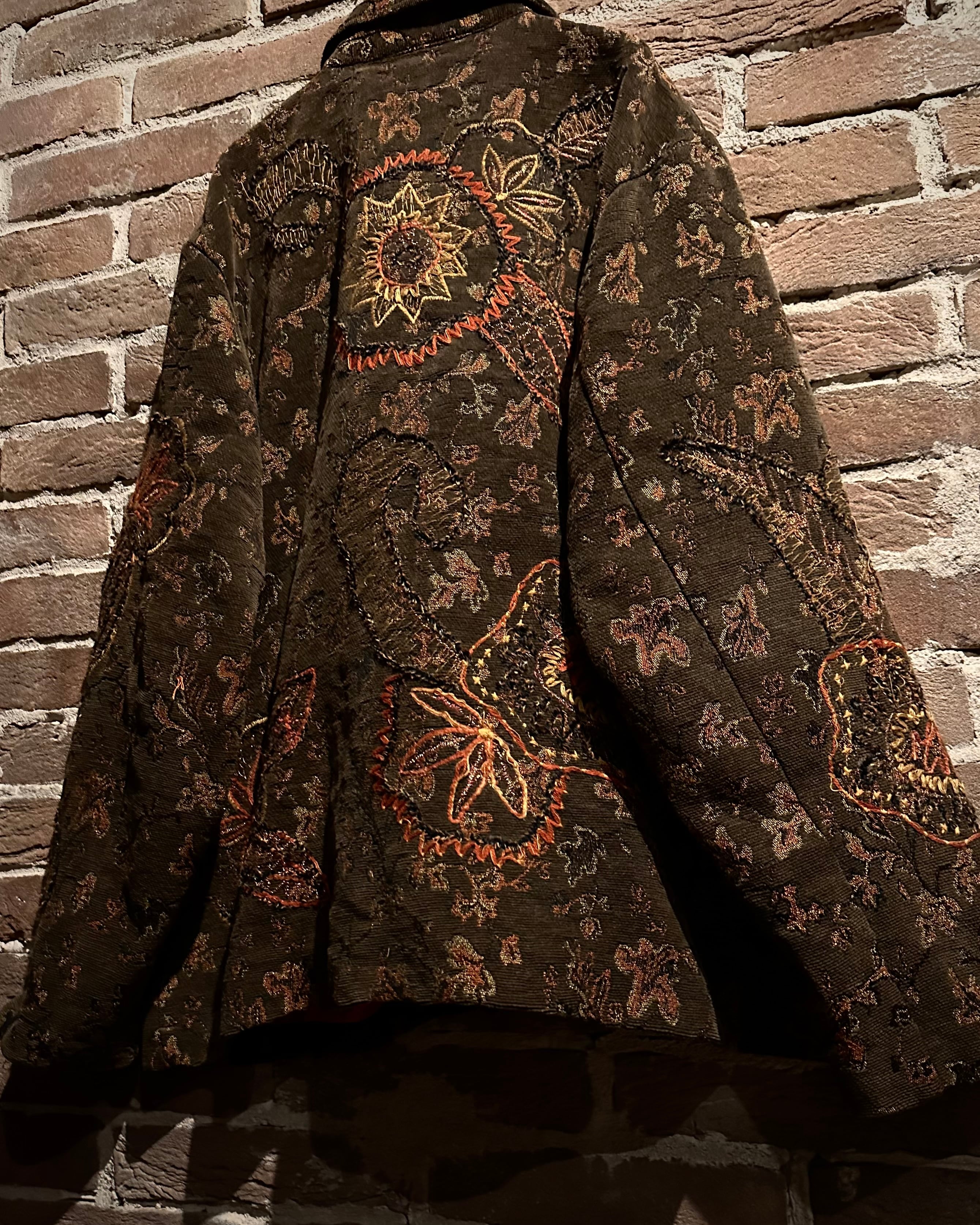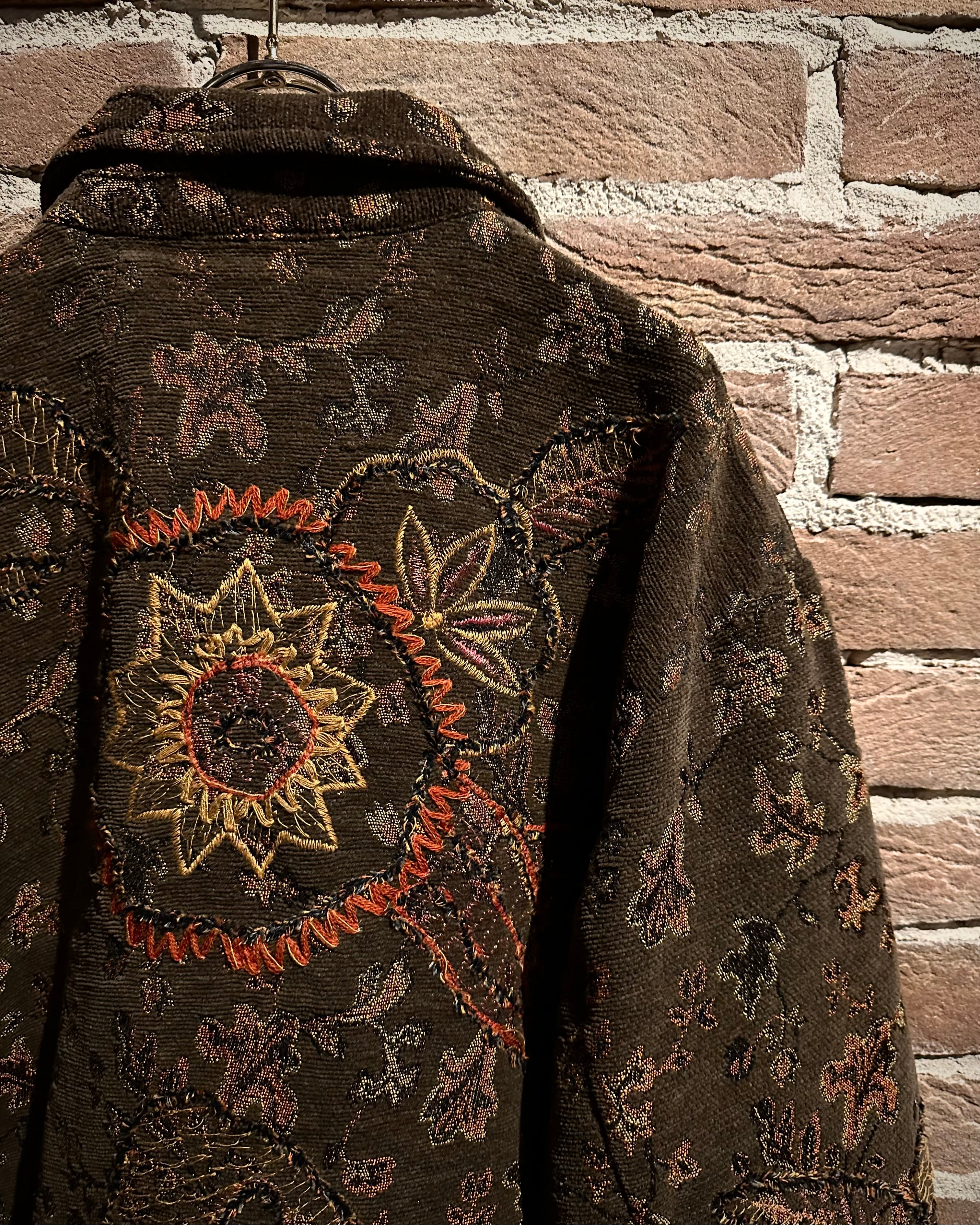 ブラウンベースの落ち着いたカラーリングに、花や太陽モチーフを織りと刺繍で重ねた、奥行きのある表情を見せるゴブランジャケット。