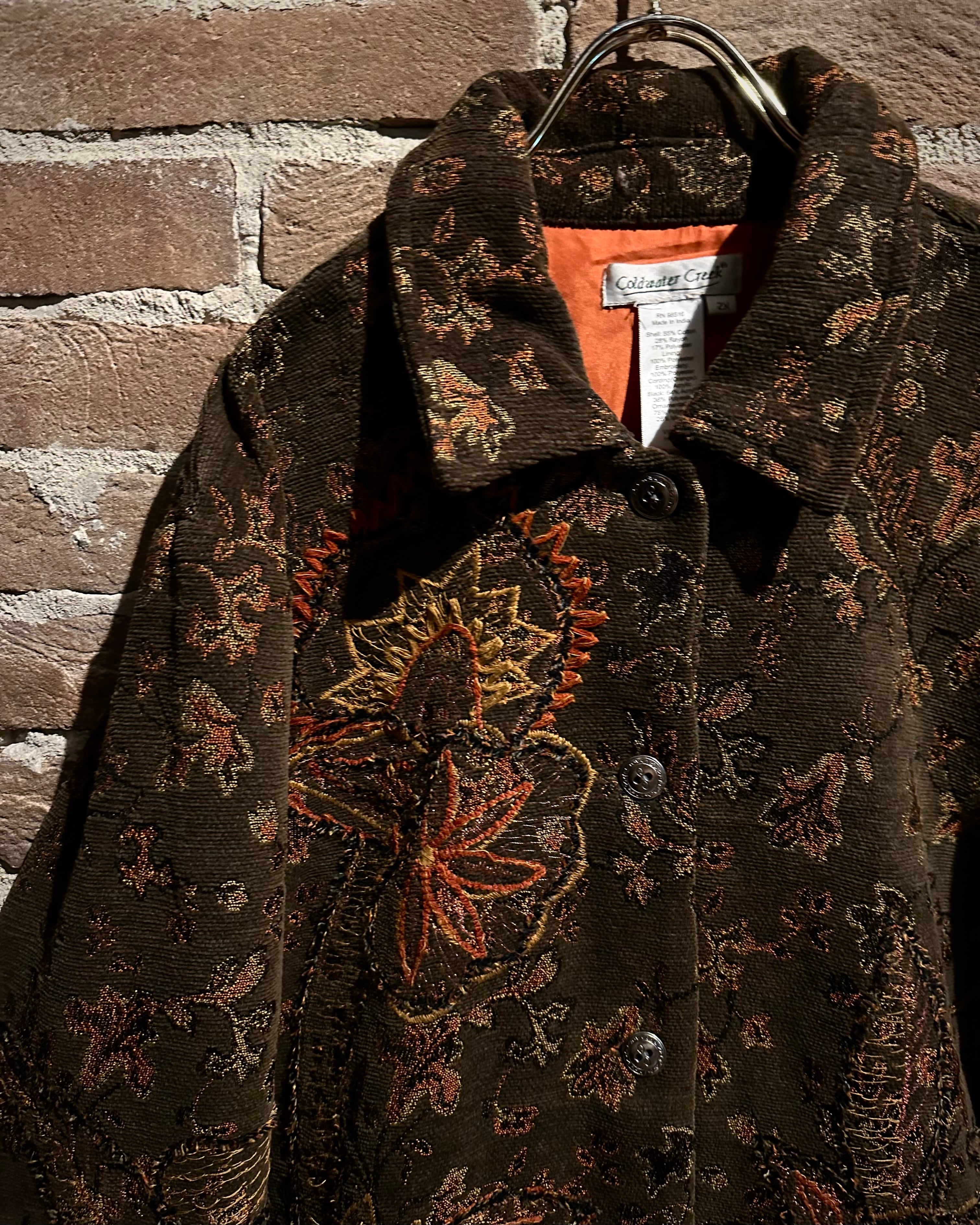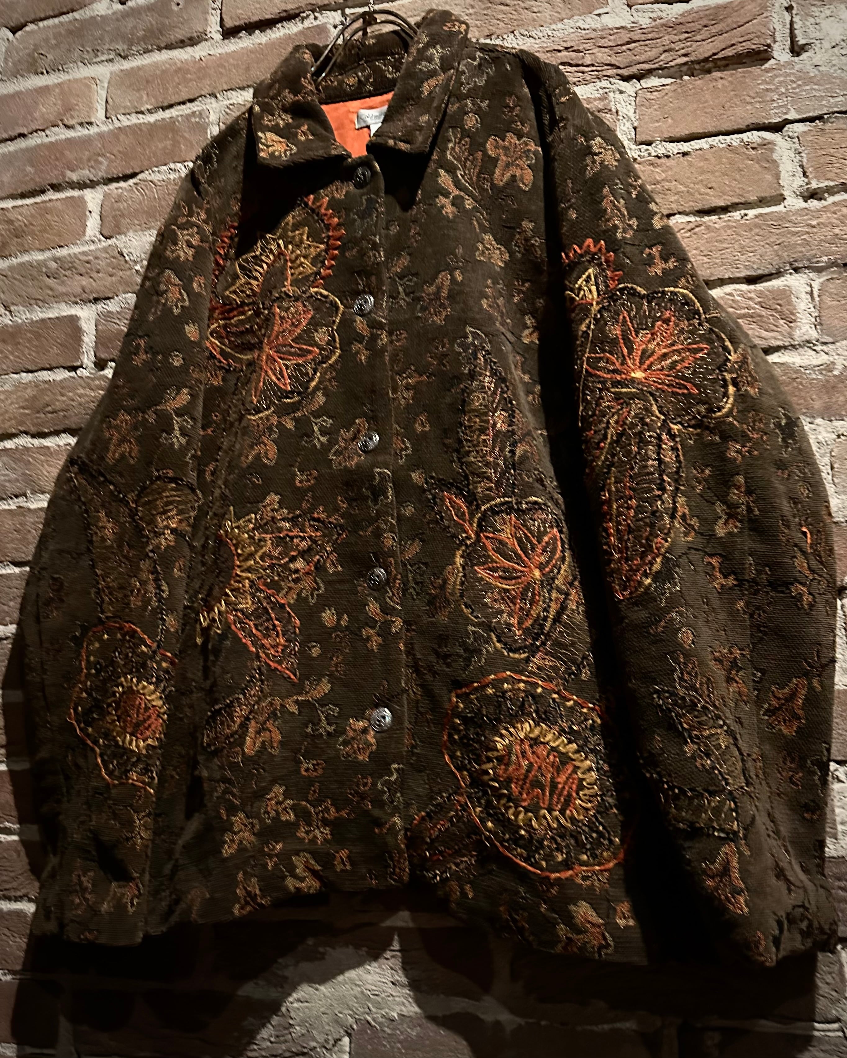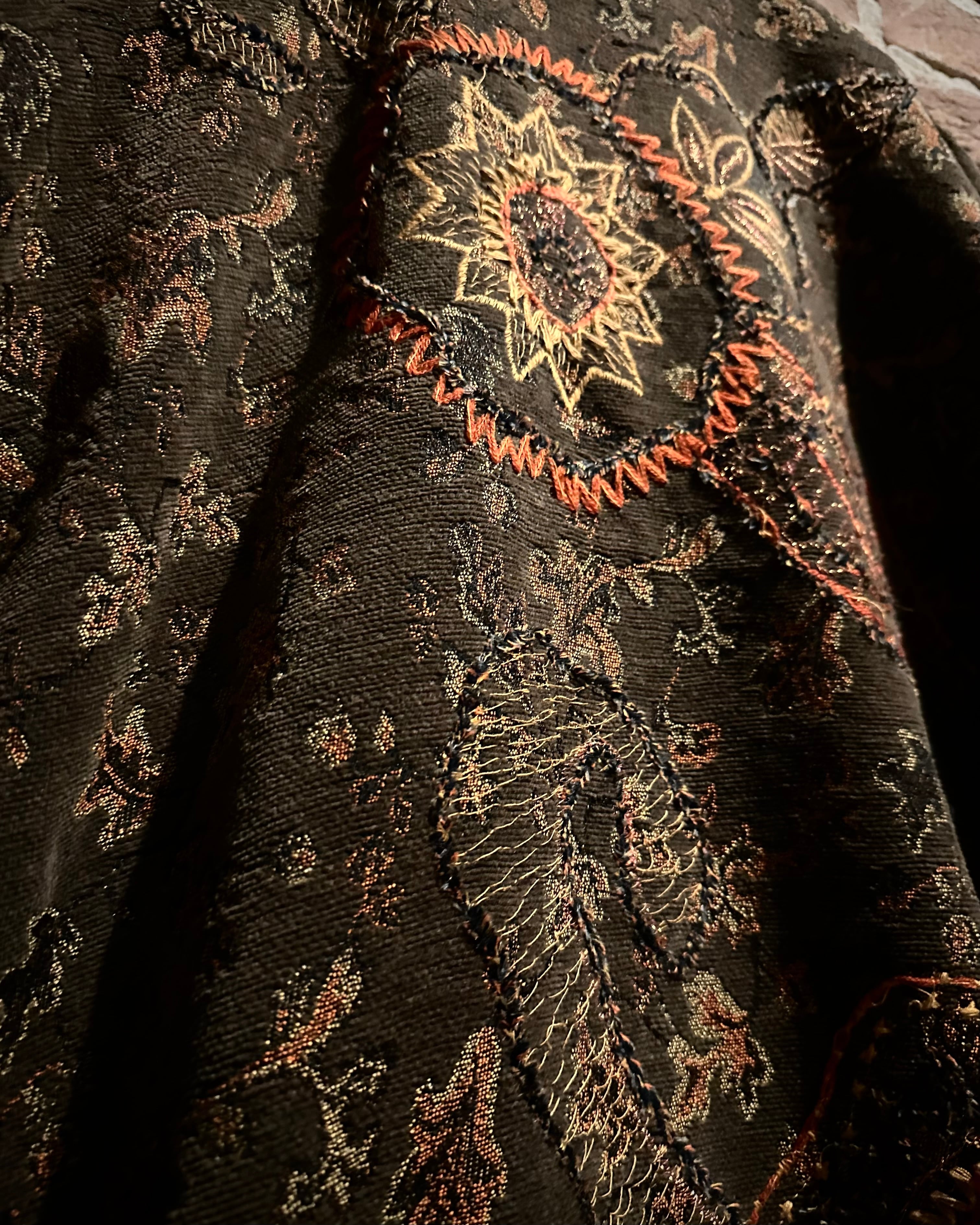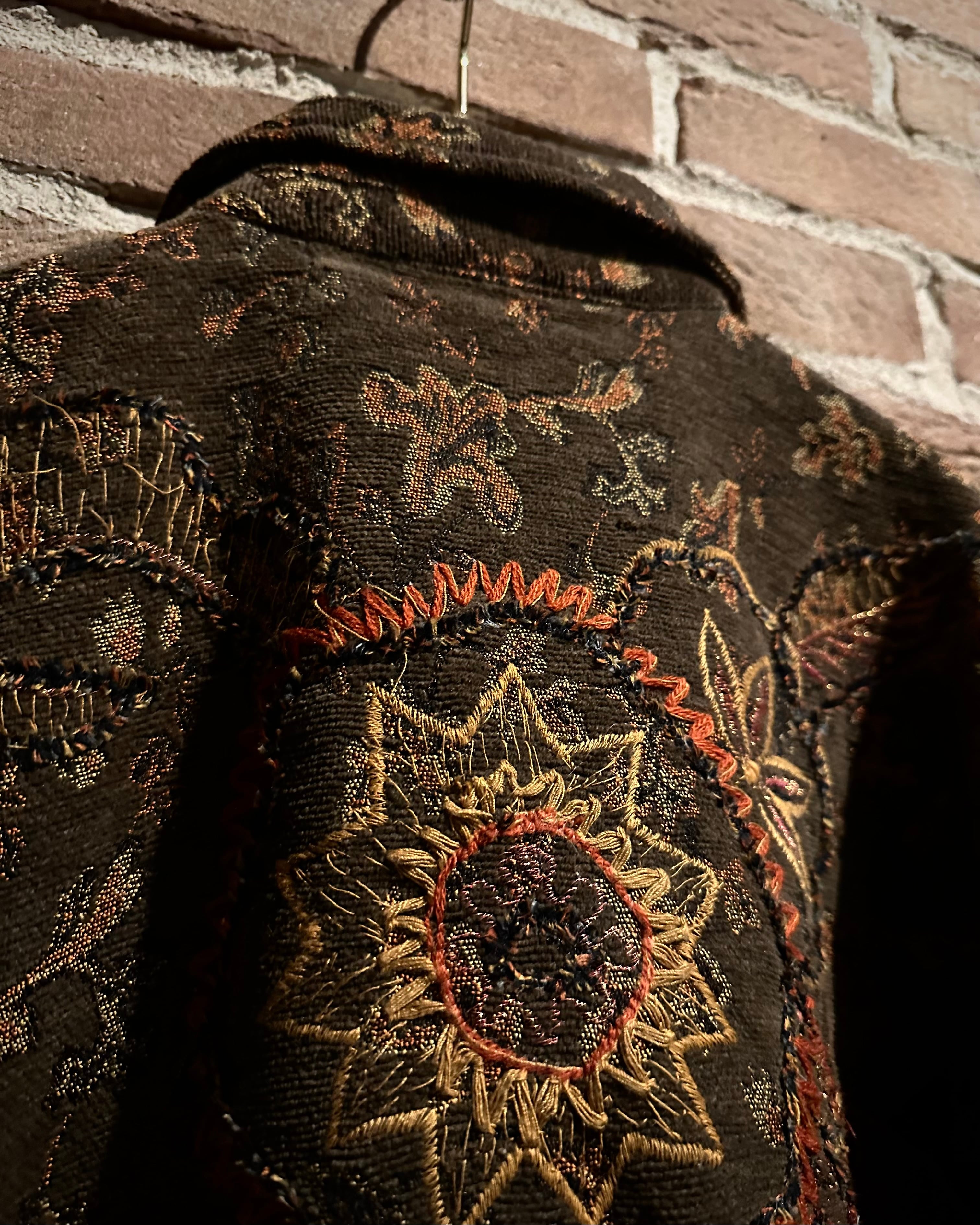 ブラウンベースの落ち着いたカラーリングに、花や太陽モチーフを織りと刺繍で重ねた、奥行きのある表情を見せるゴブランジャケット。