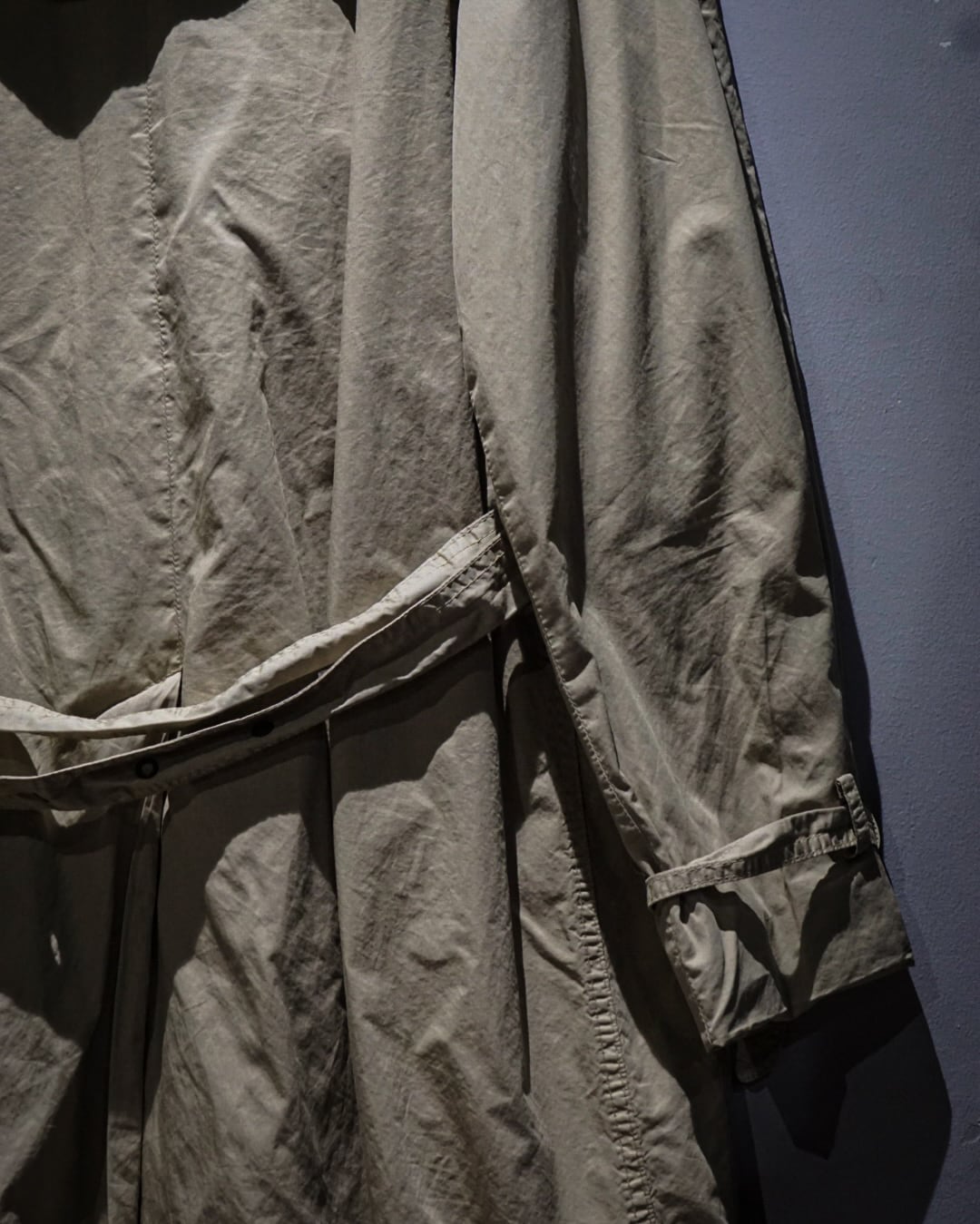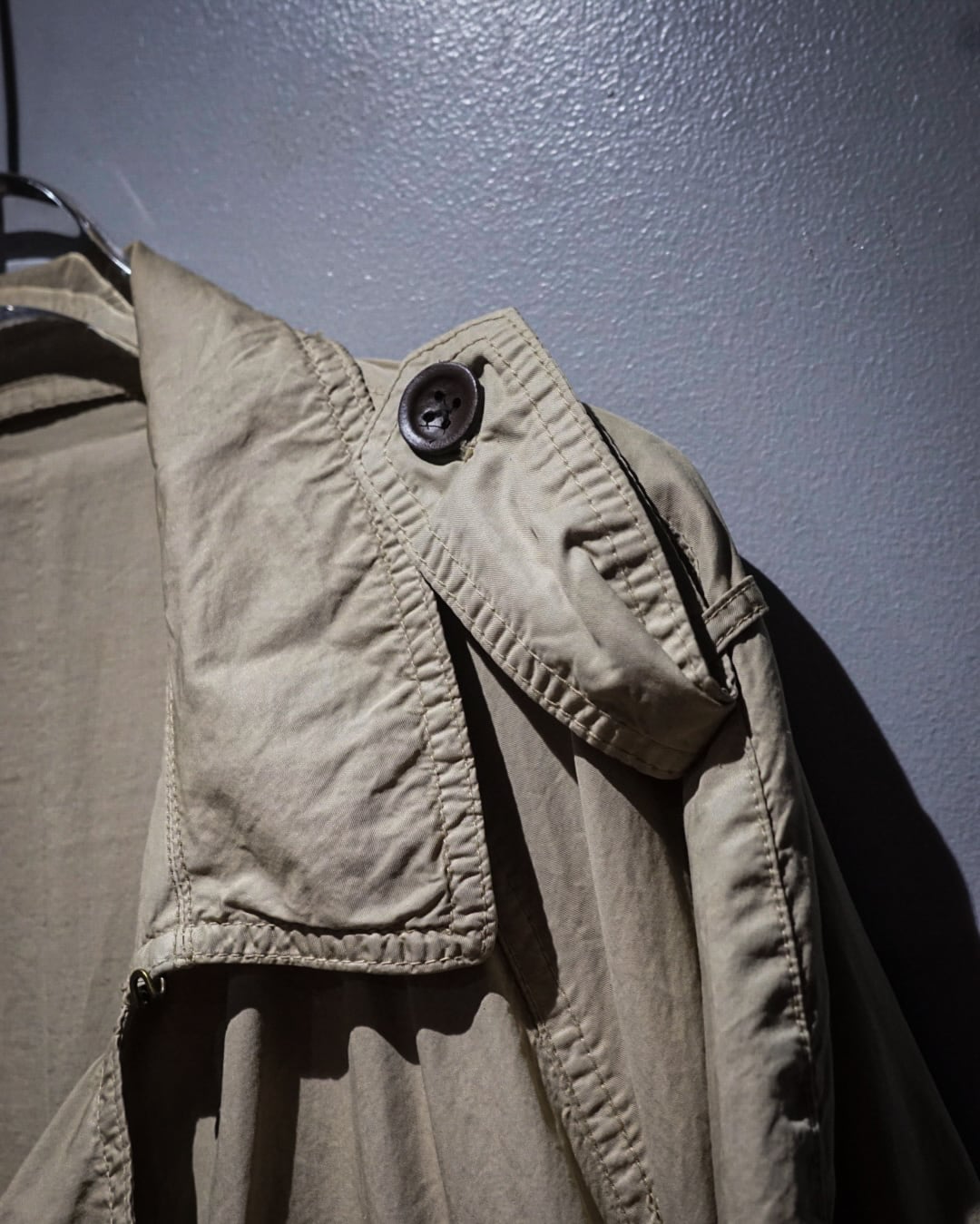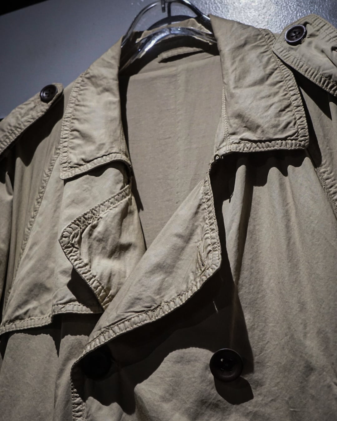 ボディにはマーセライズドコットンを使用し、コットンでありながらほのかな光沢と滑らかな質感を持ち、非常に軽やかな着心地に。無双仕立てによる一枚仕立てのような構造も相まって、トレンチコートでありながら驚くほどライトな仕上がりを見せています。