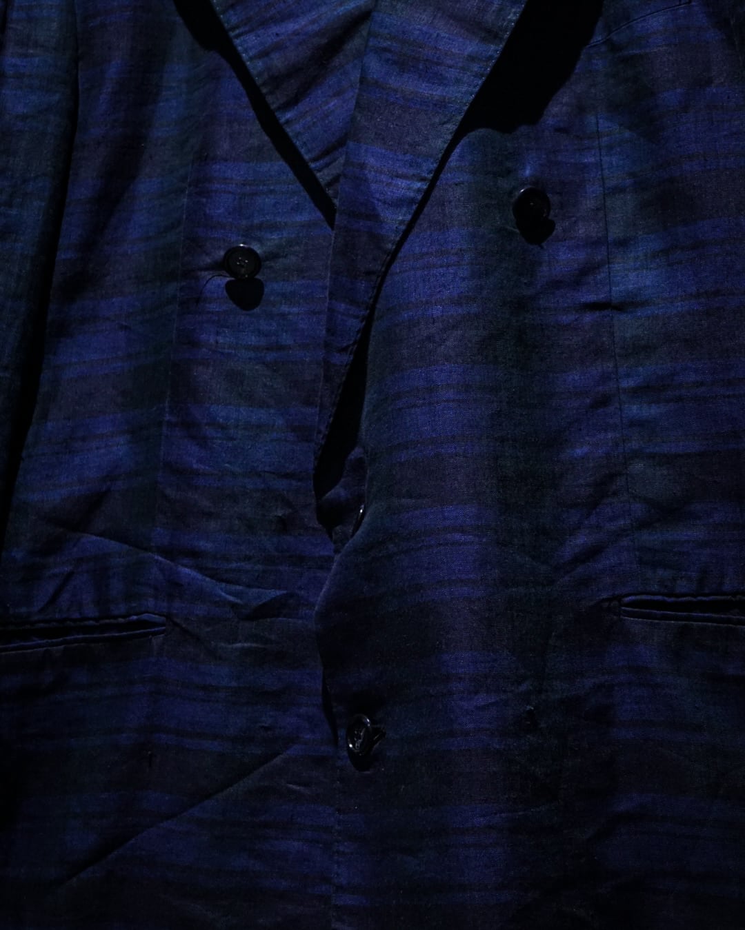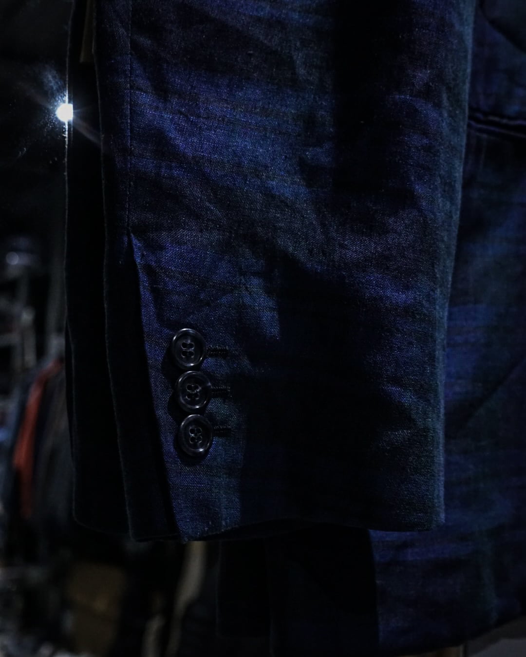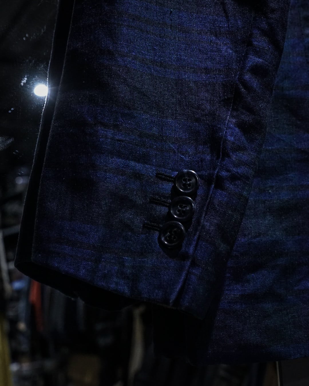 フロントはすっきりとした見え方ながら、ラペルはしっかりとしたボリュームを持ち、当時らしいテーラリングの雰囲気を色濃く残した仕上がりに。リネン特有の落ち感と相まって、柔らかくも立体的なシルエットを描きます。