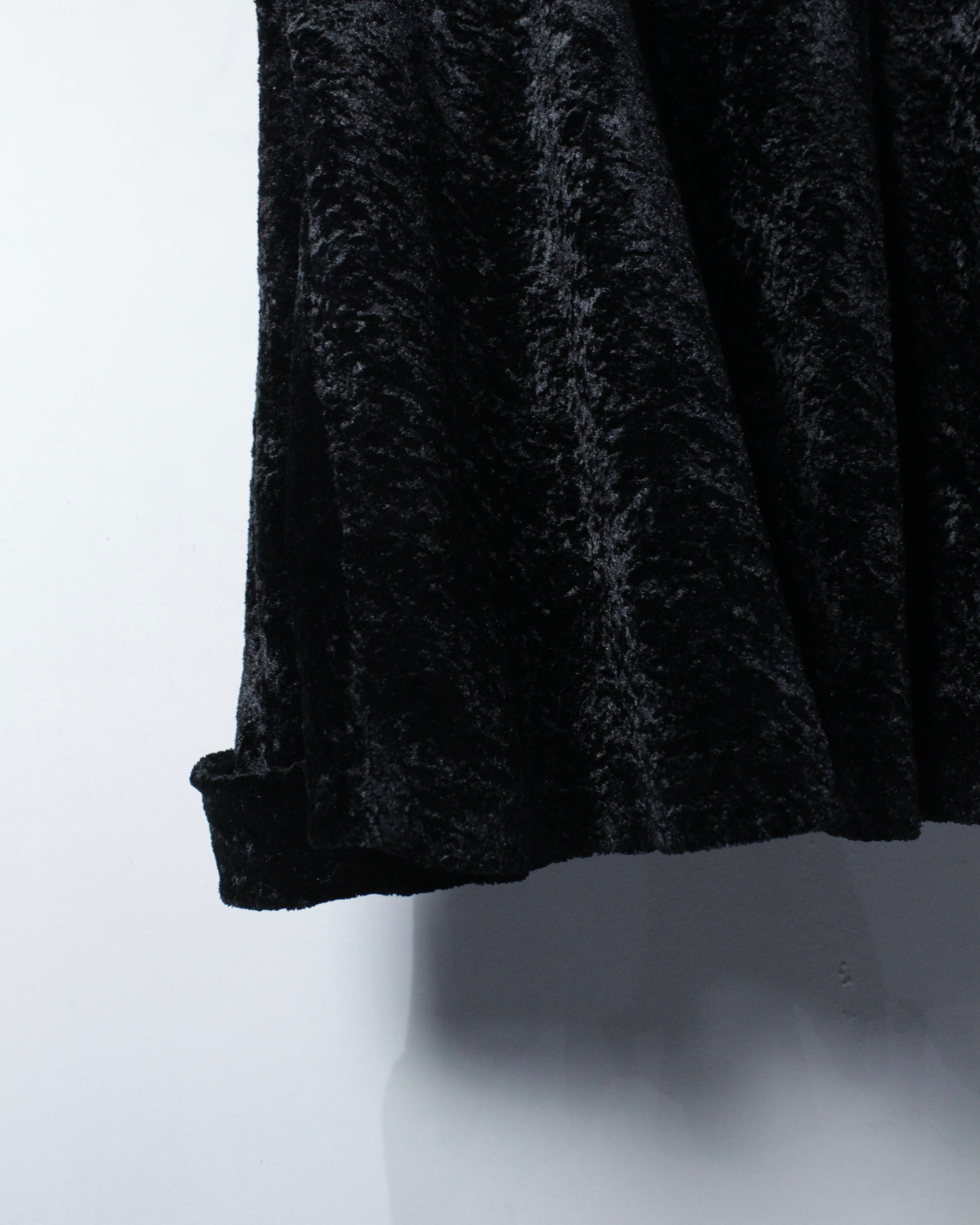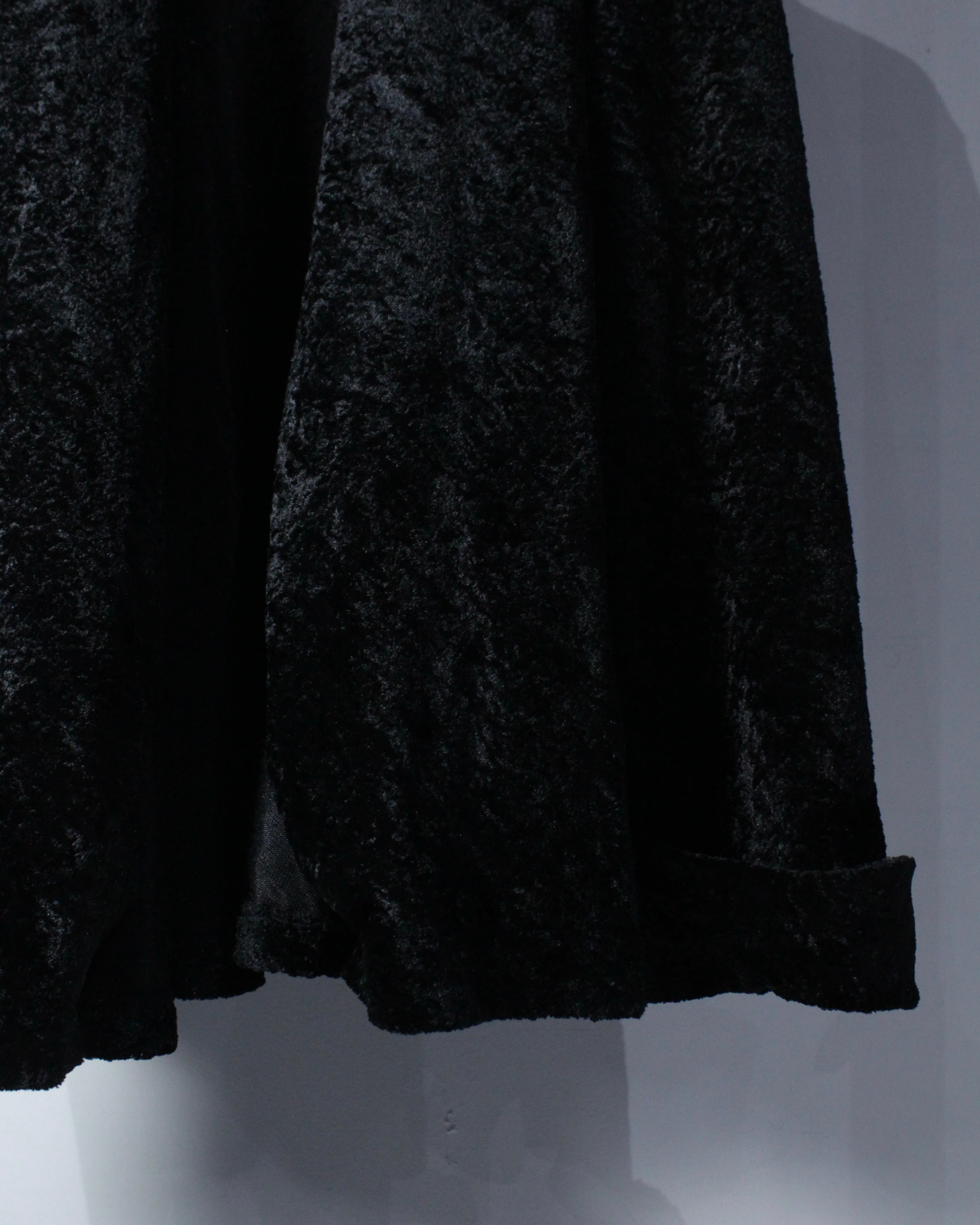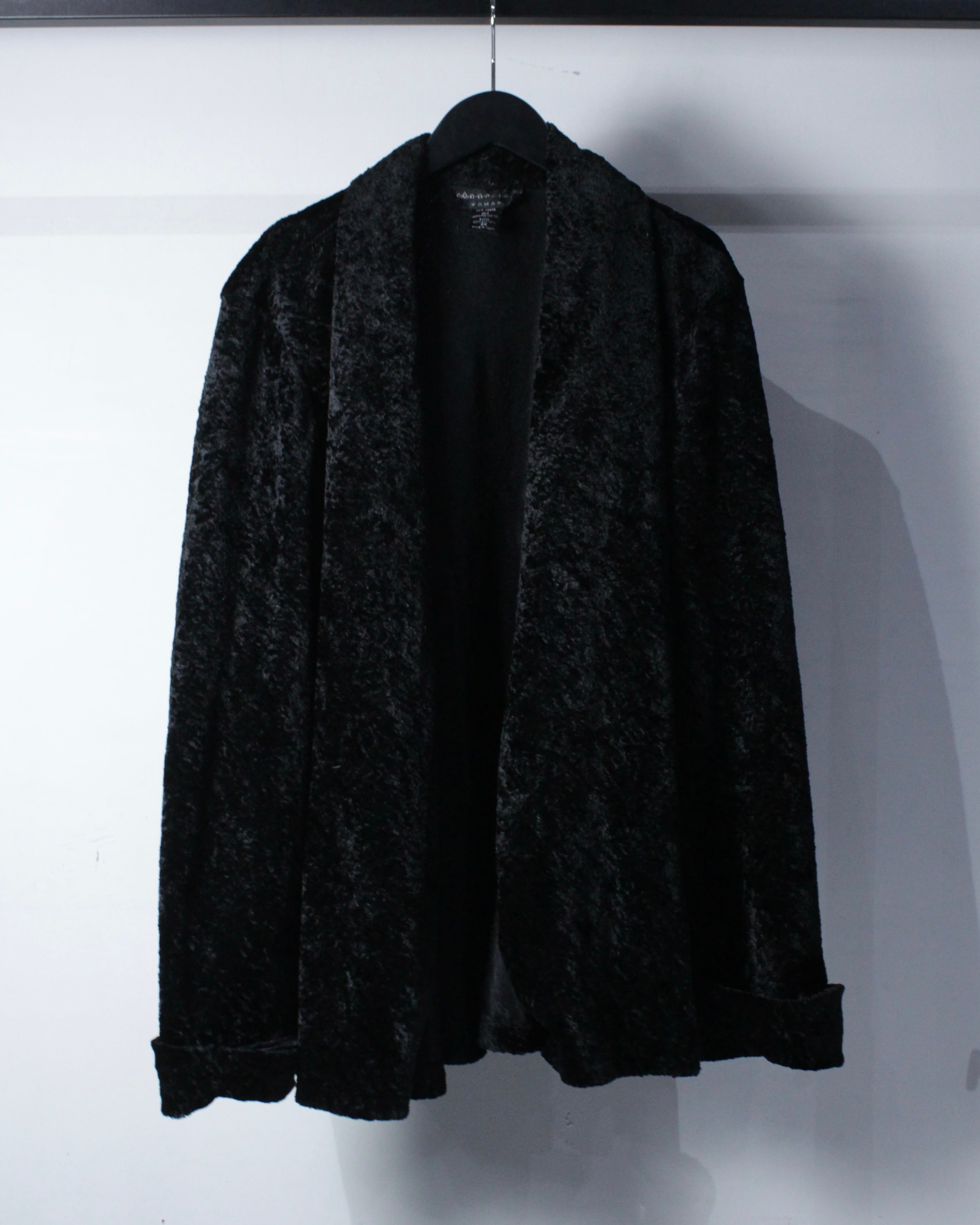 全面に採用されたベロアファブリックは、起毛ならではの柔らかなタッチと、光の当たり方で表情を変える奥行きのあるブラック。マットと艶の中間のような質感が、シンプルな中にもラグジュアリーな空気感を纏わせます。しっとりとした質感と静かな存在感を放つ、ベロア素材の羽織り。