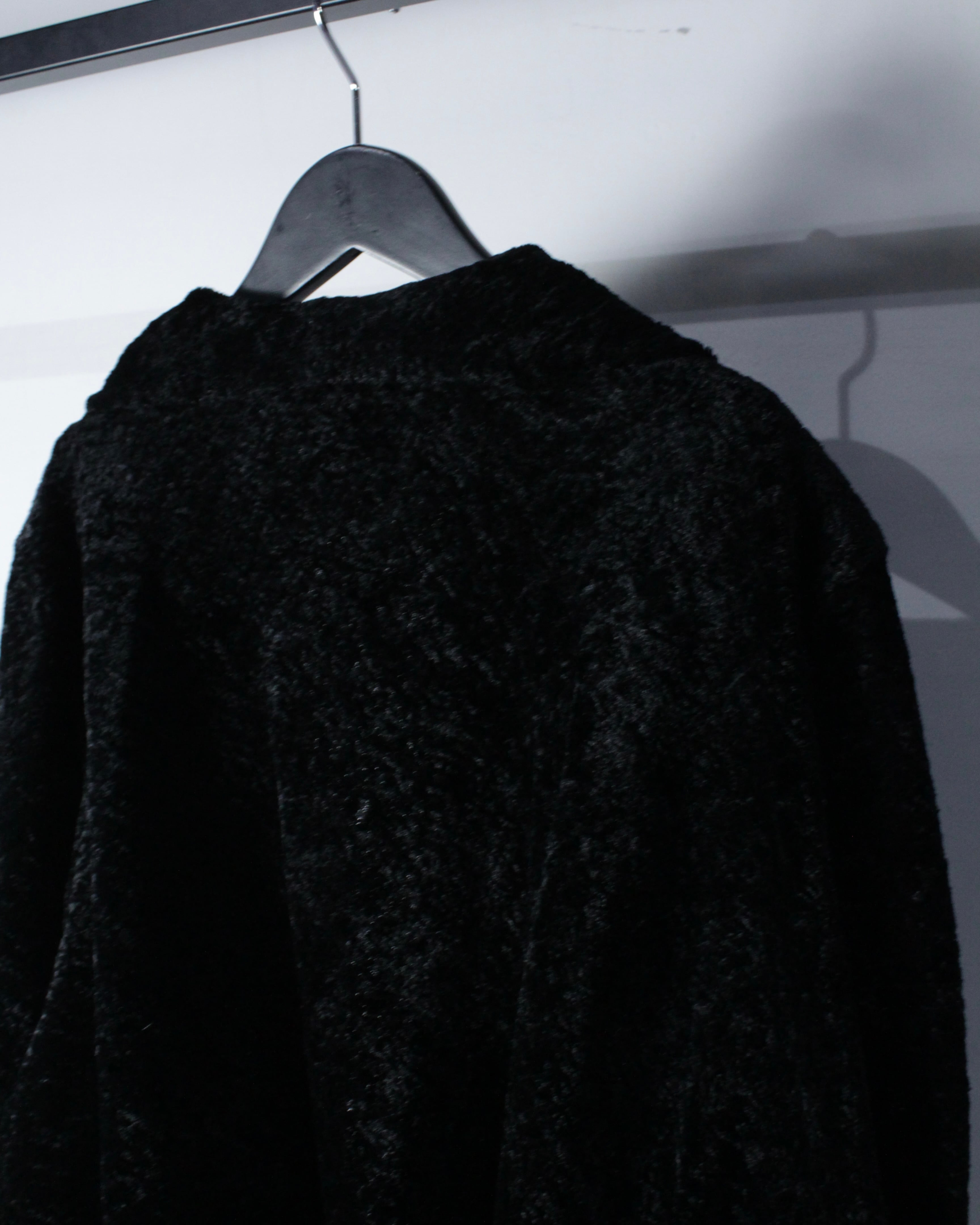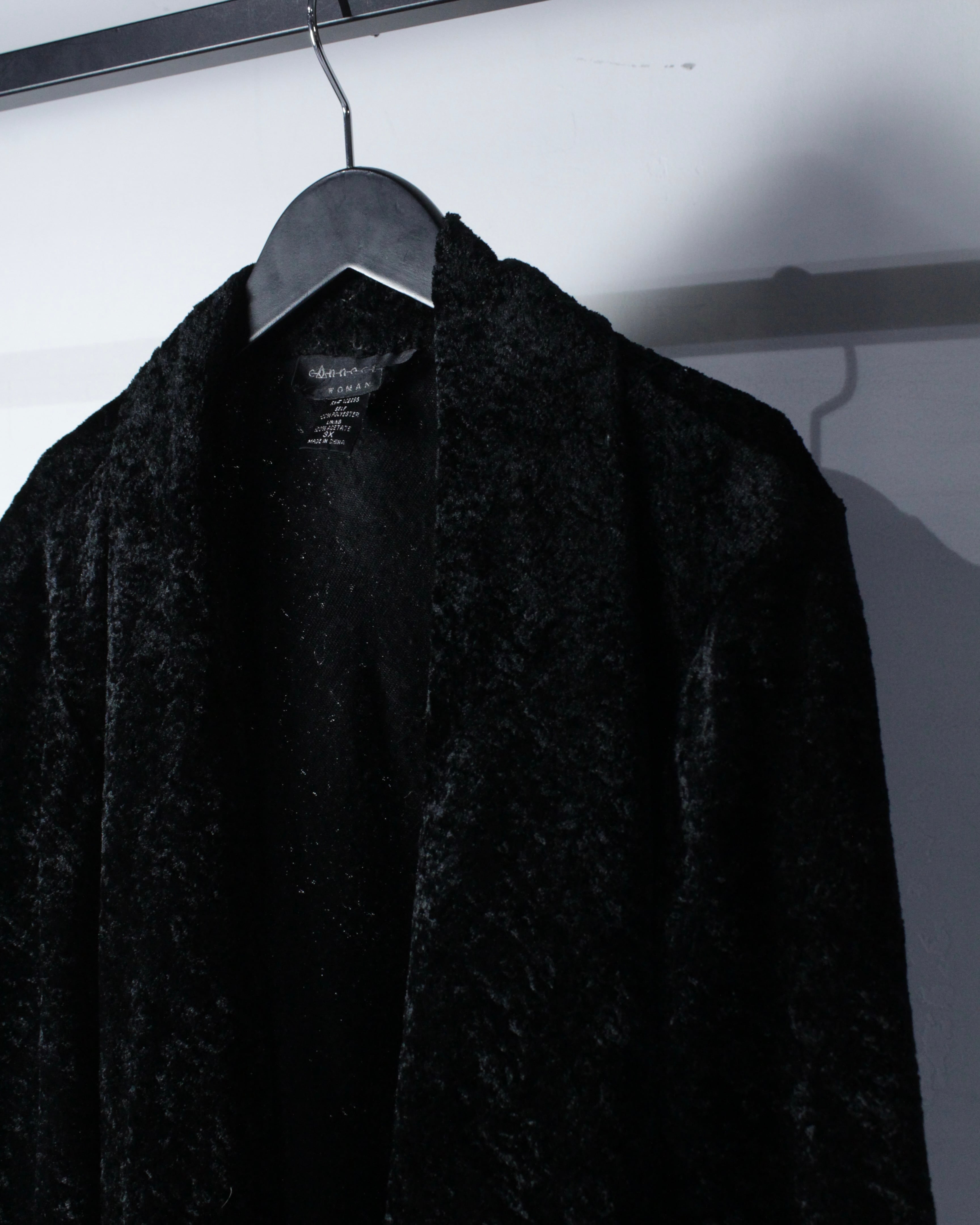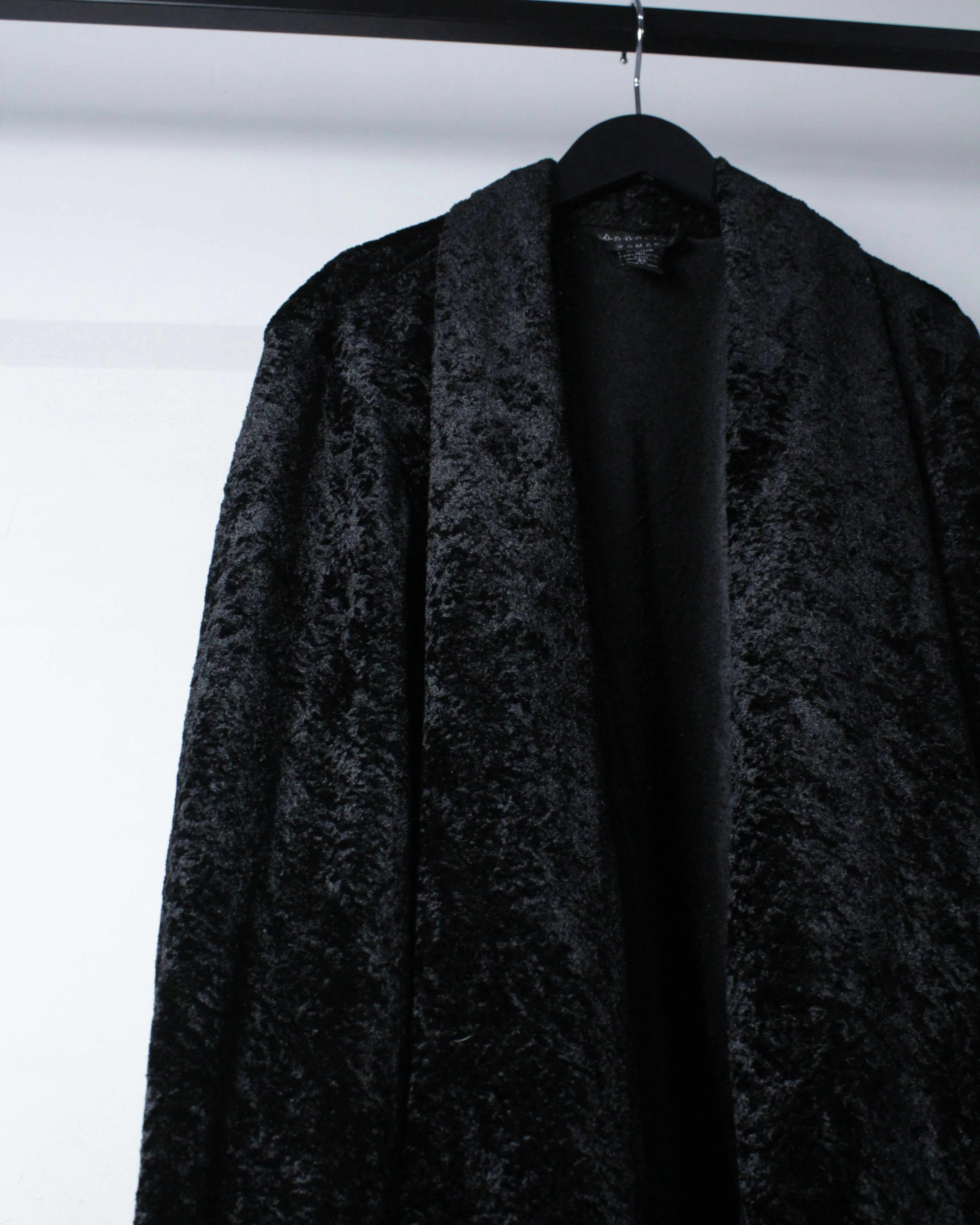全面に採用されたベロアファブリックは、起毛ならではの柔らかなタッチと、光の当たり方で表情を変える奥行きのあるブラック。マットと艶の中間のような質感が、シンプルな中にもラグジュアリーな空気感を纏わせます。しっとりとした質感と静かな存在感を放つ、ベロア素材の羽織り。
