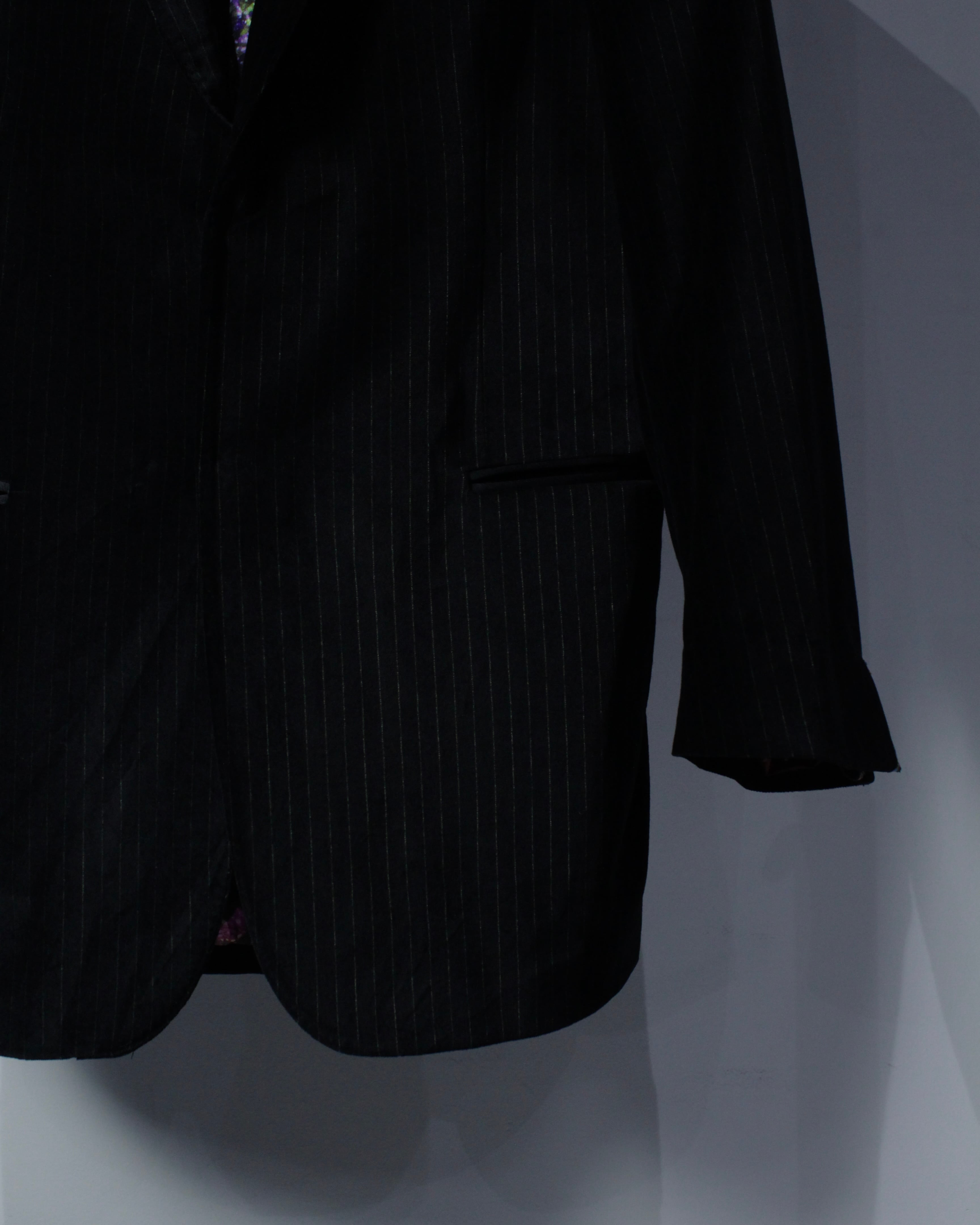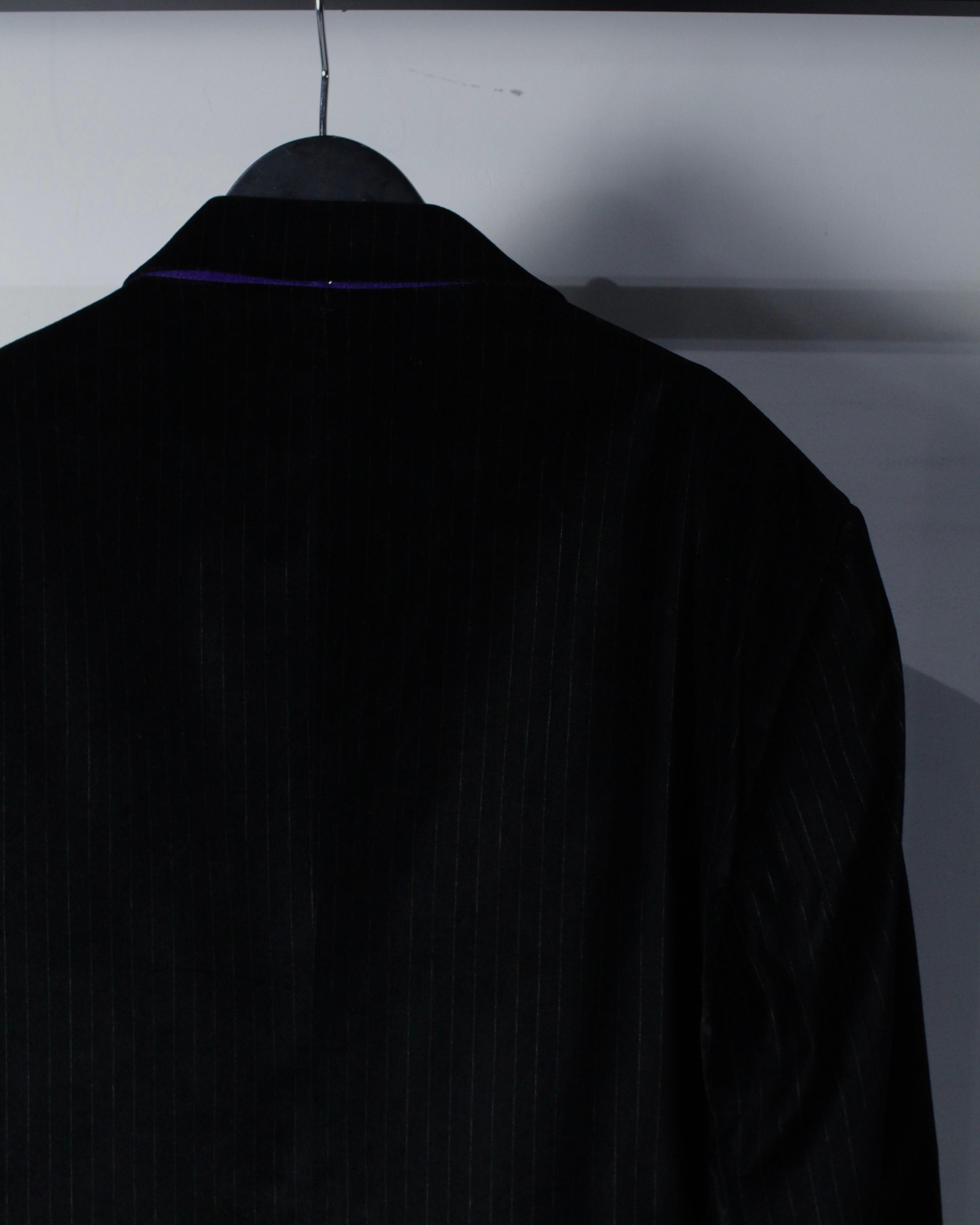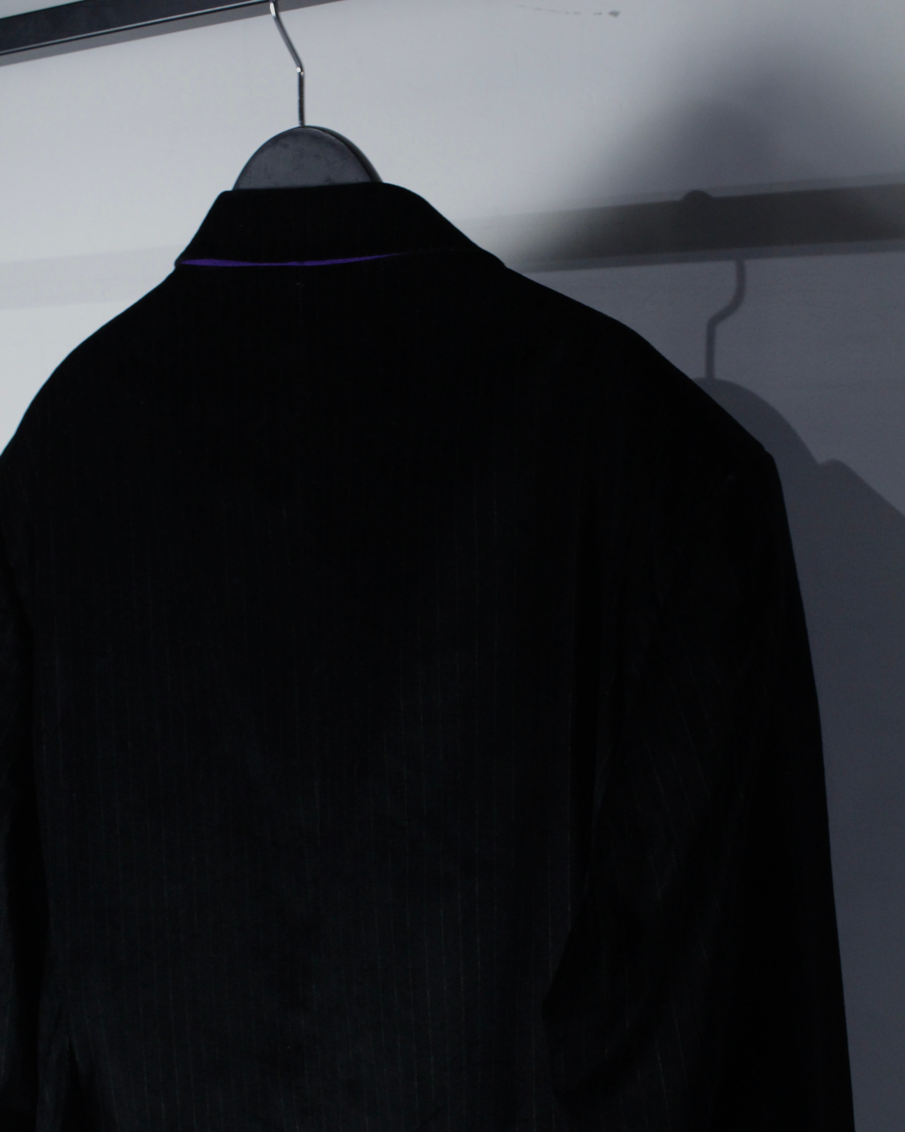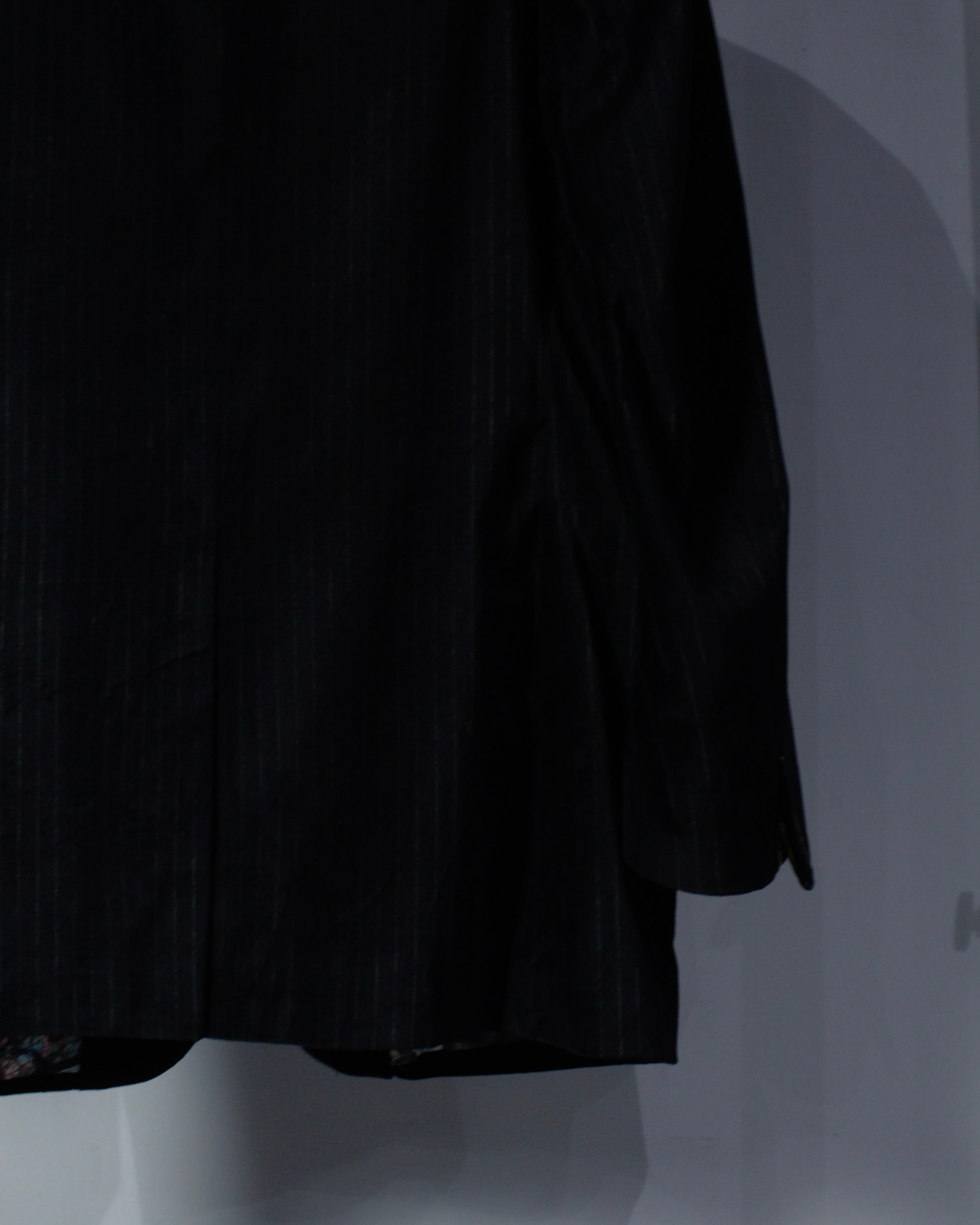 表地はブラックベースに繊細なストライプを走らせた端正な佇まい。ベーシックなテーラードの顔立ちながら、どこか奥行きのある表情を感じさせる仕上がりとなっております。