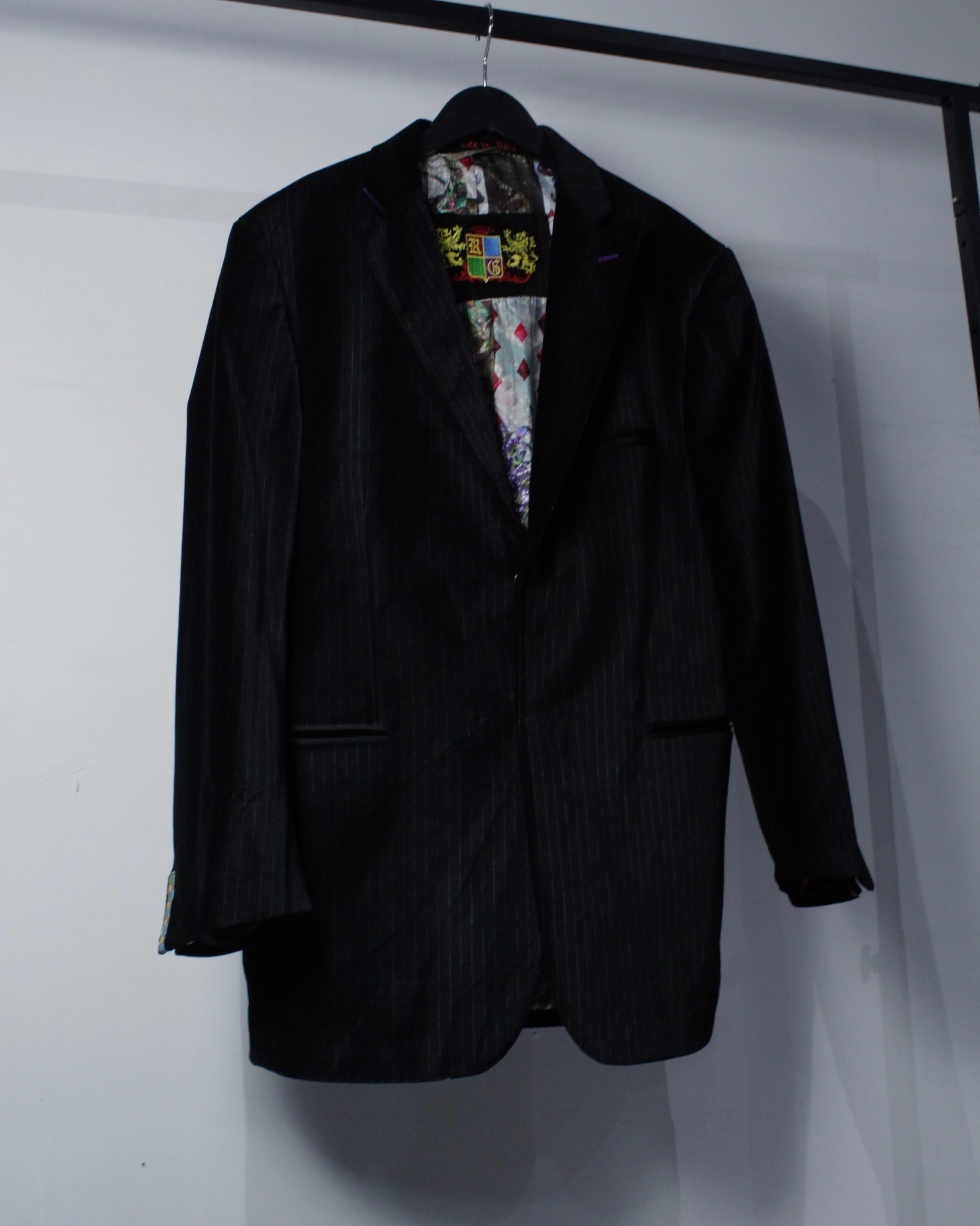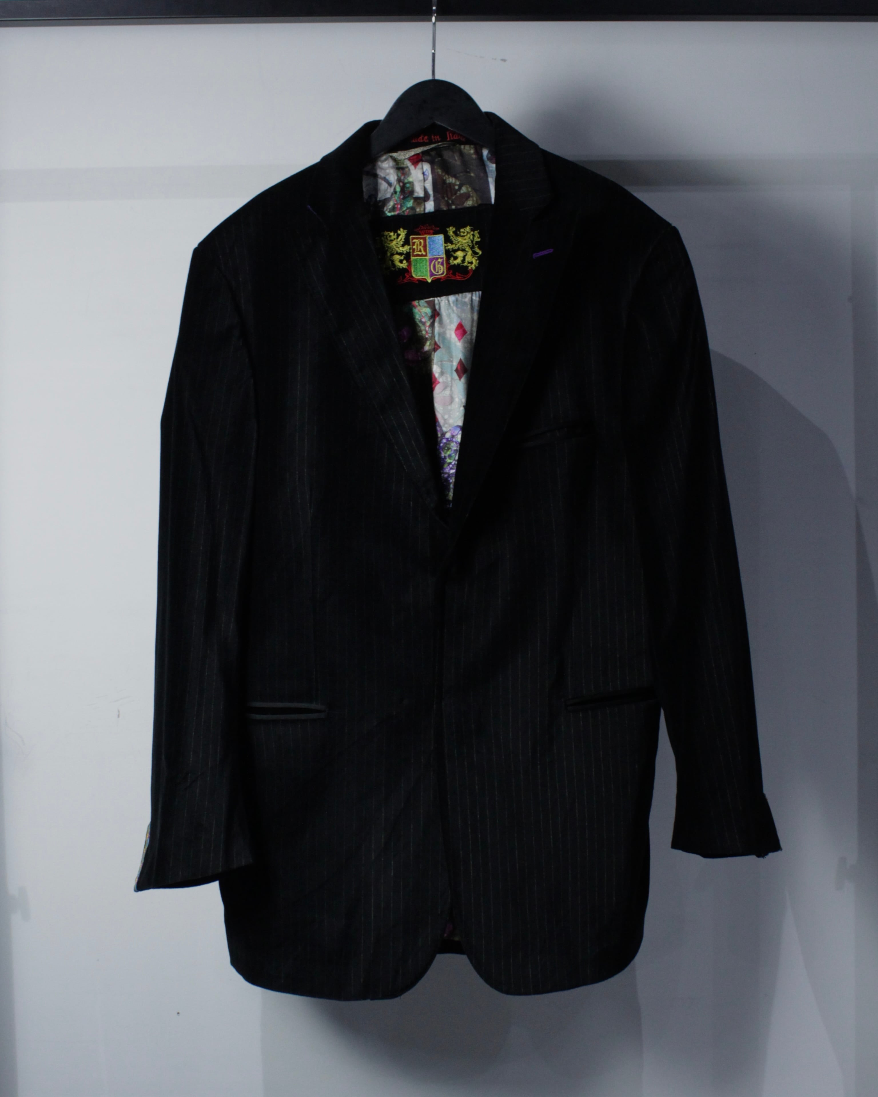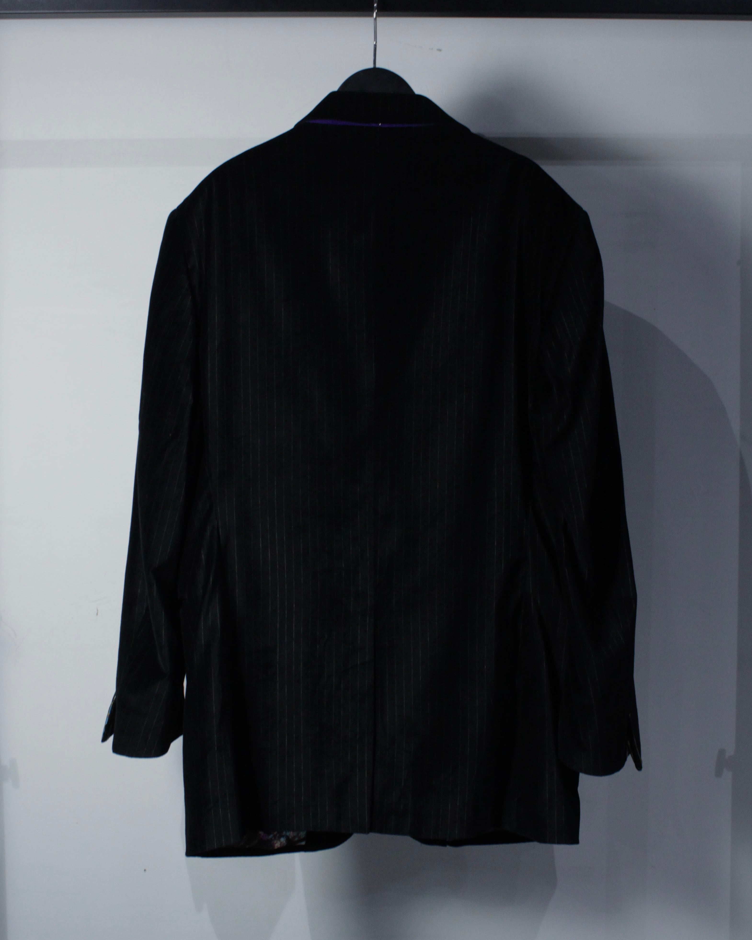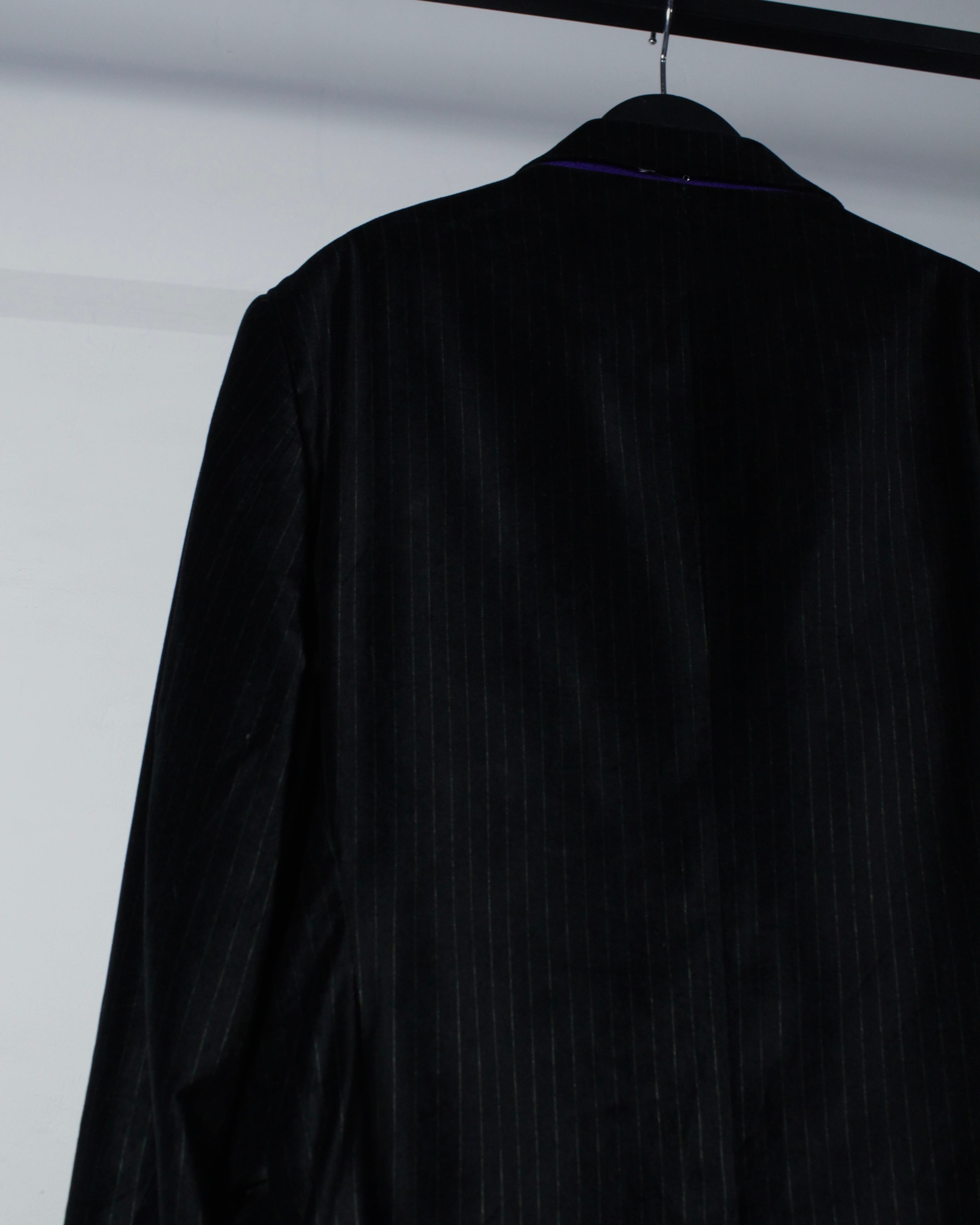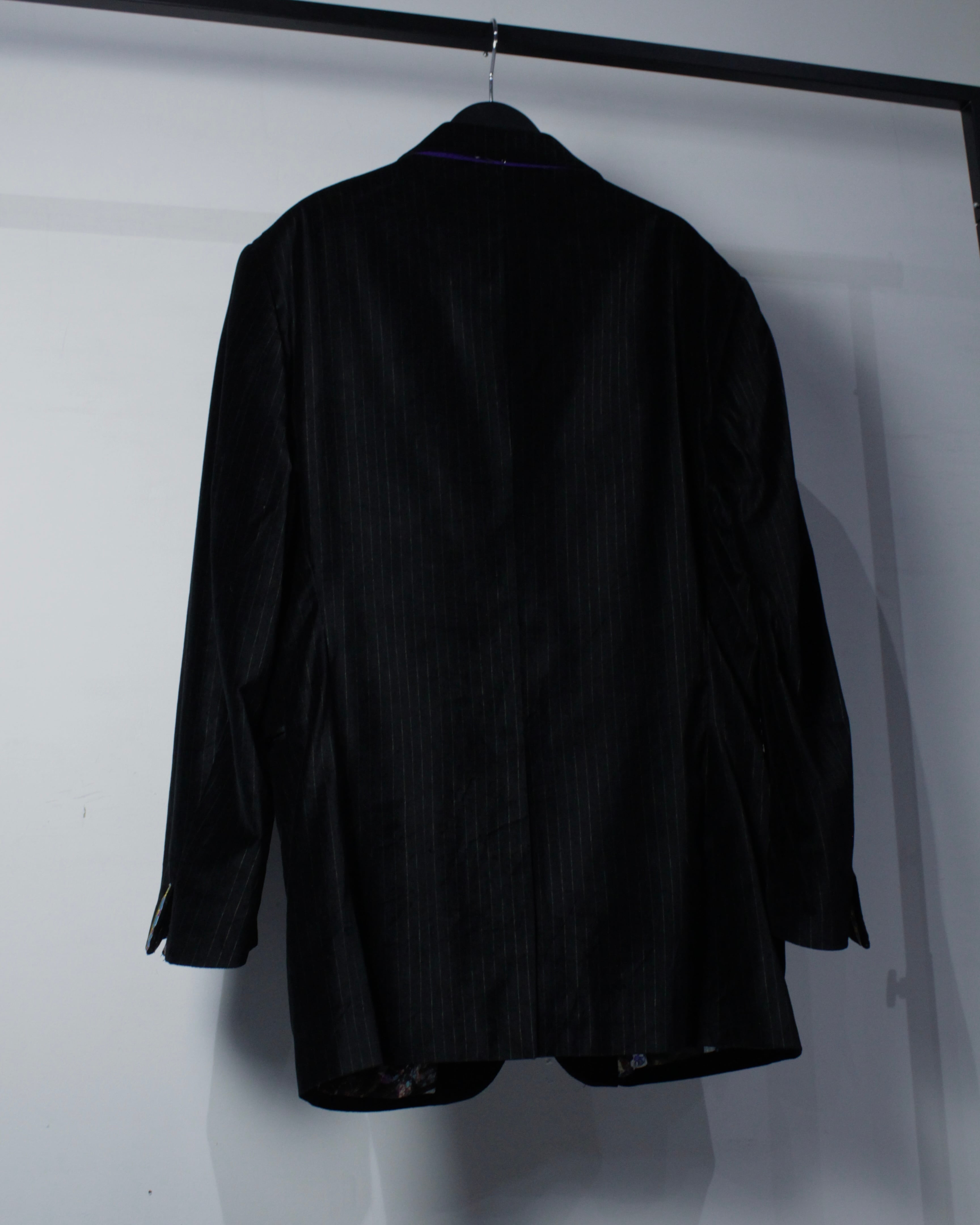 表地はブラックベースに繊細なストライプを走らせた端正な佇まい。ベーシックなテーラードの顔立ちながら、どこか奥行きのある表情を感じさせる仕上がりとなっております。