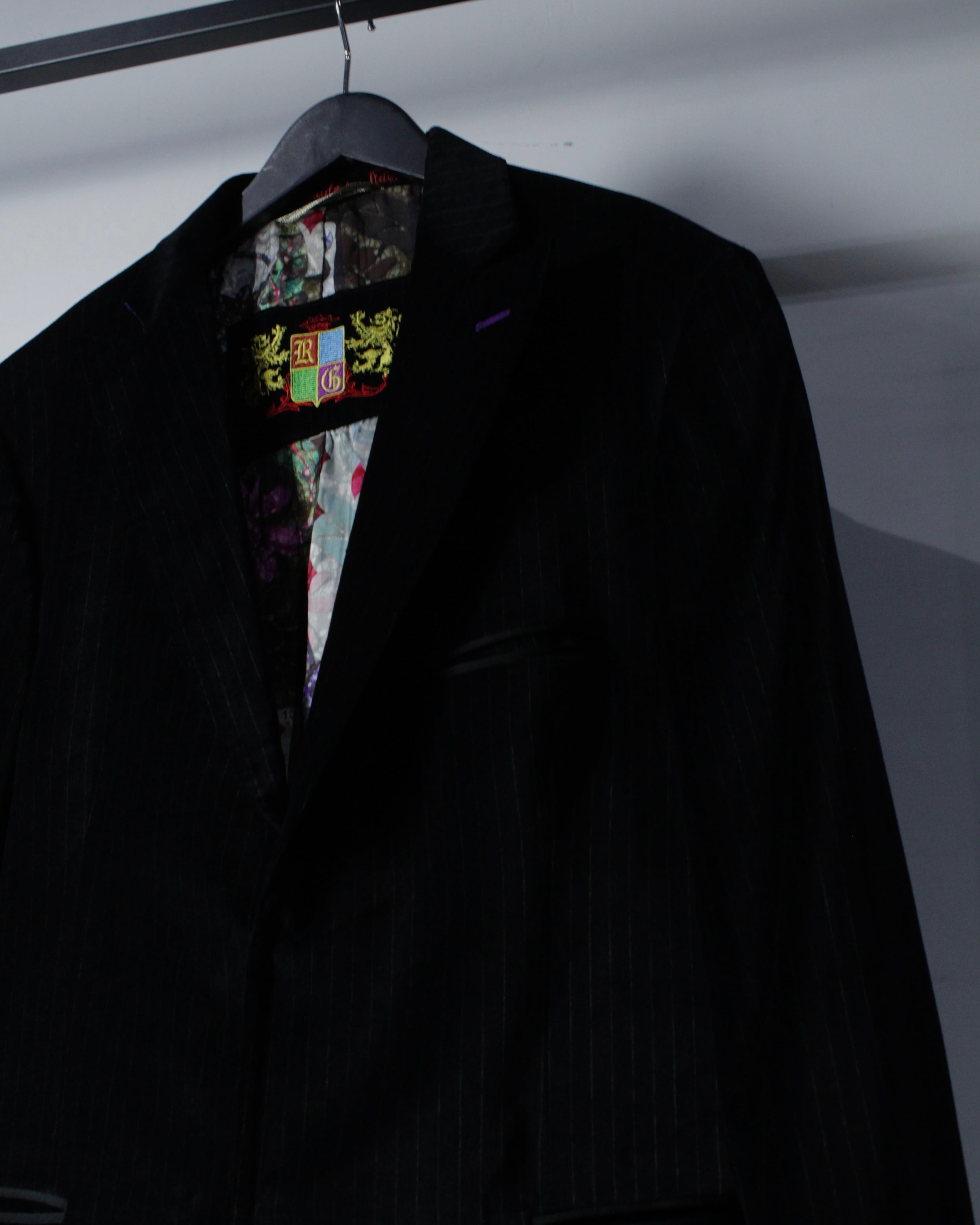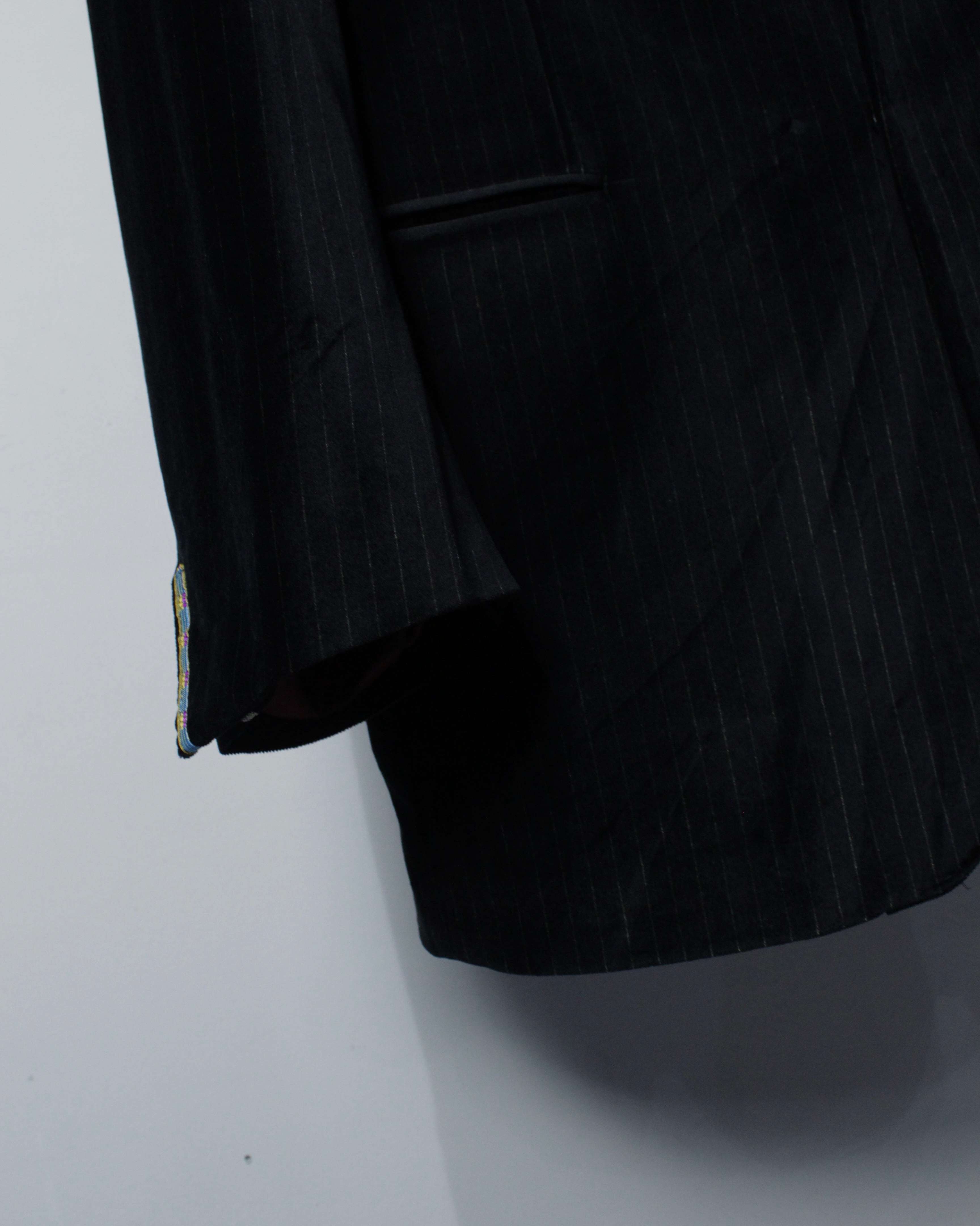 ラペルやポケット周りにはさりげないパイピングや刺繍ディテールが入り、細部まで抜かりのない作り込み。クラシックな構造に対して、ビジュアル面でしっかりとエッジを効かせたバランスが魅力です。