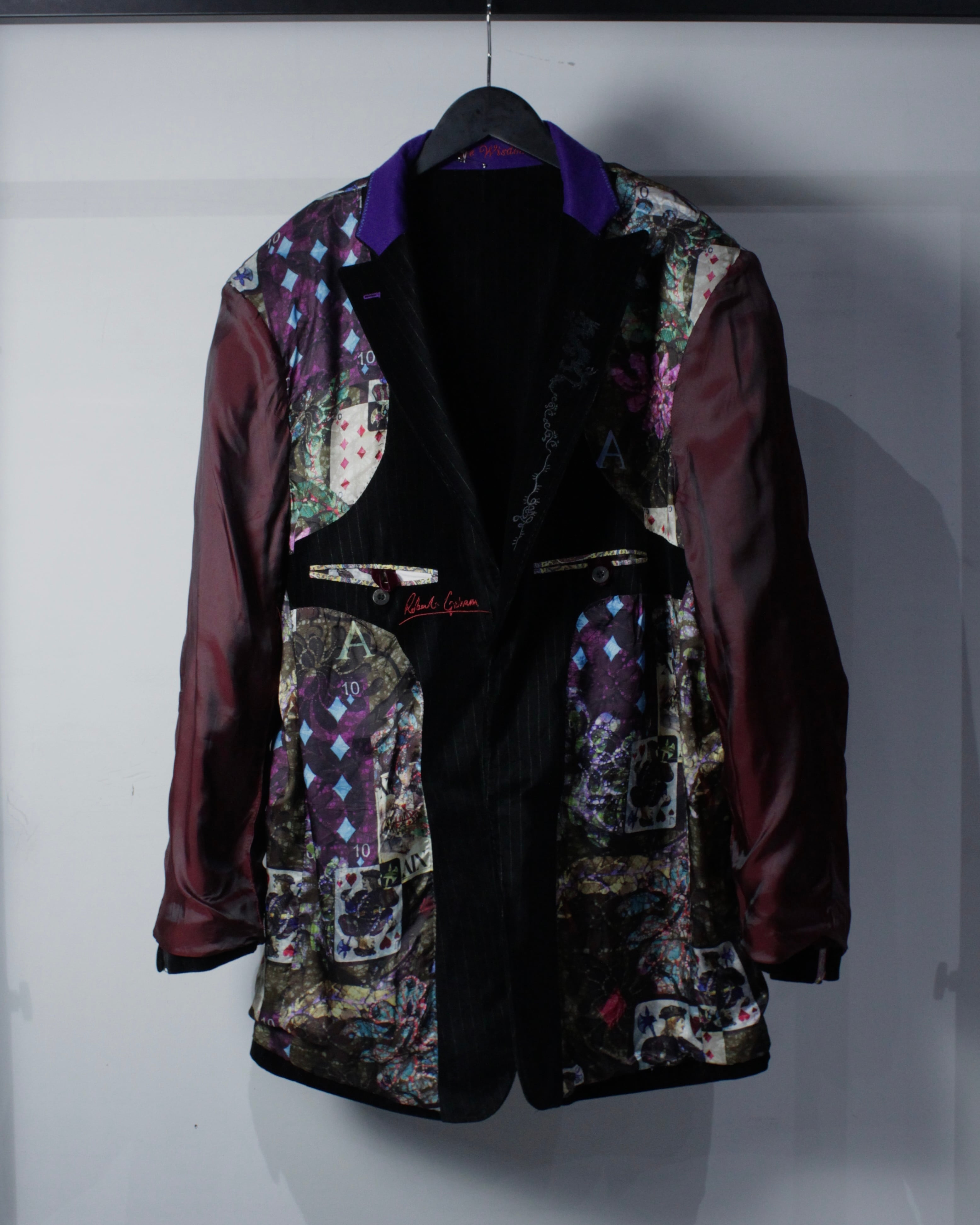 最大の特徴は裏地に施された大胆なデザイン。花柄やトランプモチーフを織り交ぜたアートピースのようなグラフィックが全面に広がり、通常は見えない部分にまでしっかりと個性を宿した一着。あえて裏返して着用することで、総柄ジャケットとしても成立する2面性を持ち合わせています。