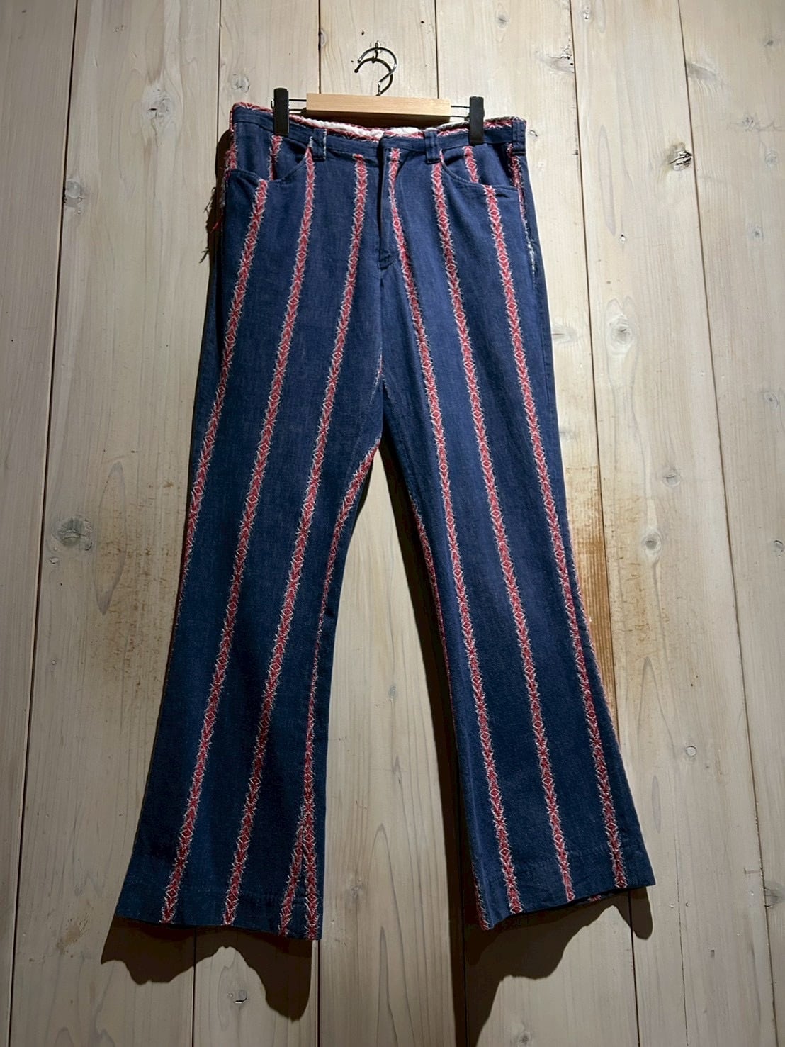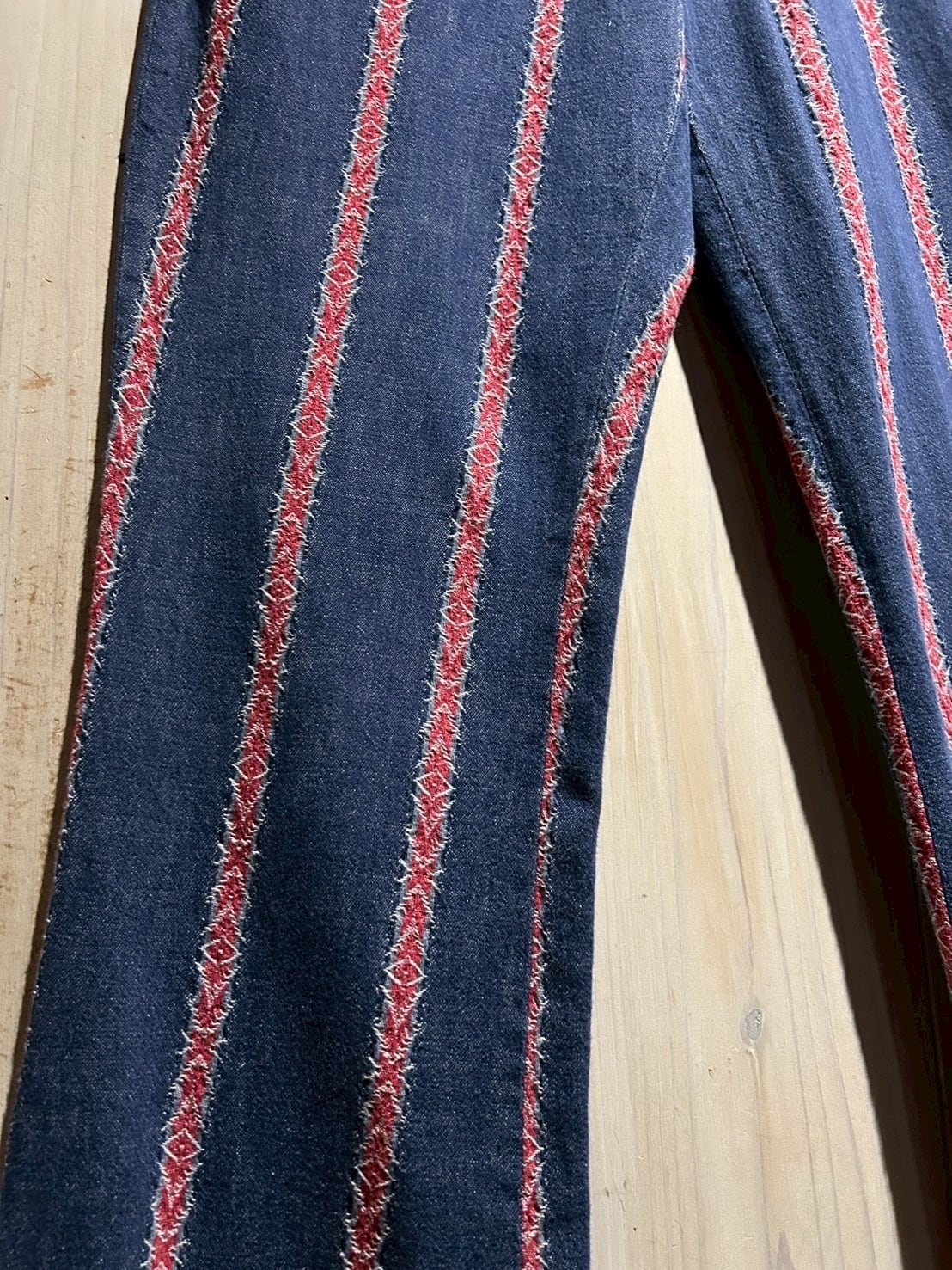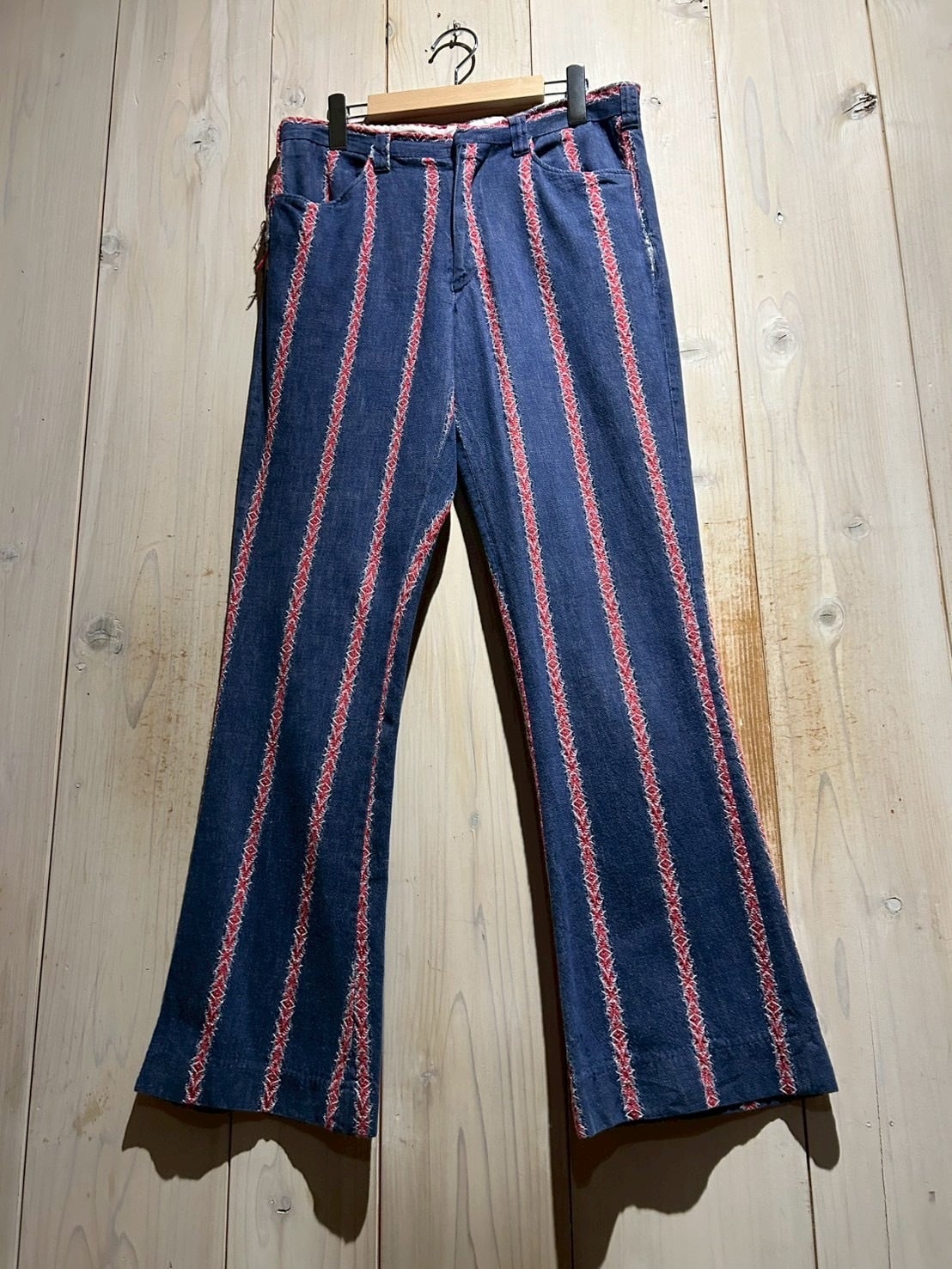 インディゴのボディをベースに、稀少なデニムの織柄で表現されたネイティブパターンをストライプ状に配置したフレアパンツ。